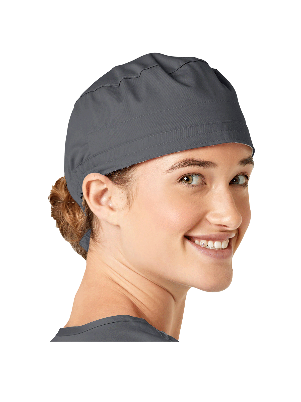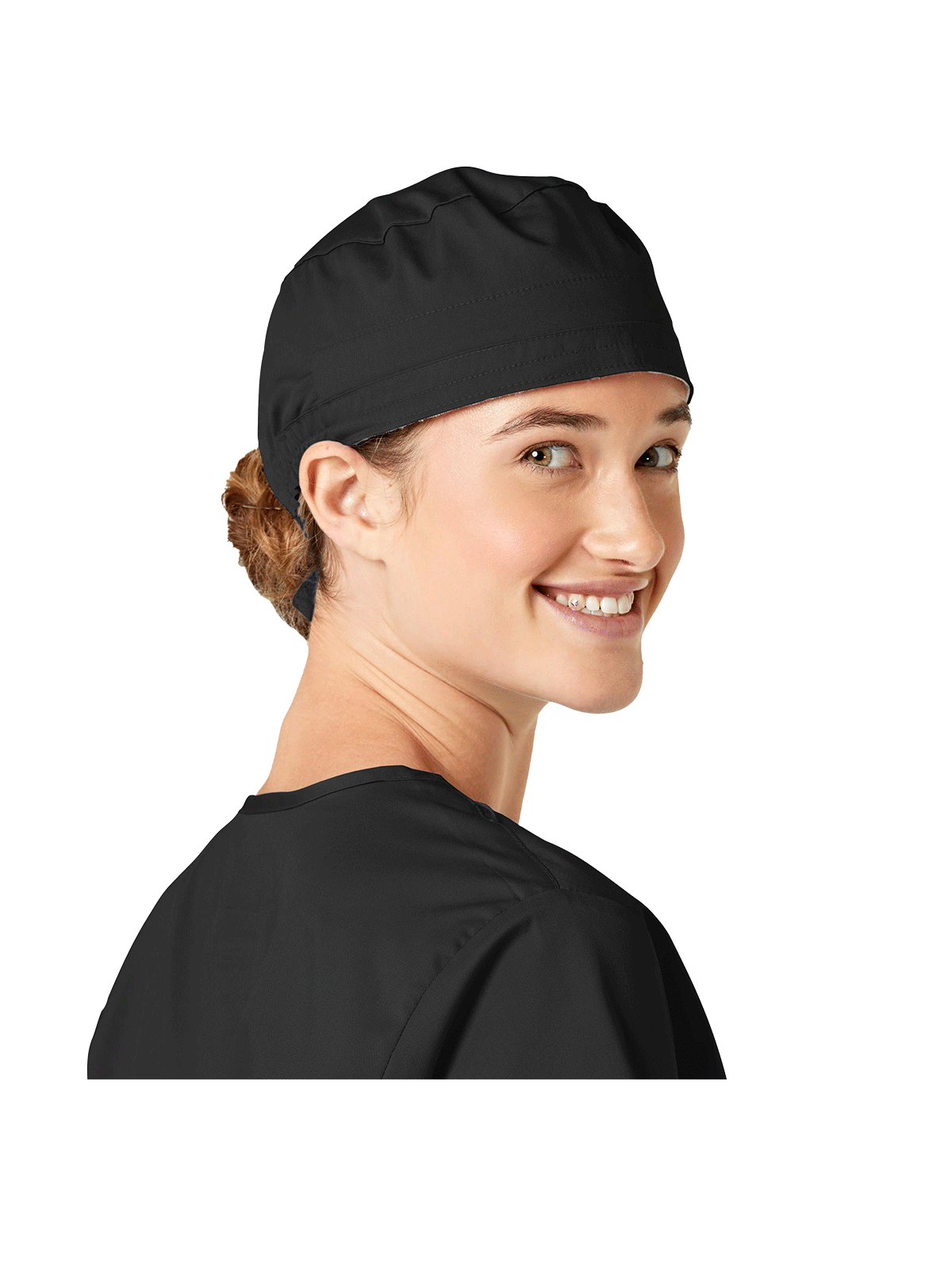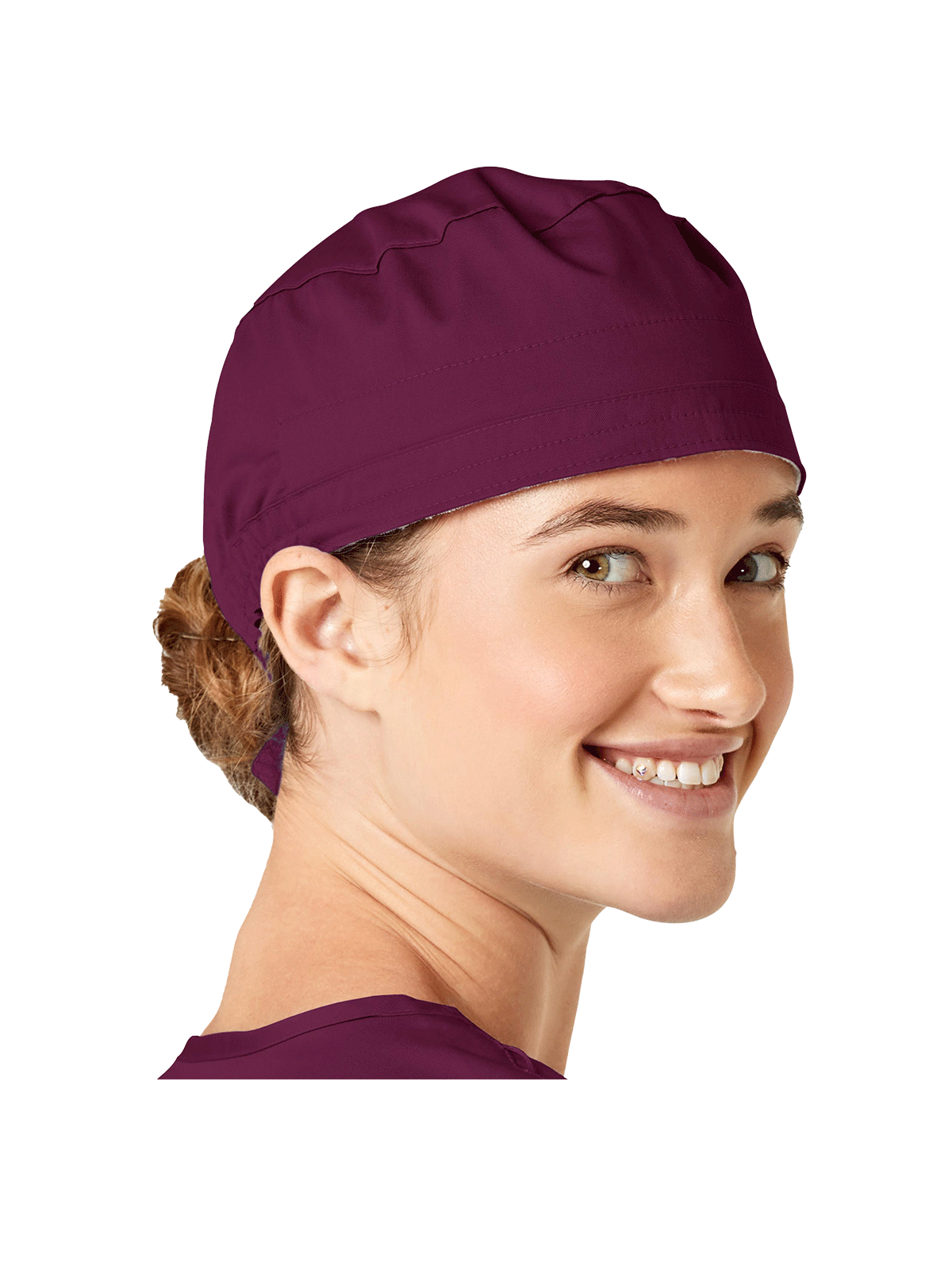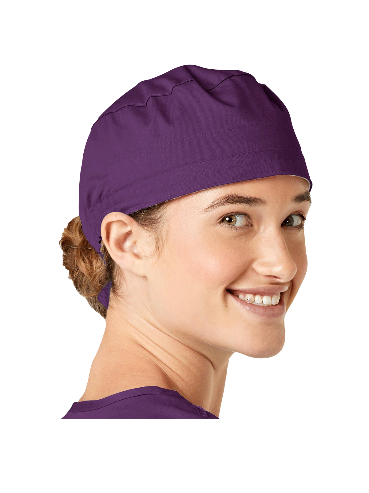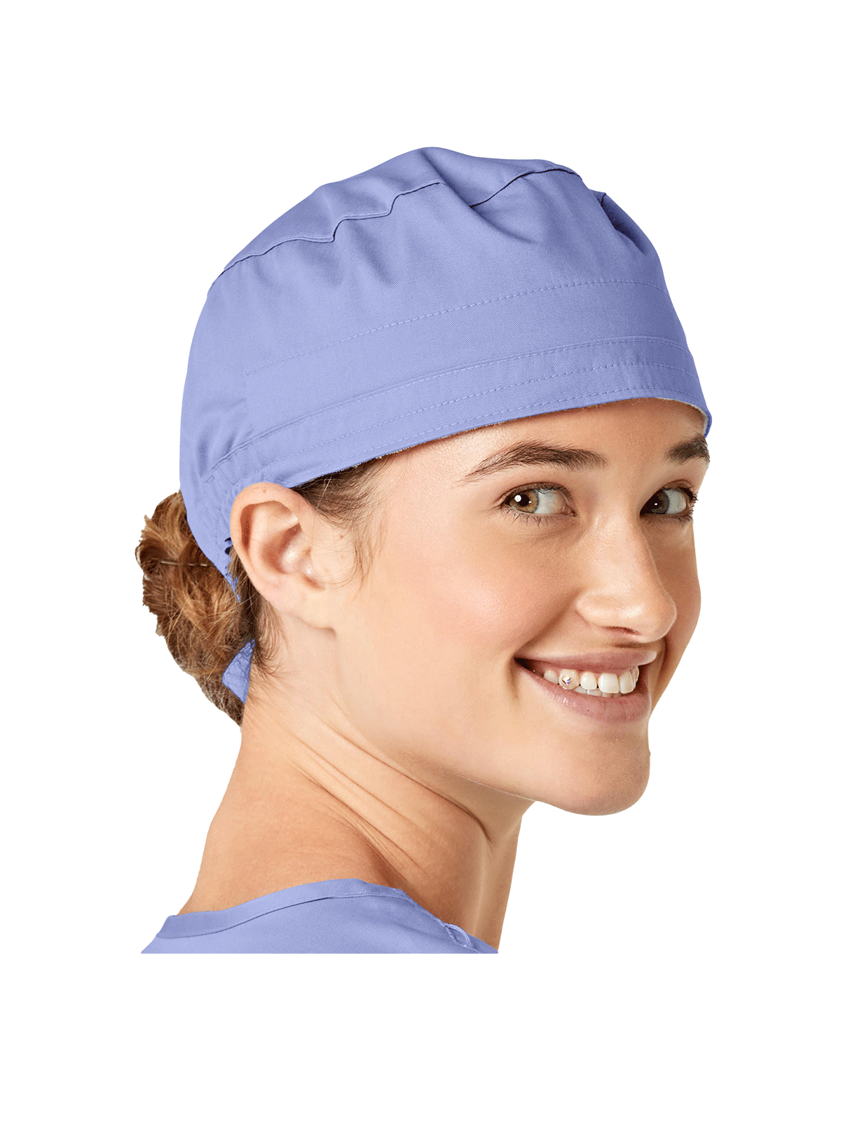 This roomy bouffant scrubs hat features buttons by ears to comfortably hold a protective face mask in place. (Mask sold separately.) Hat also includes front pleats with enough fullness for complete hair coverage and terry cloth sweatband for comfort. Back...