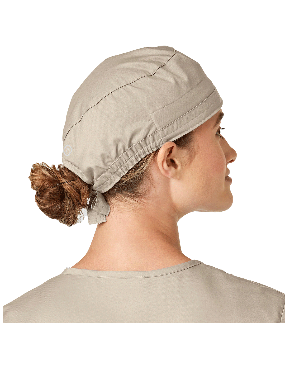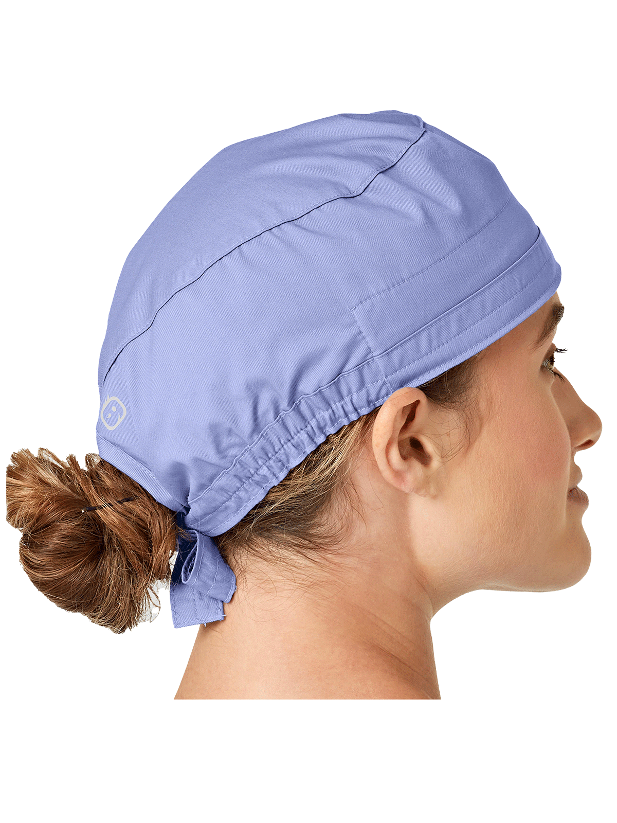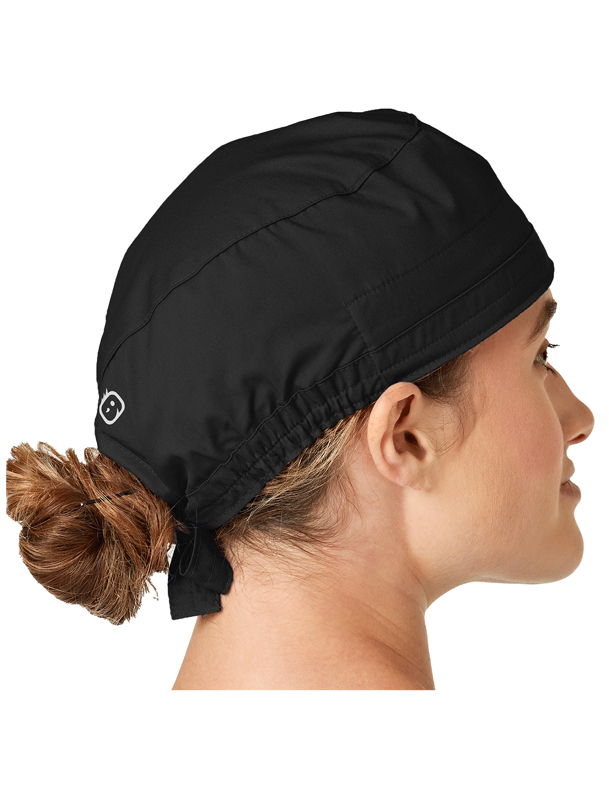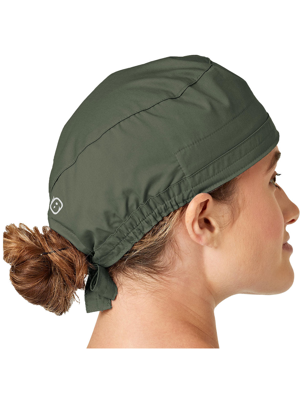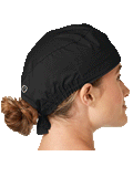 This adjustable tie-back scrubs hat features snap tabs by ears to comfortably hold the protective face mask in place. (Mask sold separately.) Hat includes terry cloth sweatband for comfort and contoured seaming with back elasticfor a better fit. Certainty label...