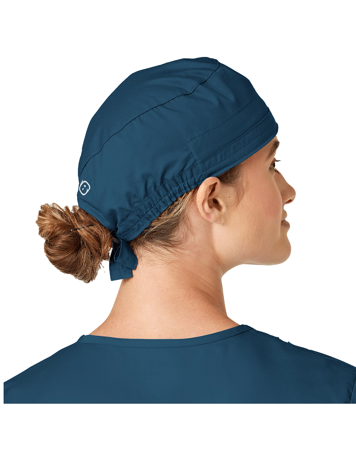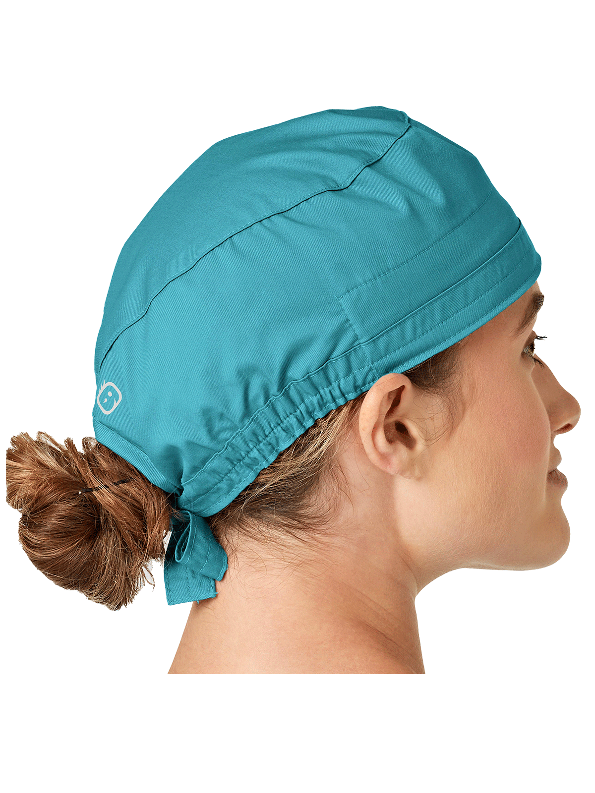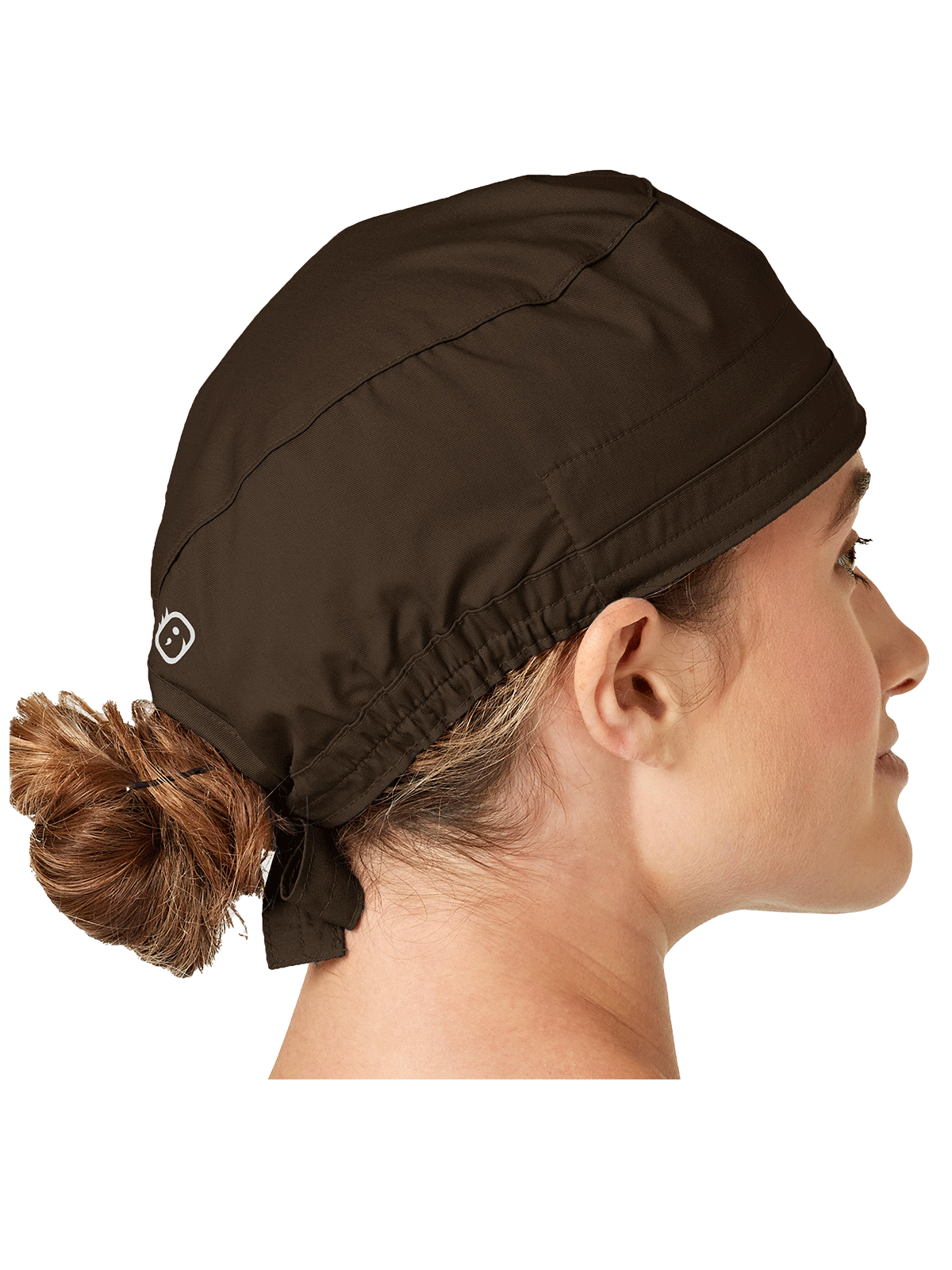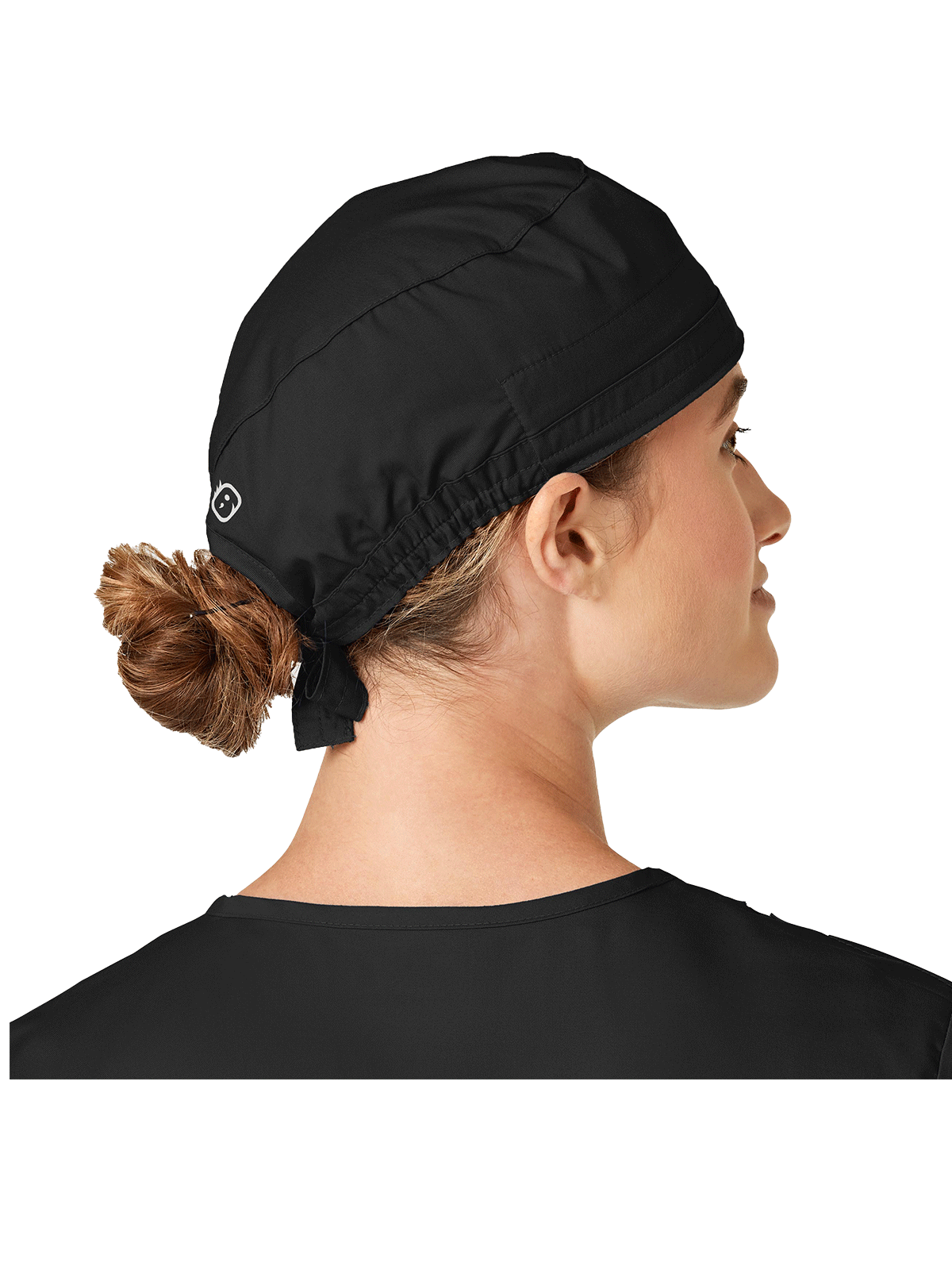 This adjustable tie-back scrubs hat features snap tabs by ears to comfortably hold the protective face mask in place. (Mask sold separately.) Hat includes terry cloth sweatband for comfort and contoured seaming with back elasticfor a better fit. Certainty label...
