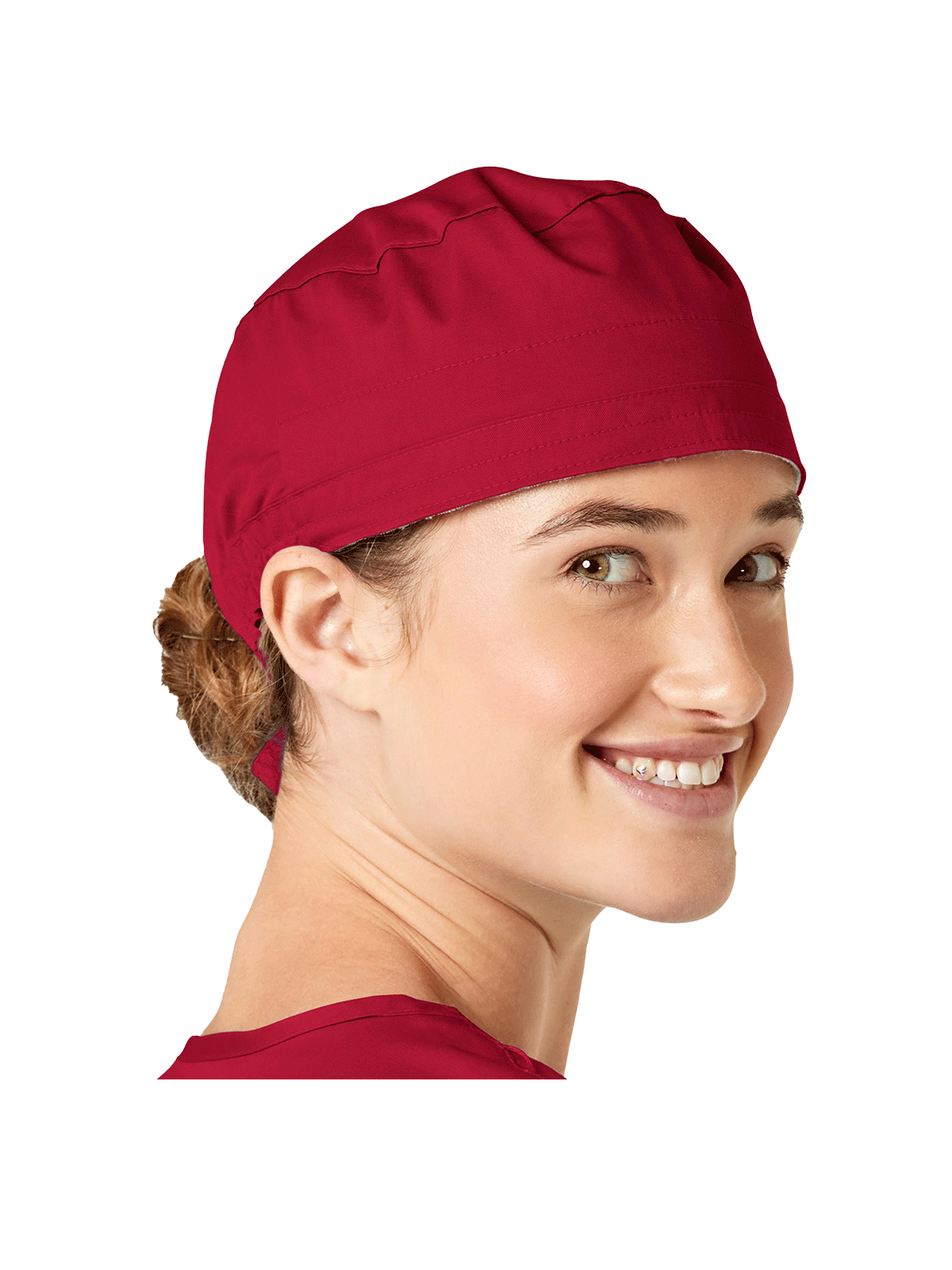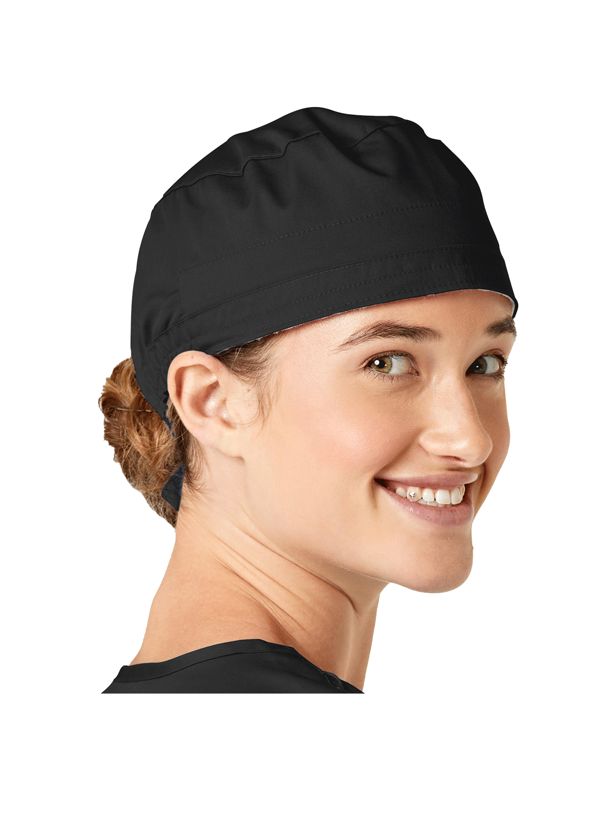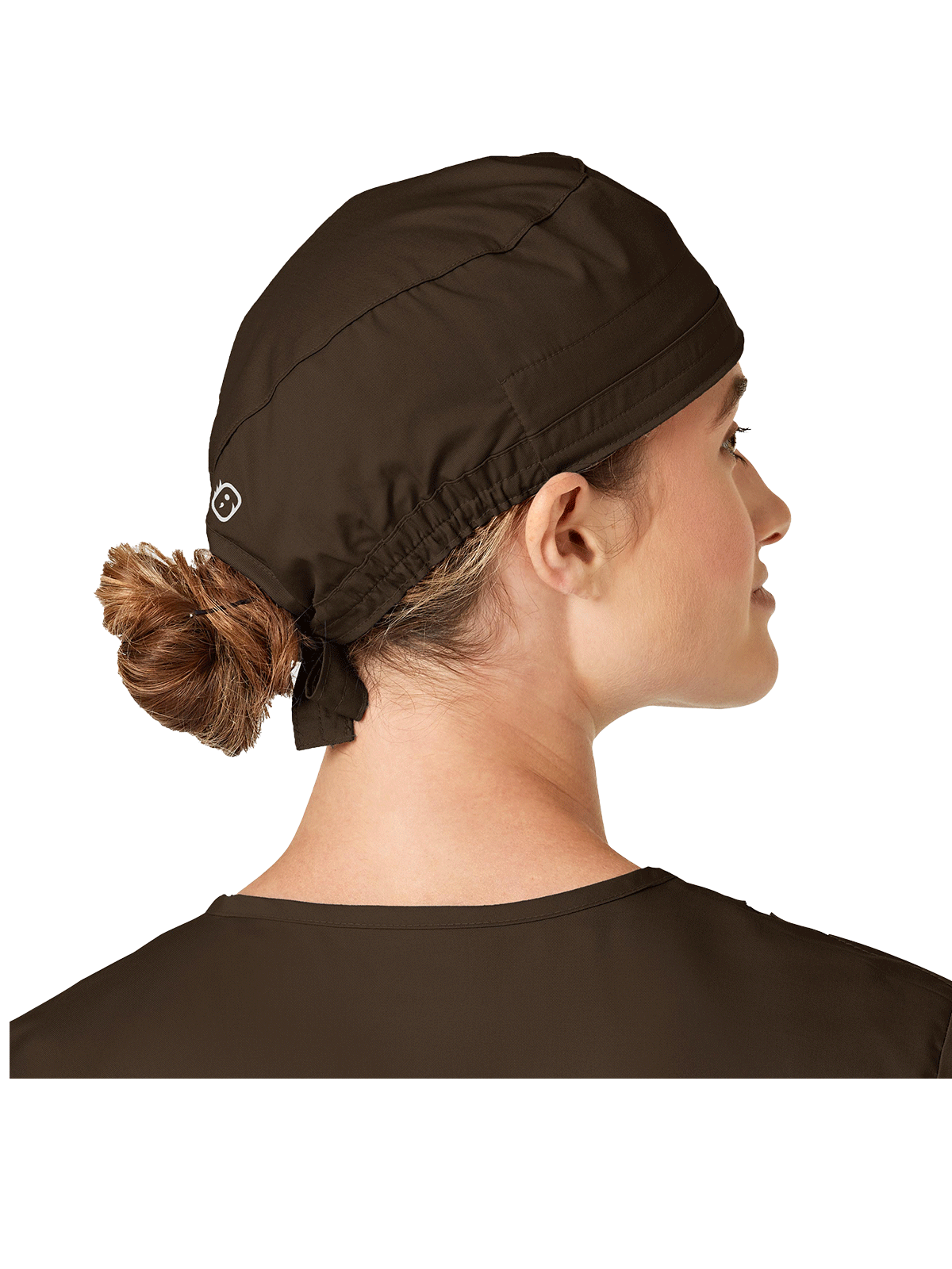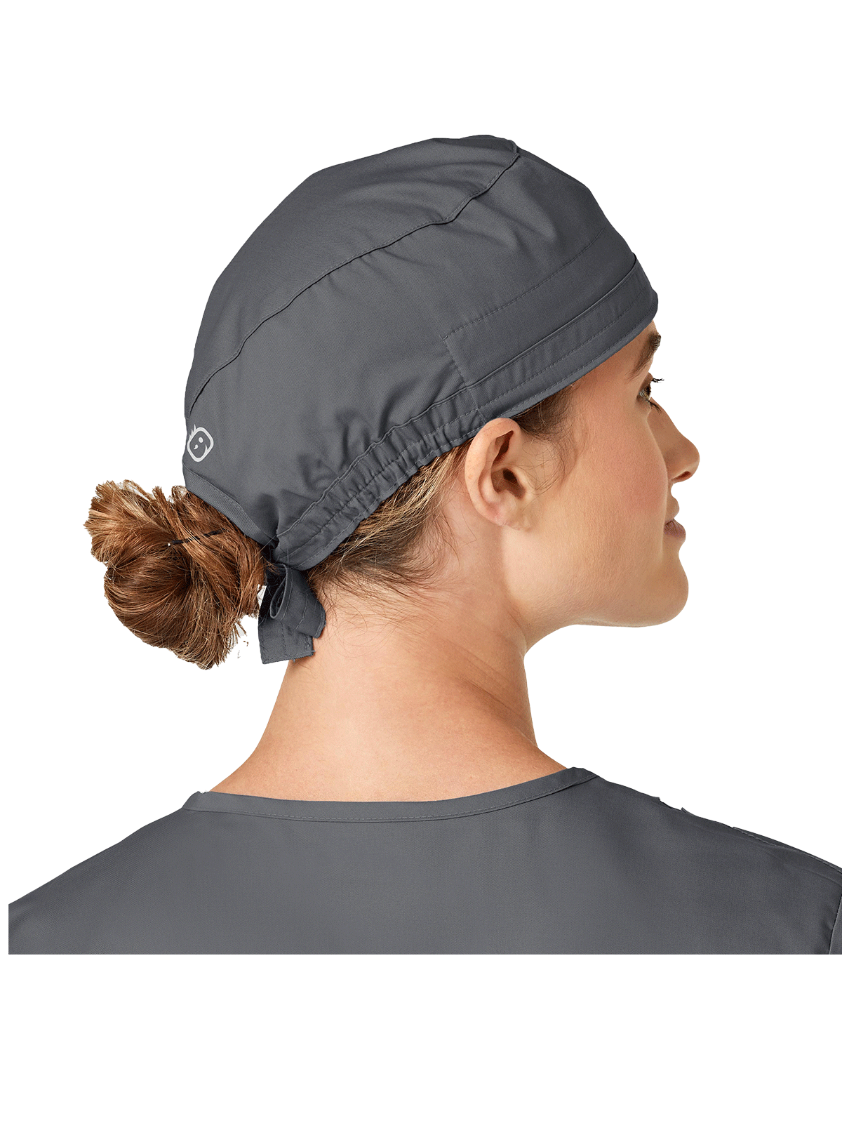 This adjustable tie-back scrubs hat features snap tabs by ears to comfortably hold the protective face mask in place. (Mask sold separately.) Hat includes terry cloth sweatband for comfort and contoured seaming with back elasticfor a better fit. Certainty label...