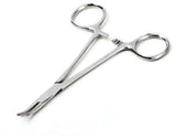 Traditional Kelly hemostat design with serrated jaws and locking handle.