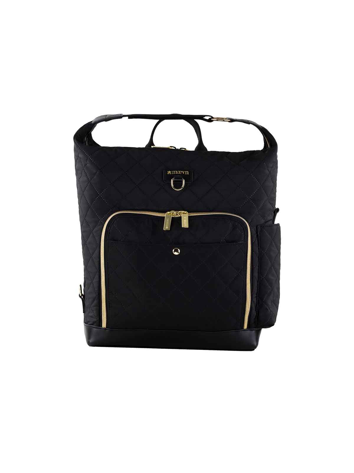 * Plush, water-resistant materials with a decorative quilted texture and vegan leather trim
