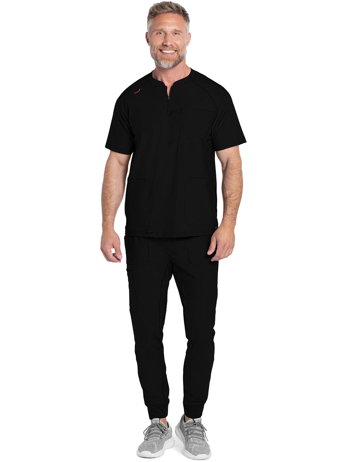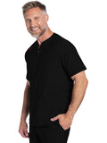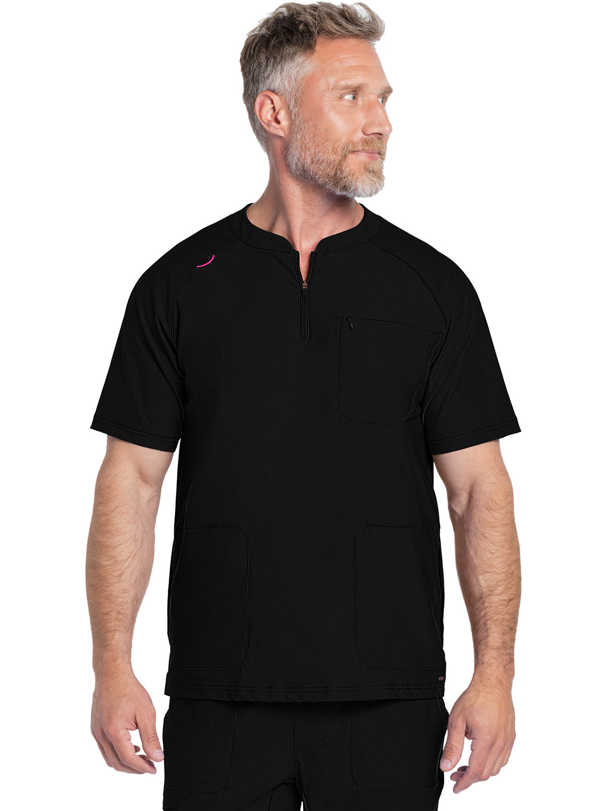 Updated styling highlights this Men's scrub top made from a professional-looking, durable, and comfortable 360° stretch knit fabric. A round collar and quarter zip henley neckline provide style plus ease on and off. Bungee ID badge loop on the wearer's right shoulder. There are three pockets for storage: one chest inset pocket and two side seam pockets. Men's Contemporary Slim Fit. Center back length: 26 1/2"