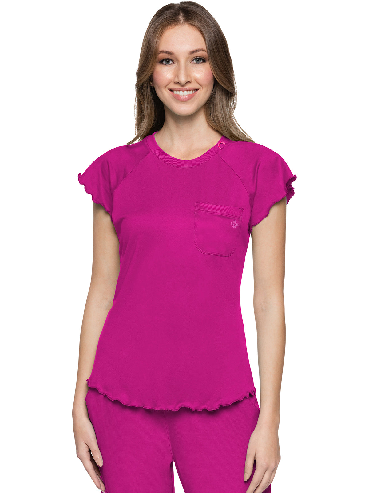 This Knit Lettuce-Edged Top is a must-have. It features a rib-knit round neckline and chest patch pocket for storage. The trendy lettuce-edge raglan sleeves and curved hem offer a fun element, adding subtle detail to a staple. Missy fit. Center back length: 23 1/2"