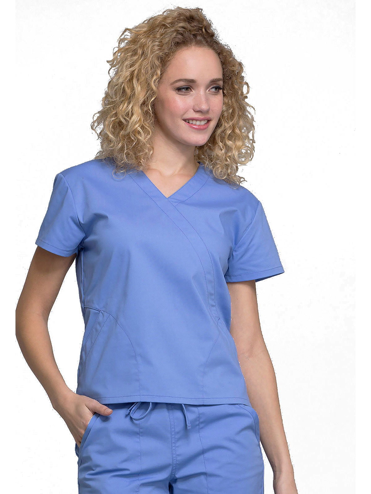 A Modern Classic fit mock wrap top features two pockets and logo label with instrument loop. High low step hem and side vents. Center back length: 23"