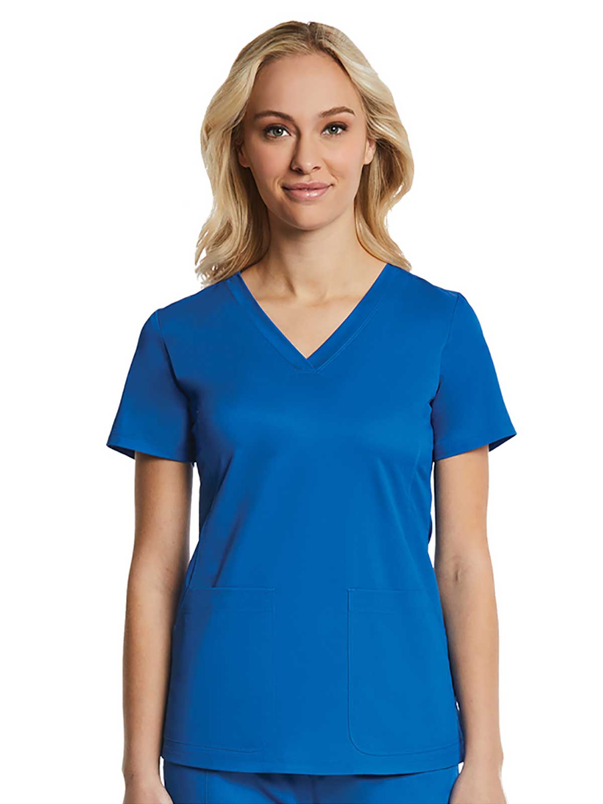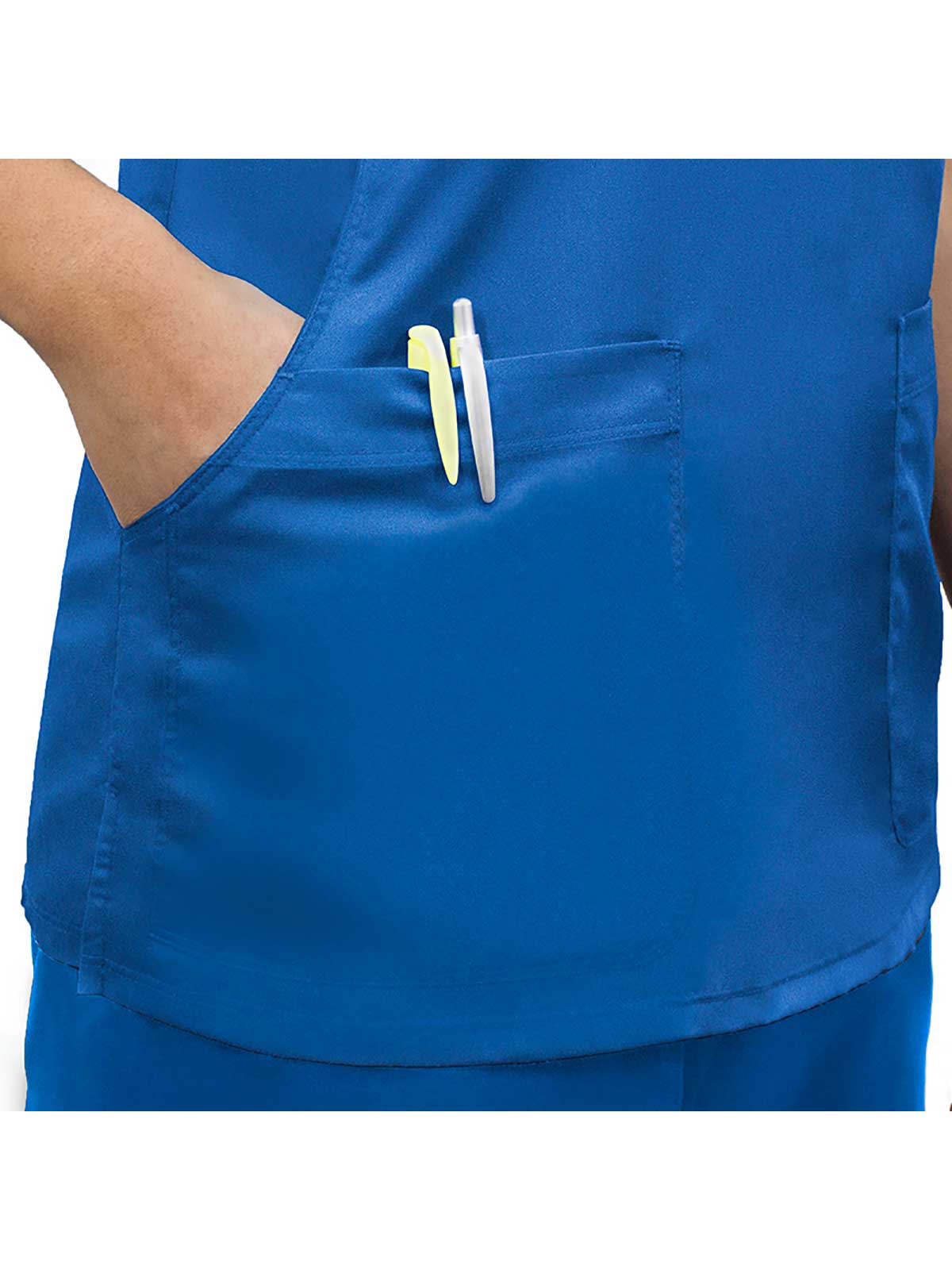 A Unisex Traditional fit V-neck features double needle stitching. The chest pocket features an instrument holder. Also included are two patch pockets, an additional instrument/cell phone pocket on right side, back yoke and side vents. Center back length: 28" Unisex...