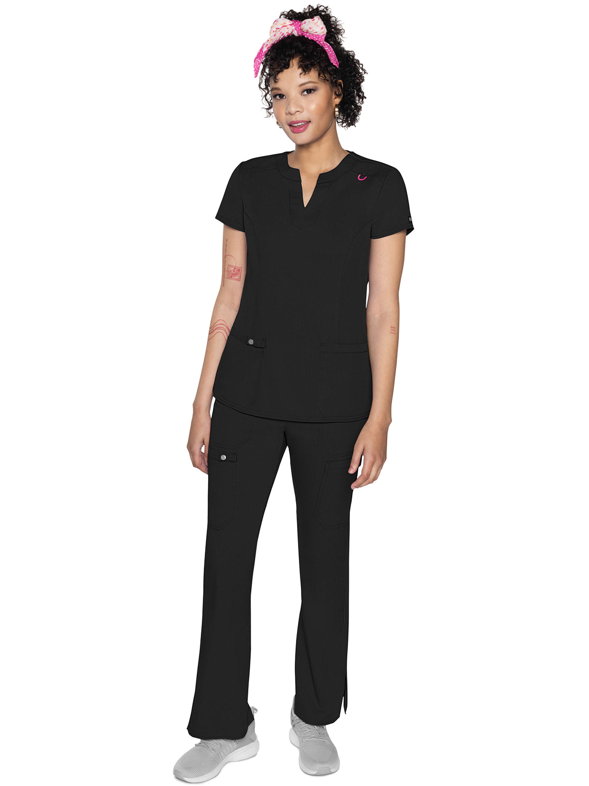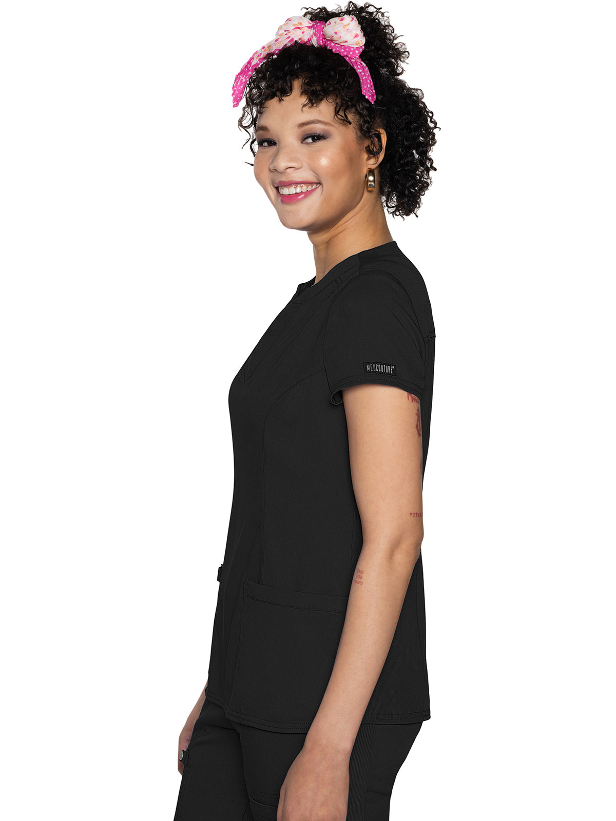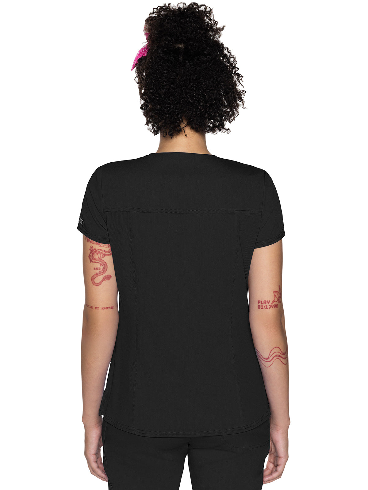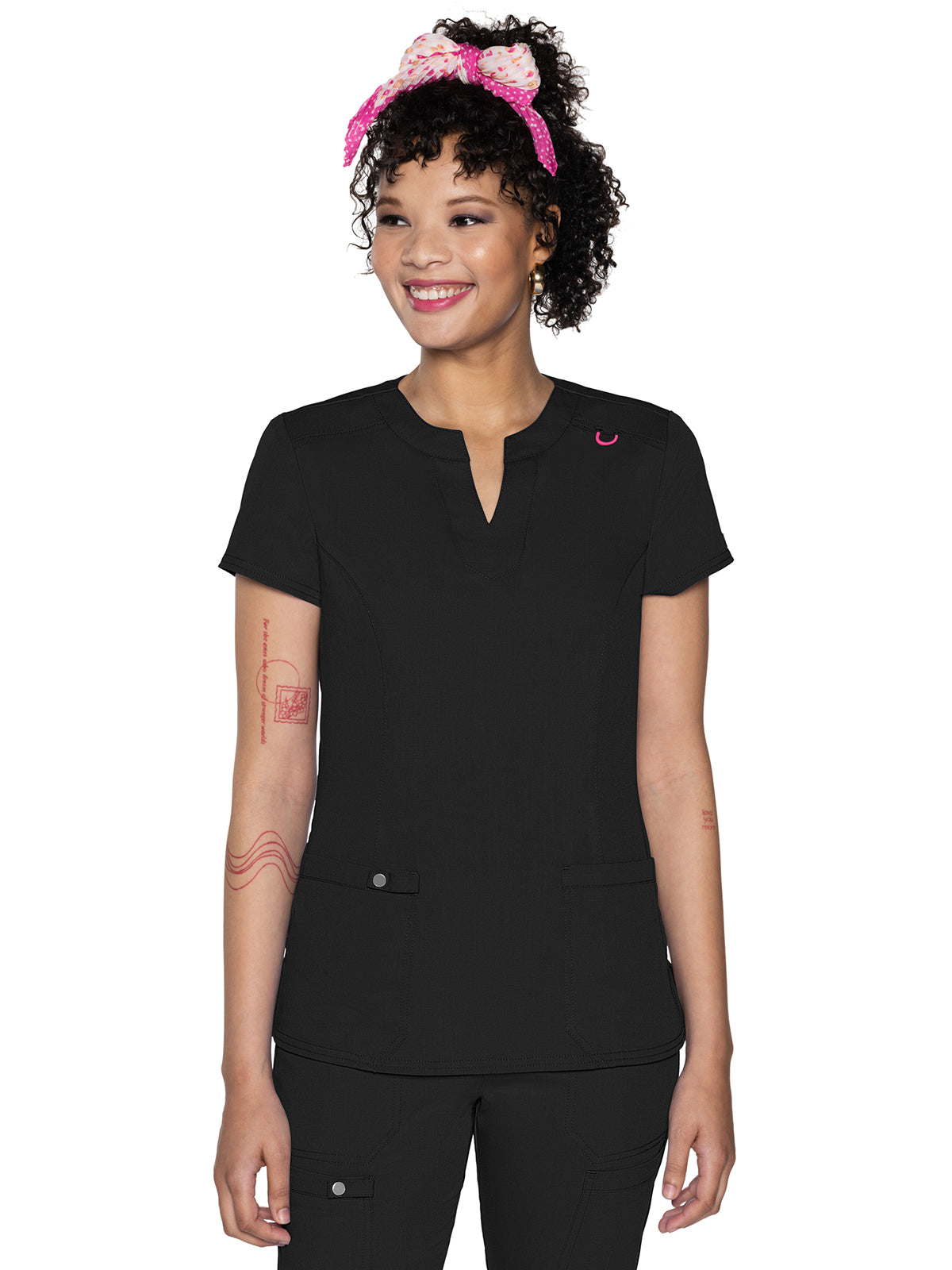 The Split Round Neck Top is an enduring style. It's crafted with a split crew neck, front shoulder yokes, back yoke, and princess seams. There's plenty of storage with two patch pockets, a utility tab for tools or pens, and a bungee ID badge loop on the wearer's left shoulder. The rib-knit back side panels help to create a flattering shape while the side vents allow for ease of movement. Missy fit. Center back length: 25 ½"