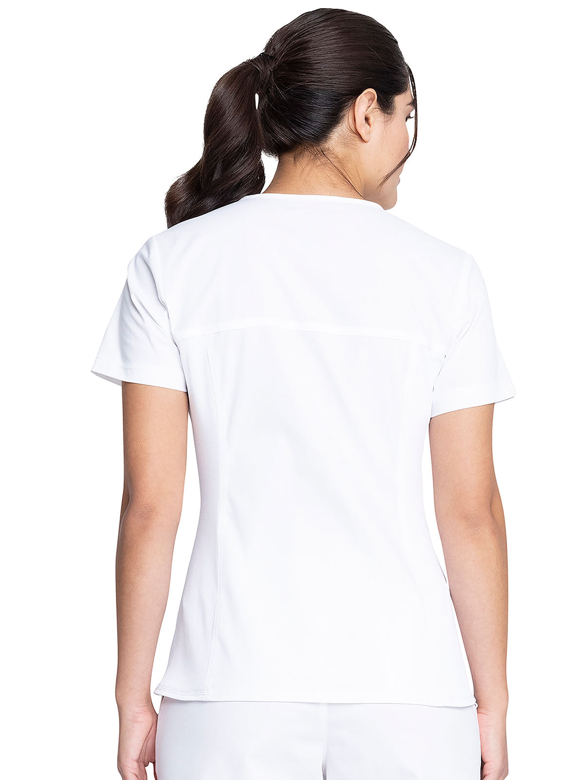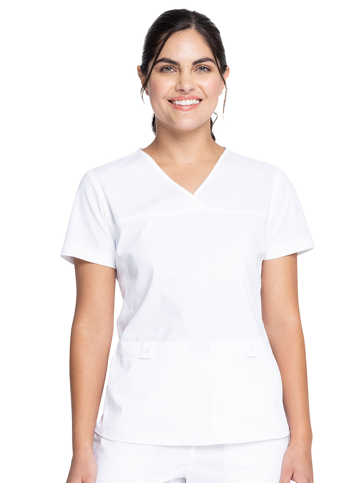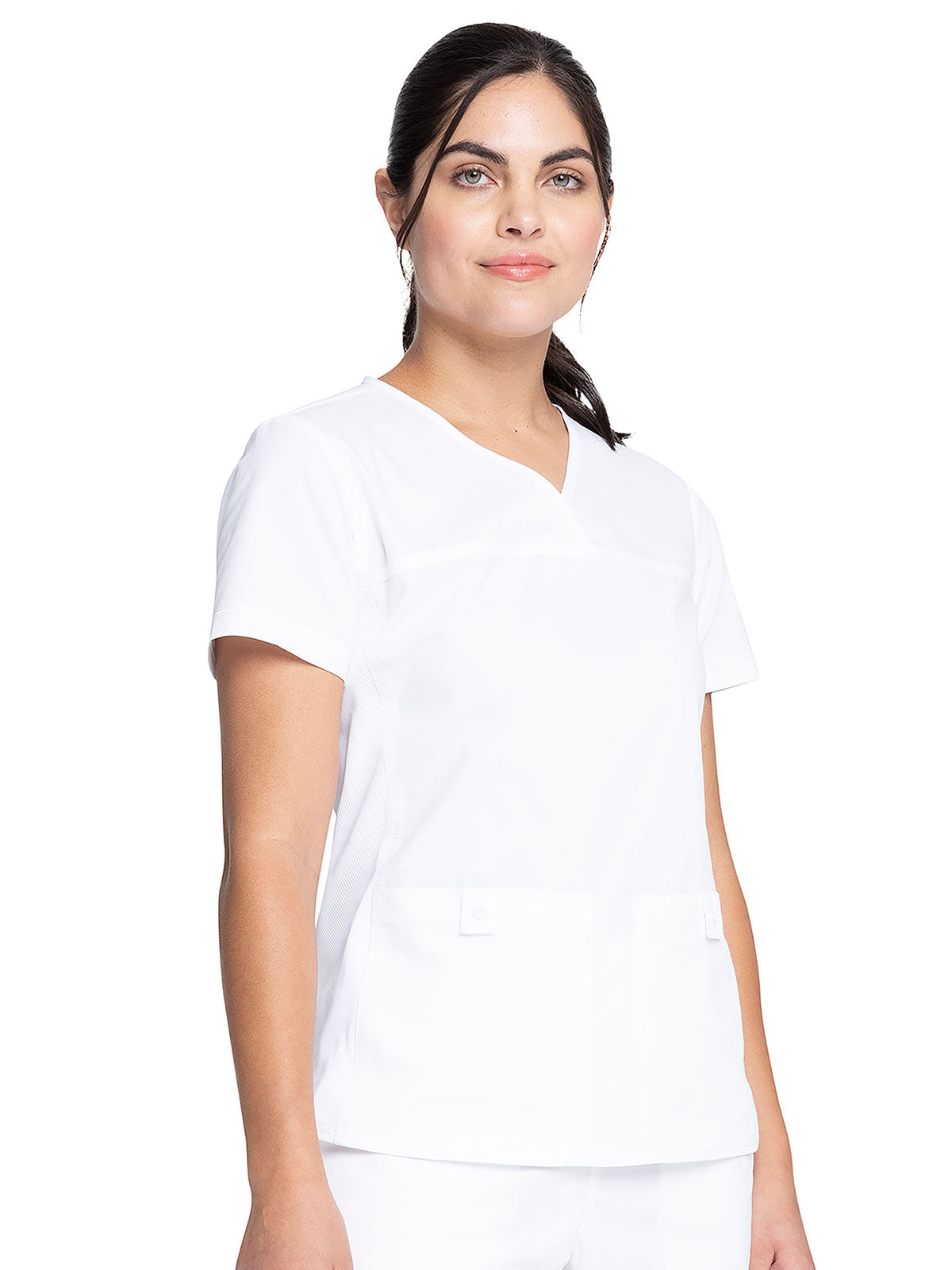A Modern Classic fit, V-neck top features front and back yoke seams and tonal knit side panels for extra comfort and a slimming look. There are two front patch pockets with snap tabs for added security. Center back length: 26"