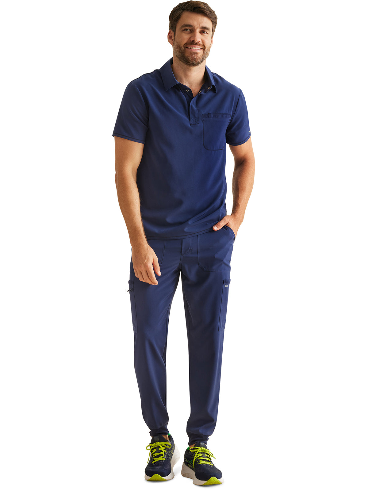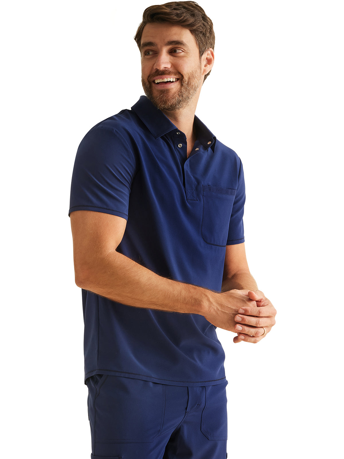 This updated Men¿s fit collared polo shirt features a covered placket with three cap snaps on the placket and dyed-to-match mesh on the back yoke. There is one welt chest pocket with dyed-to-match mesh trim on the top edge and a bungee ID badge loop inside. Coverstitching and topstitching finish this Men's scrub top. Center back length: 27 ½"