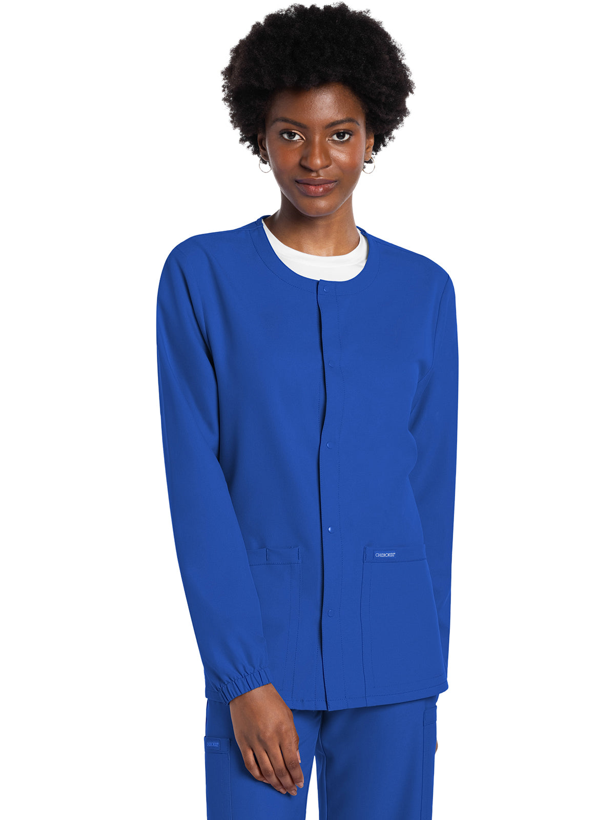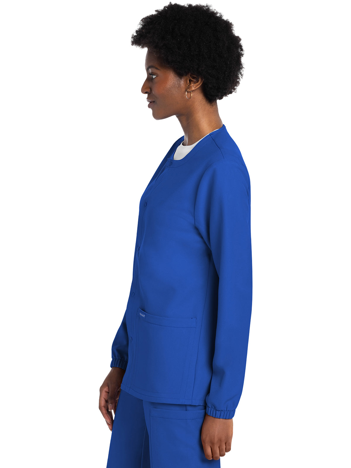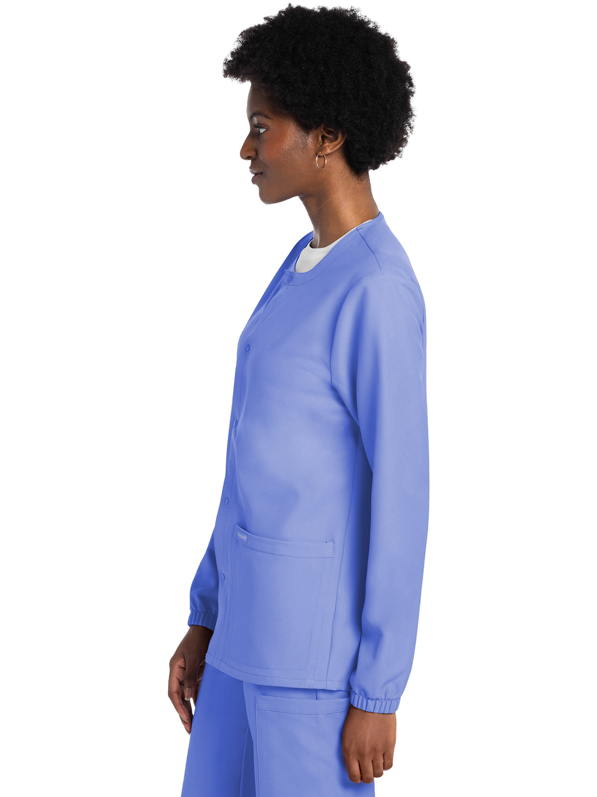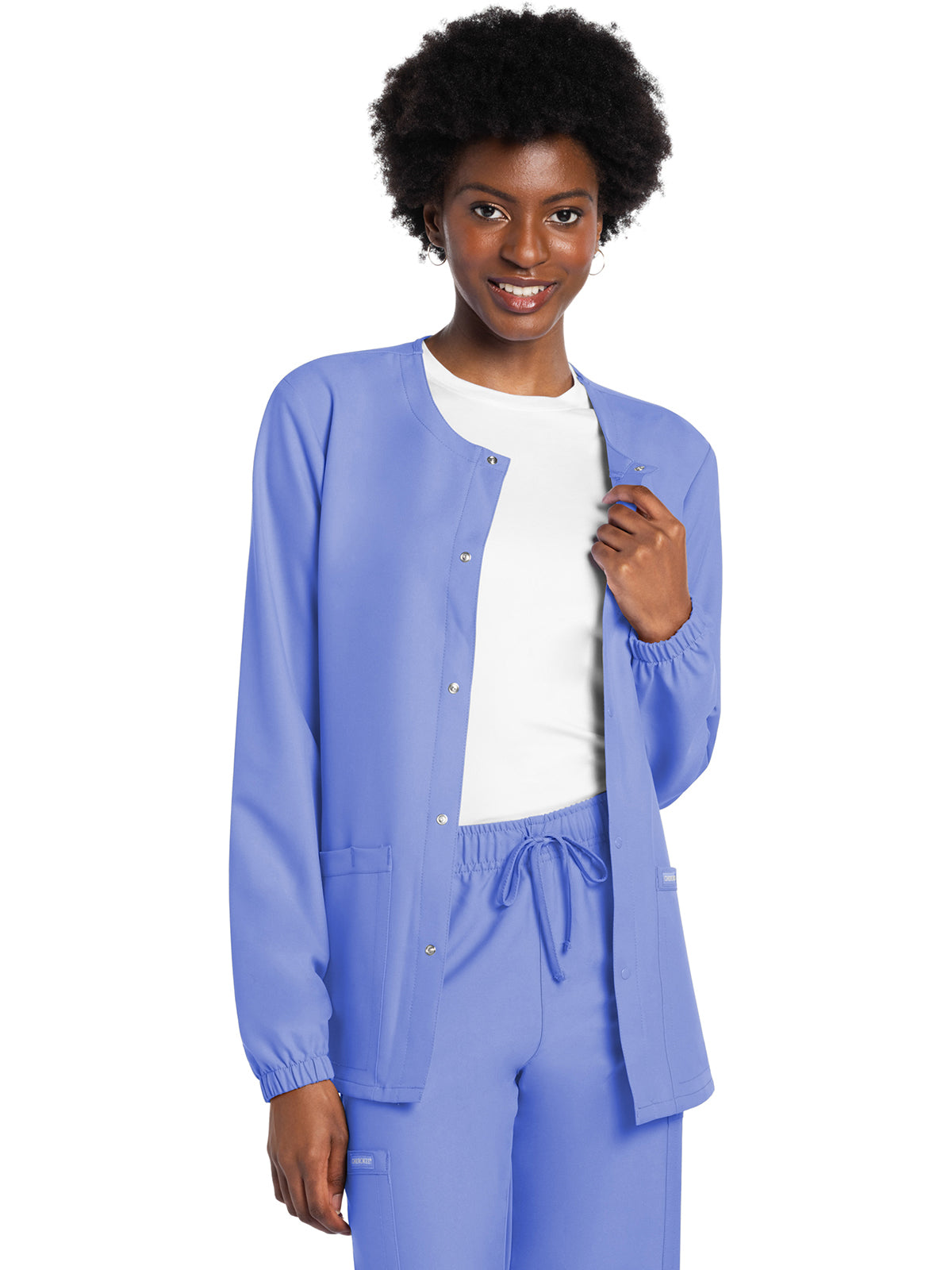 This Unisex fit snap front scrub jacket features tonal-colored snaps and elasticized sleeve hems. There are two roomy patch pockets with reverse hem trim. Pen/instrument slot on wearer's right pocket. Decorative tonal topstitching adds the finishing touch. Center back length: 28 1/2"