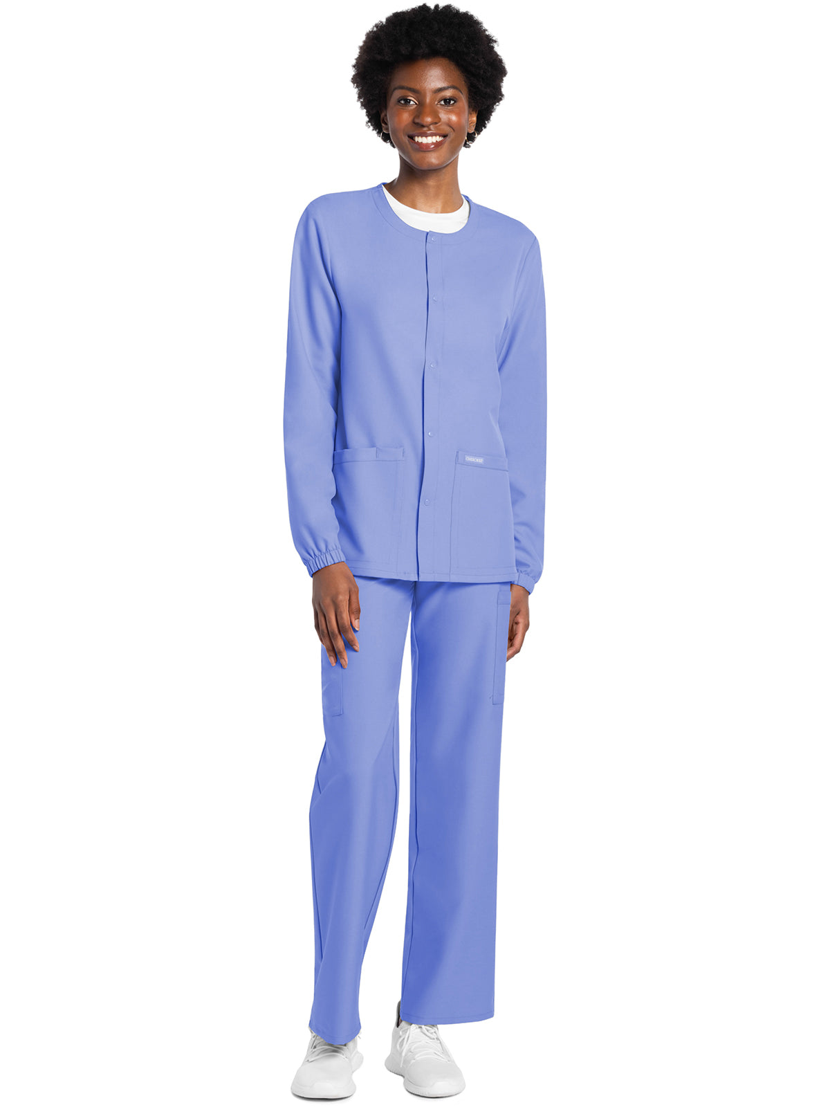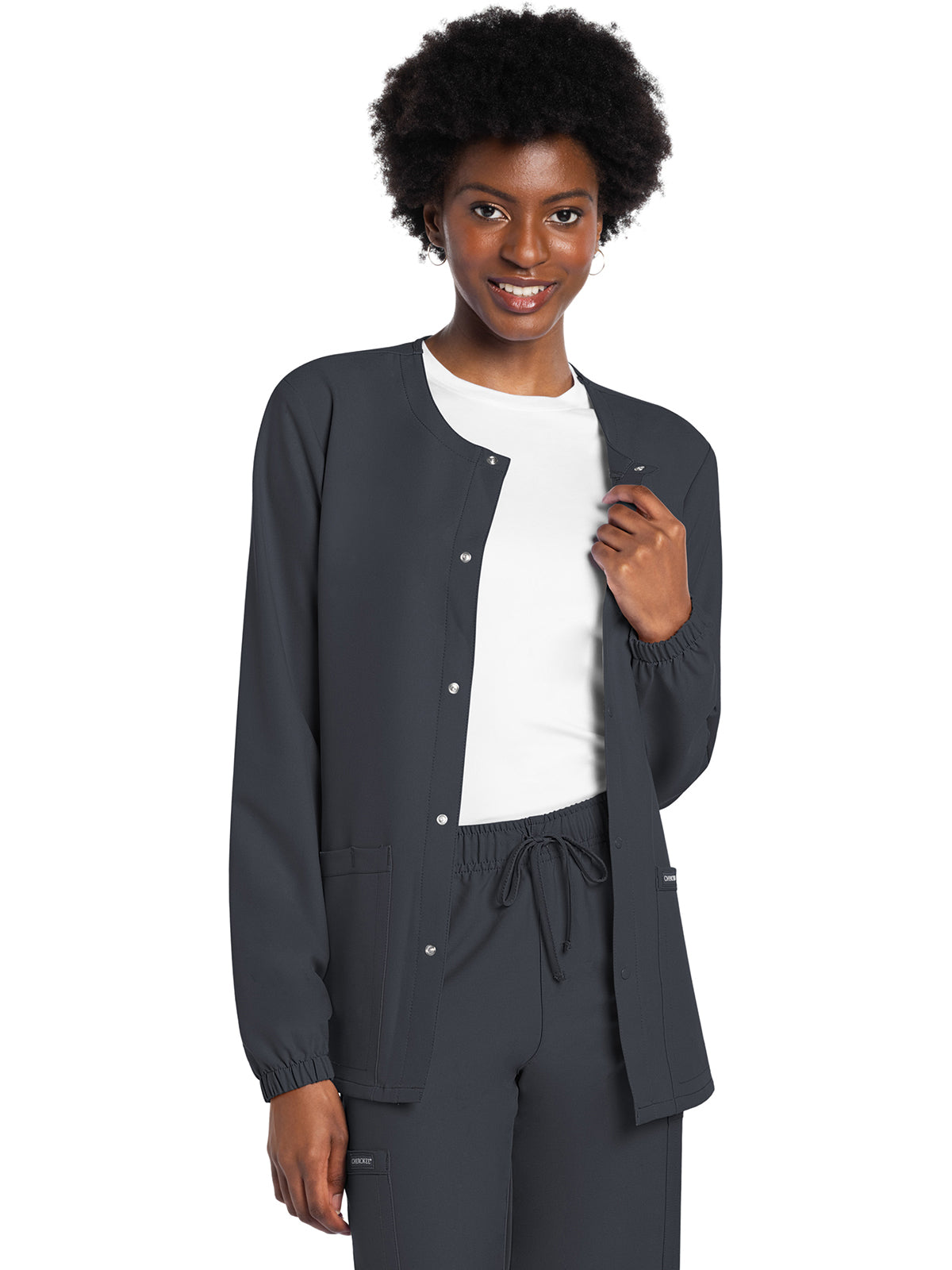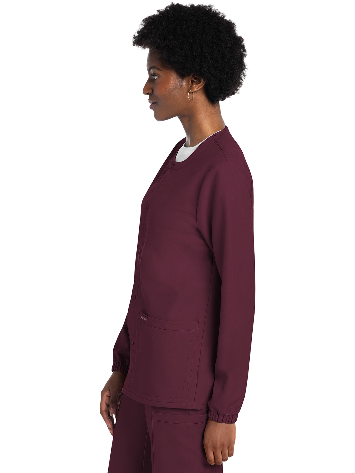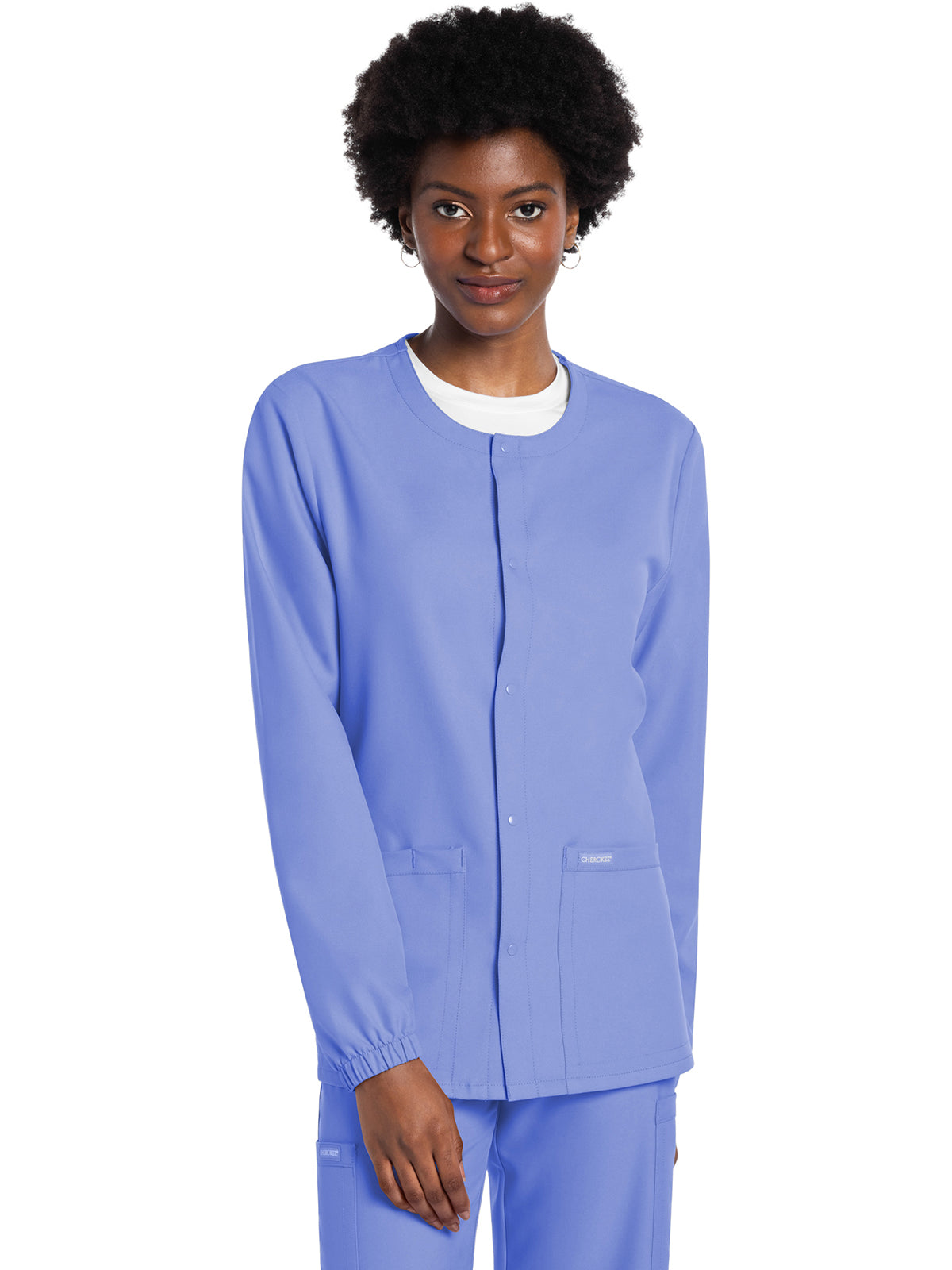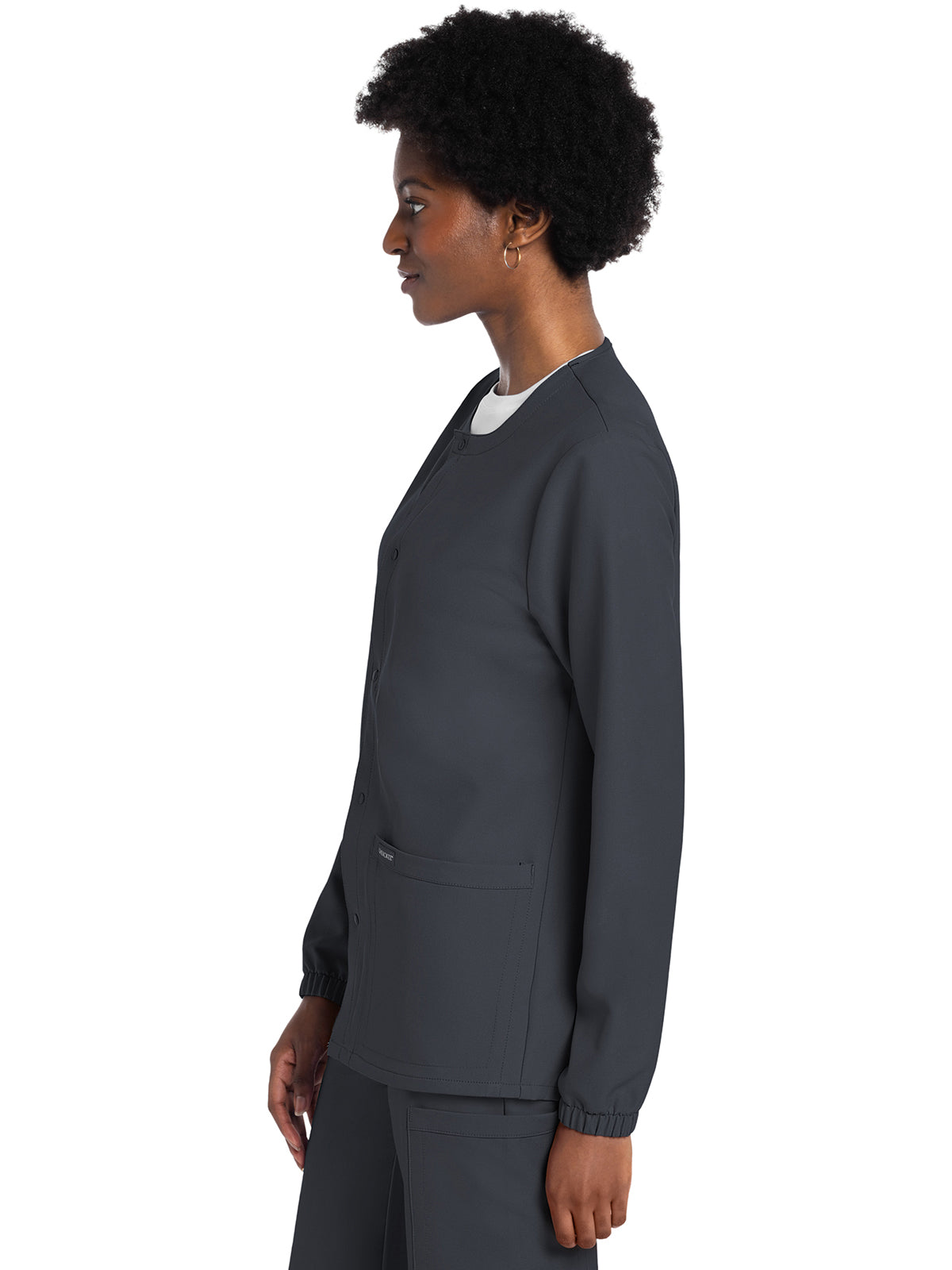 This Unisex fit snap front scrub jacket features tonal-colored snaps and elasticized sleeve hems. There are two roomy patch pockets with reverse hem trim. Pen/instrument slot on wearer's right pocket. Decorative tonal topstitching adds the finishing touch. Center back length: 28 1/2"