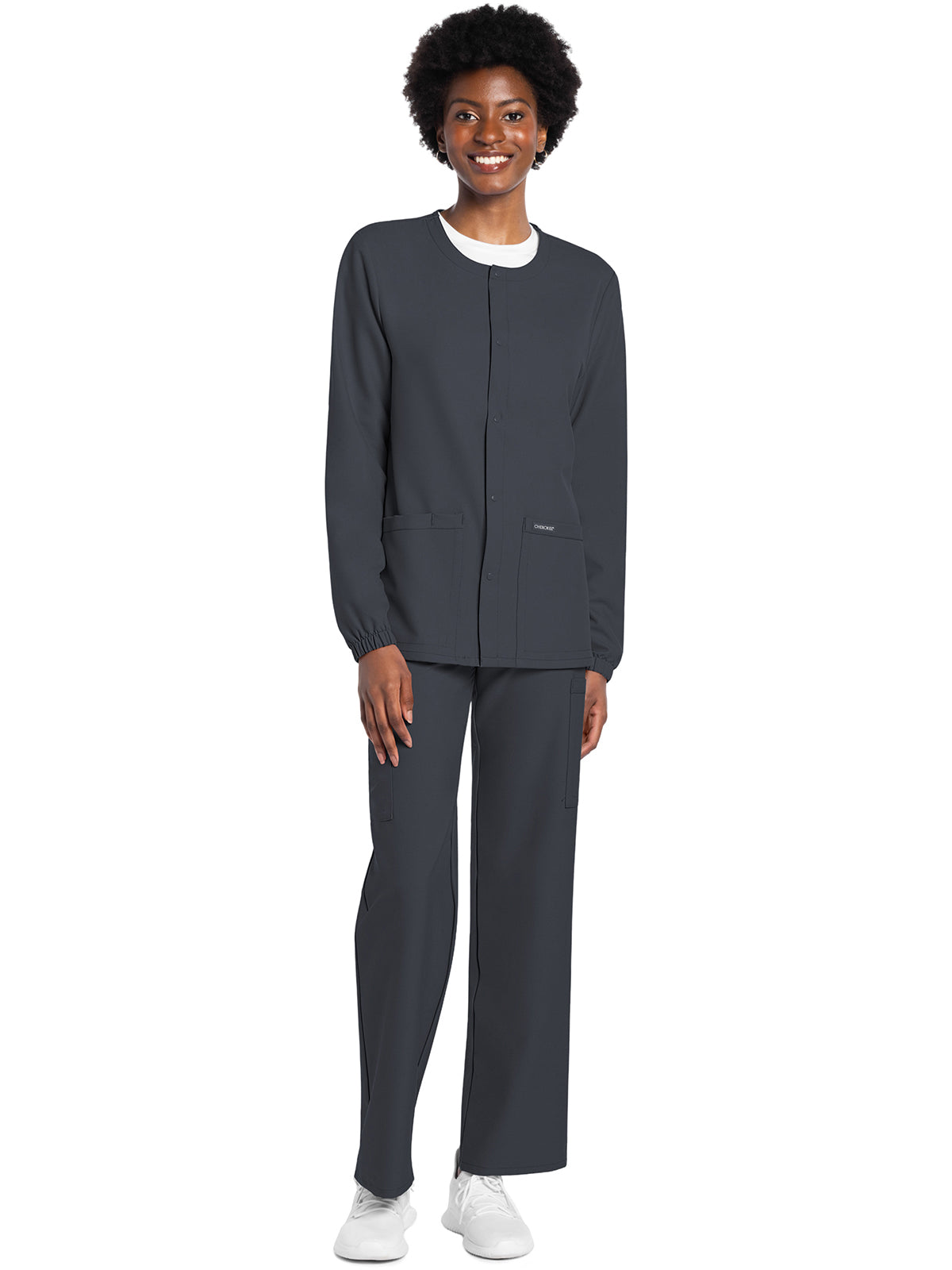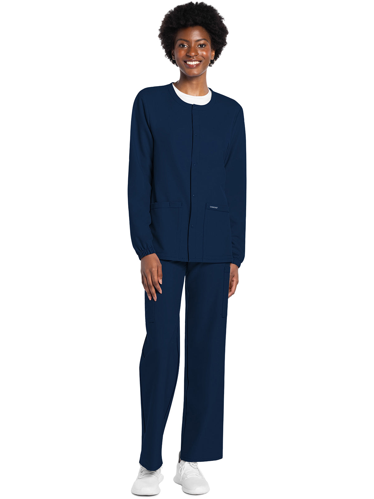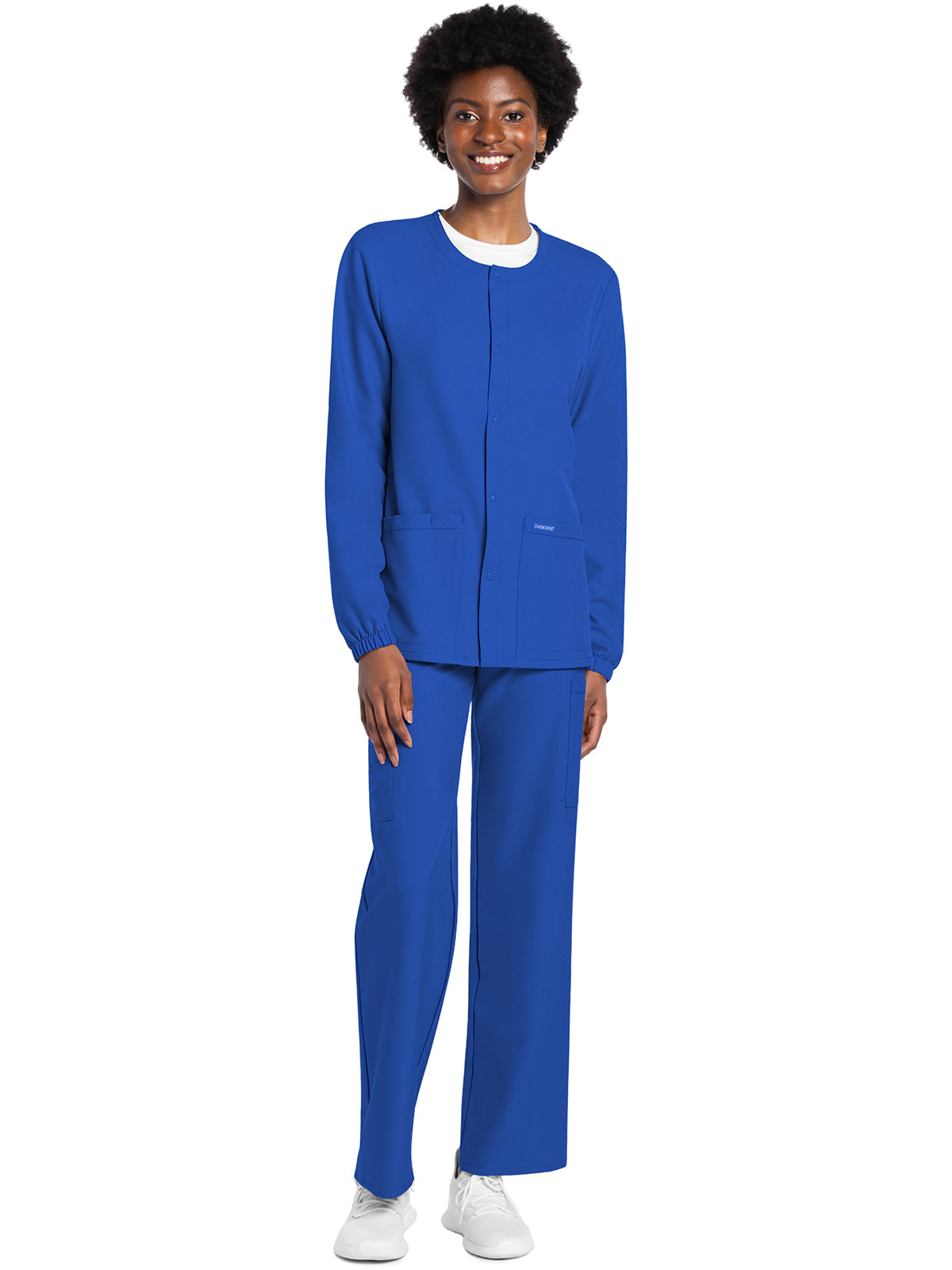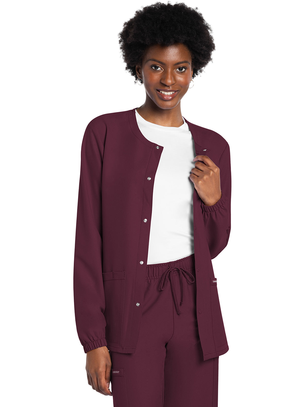 This Unisex fit snap front scrub jacket features tonal-colored snaps and elasticized sleeve hems. There are two roomy patch pockets with reverse hem trim. Pen/instrument slot on wearer's right pocket. Decorative tonal topstitching adds the finishing touch. Center back length: 28 1/2"
