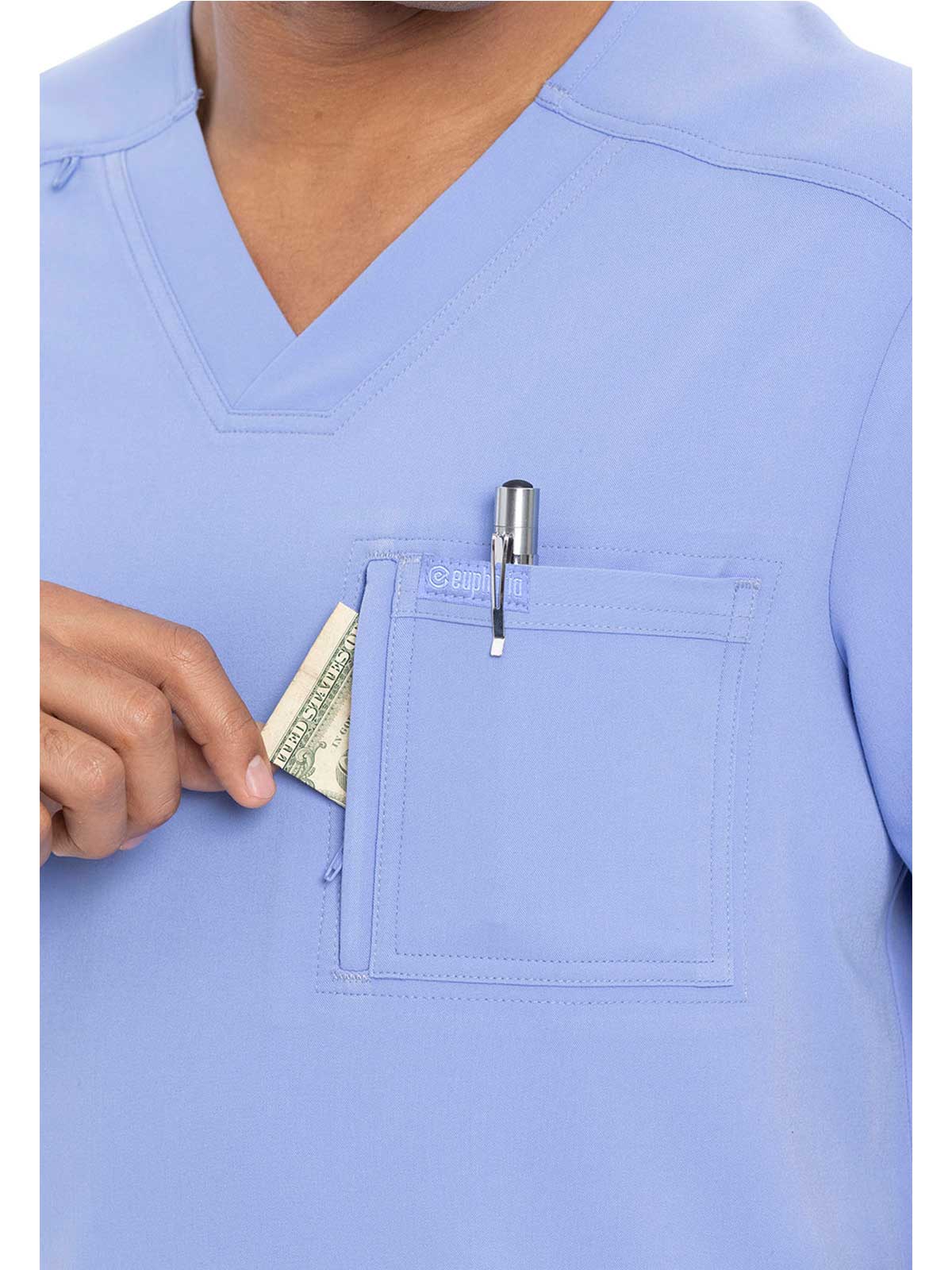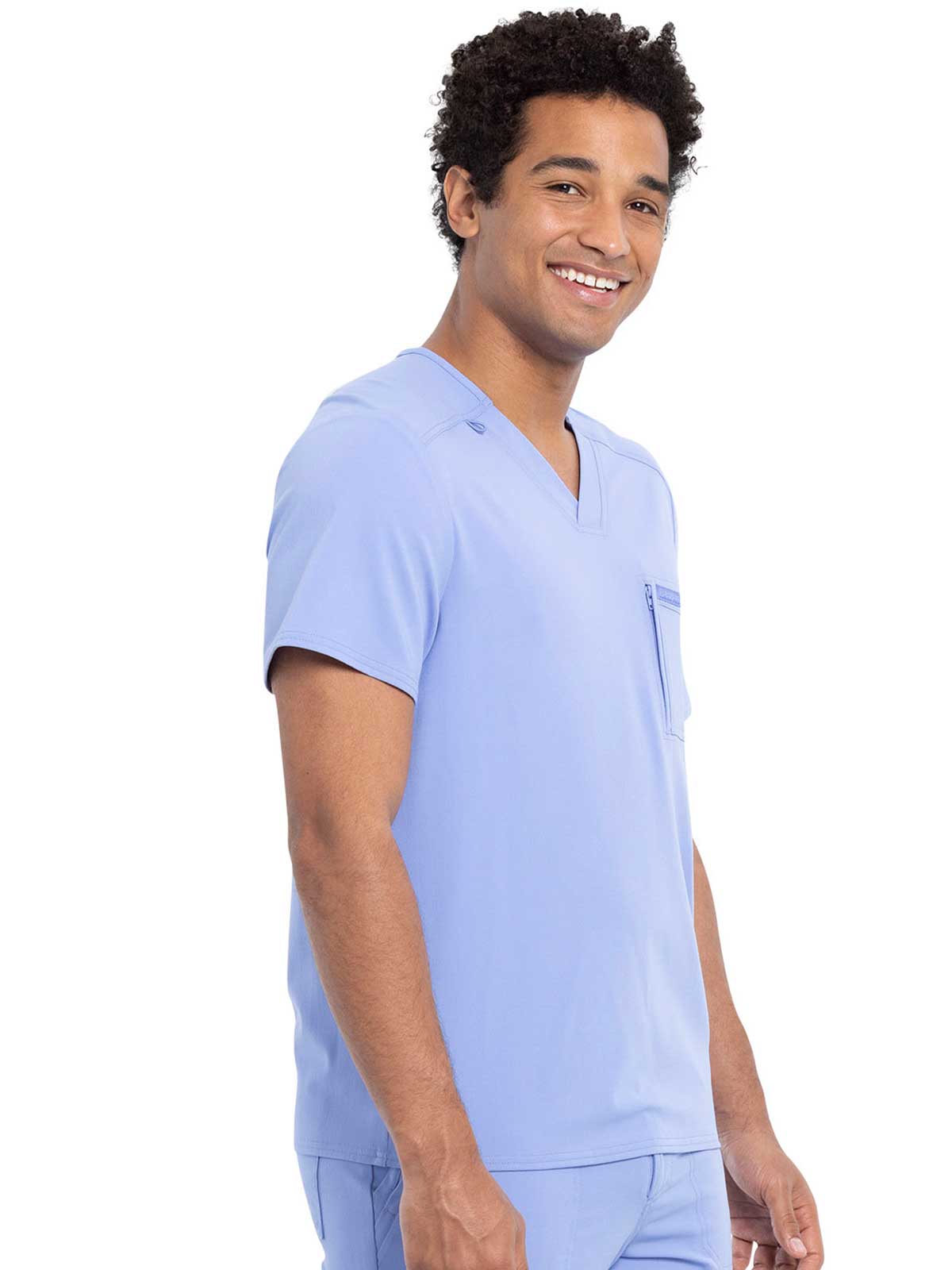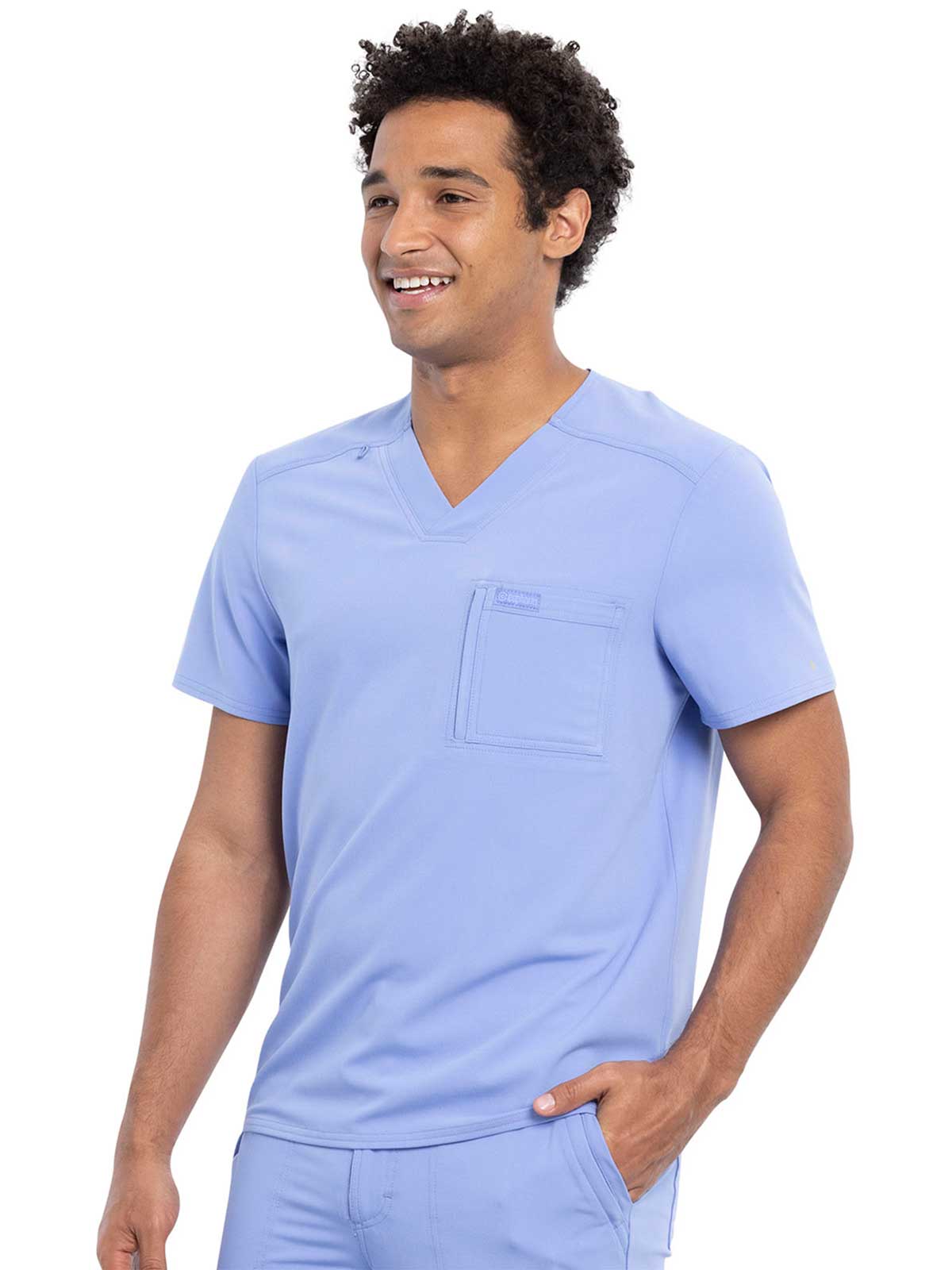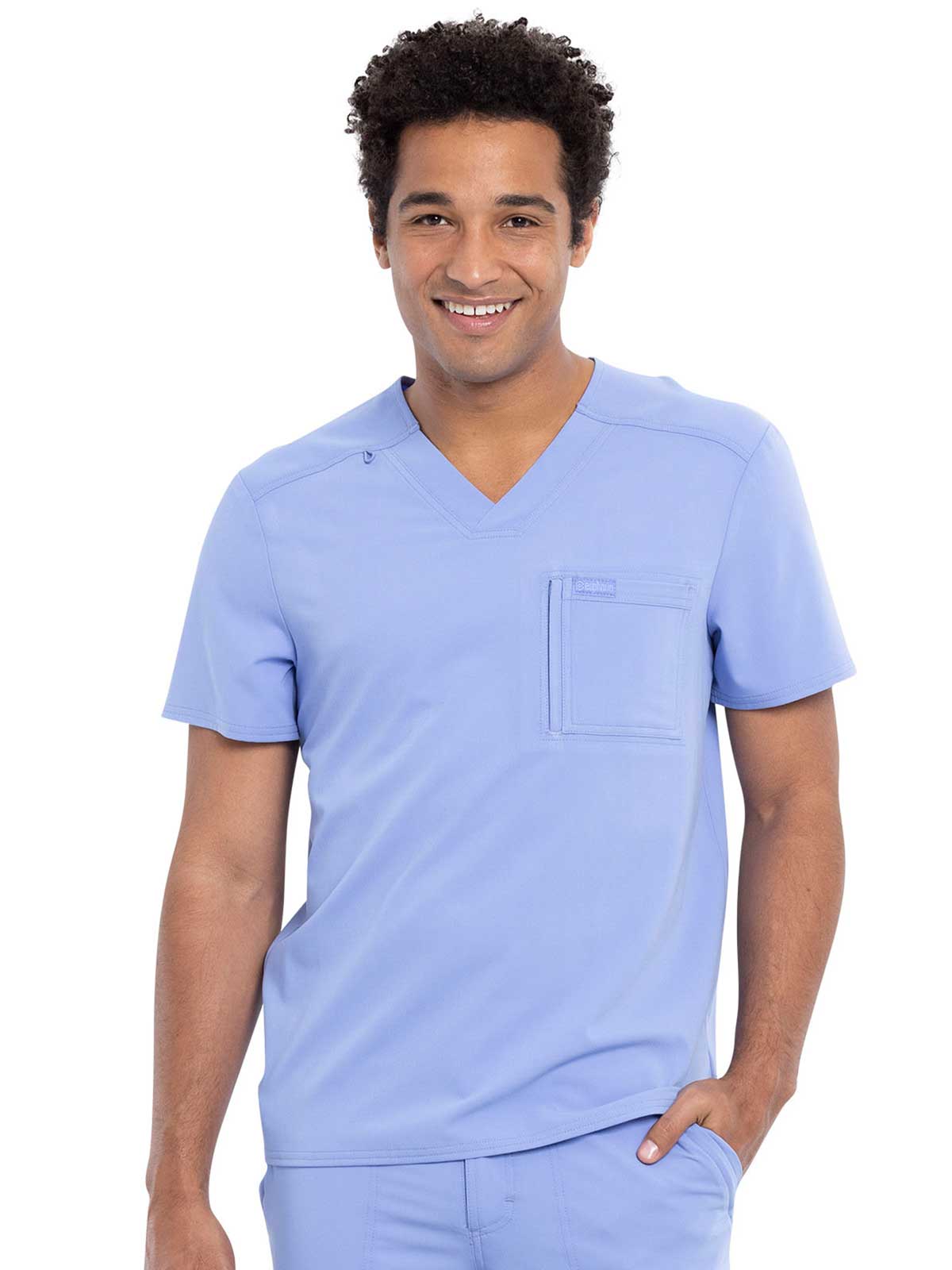 This Men's Modern fit V-neck top features front and back yoke seams plus a bungee ID badge loop on the wearer's right yoke seam. There are two pockets: one welt chest pocket with a zip security pocket. This style looks great tucked in or untucked. Center back length 28"