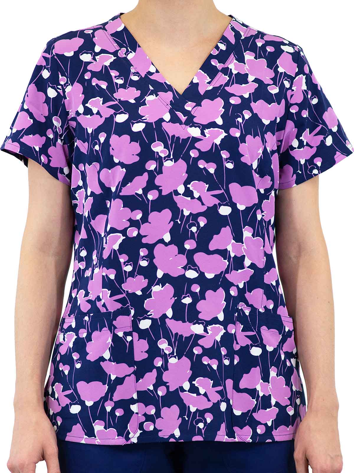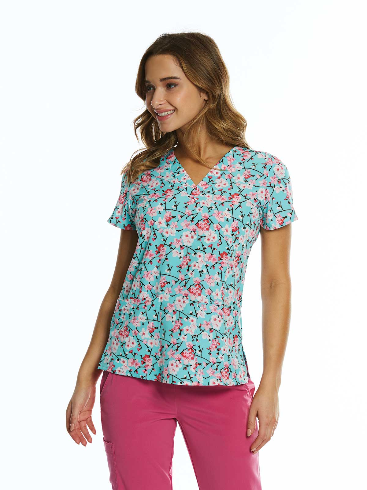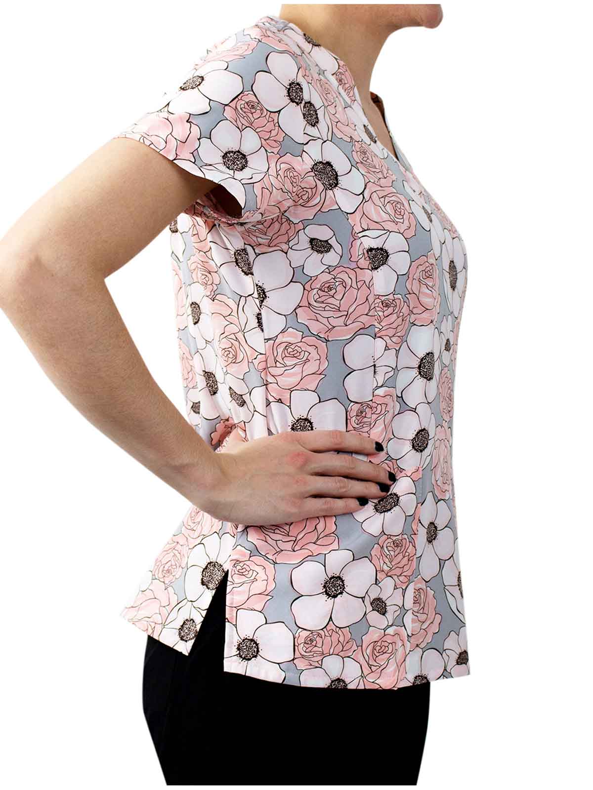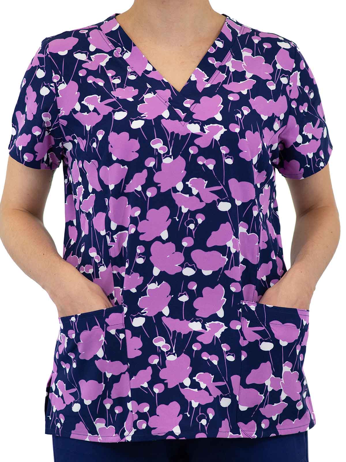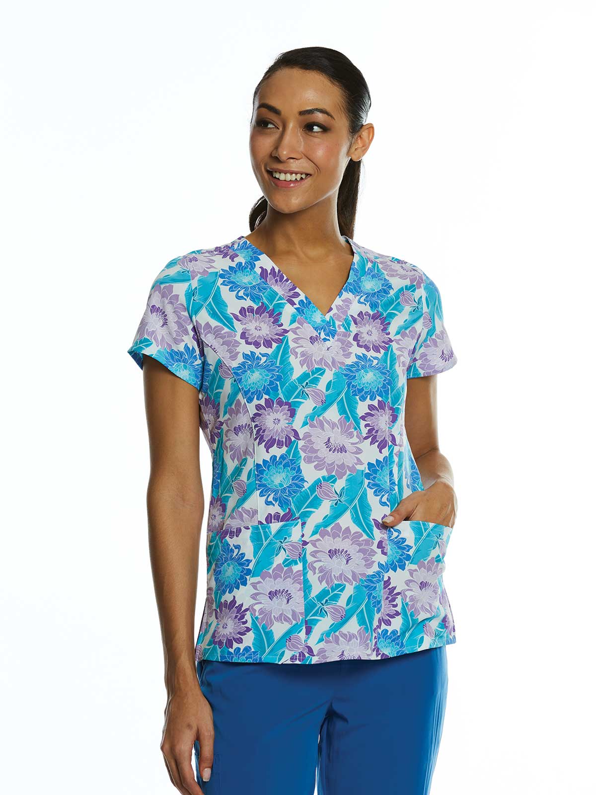 "*Printed curved v-neck top *Front princess seams and back darts for added style and shape *Two slant patch pockets with inner cell pocket *Solid contrast at back facing *Side vents" Banded v-neckline Short sleeves Front princess seaming Back shaping darts...