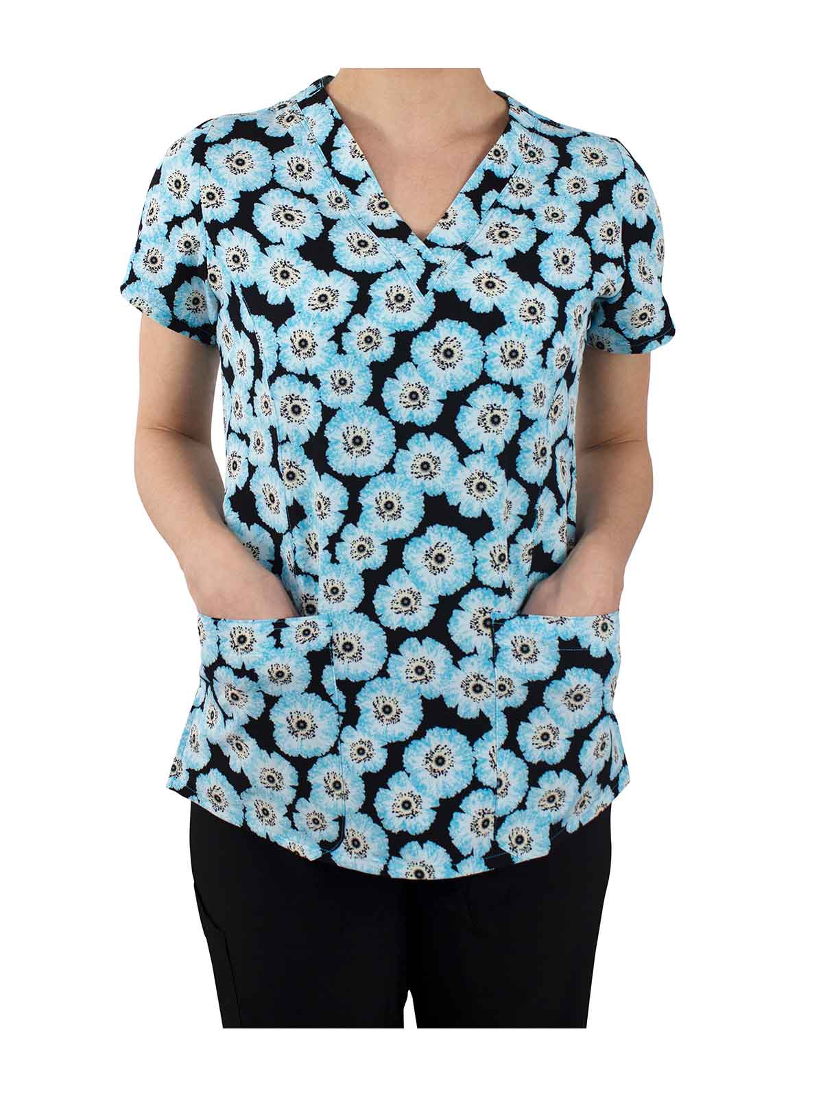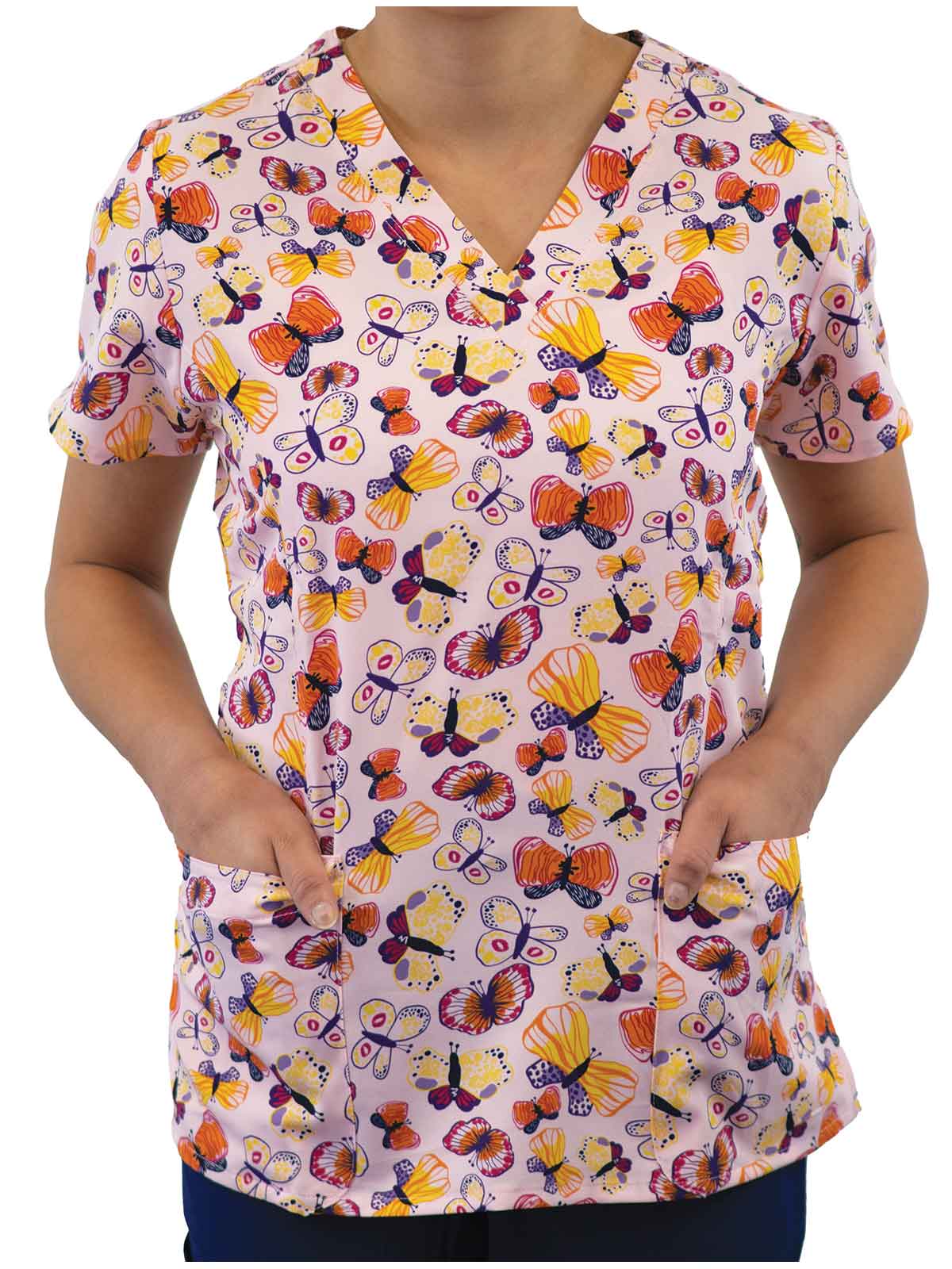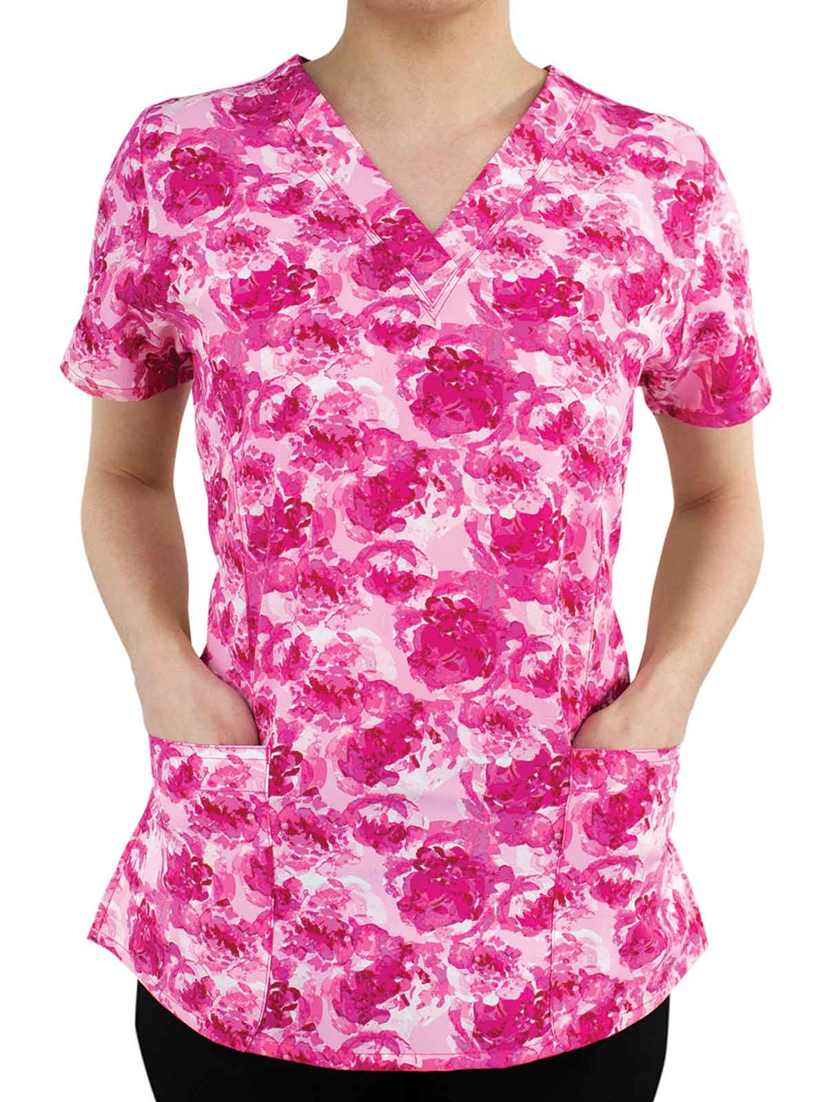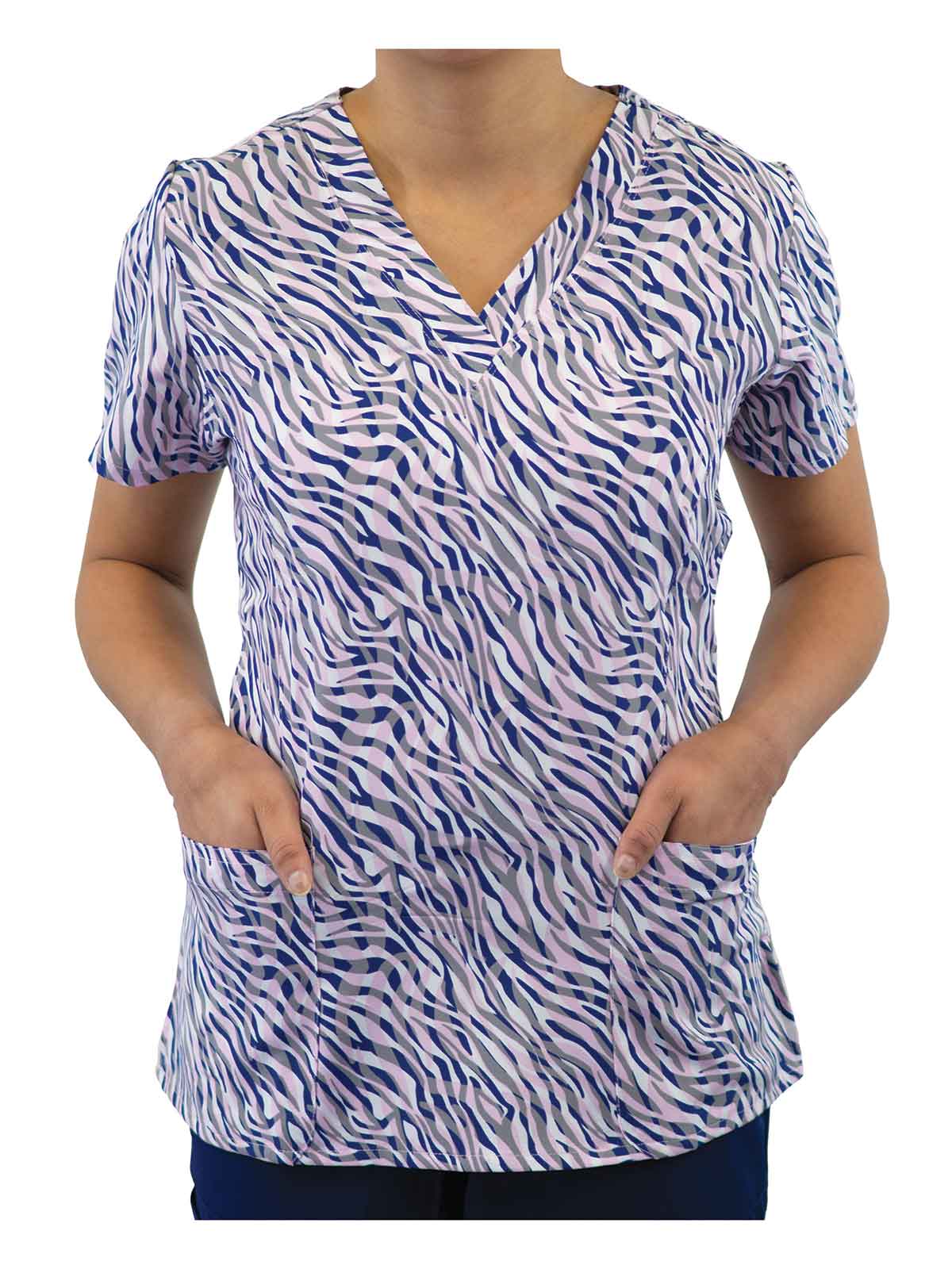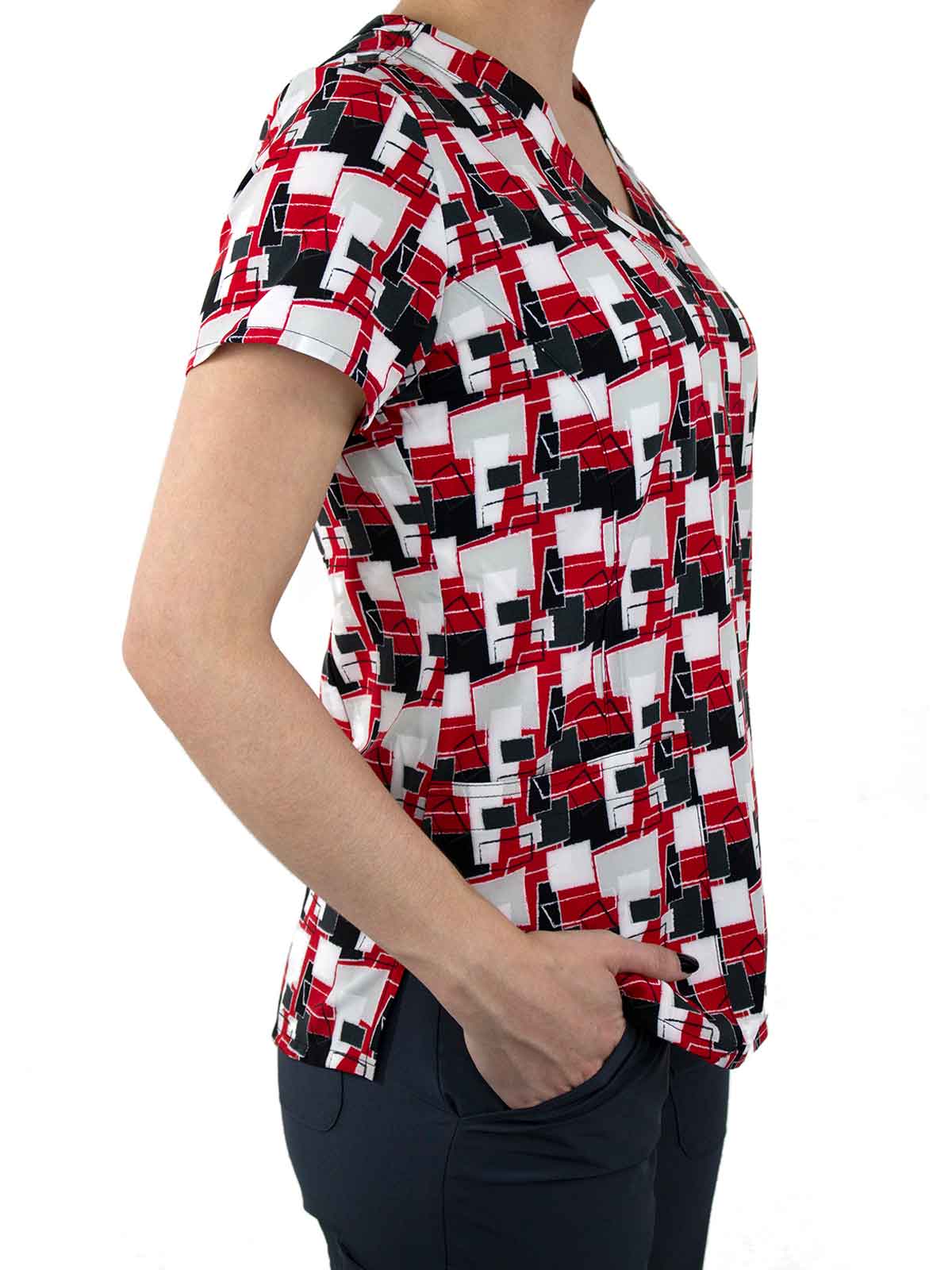 "*Printed curved v-neck top *Front princess seams and back darts for added style and shape *Two slant patch pockets with inner cell pocket *Solid contrast at back facing *Side vents" Banded v-neckline Short sleeves Front princess seaming Back shaping darts...
