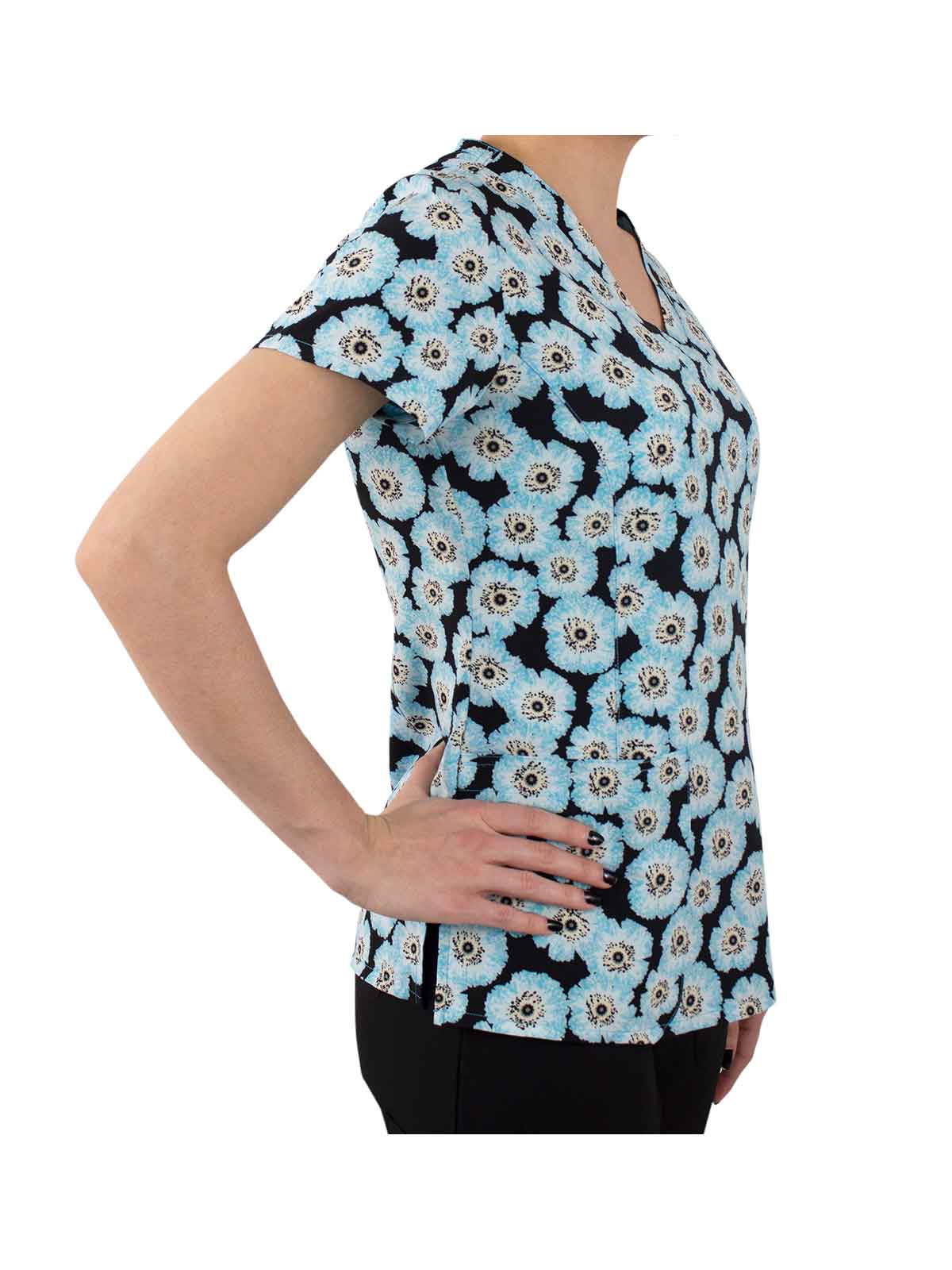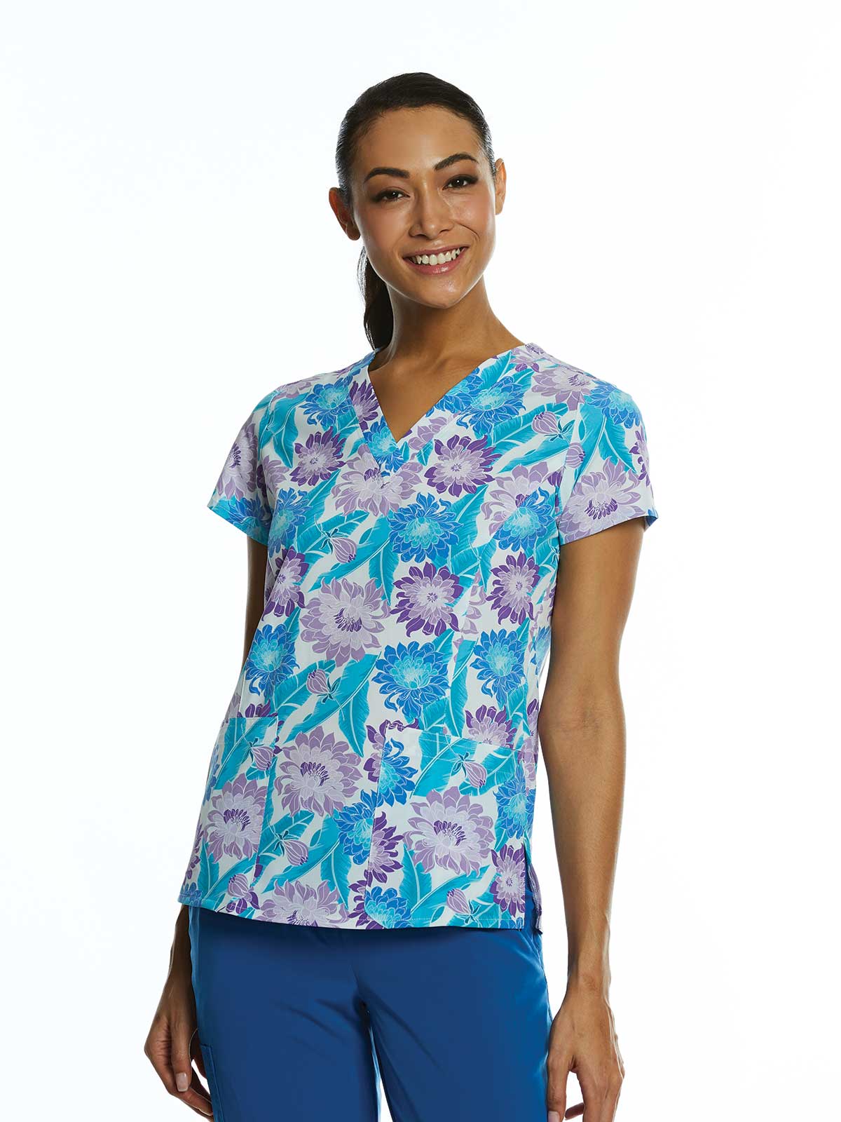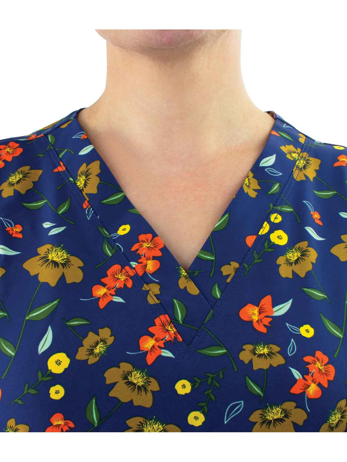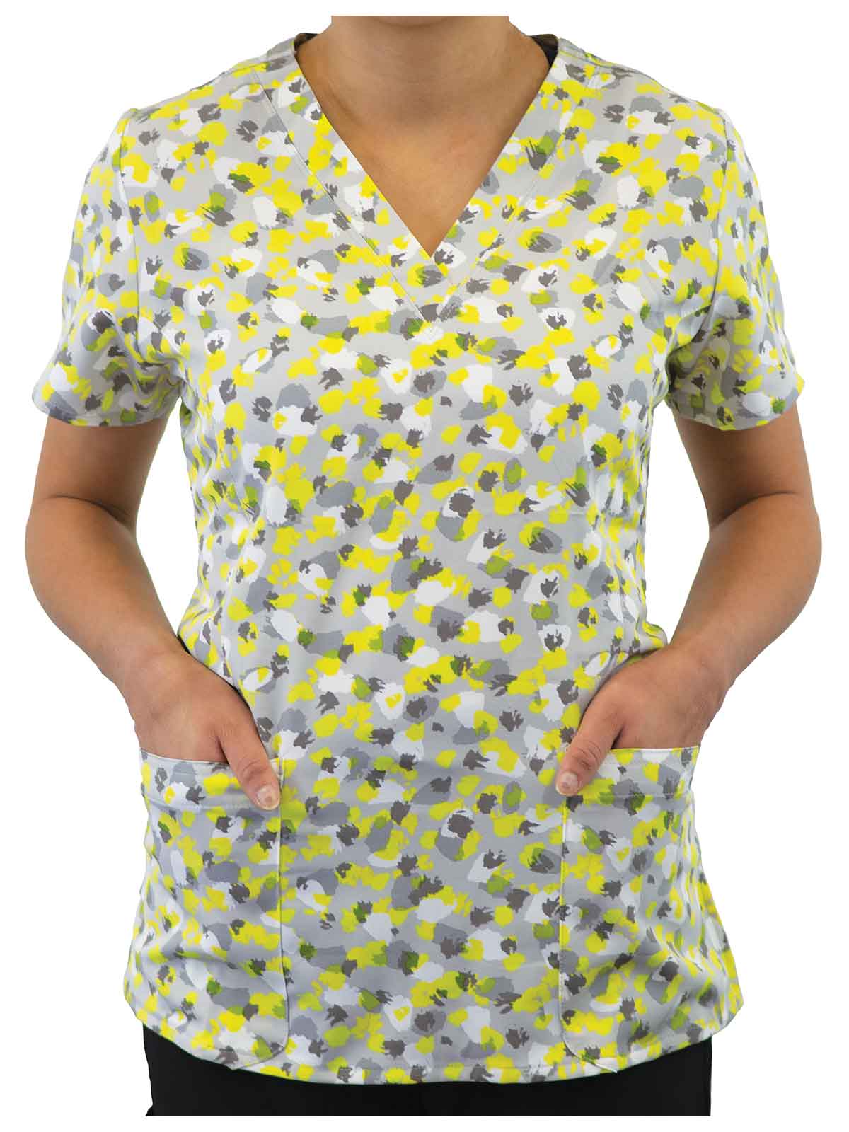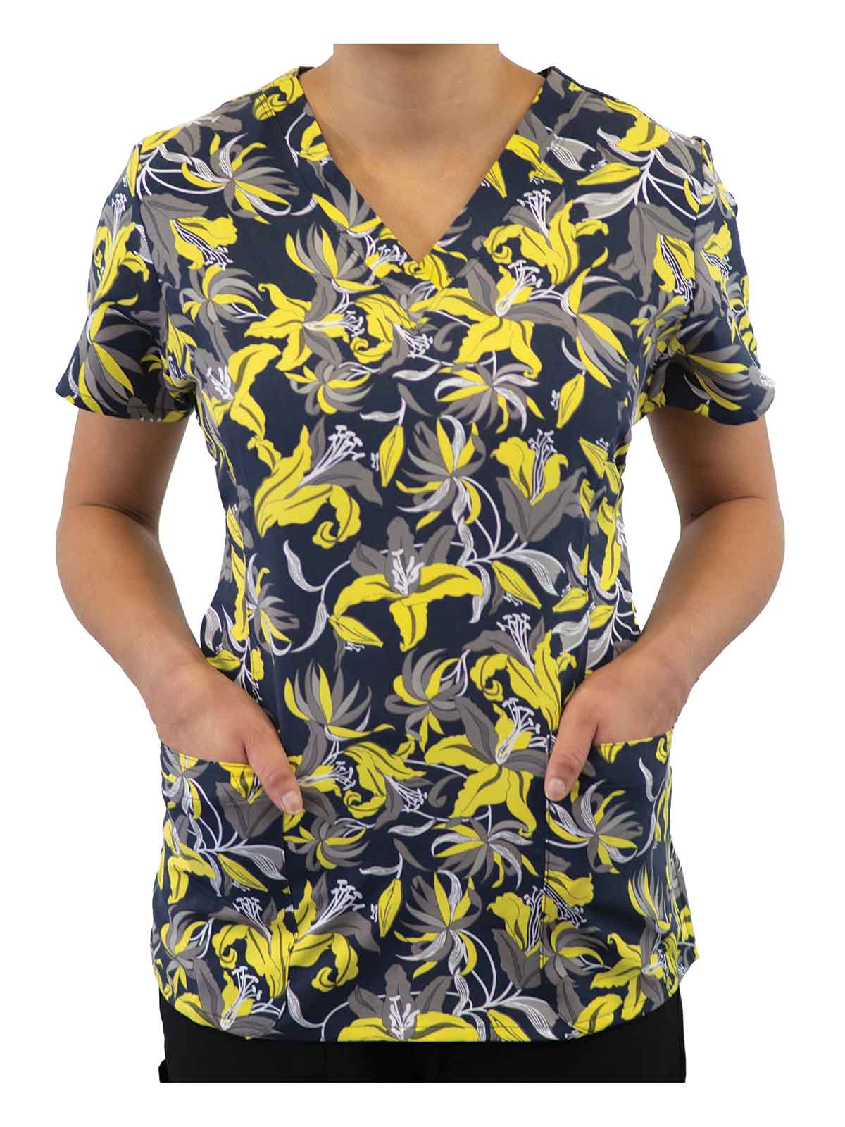 "*Printed curved v-neck top *Front princess seams and back darts for added style and shape *Two slant patch pockets with inner cell pocket *Solid contrast at back facing *Side vents" Banded v-neckline Short sleeves Front princess seaming Back shaping darts...