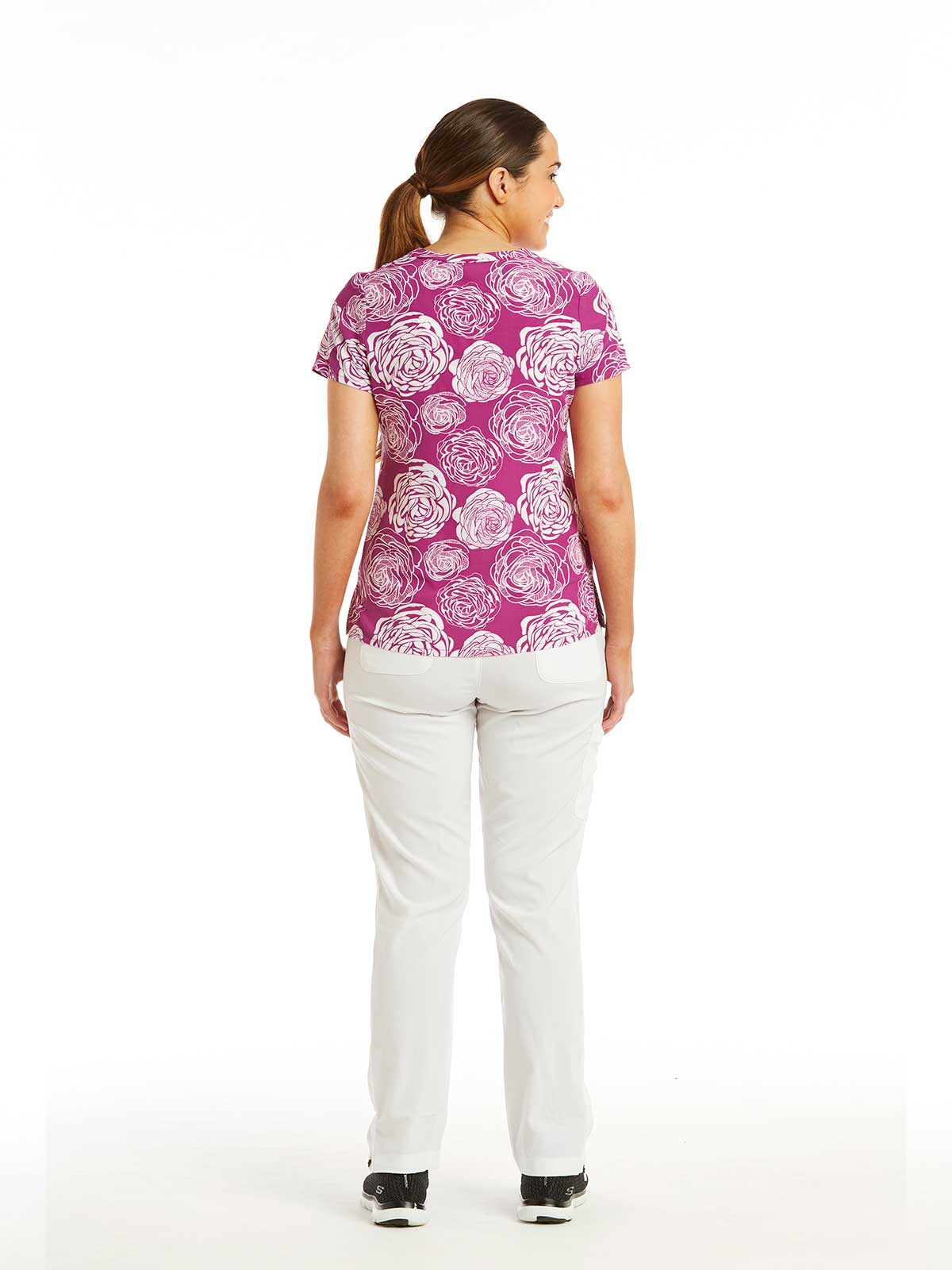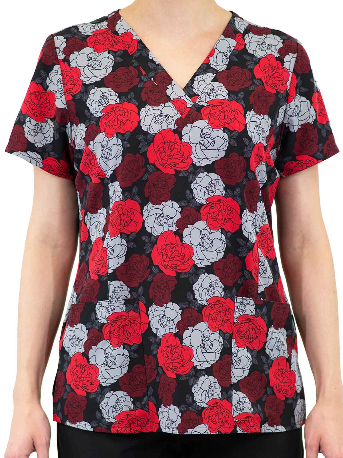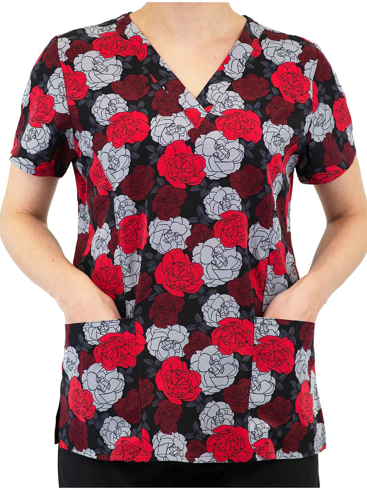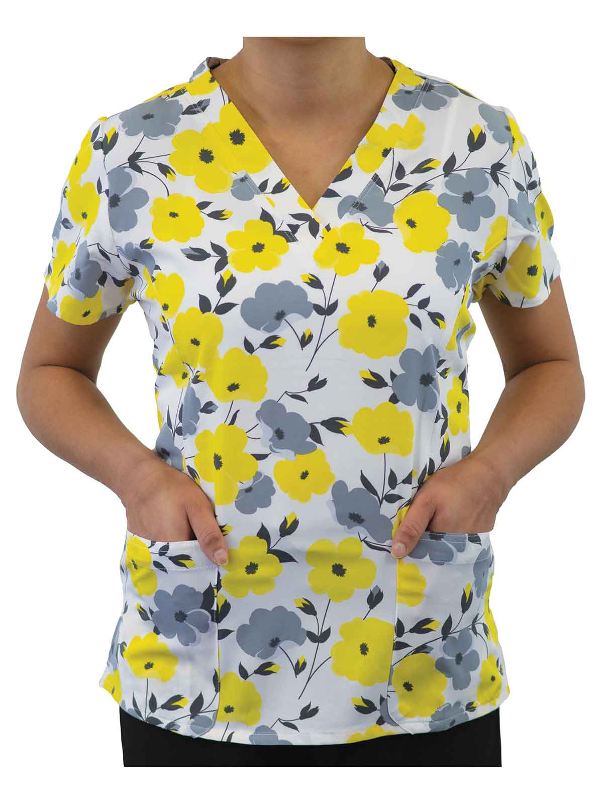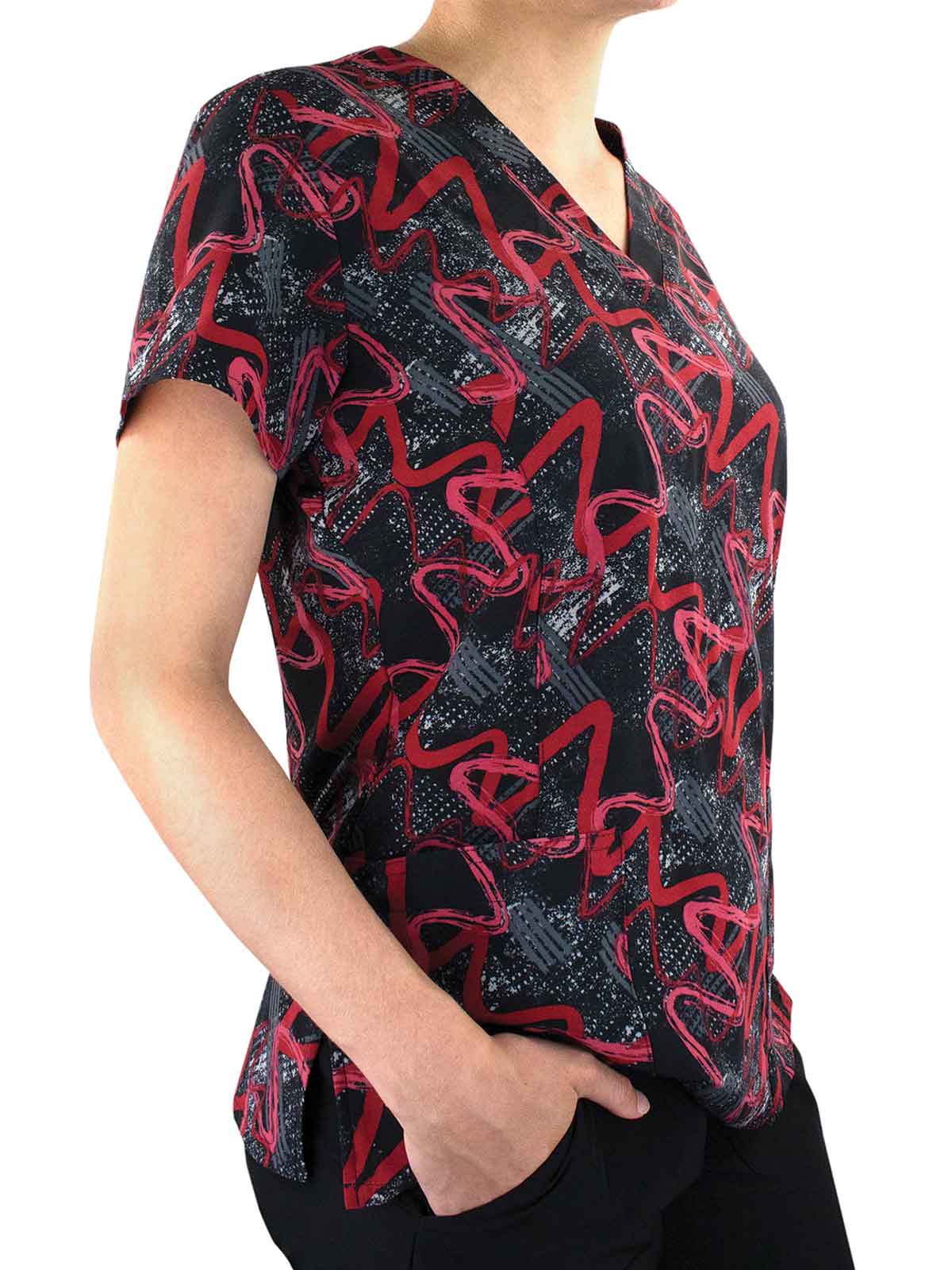 "*Printed curved v-neck top *Front princess seams and back darts for added style and shape *Two slant patch pockets with inner cell pocket *Solid contrast at back facing *Side vents" Banded v-neckline Short sleeves Front princess seaming Back shaping darts...