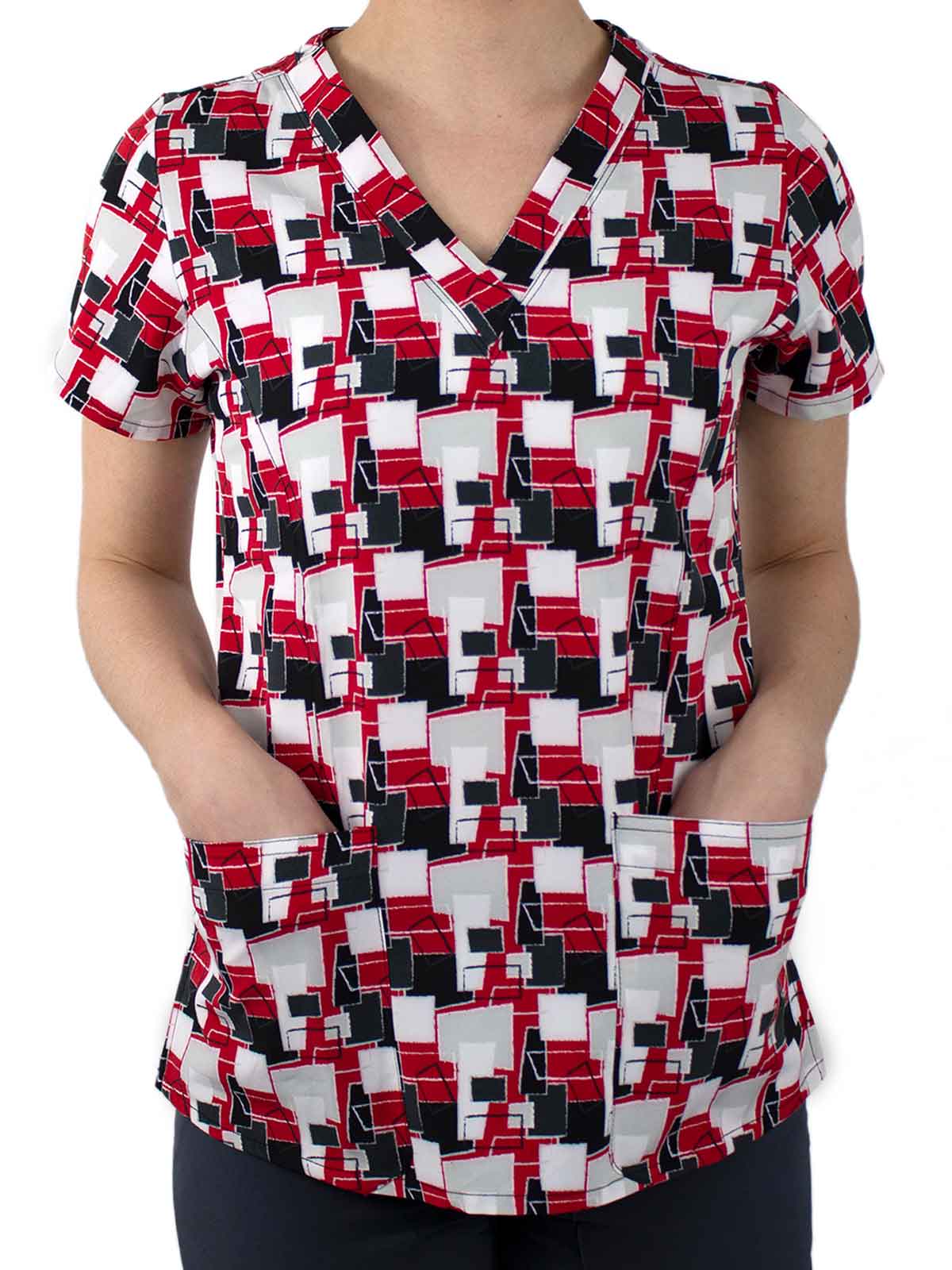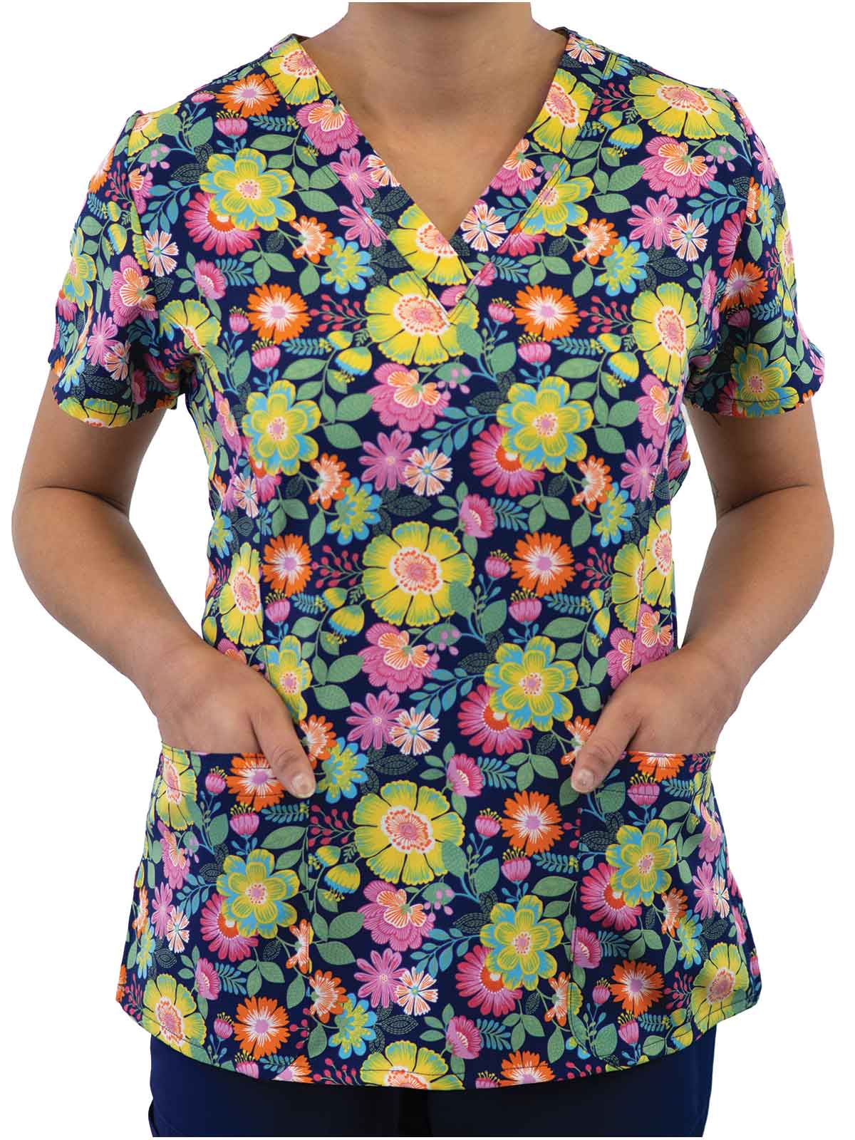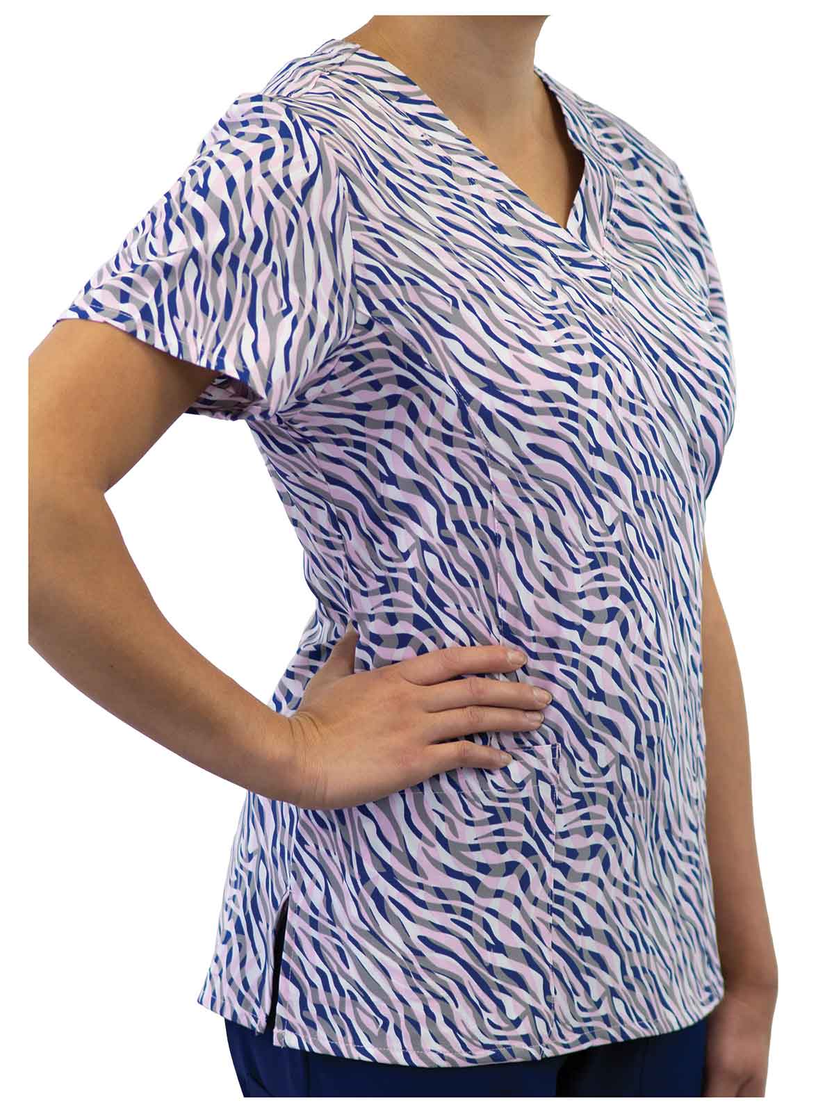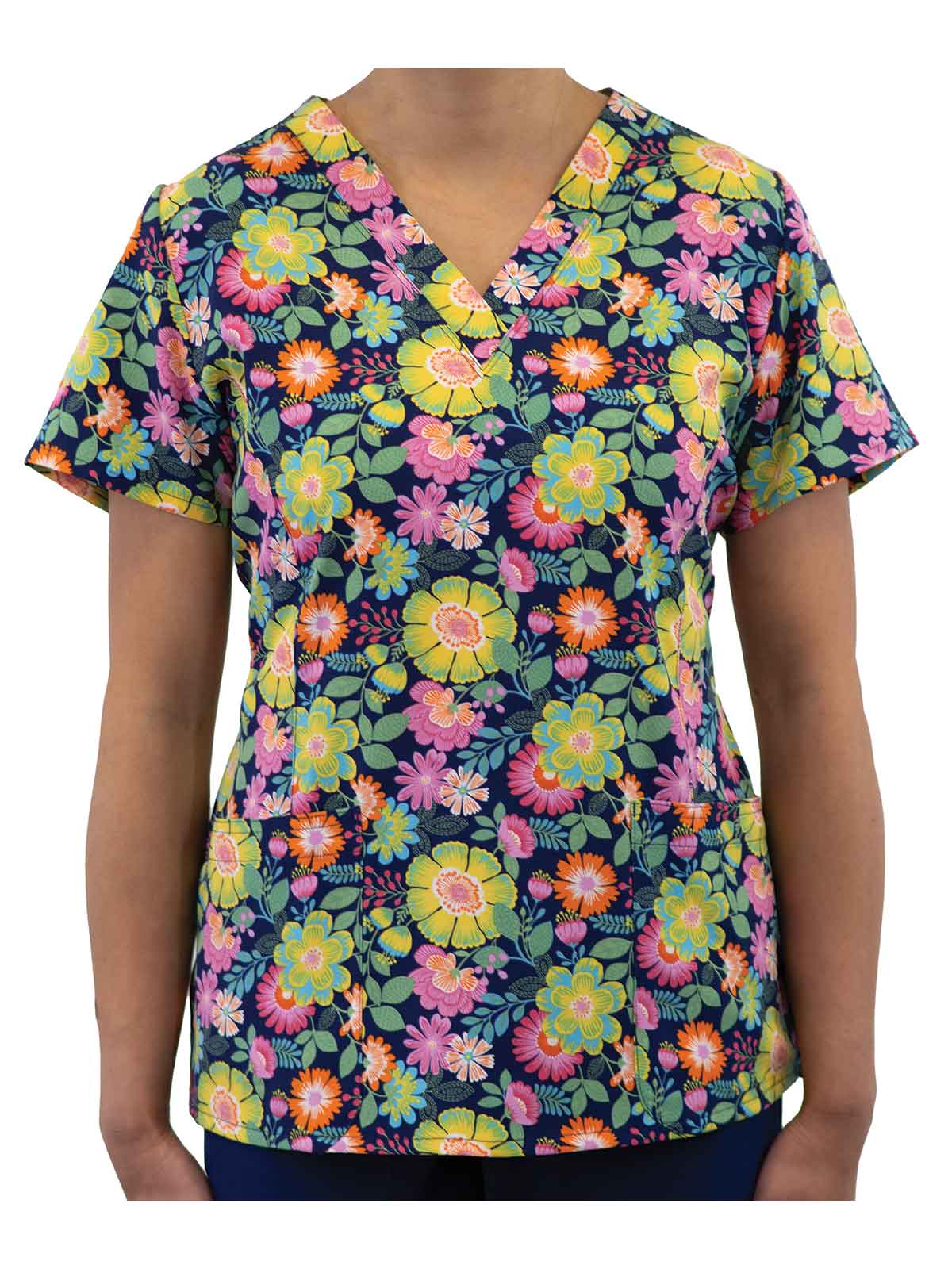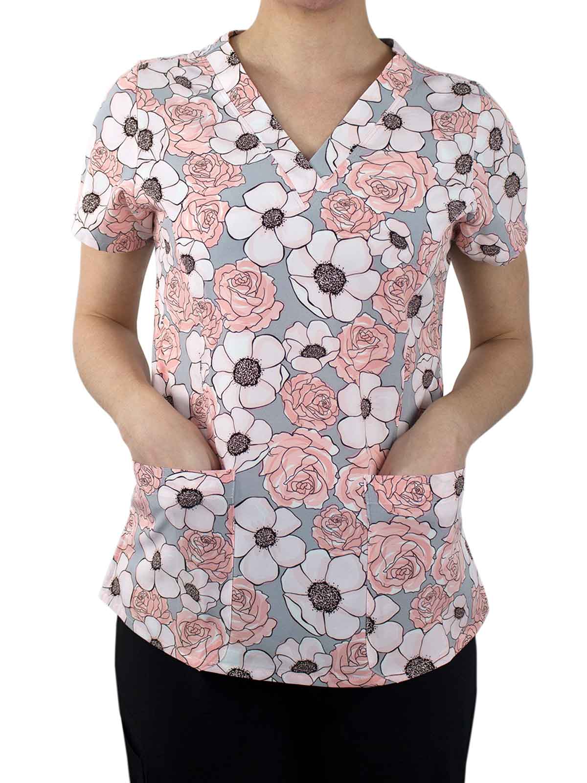 "*Printed curved v-neck top *Front princess seams and back darts for added style and shape *Two slant patch pockets with inner cell pocket *Solid contrast at back facing *Side vents" Banded v-neckline Short sleeves Front princess seaming Back shaping darts...