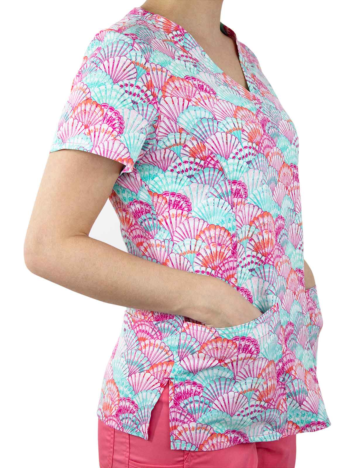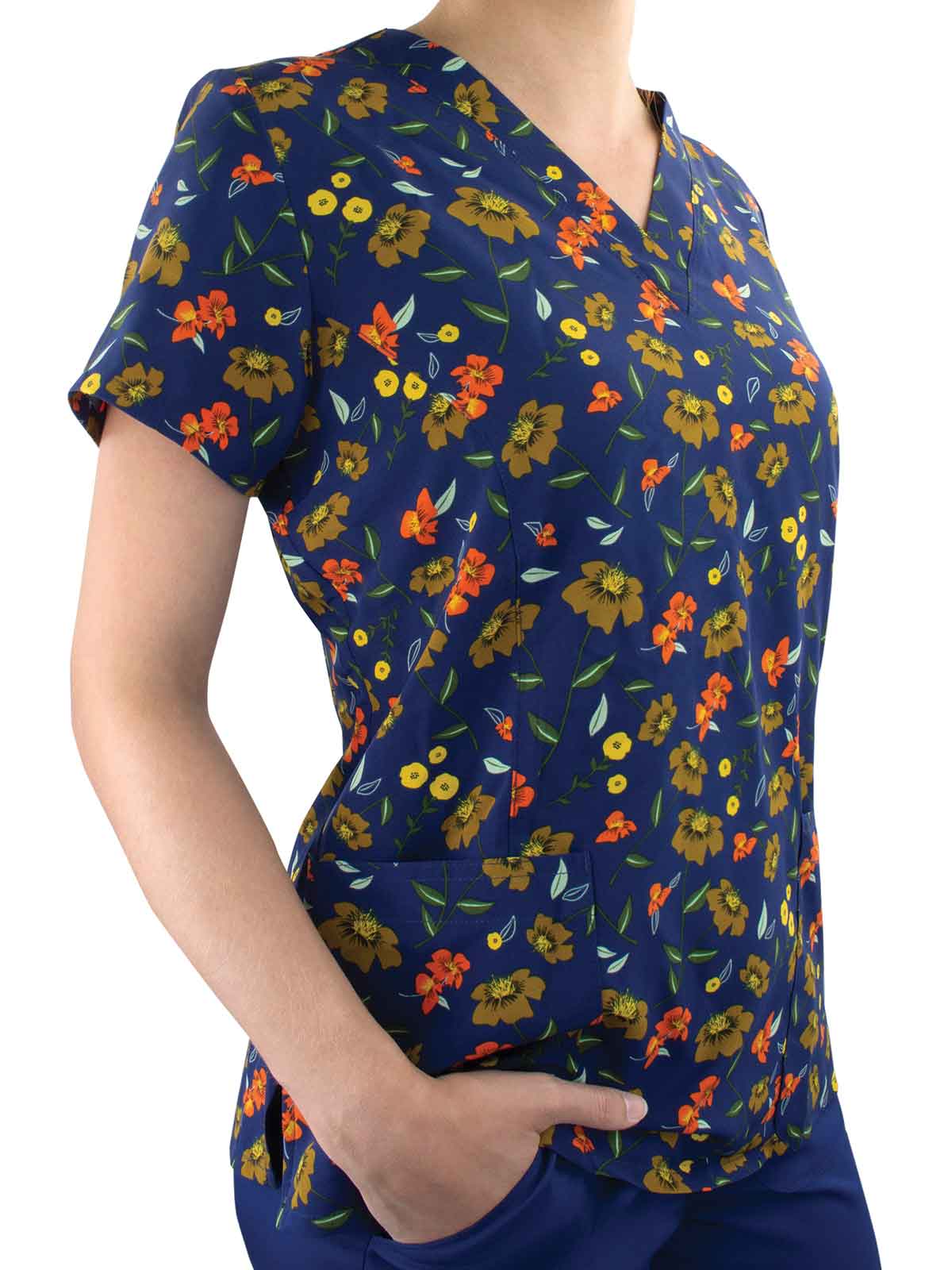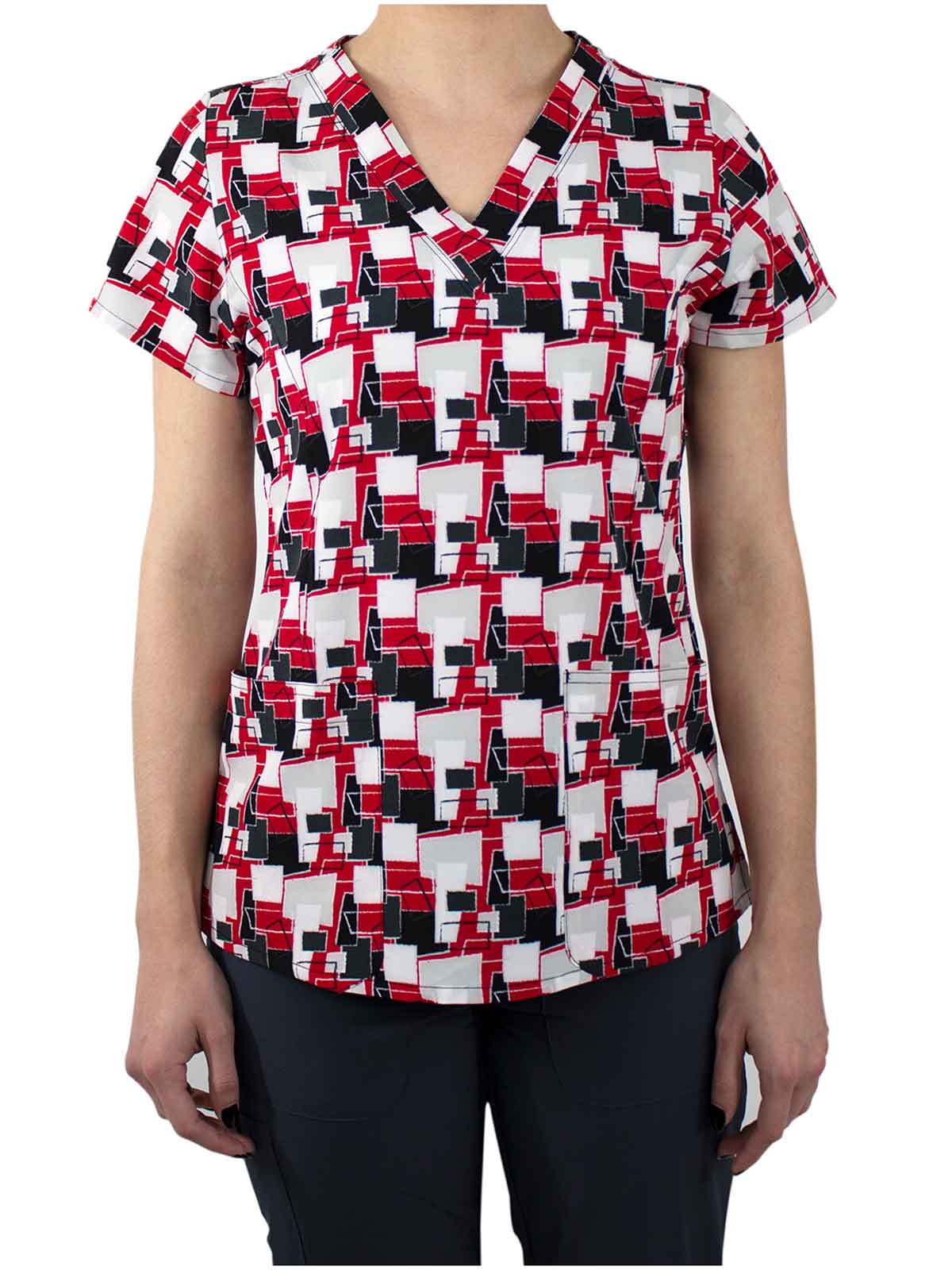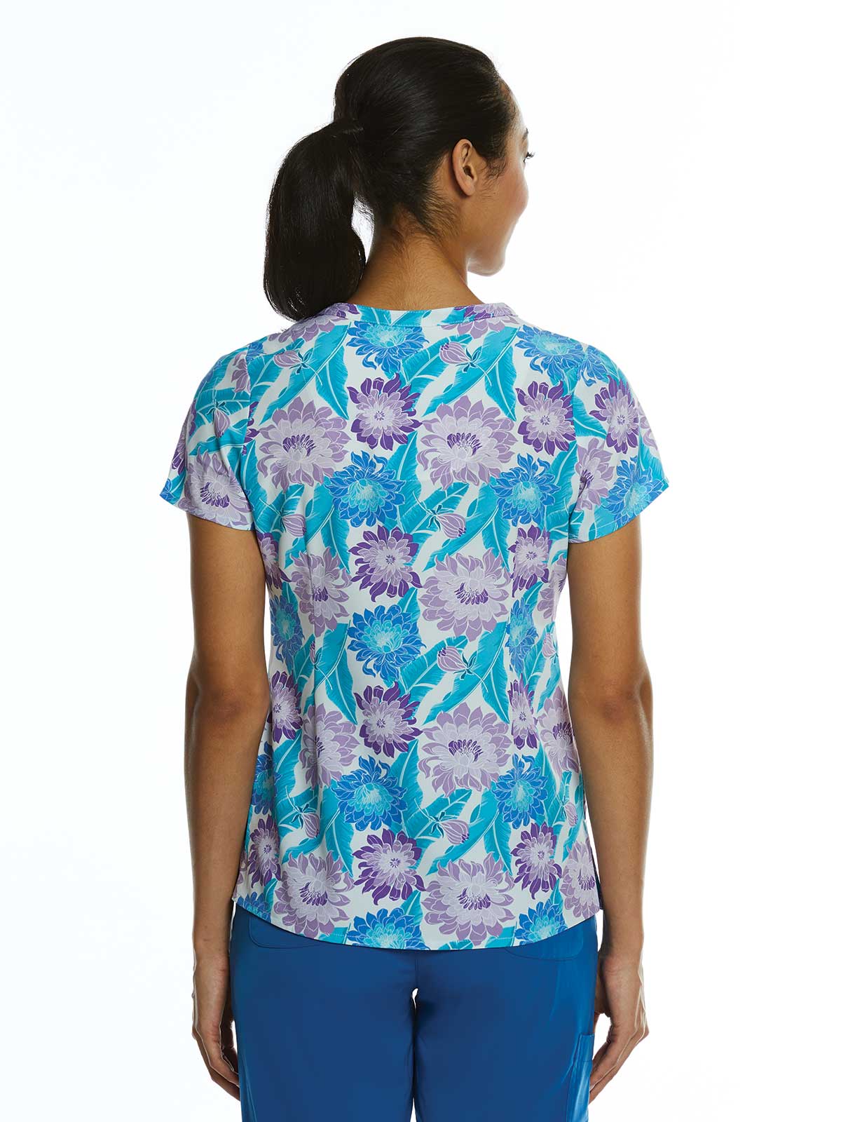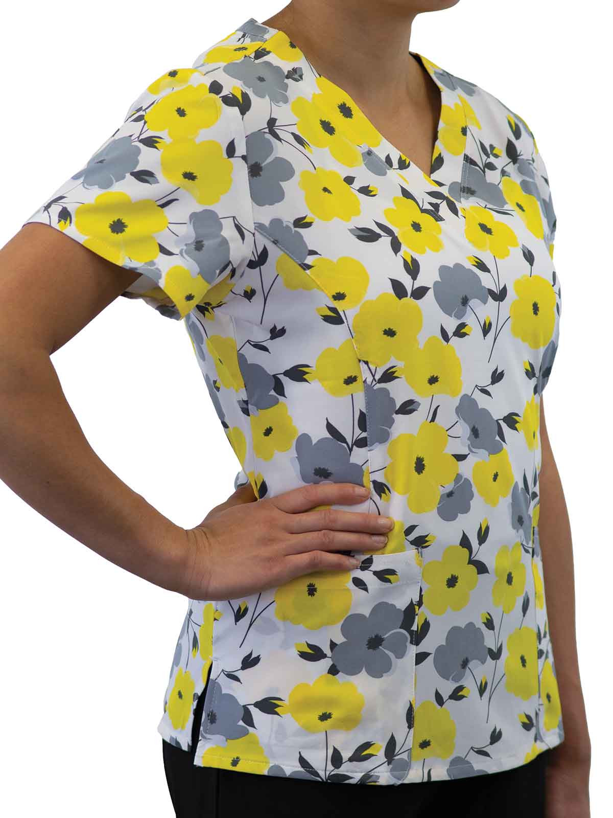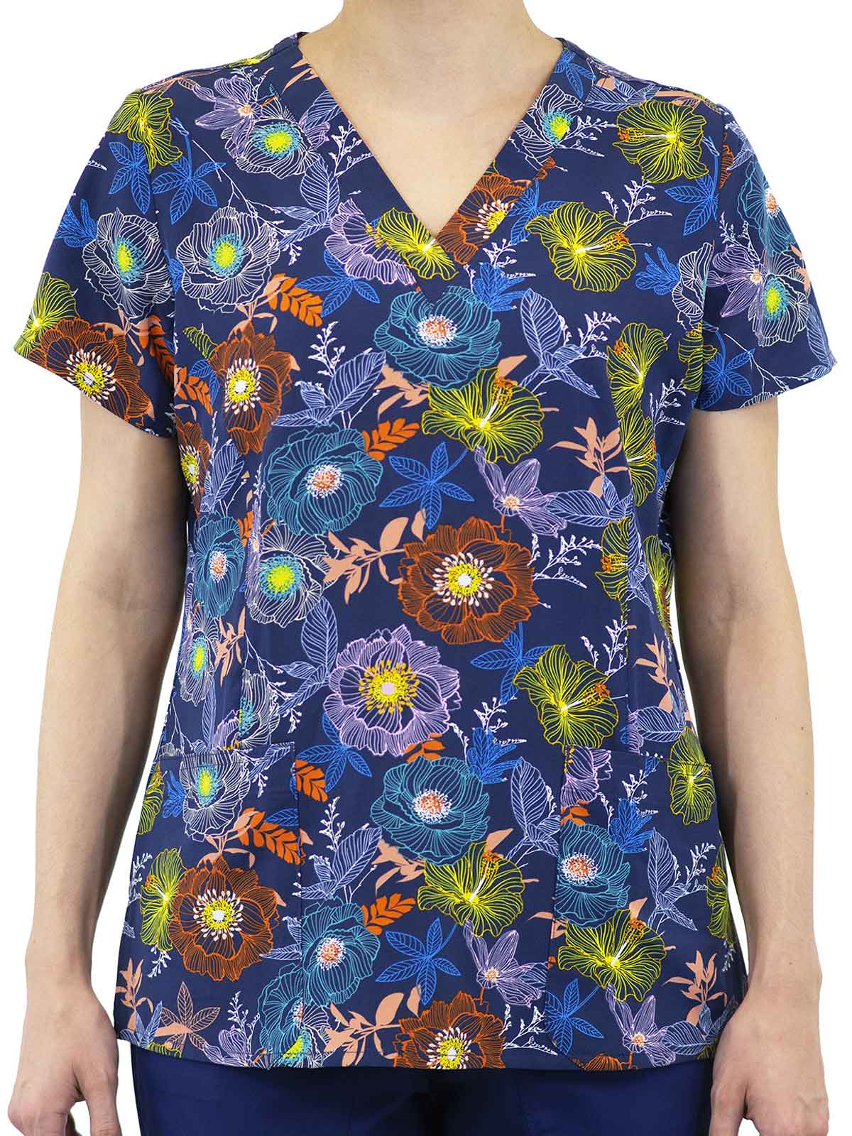 "*Printed curved v-neck top *Front princess seams and back darts for added style and shape *Two slant patch pockets with inner cell pocket *Solid contrast at back facing *Side vents" Banded v-neckline Short sleeves Front princess seaming Back shaping darts...