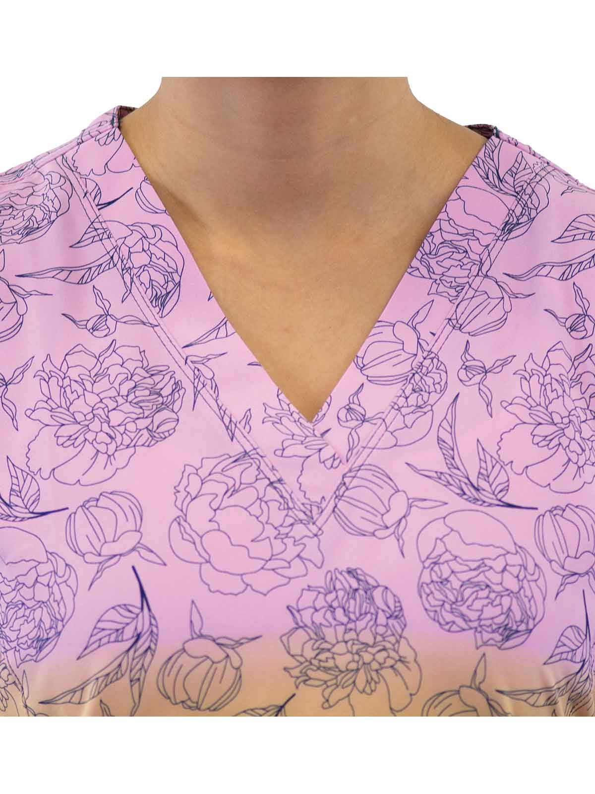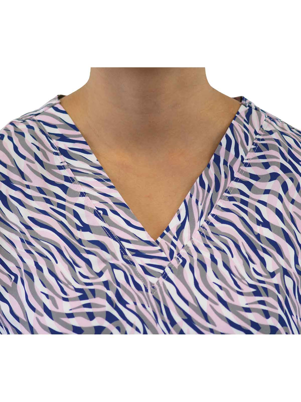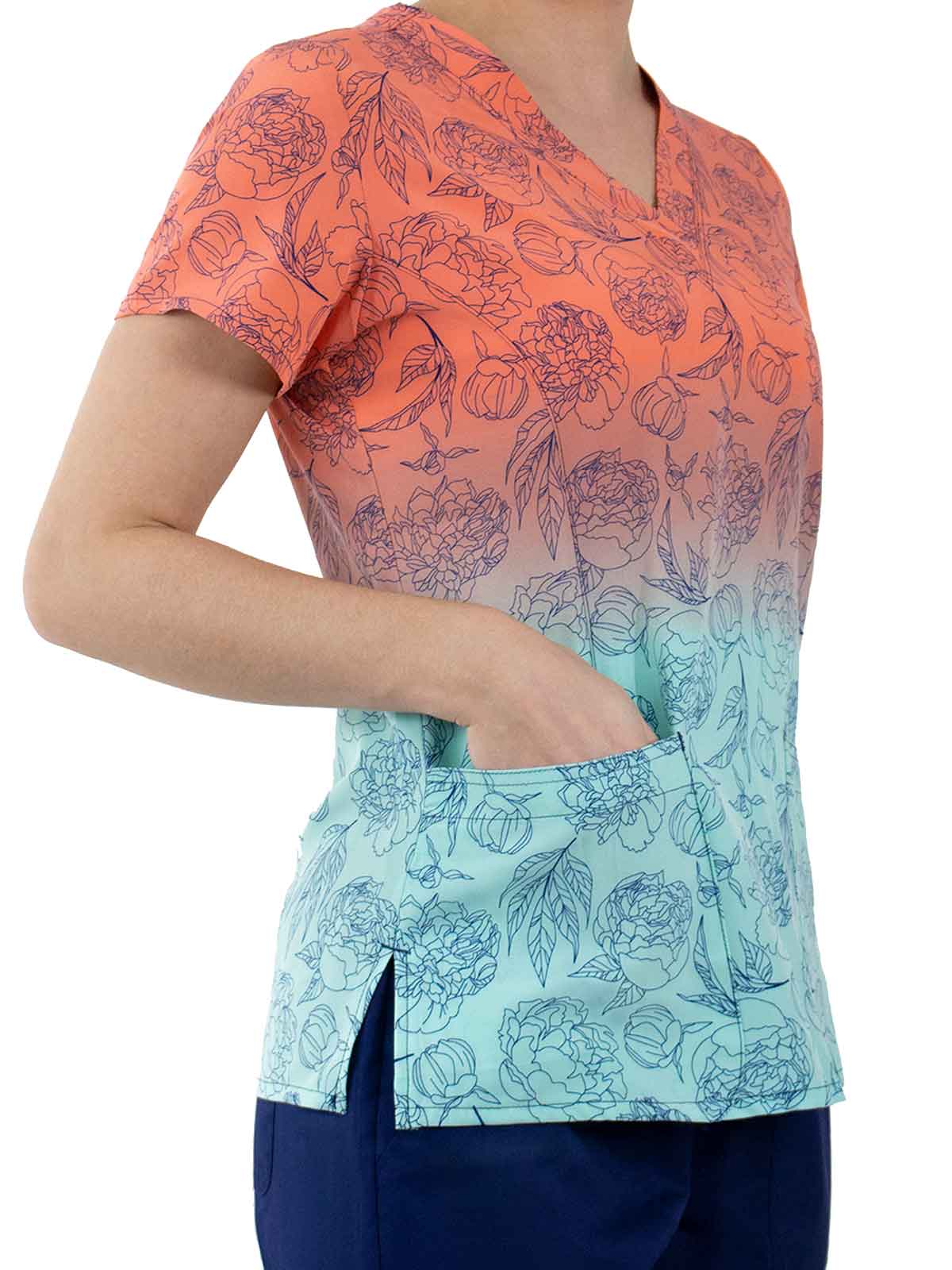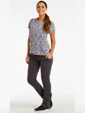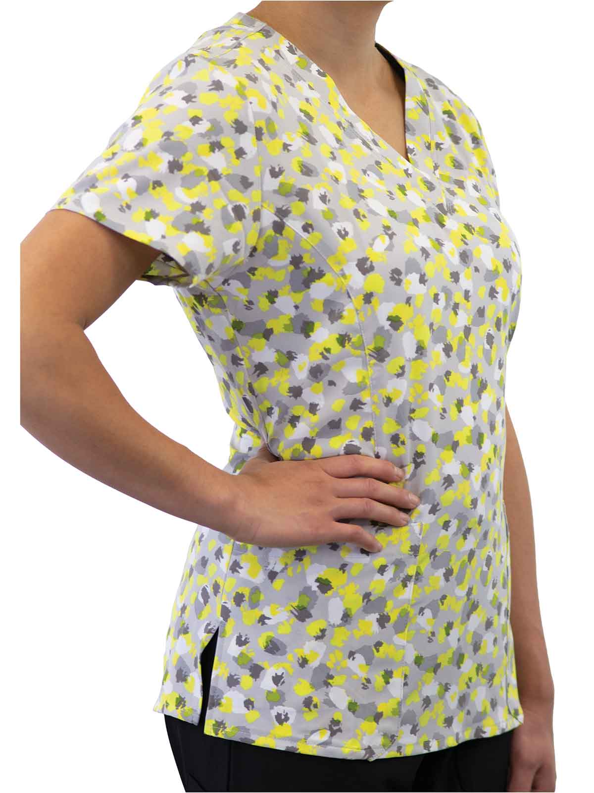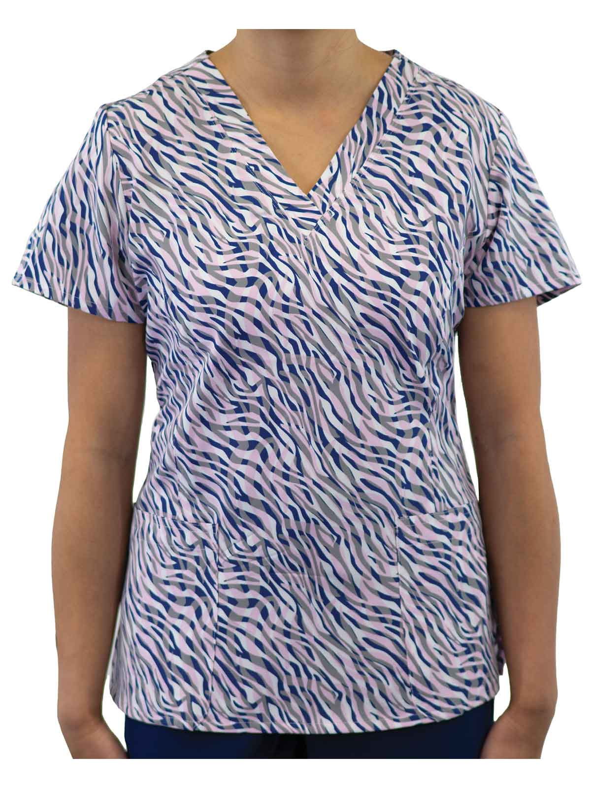 "*Printed curved v-neck top *Front princess seams and back darts for added style and shape *Two slant patch pockets with inner cell pocket *Solid contrast at back facing *Side vents" Banded v-neckline Short sleeves Front princess seaming Back shaping darts...