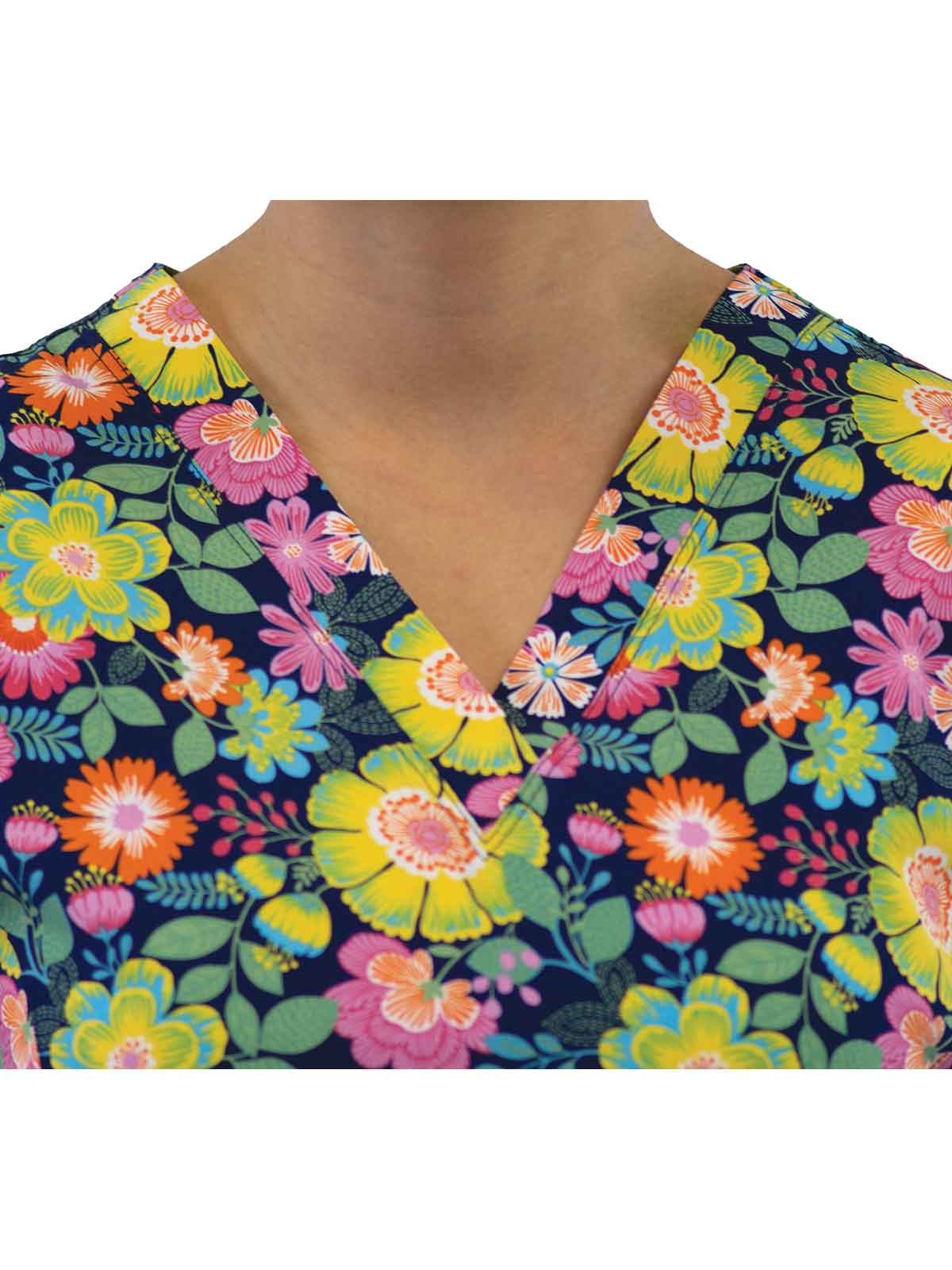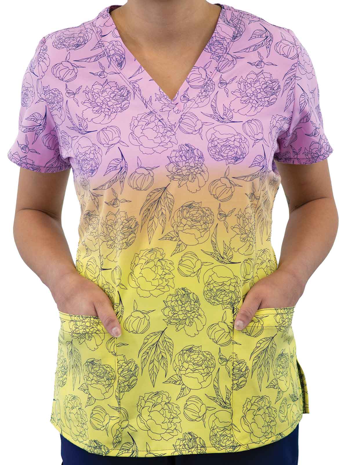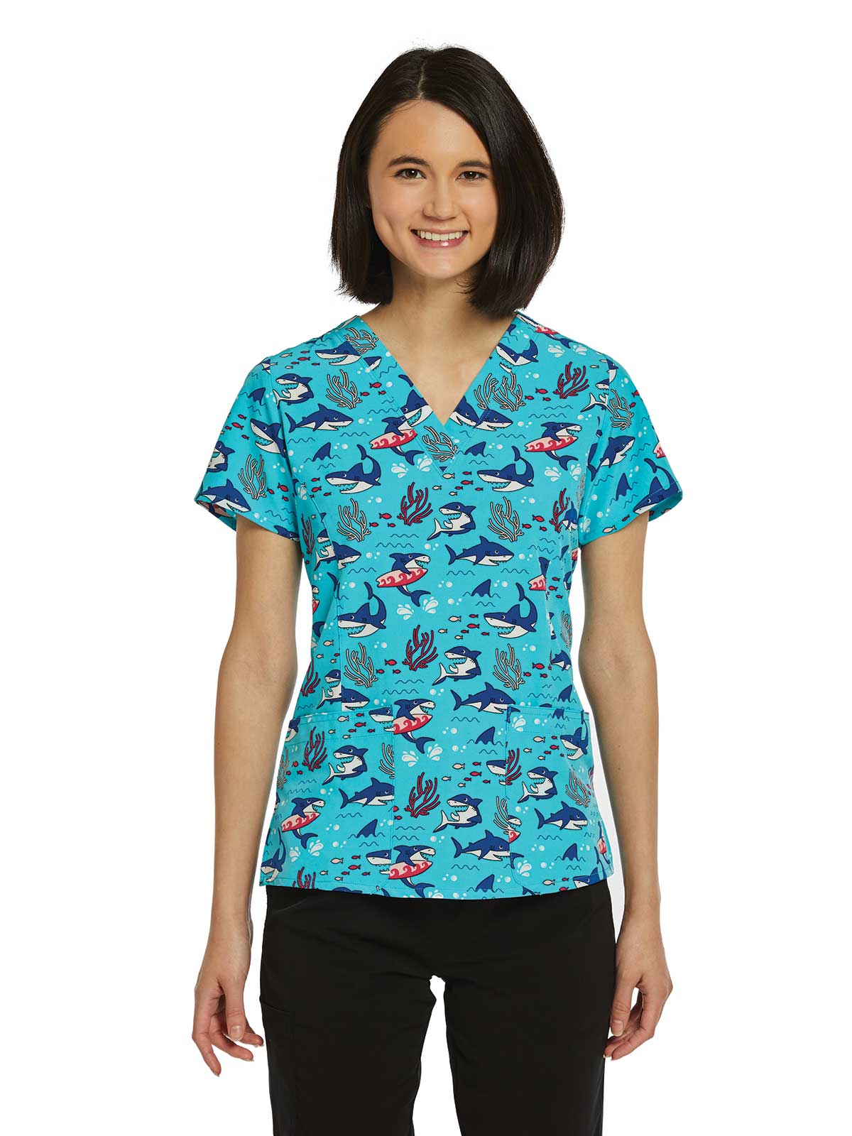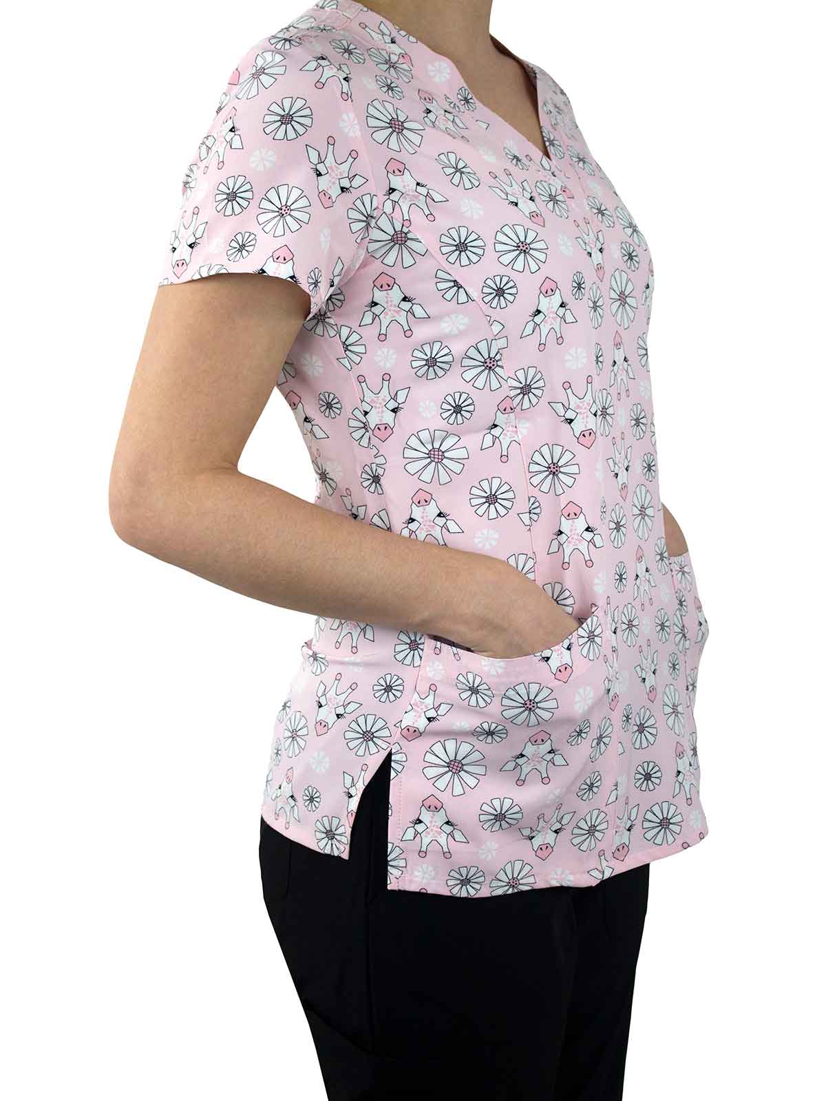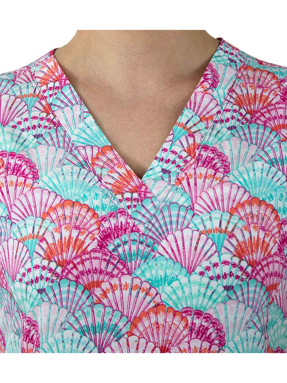 "*Printed curved v-neck top *Front princess seams and back darts for added style and shape *Two slant patch pockets with inner cell pocket *Solid contrast at back facing *Side vents" Banded v-neckline Short sleeves Front princess seaming Back shaping darts...