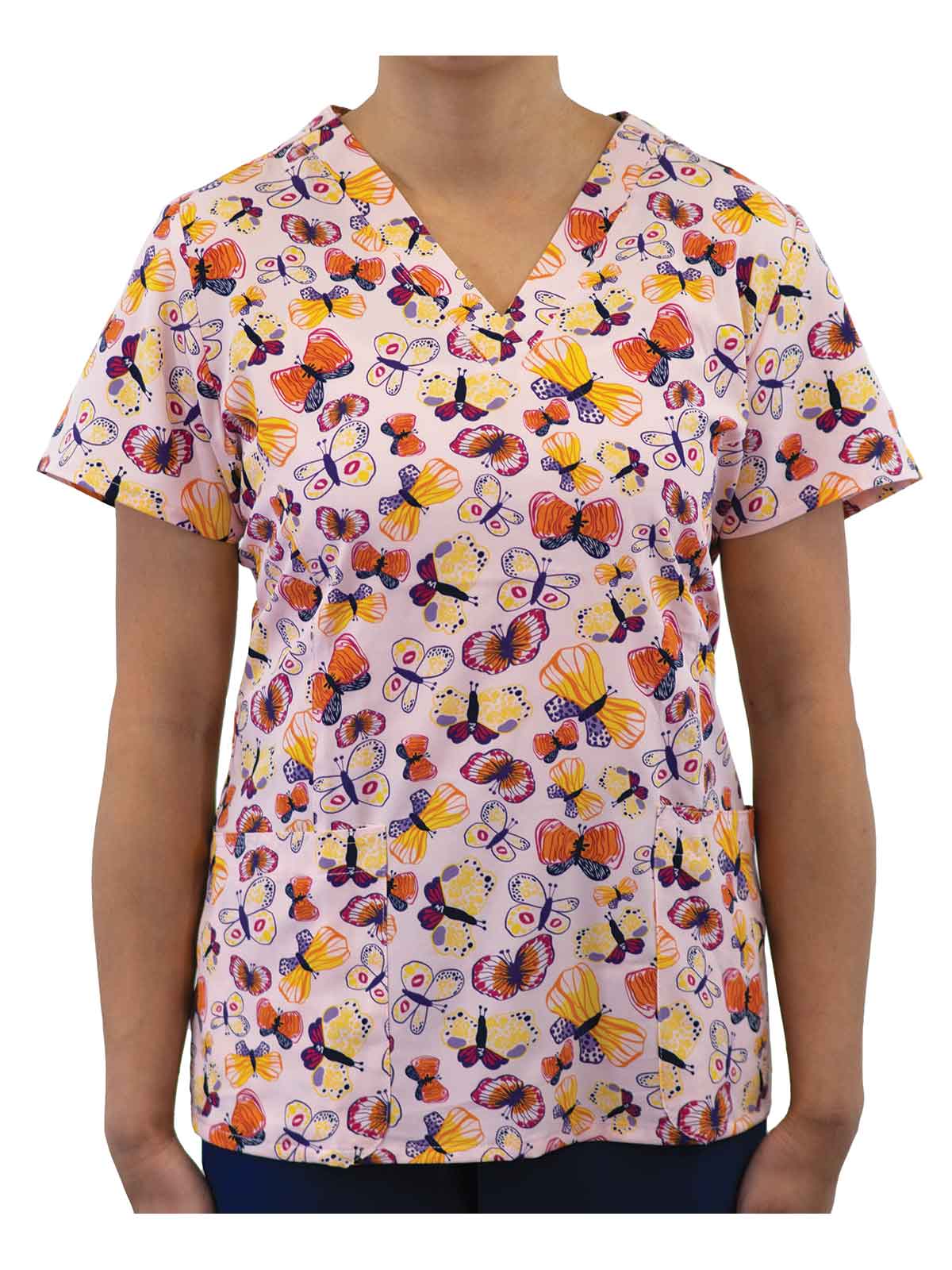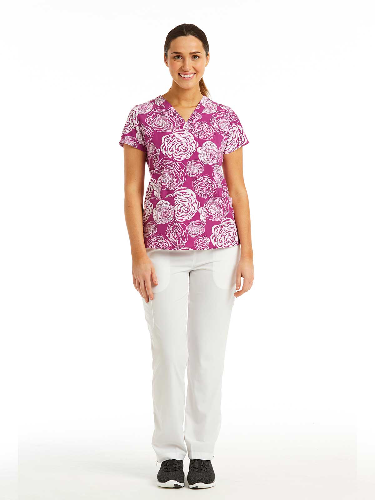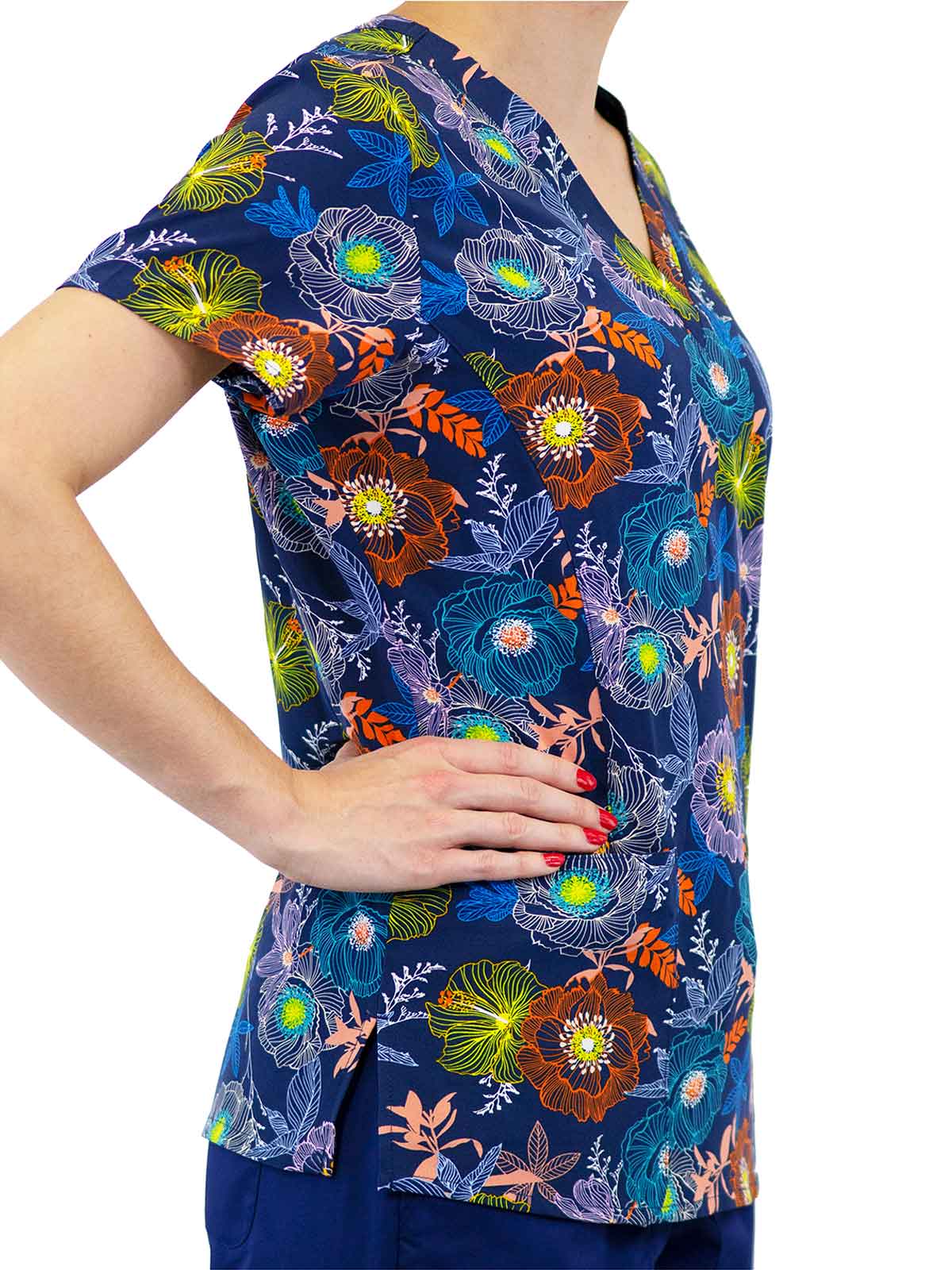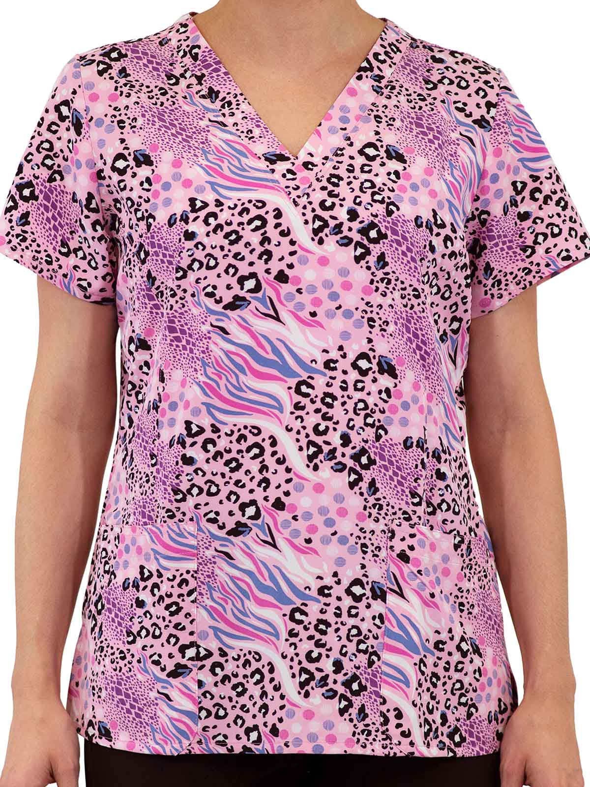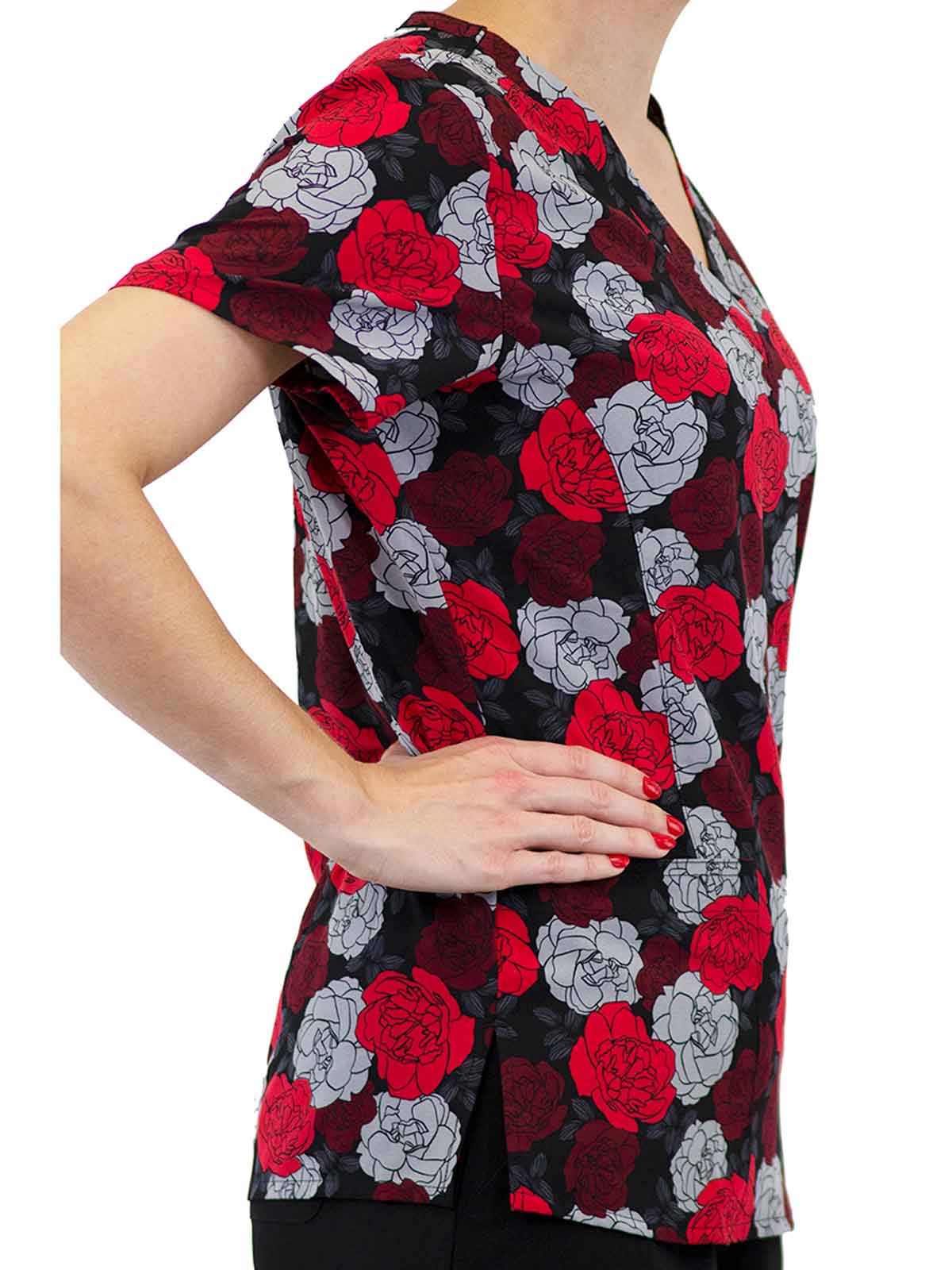 "*Printed curved v-neck top *Front princess seams and back darts for added style and shape *Two slant patch pockets with inner cell pocket *Solid contrast at back facing *Side vents" Banded v-neckline Short sleeves Front princess seaming Back shaping darts...