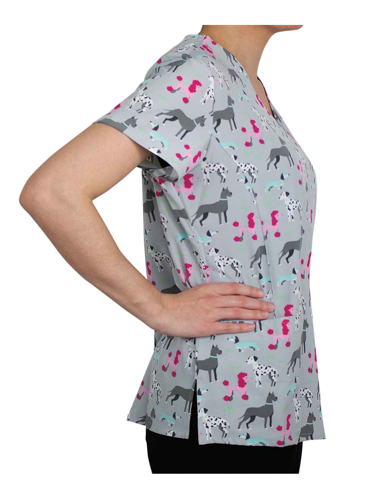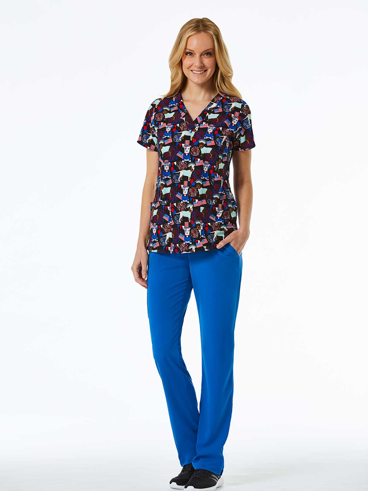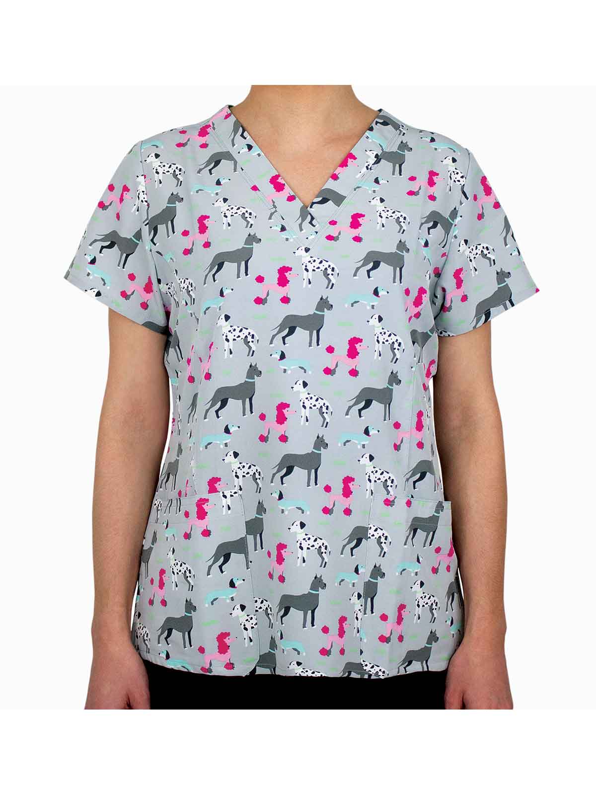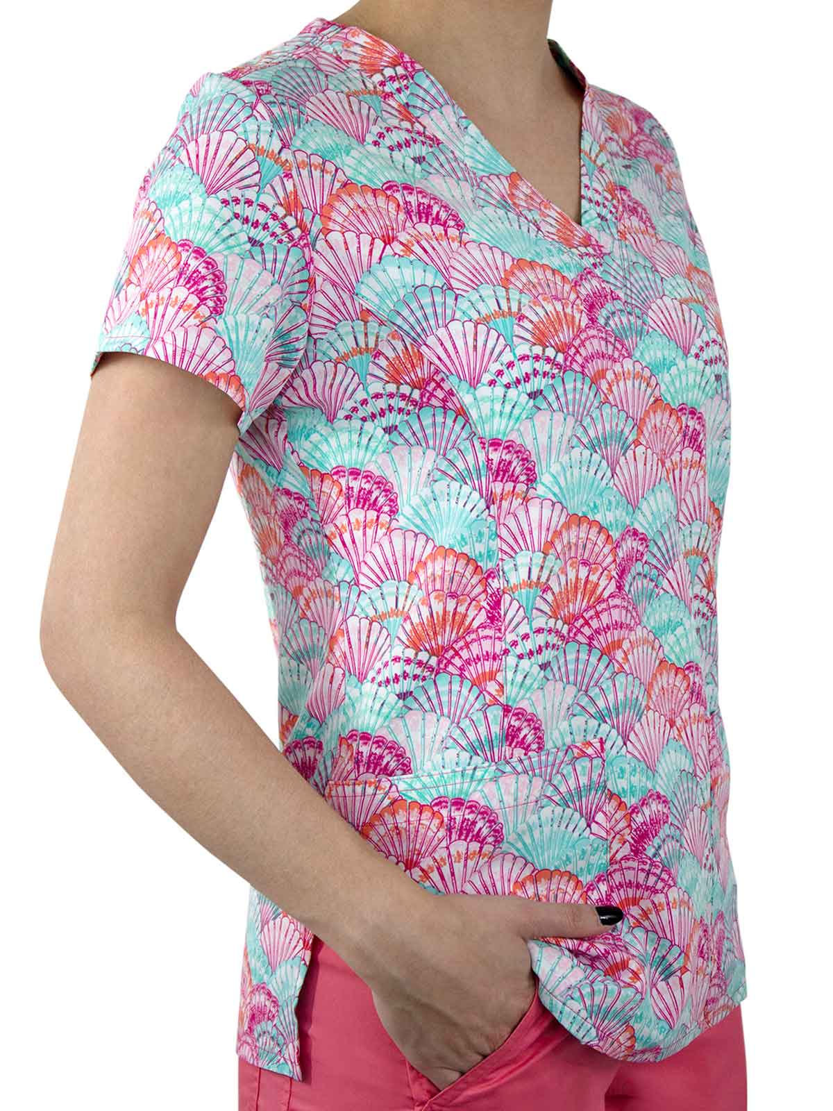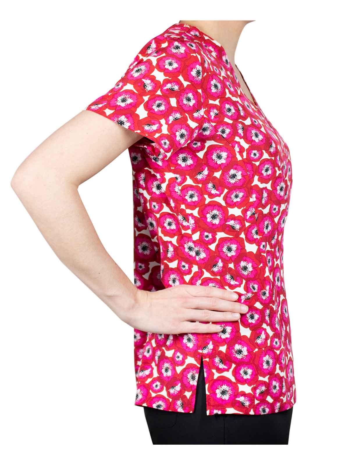"*Printed curved v-neck top *Front princess seams and back darts for added style and shape *Two slant patch pockets with inner cell pocket *Solid contrast at back facing *Side vents" Banded v-neckline Short sleeves Front princess seaming Back shaping darts...
