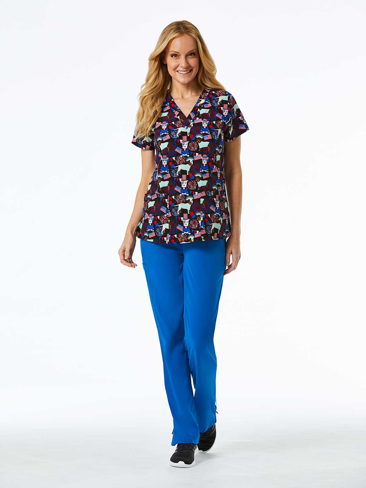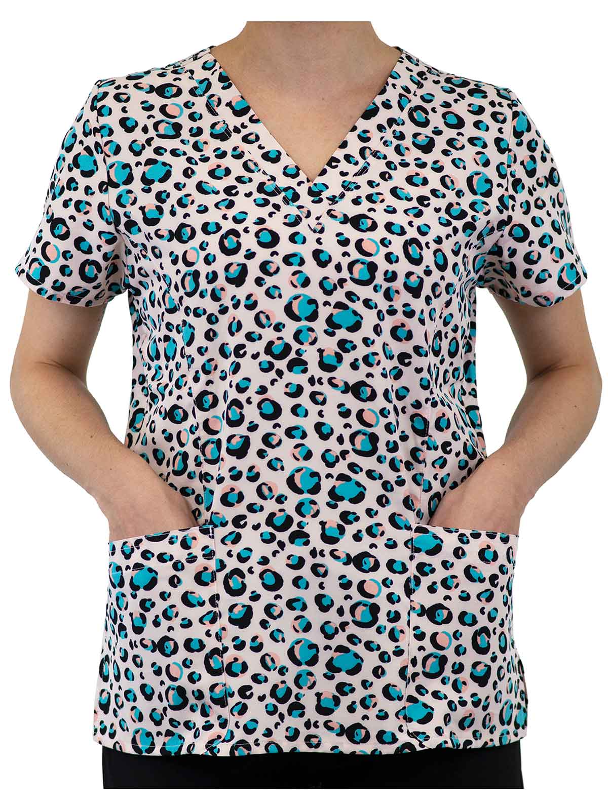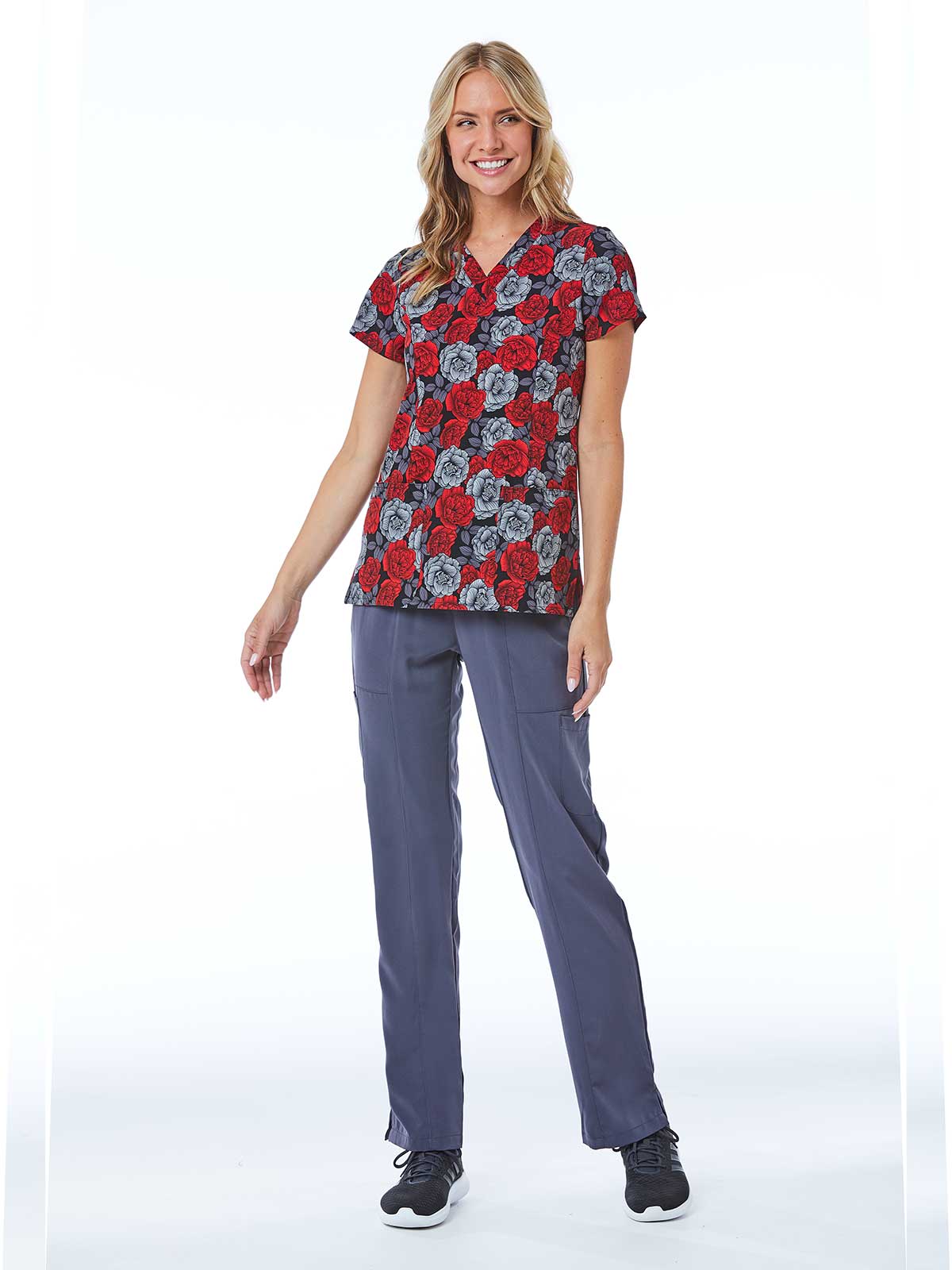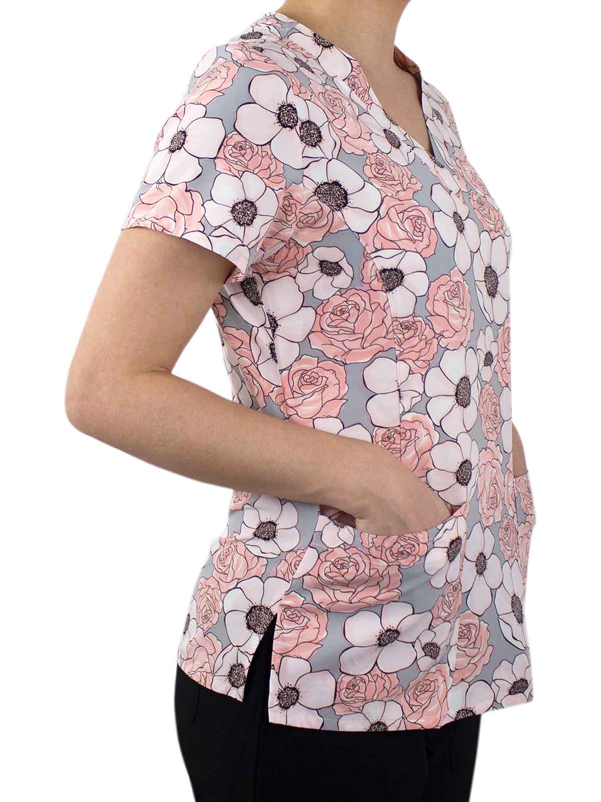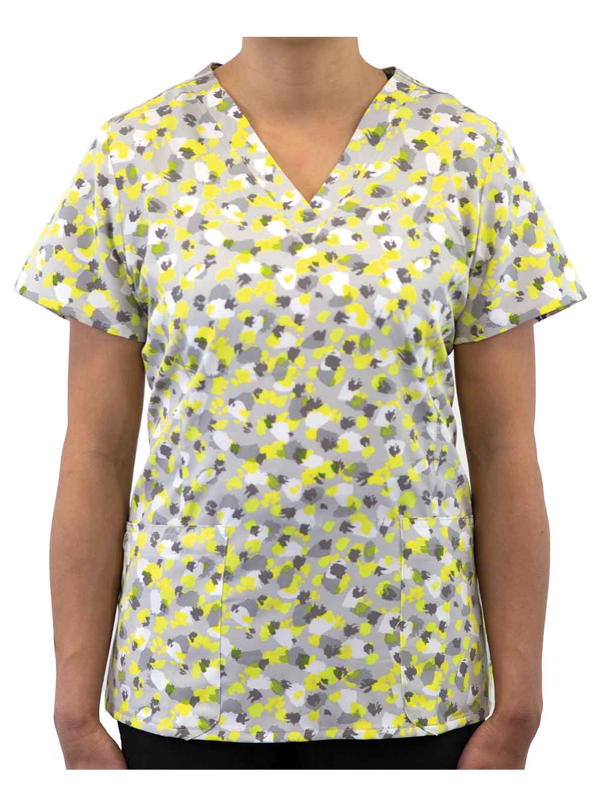 "*Printed curved v-neck top *Front princess seams and back darts for added style and shape *Two slant patch pockets with inner cell pocket *Solid contrast at back facing *Side vents" Banded v-neckline Short sleeves Front princess seaming Back shaping darts...