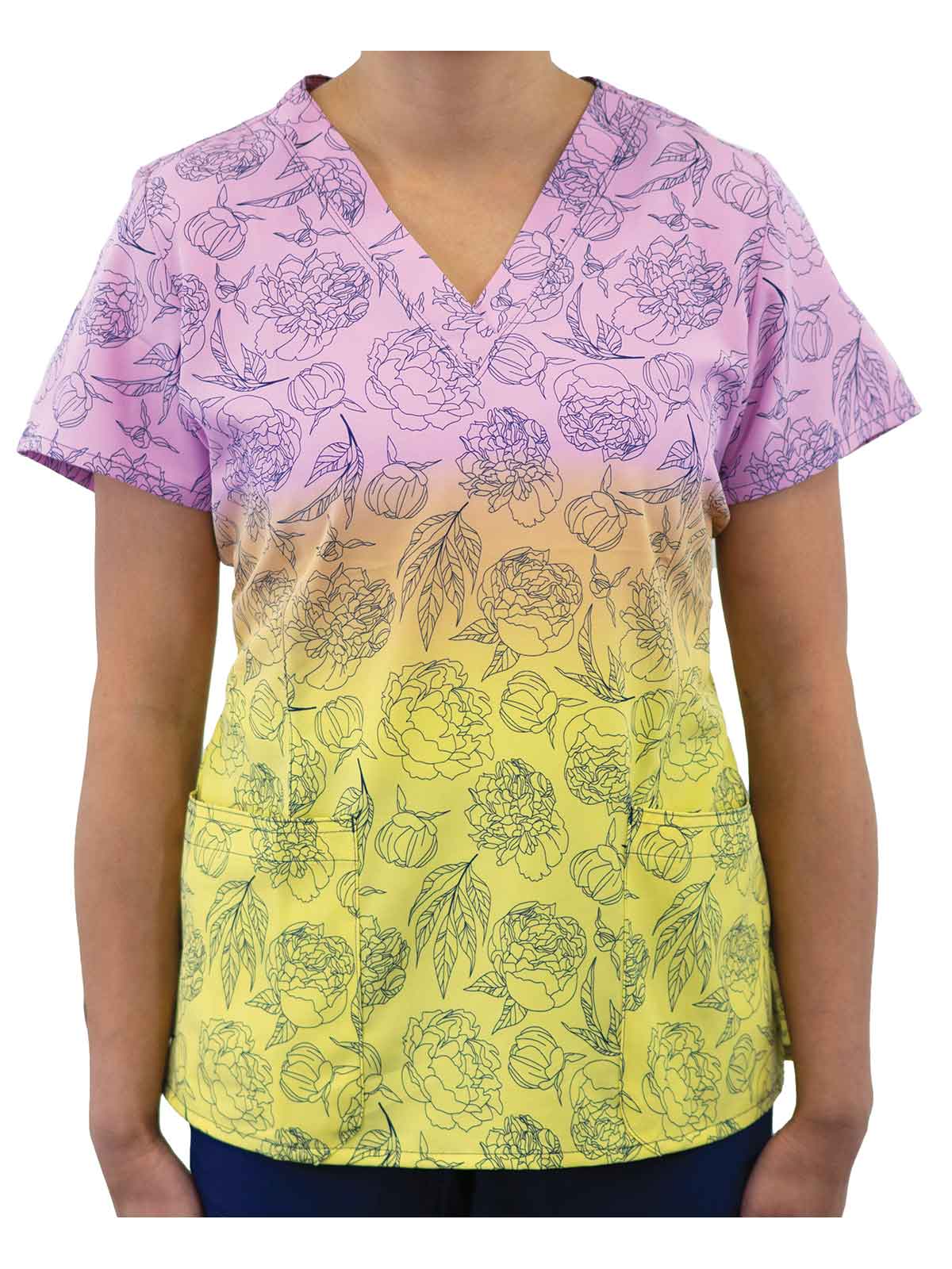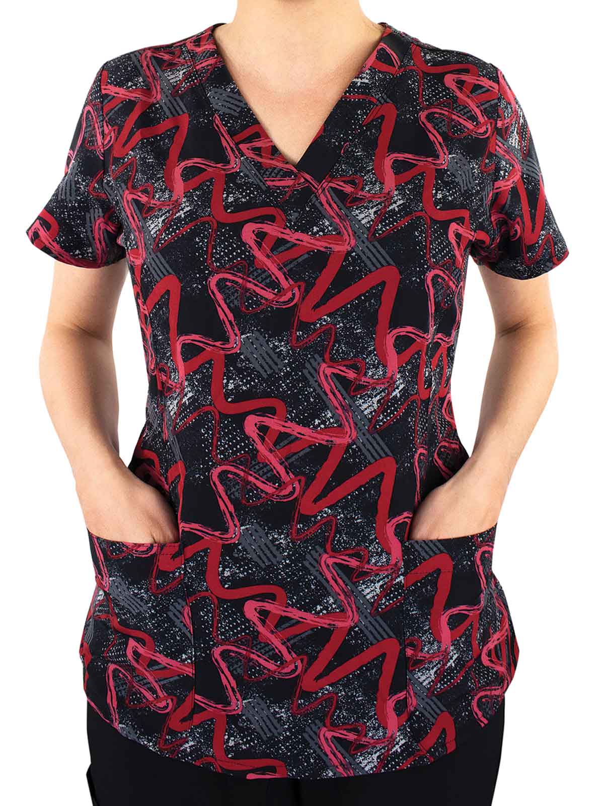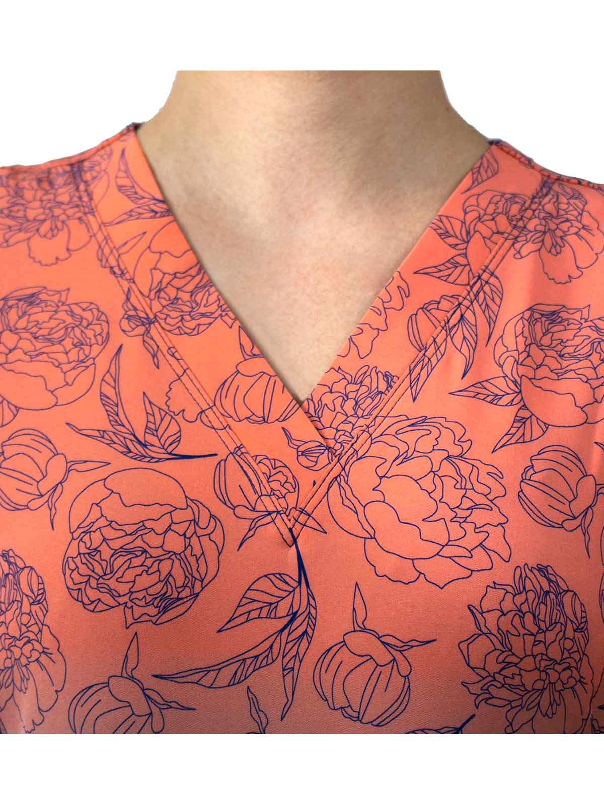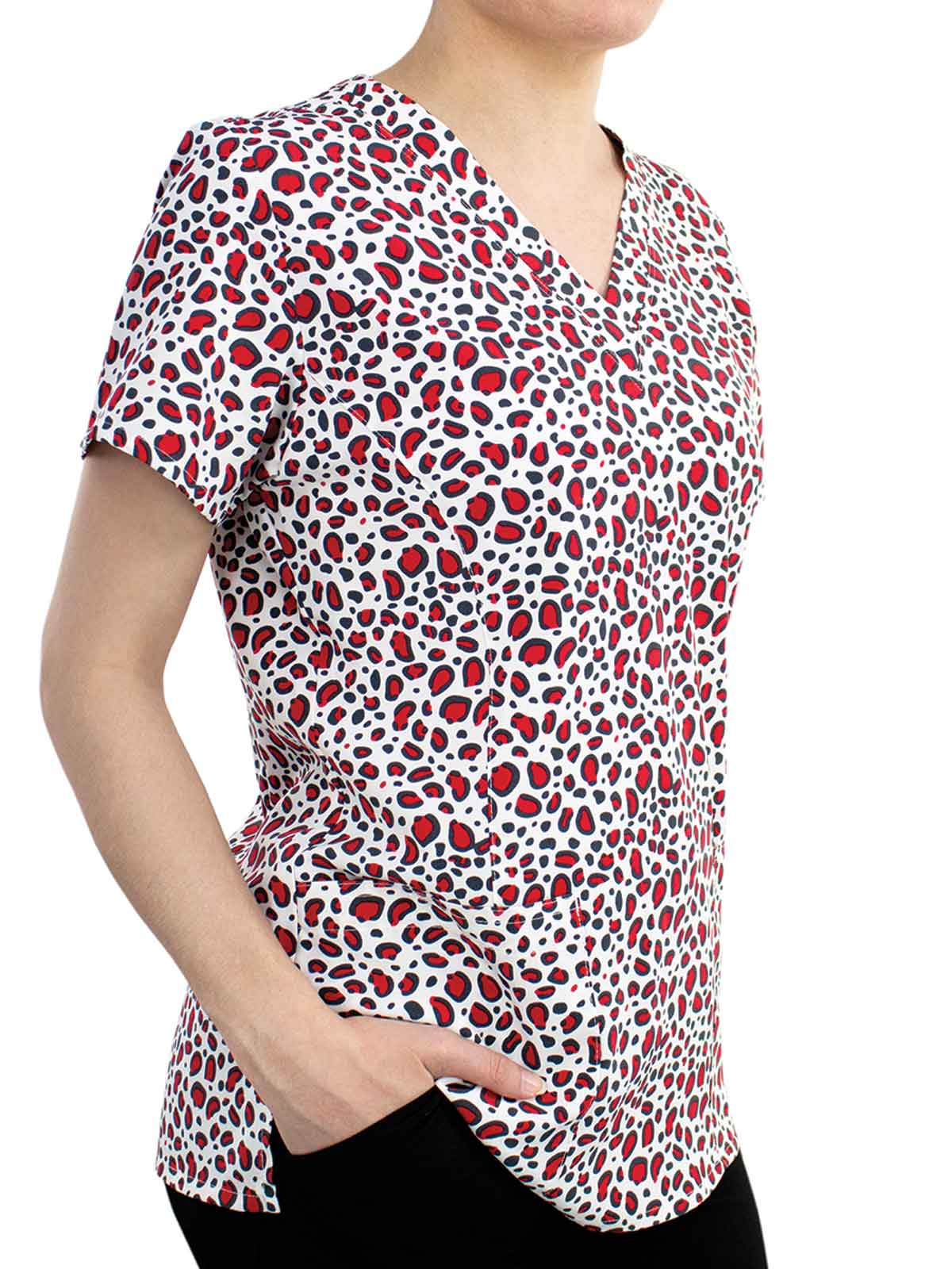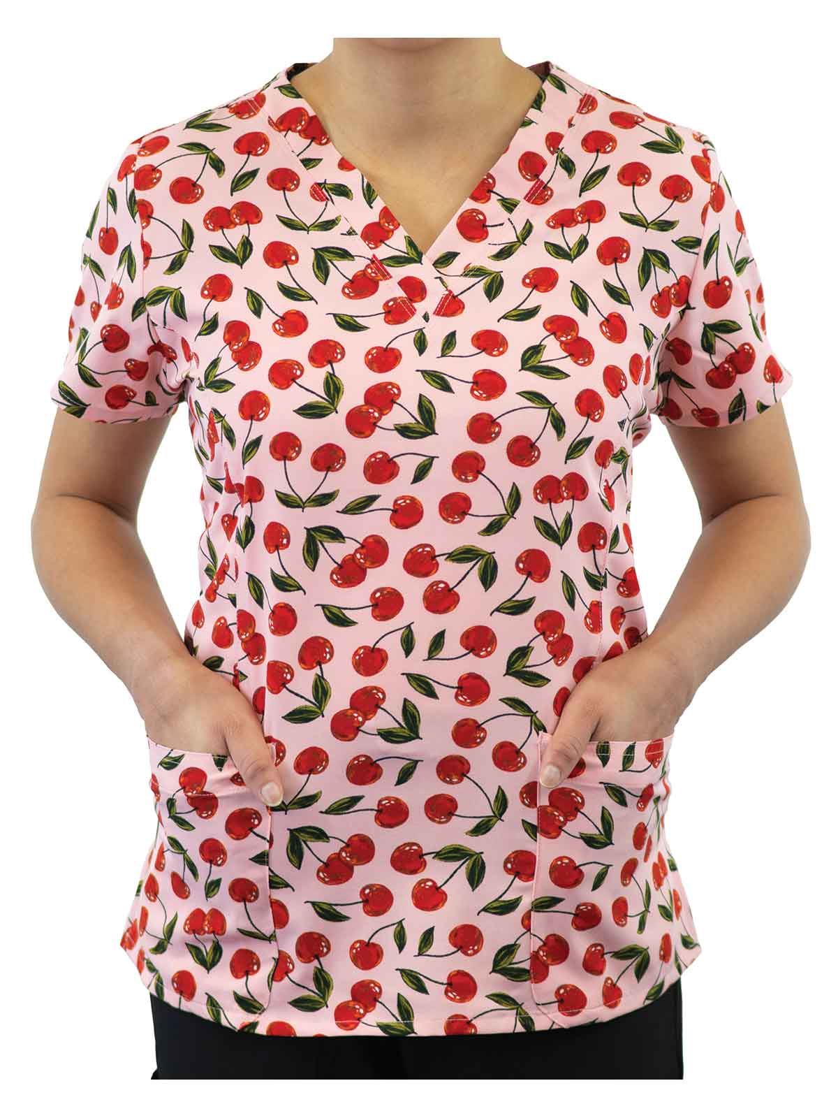 "*Printed curved v-neck top *Front princess seams and back darts for added style and shape *Two slant patch pockets with inner cell pocket *Solid contrast at back facing *Side vents" Banded v-neckline Short sleeves Front princess seaming Back shaping darts...