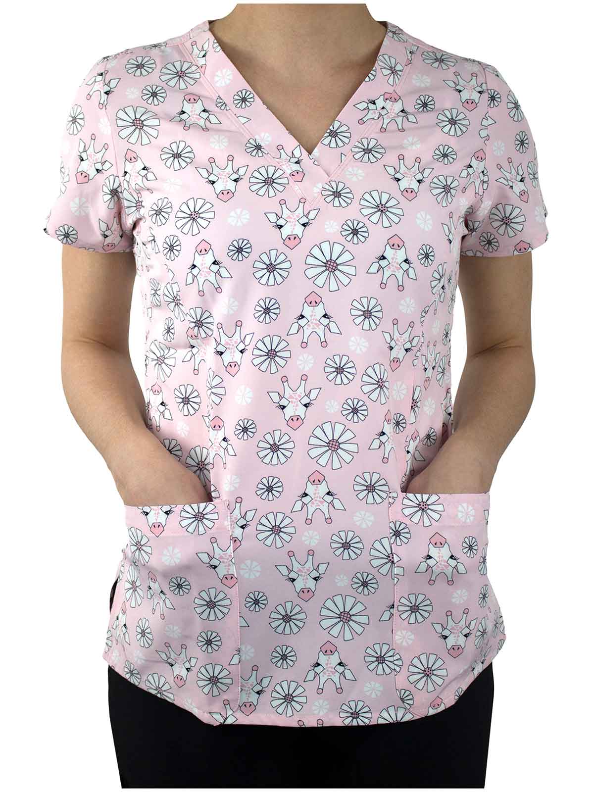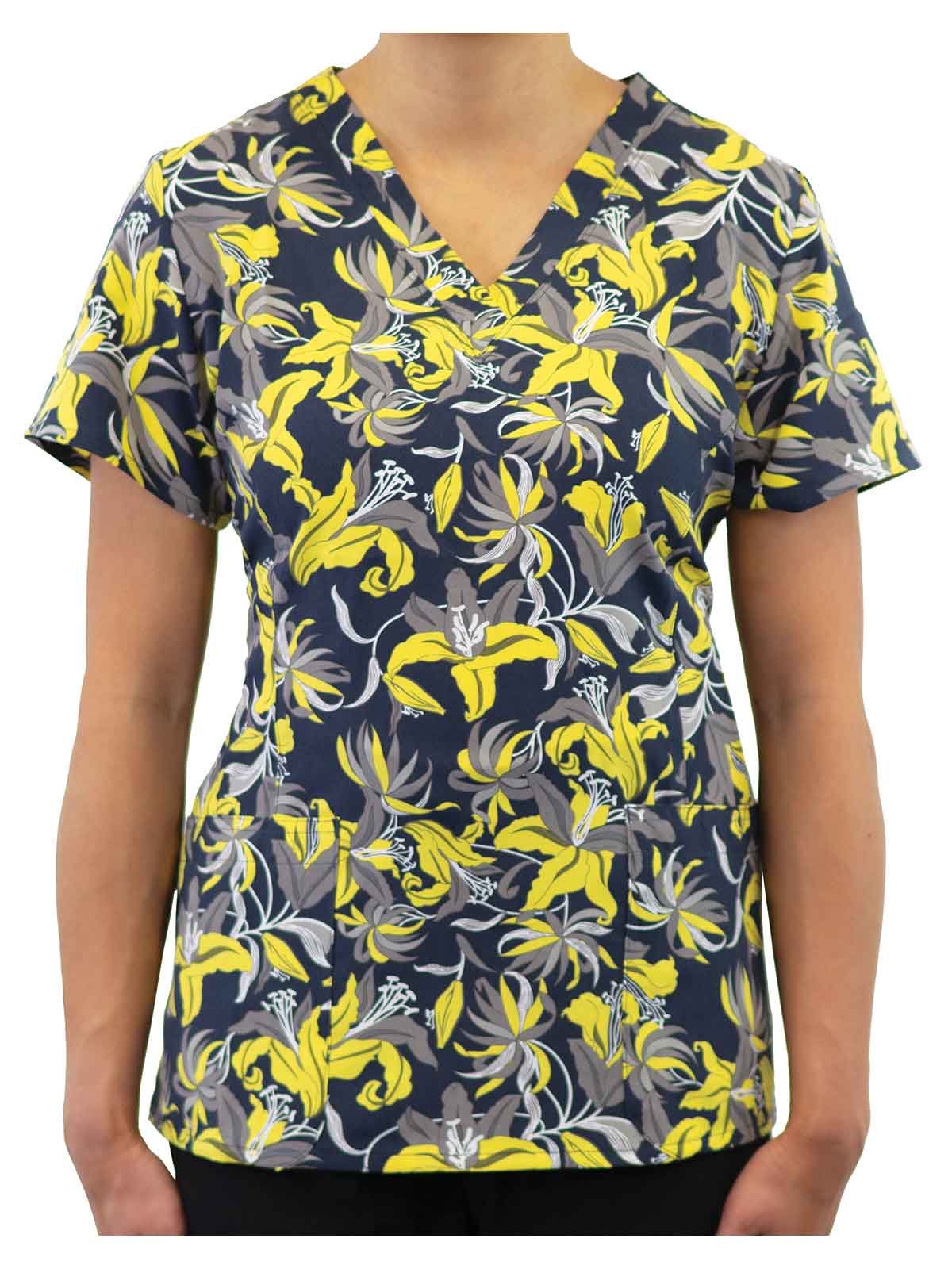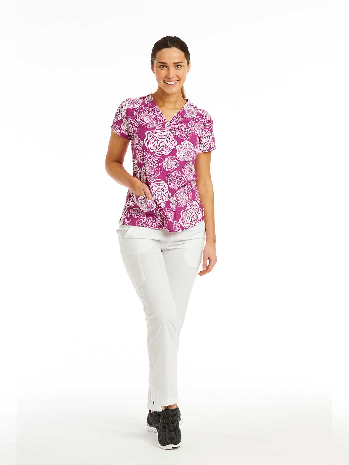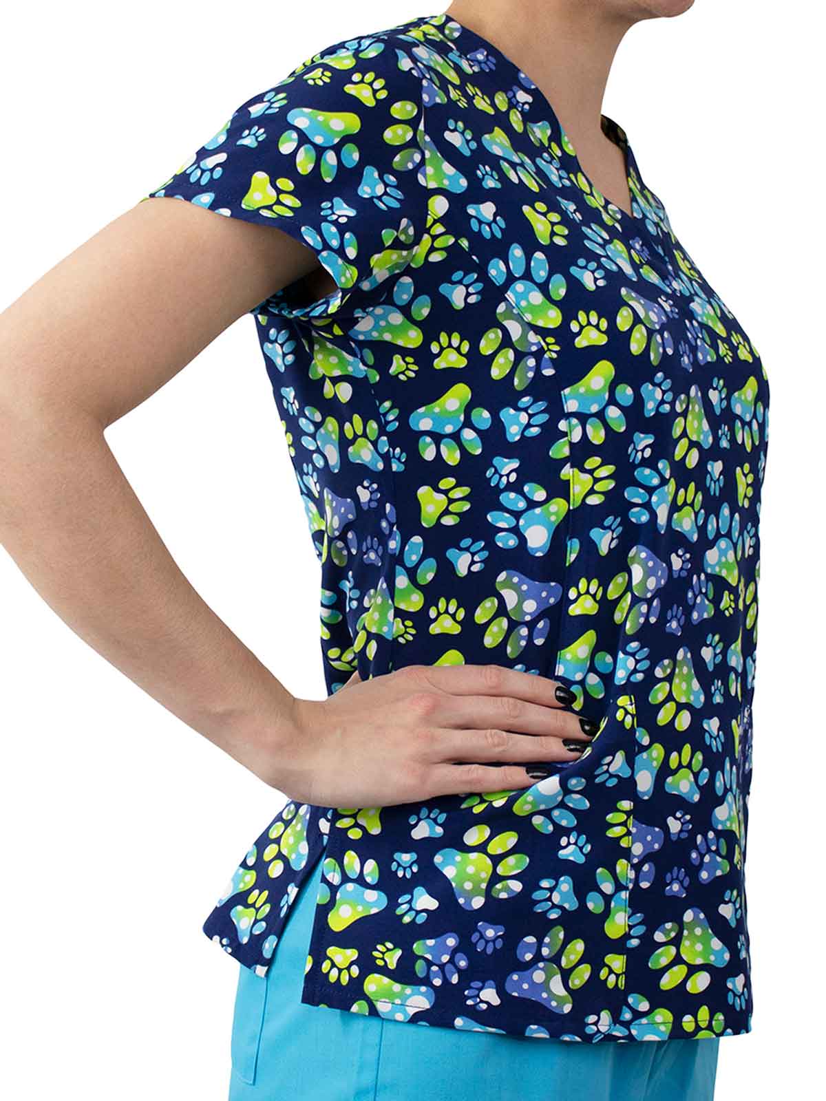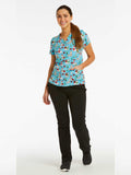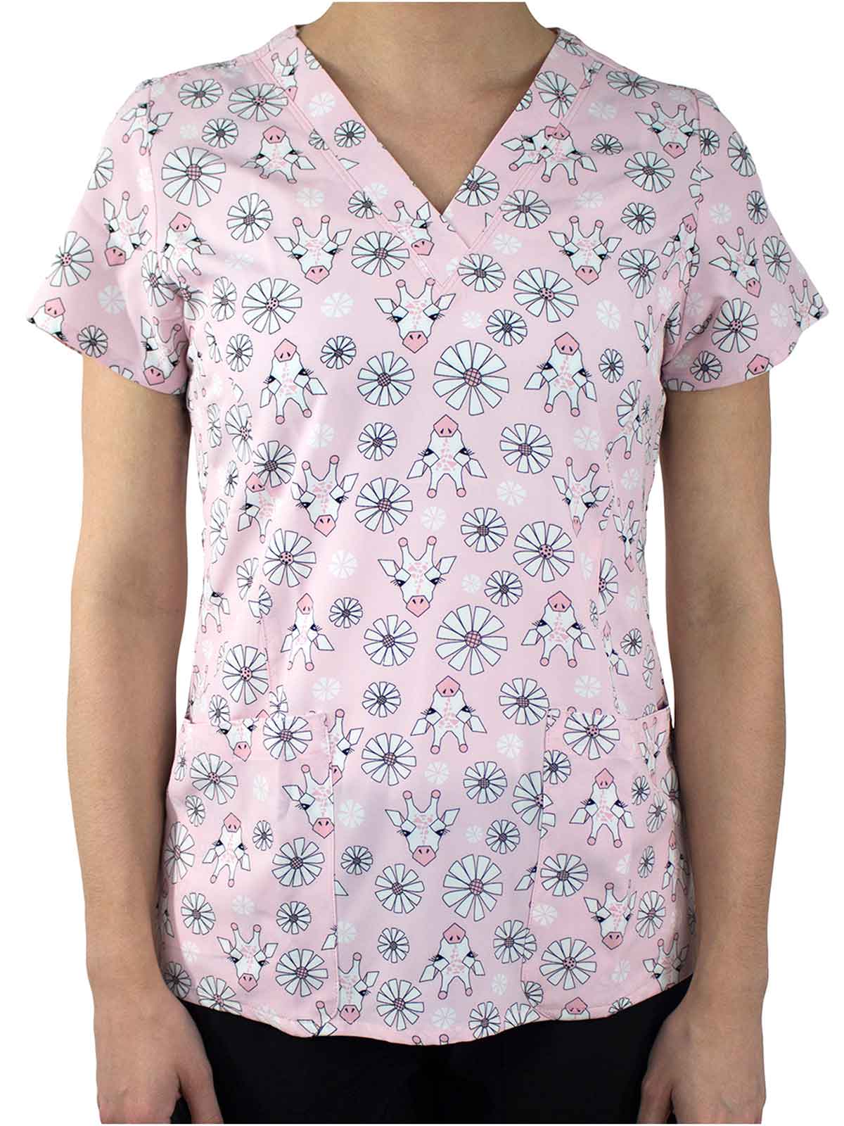 "*Printed curved v-neck top *Front princess seams and back darts for added style and shape *Two slant patch pockets with inner cell pocket *Solid contrast at back facing *Side vents" Banded v-neckline Short sleeves Front princess seaming Back shaping darts...