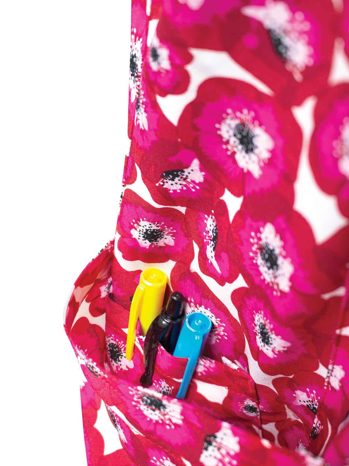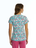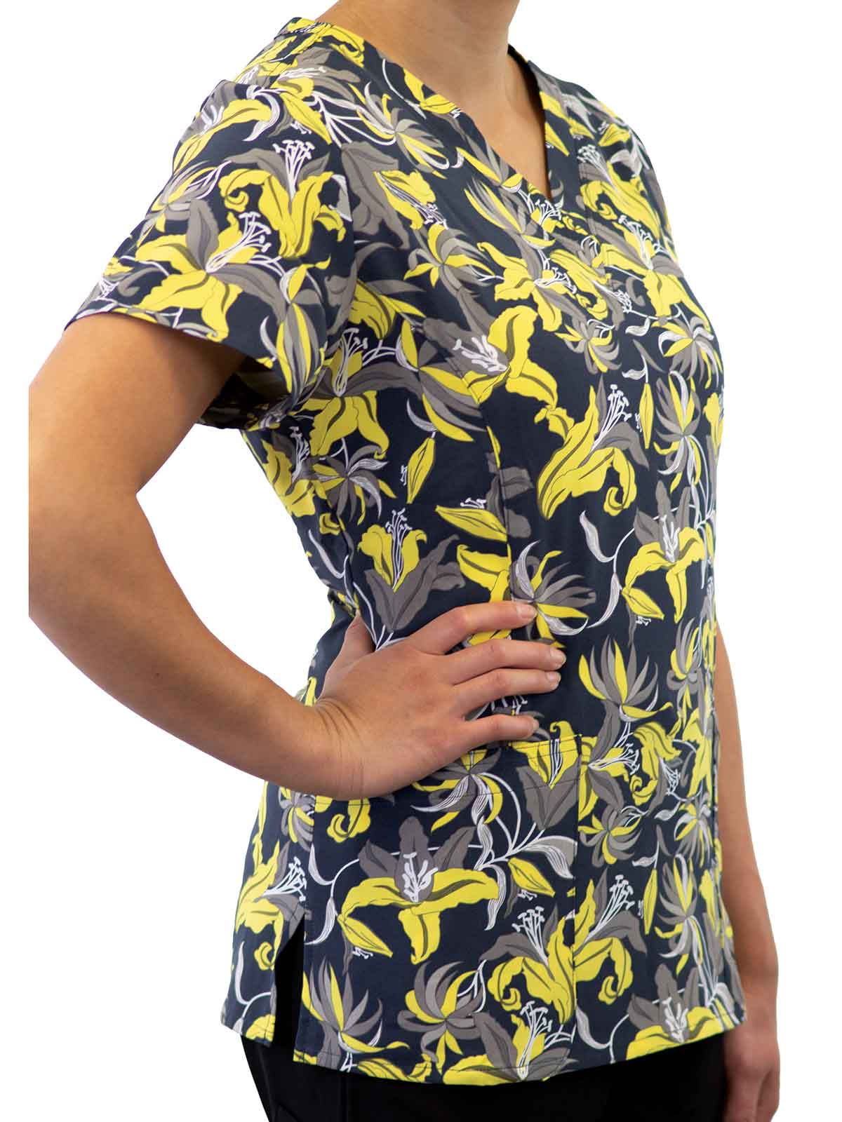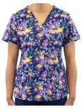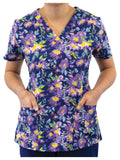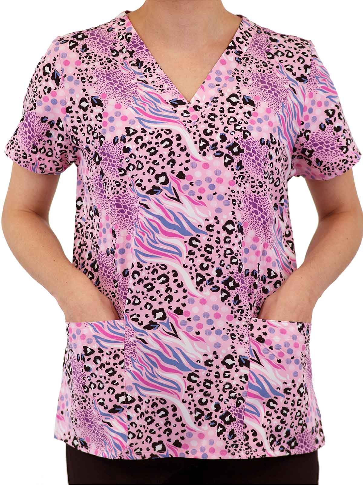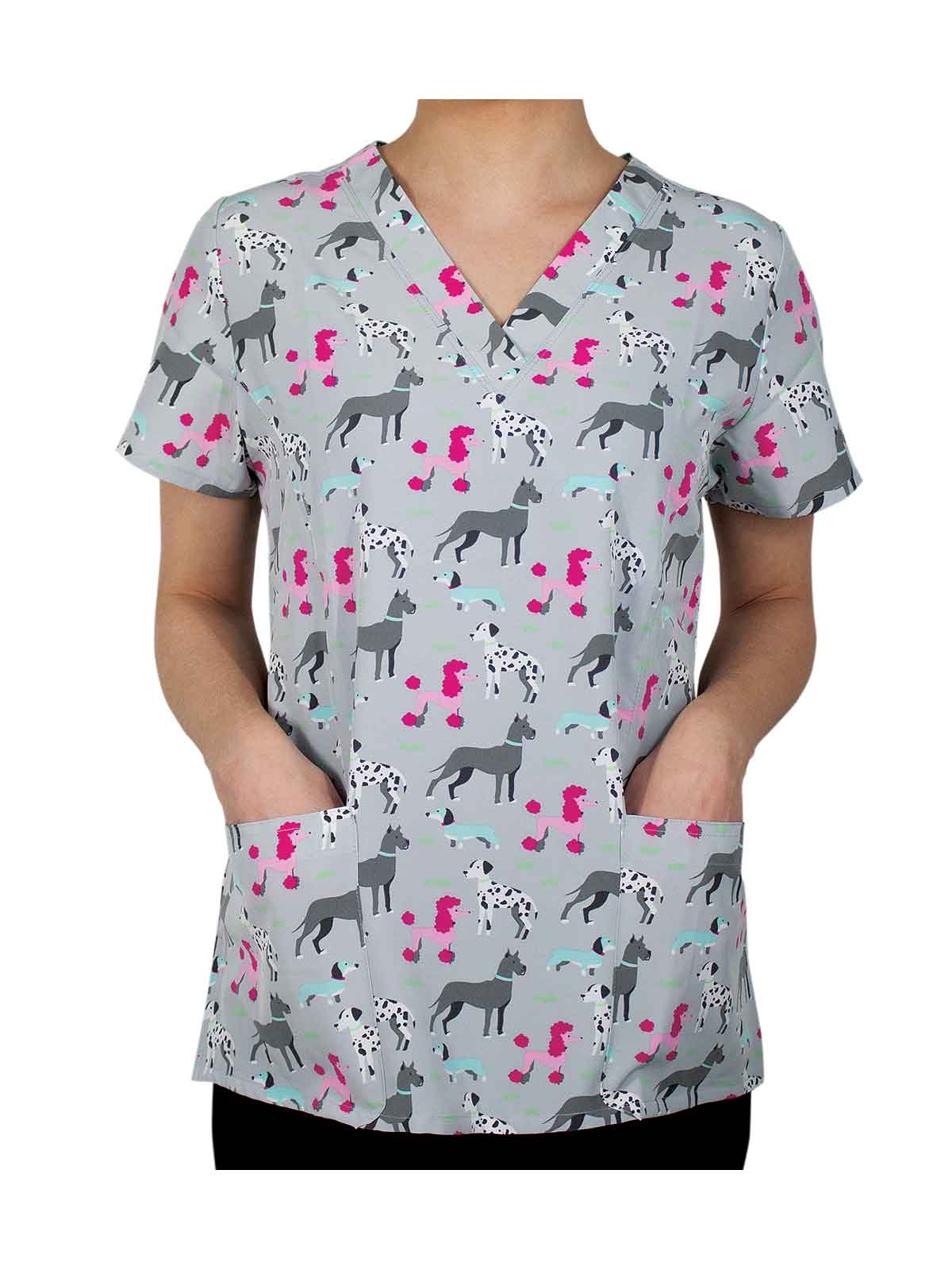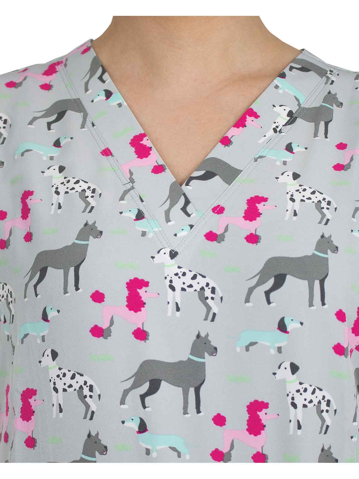 "*Printed curved v-neck top *Front princess seams and back darts for added style and shape *Two slant patch pockets with inner cell pocket *Solid contrast at back facing *Side vents" Banded v-neckline Short sleeves Front princess seaming Back shaping darts...