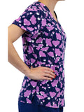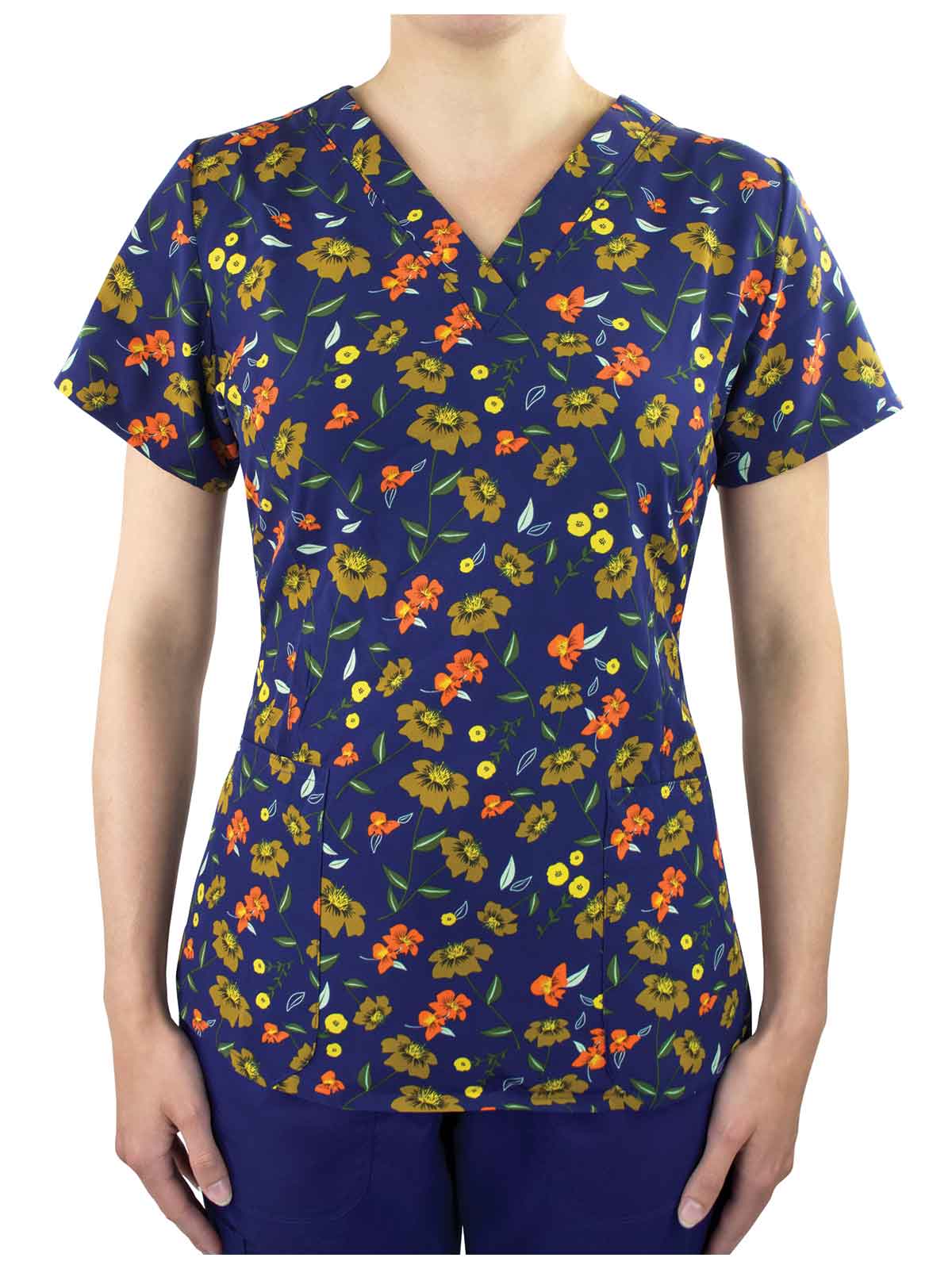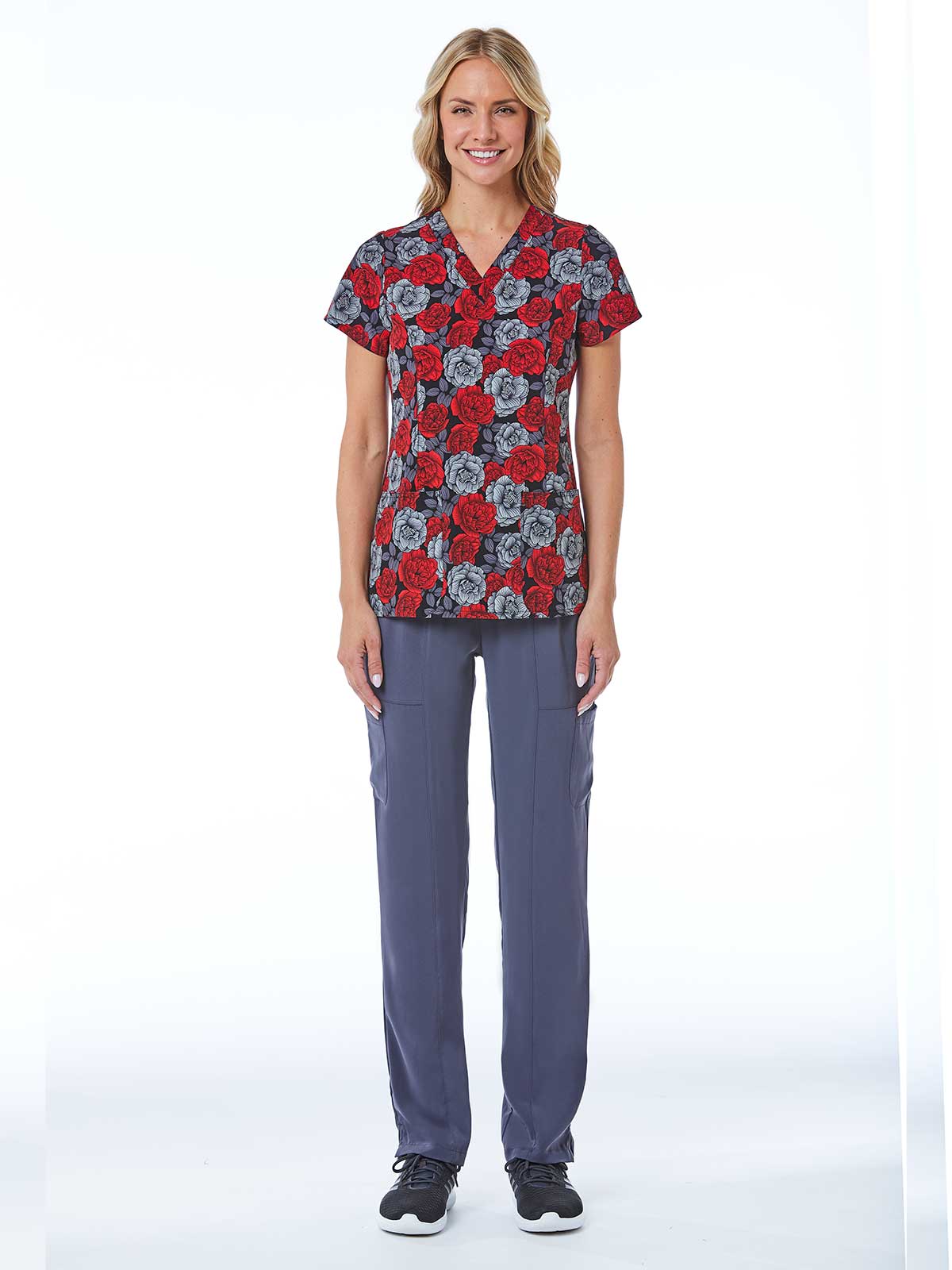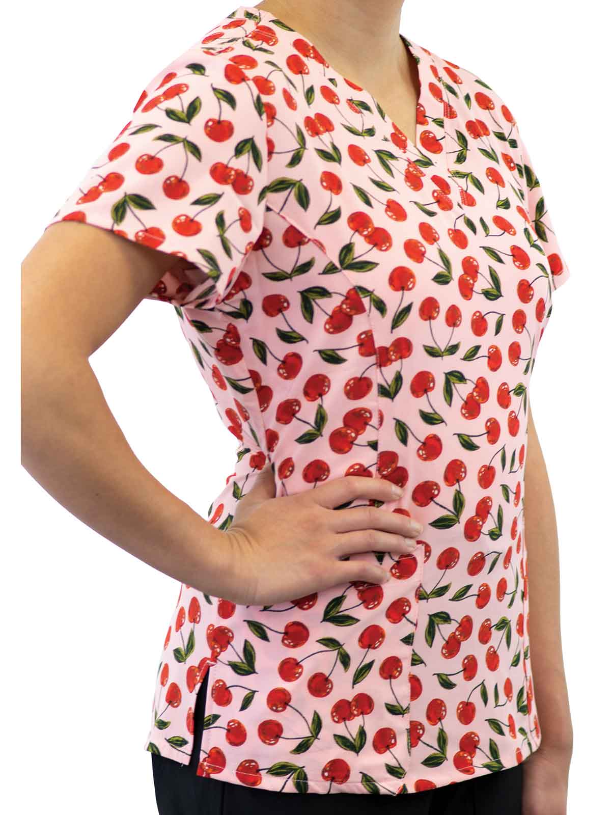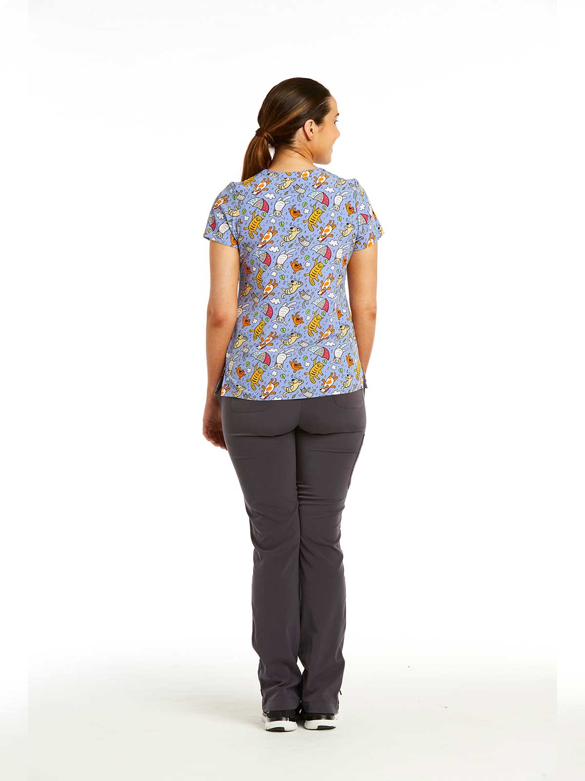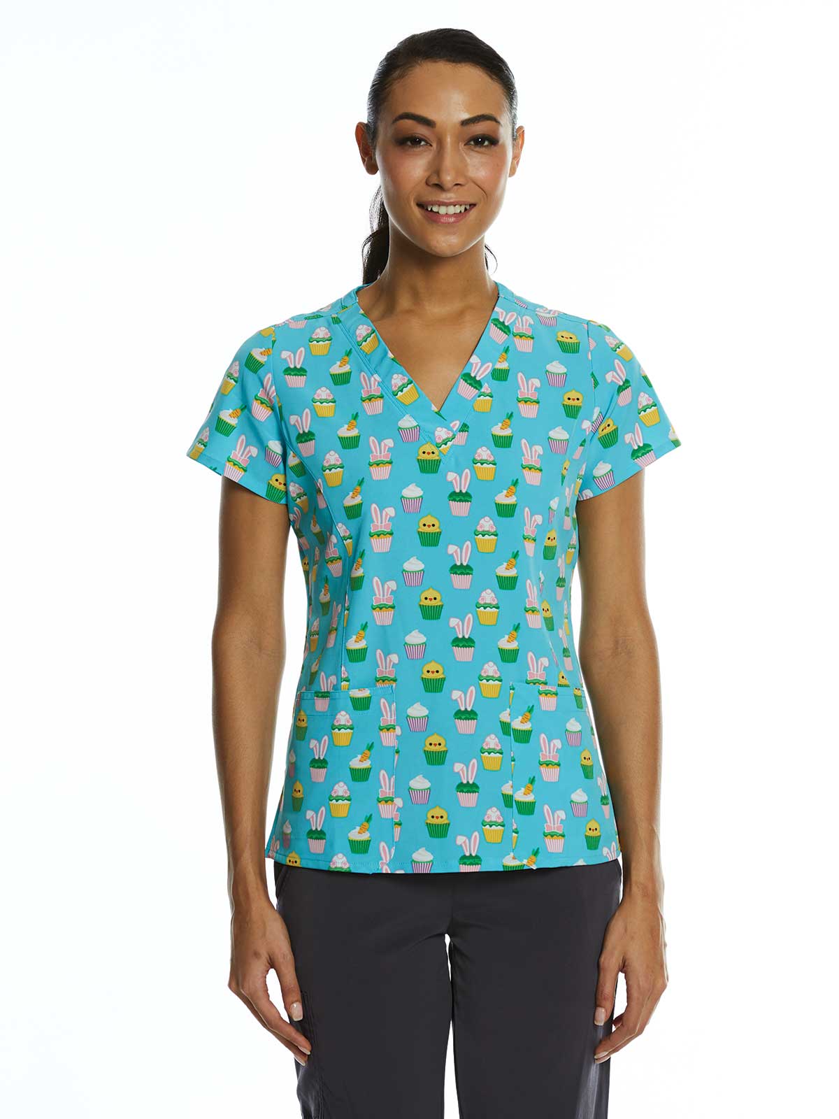 "*Printed curved v-neck top *Front princess seams and back darts for added style and shape *Two slant patch pockets with inner cell pocket *Solid contrast at back facing *Side vents" Banded v-neckline Short sleeves Front princess seaming Back shaping darts...