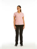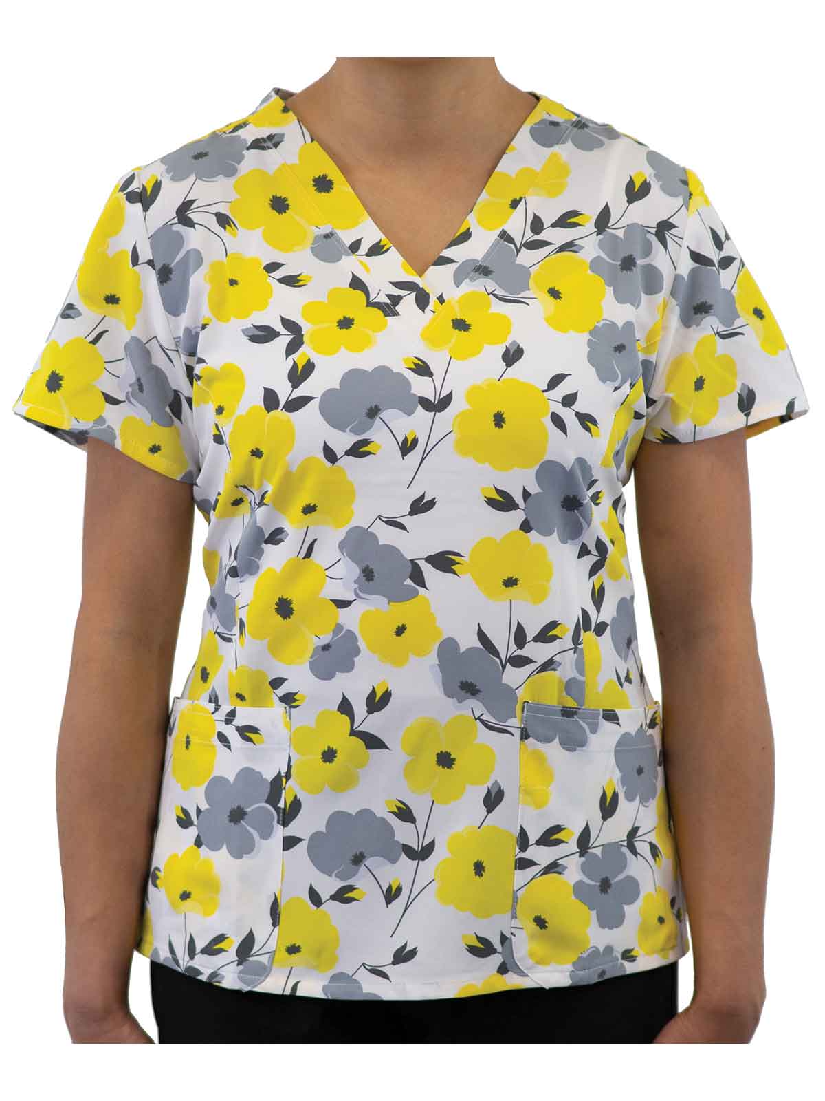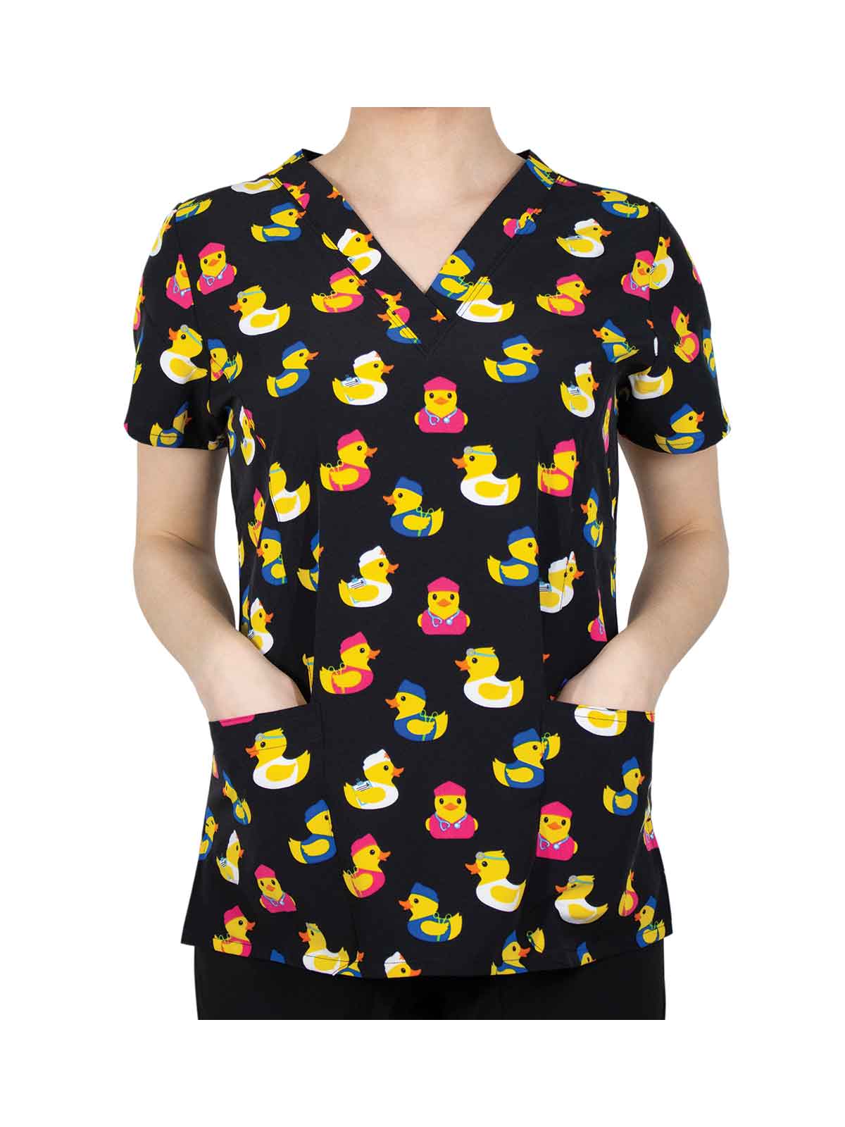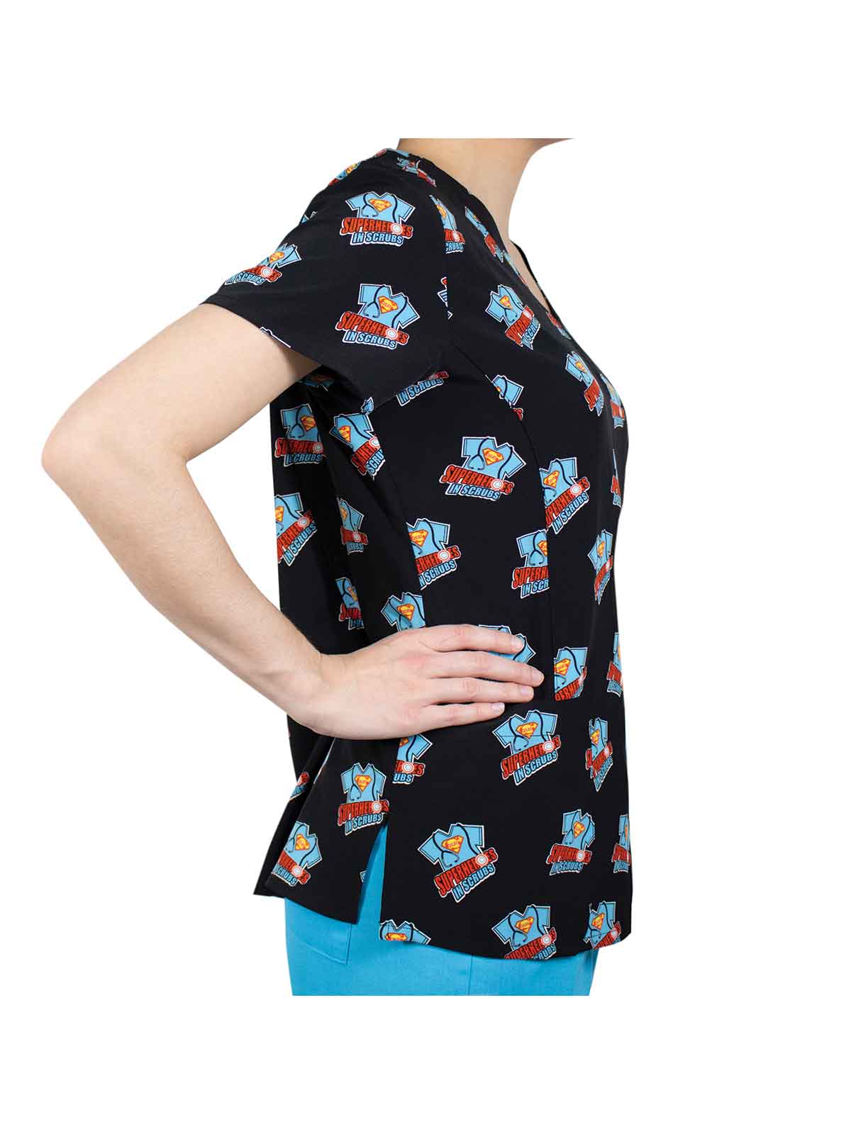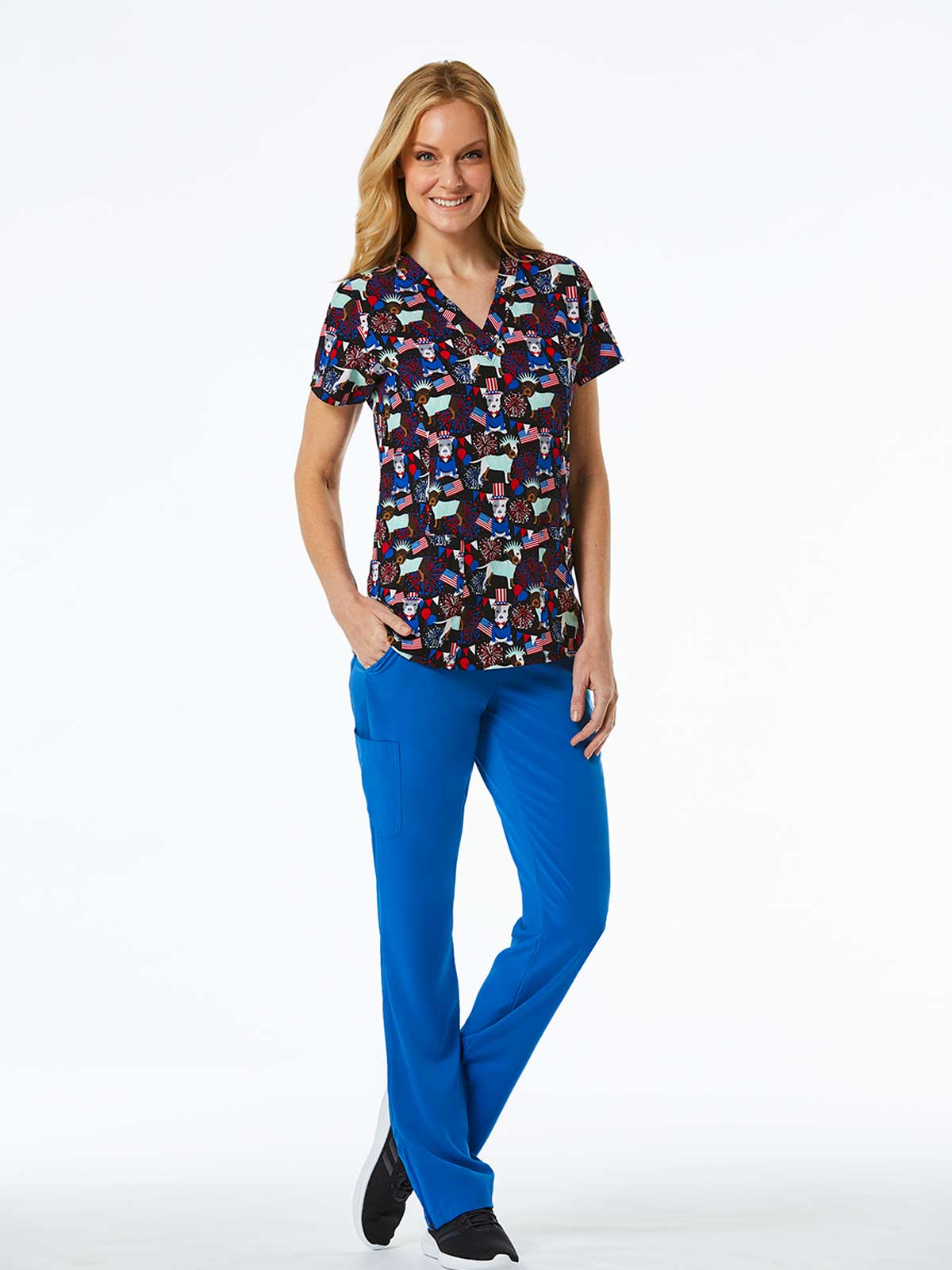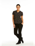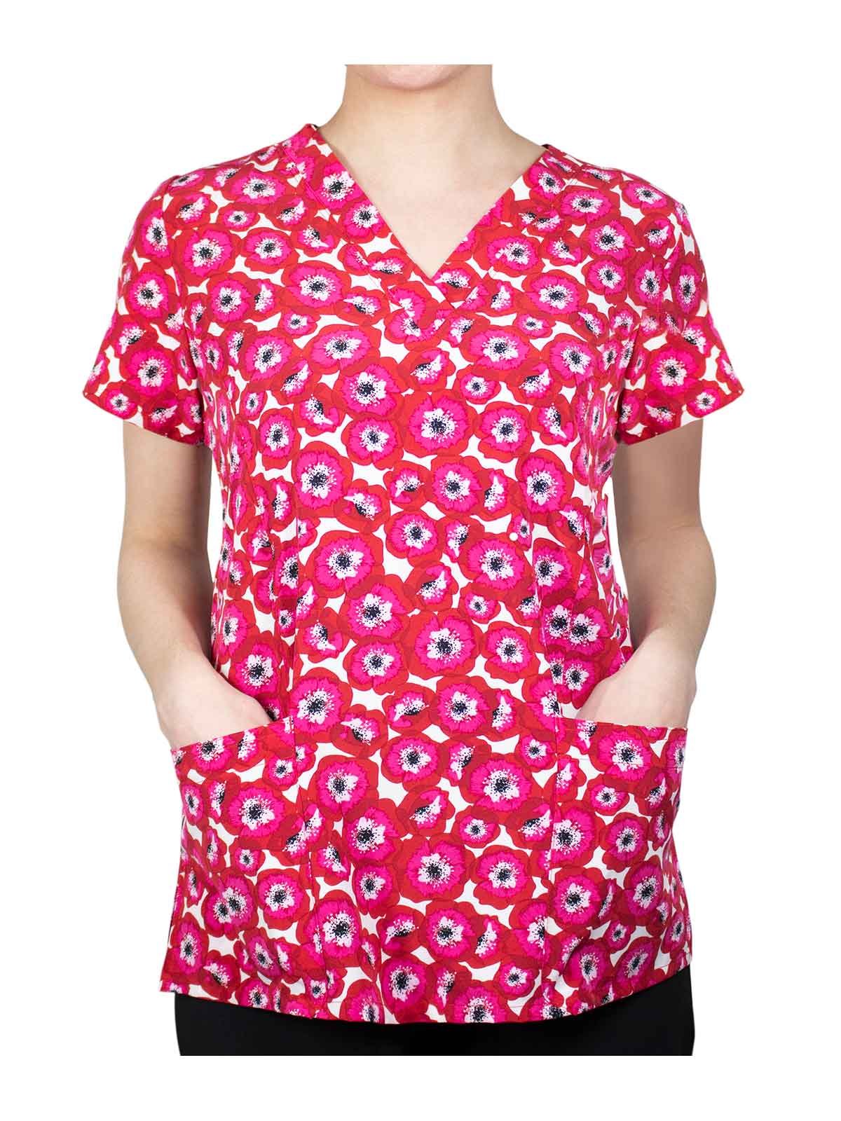 "*Printed curved v-neck top *Front princess seams and back darts for added style and shape *Two slant patch pockets with inner cell pocket *Solid contrast at back facing *Side vents" Banded v-neckline Short sleeves Front princess seaming Back shaping darts...