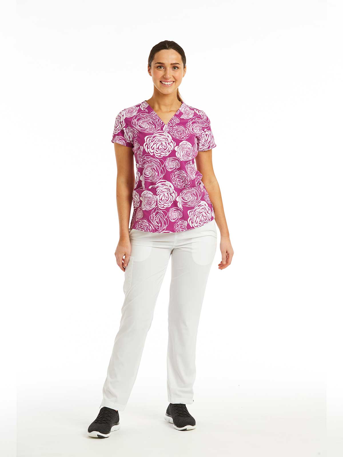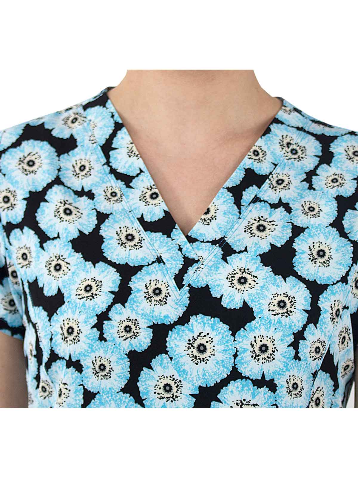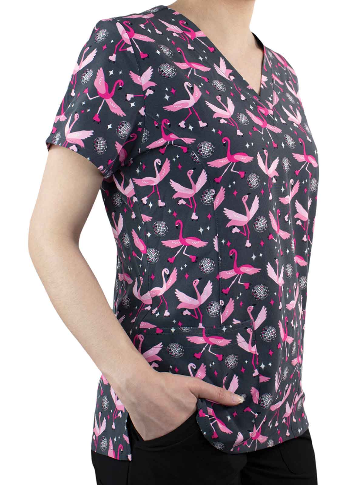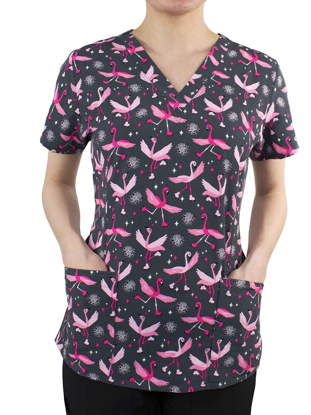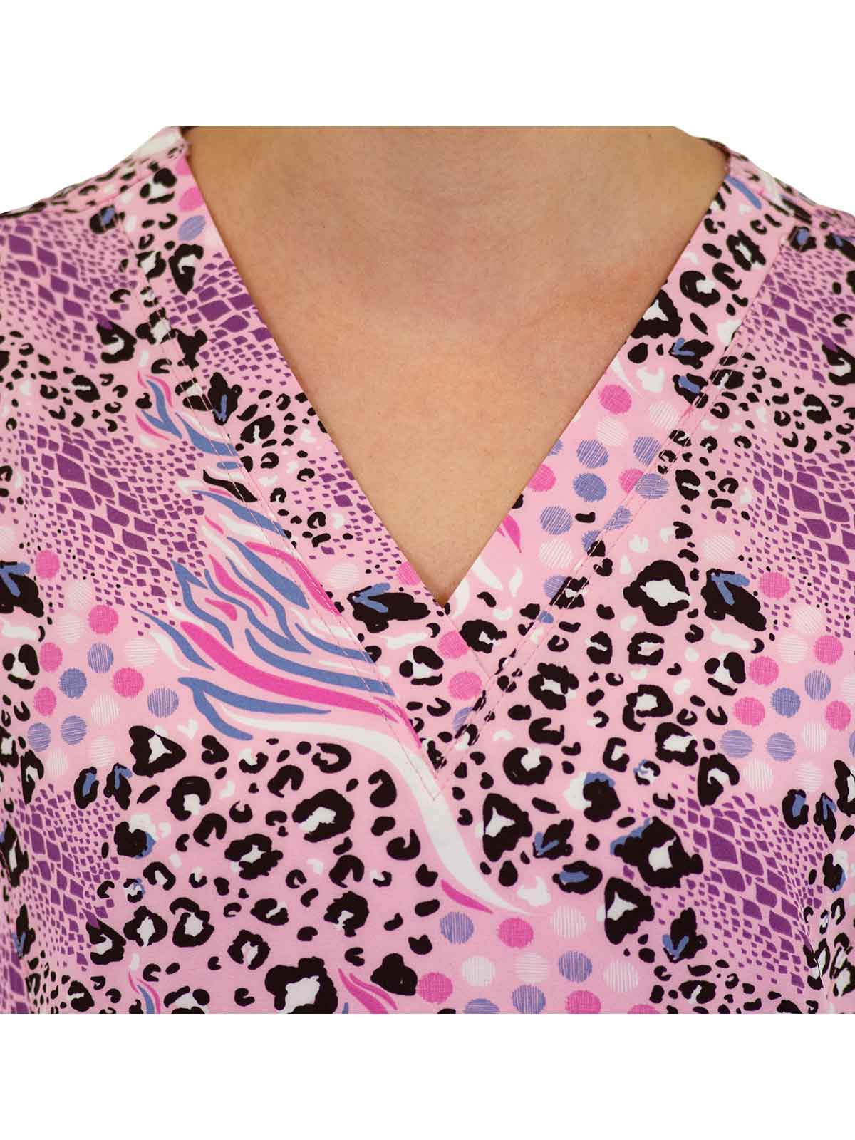 "*Printed curved v-neck top *Front princess seams and back darts for added style and shape *Two slant patch pockets with inner cell pocket *Solid contrast at back facing *Side vents" Banded v-neckline Short sleeves Front princess seaming Back shaping darts...