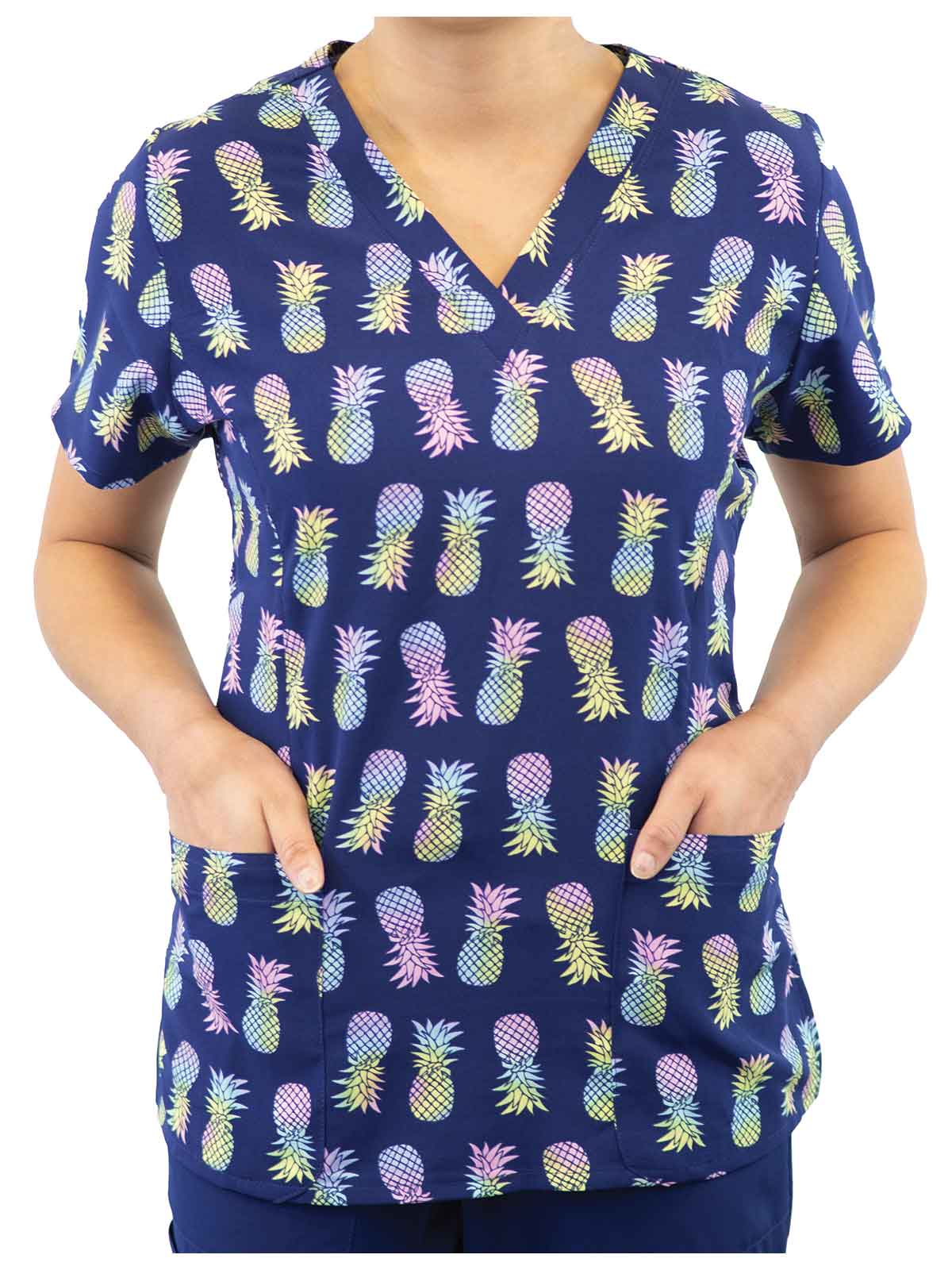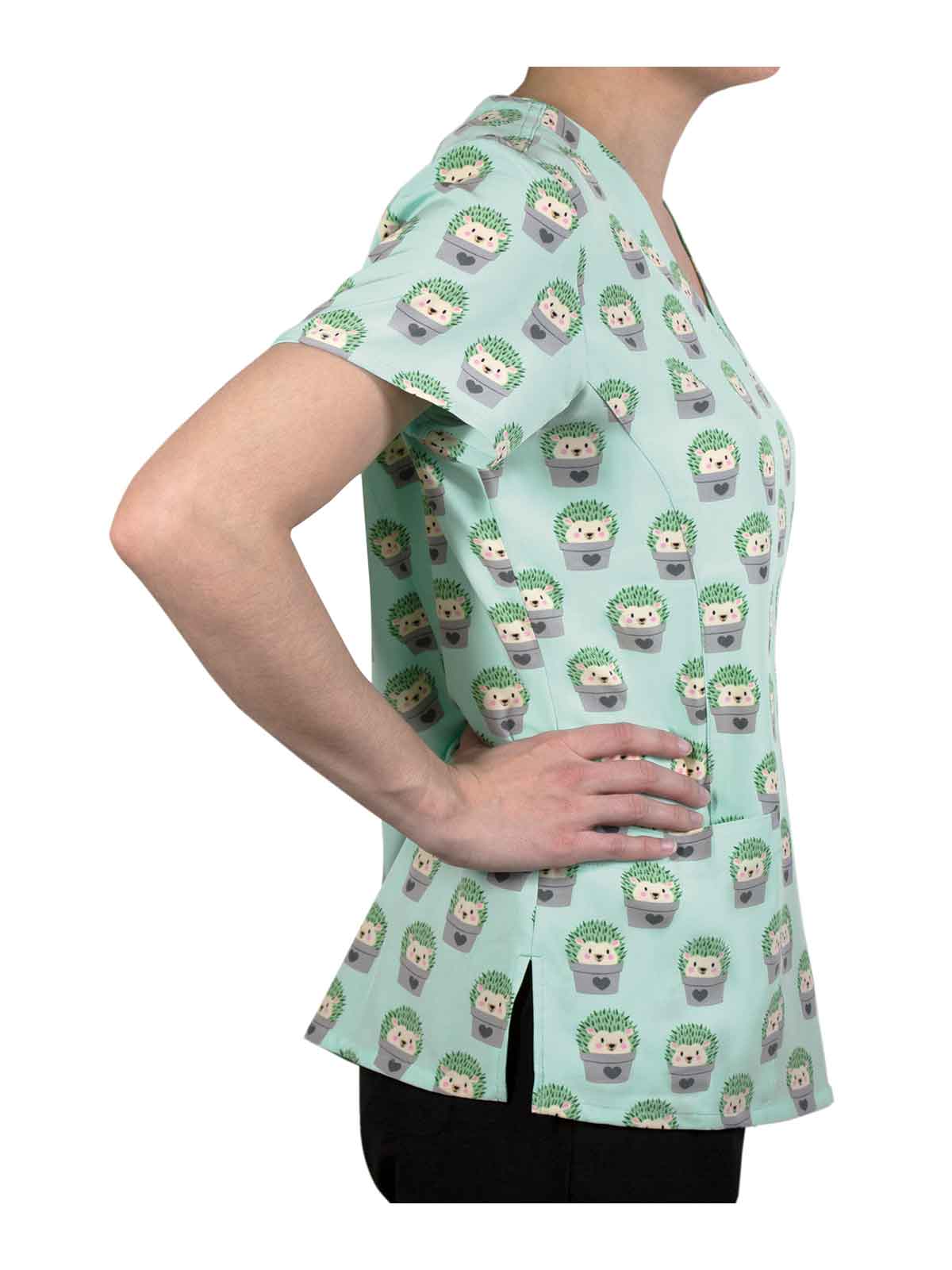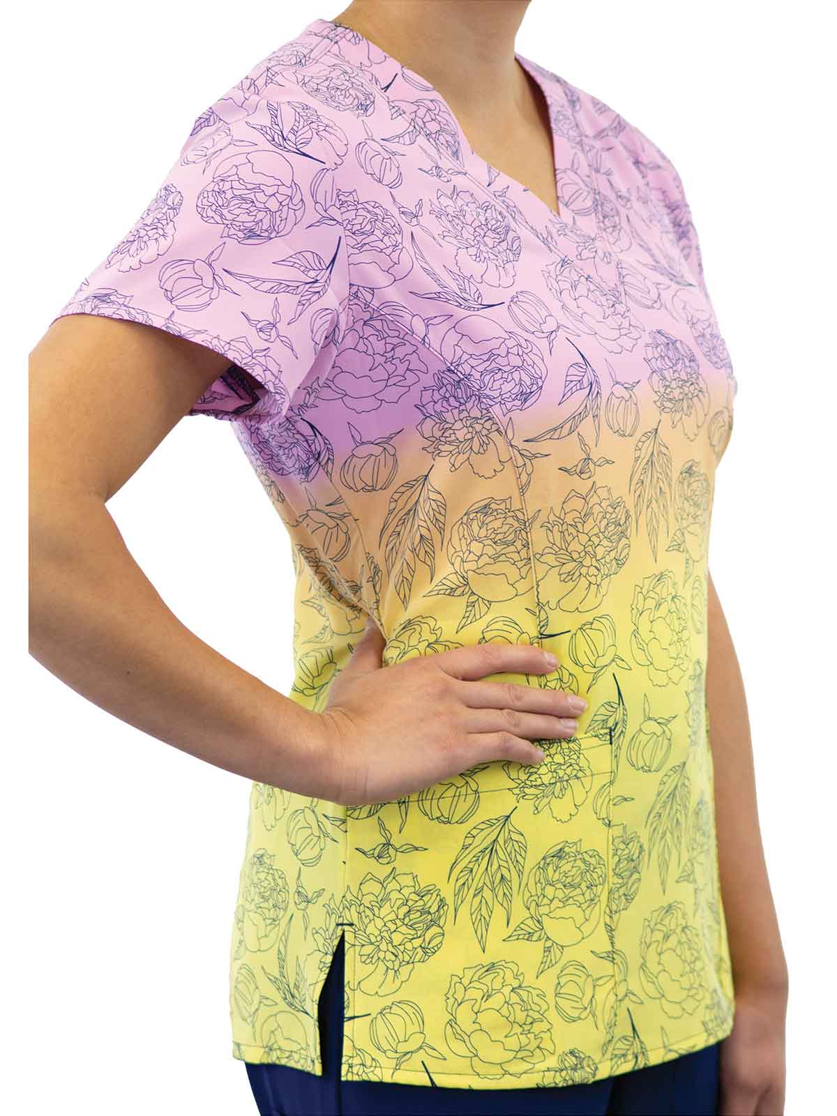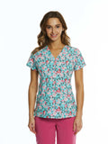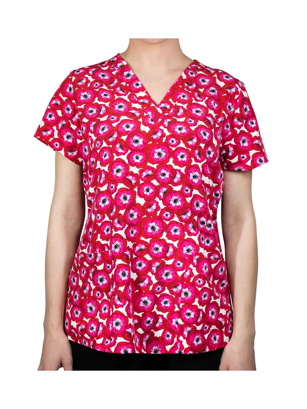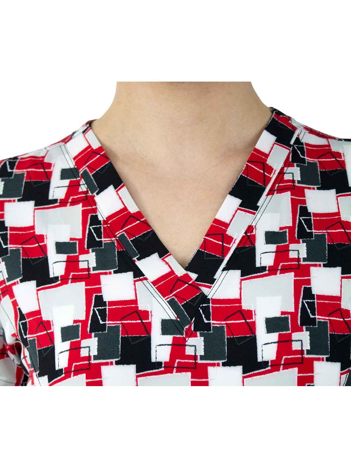 "*Printed curved v-neck top *Front princess seams and back darts for added style and shape *Two slant patch pockets with inner cell pocket *Solid contrast at back facing *Side vents" Banded v-neckline Short sleeves Front princess seaming Back shaping darts...