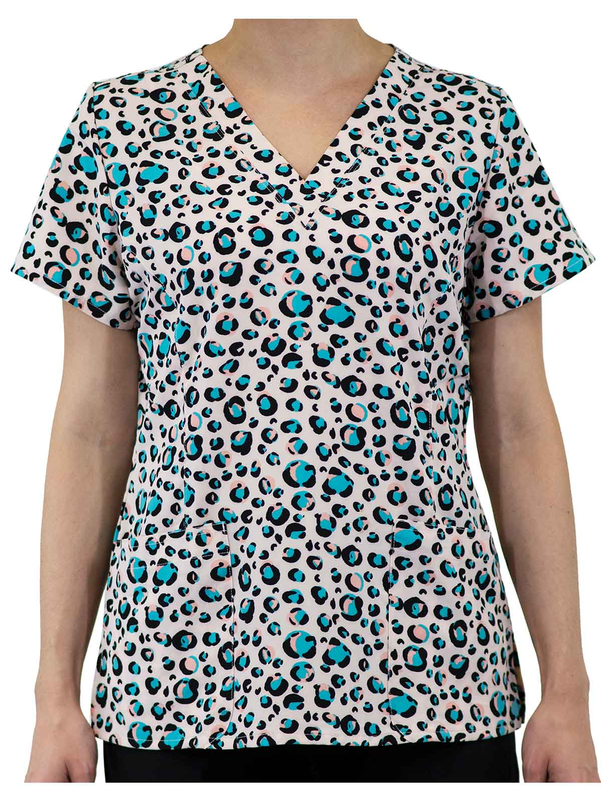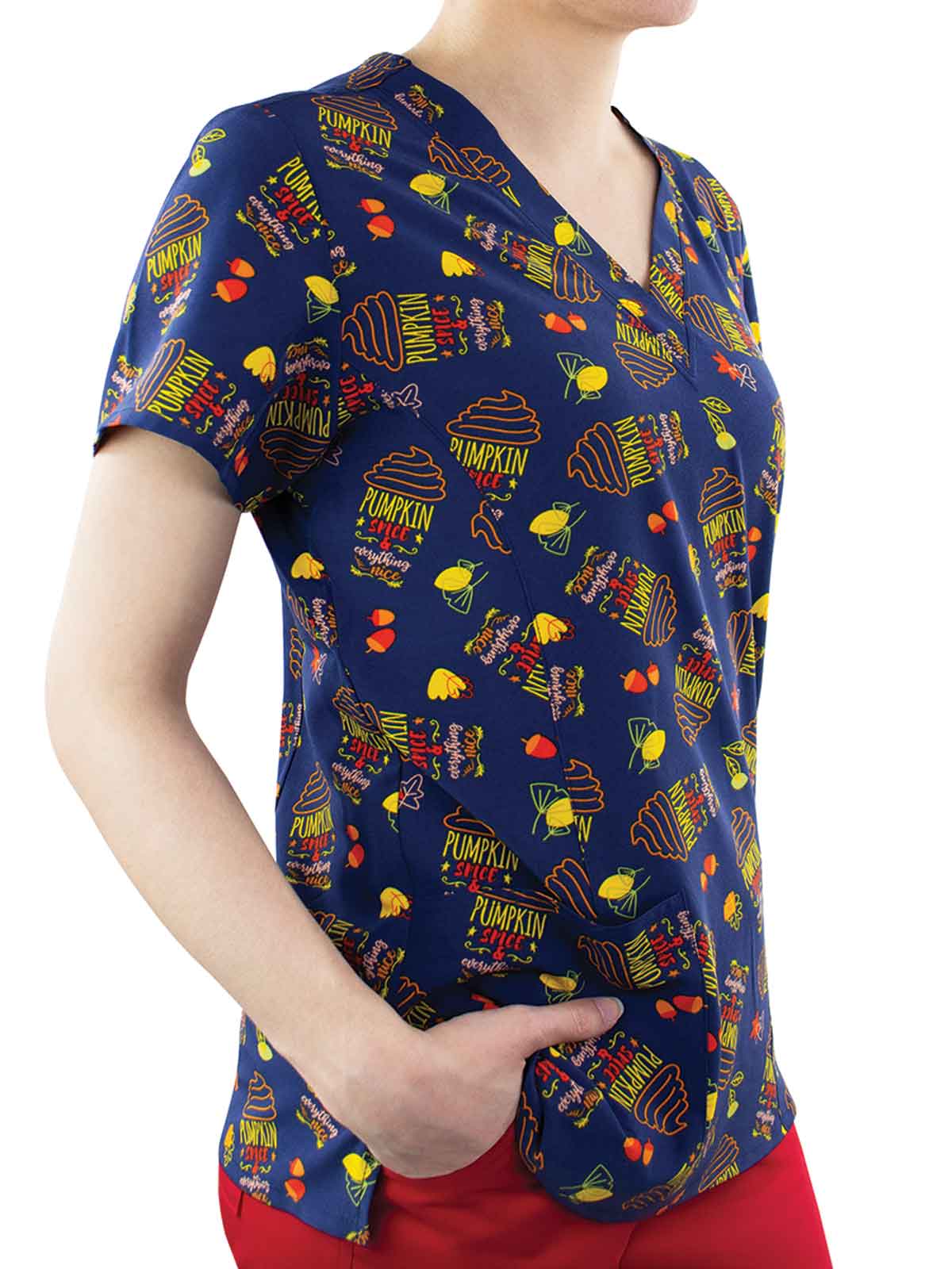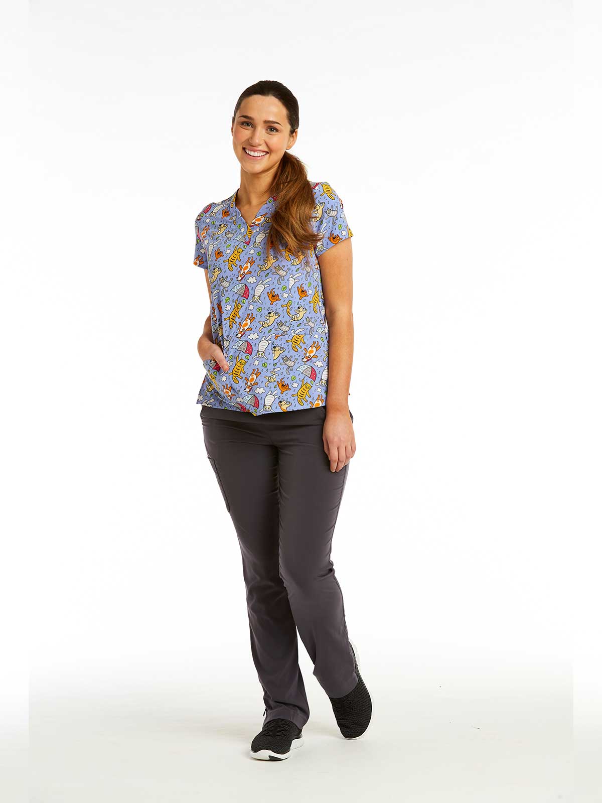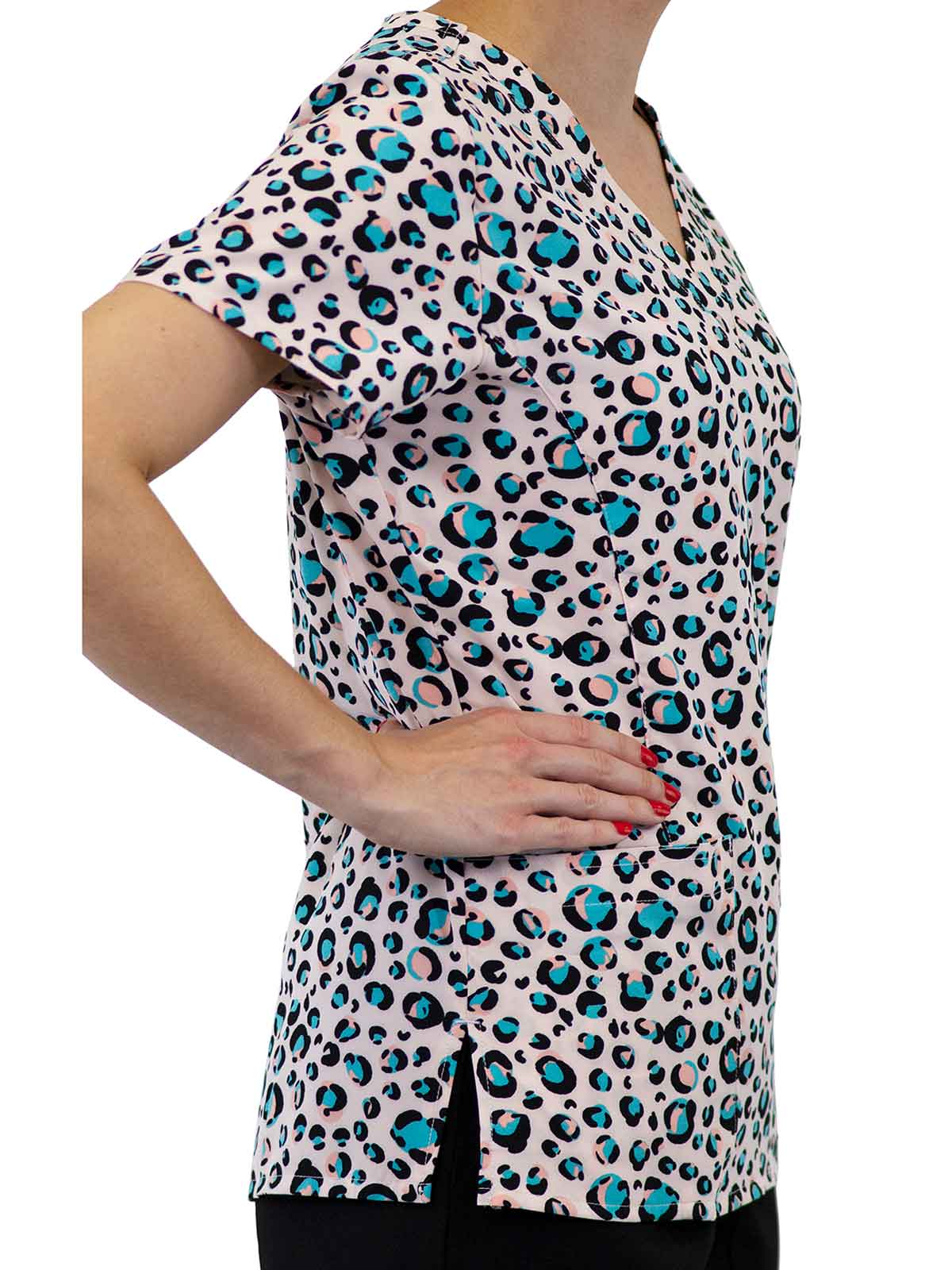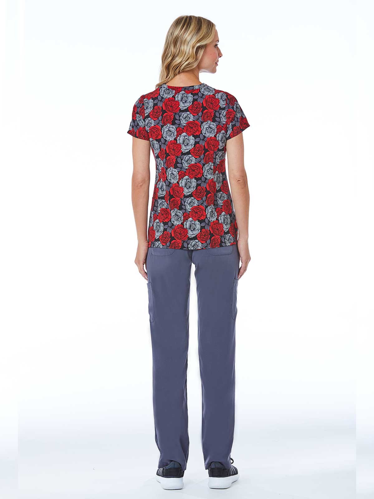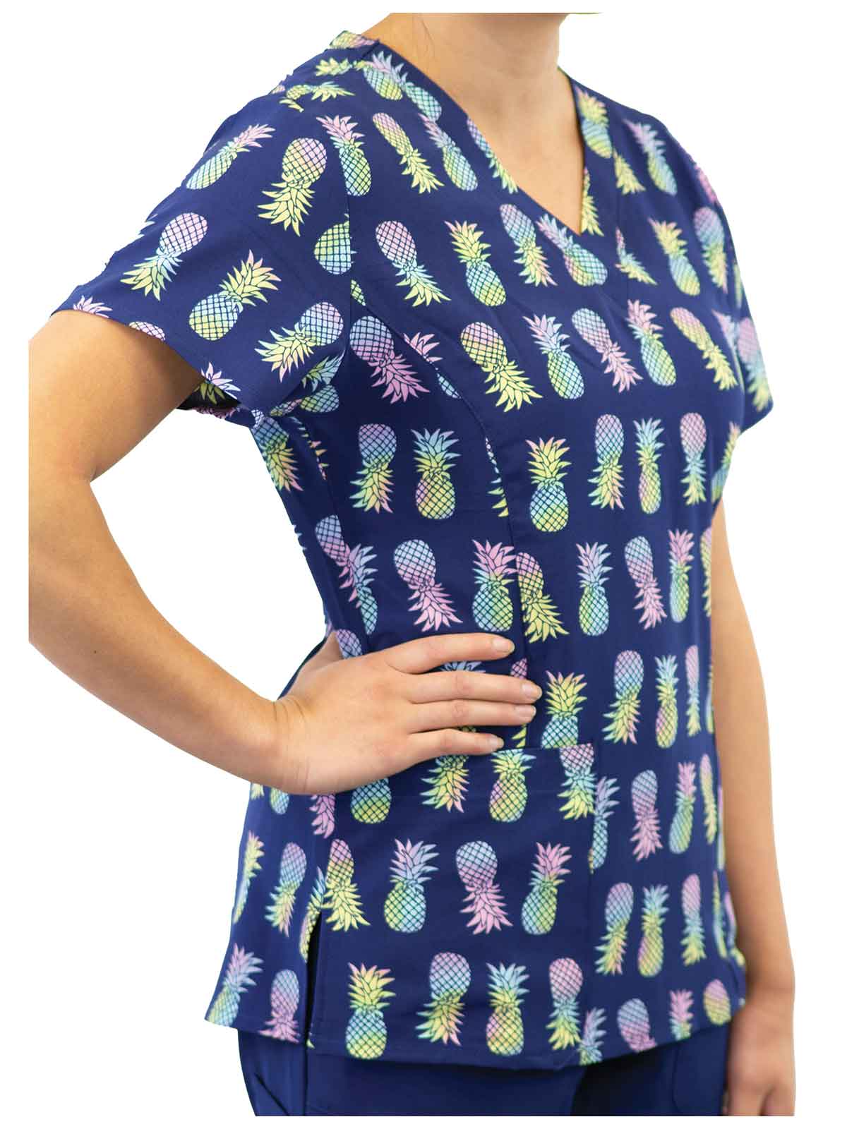 "*Printed curved v-neck top *Front princess seams and back darts for added style and shape *Two slant patch pockets with inner cell pocket *Solid contrast at back facing *Side vents" Banded v-neckline Short sleeves Front princess seaming Back shaping darts...
