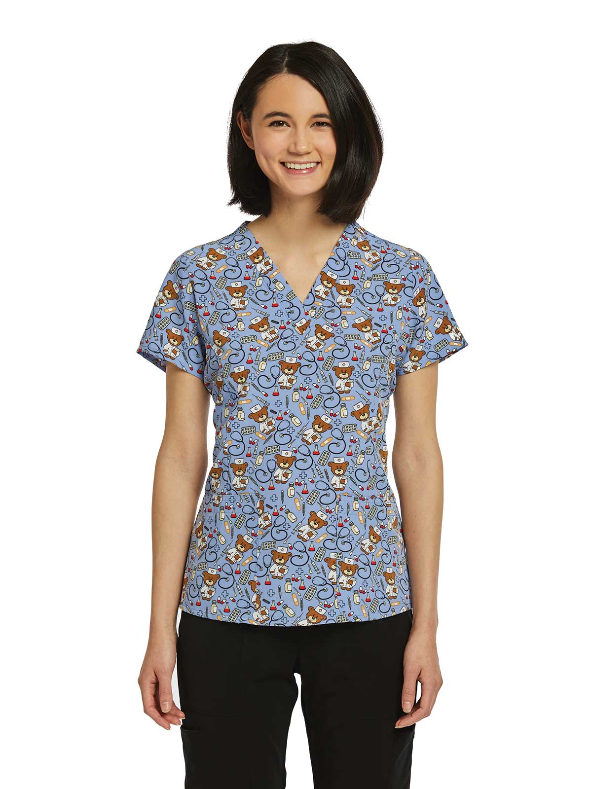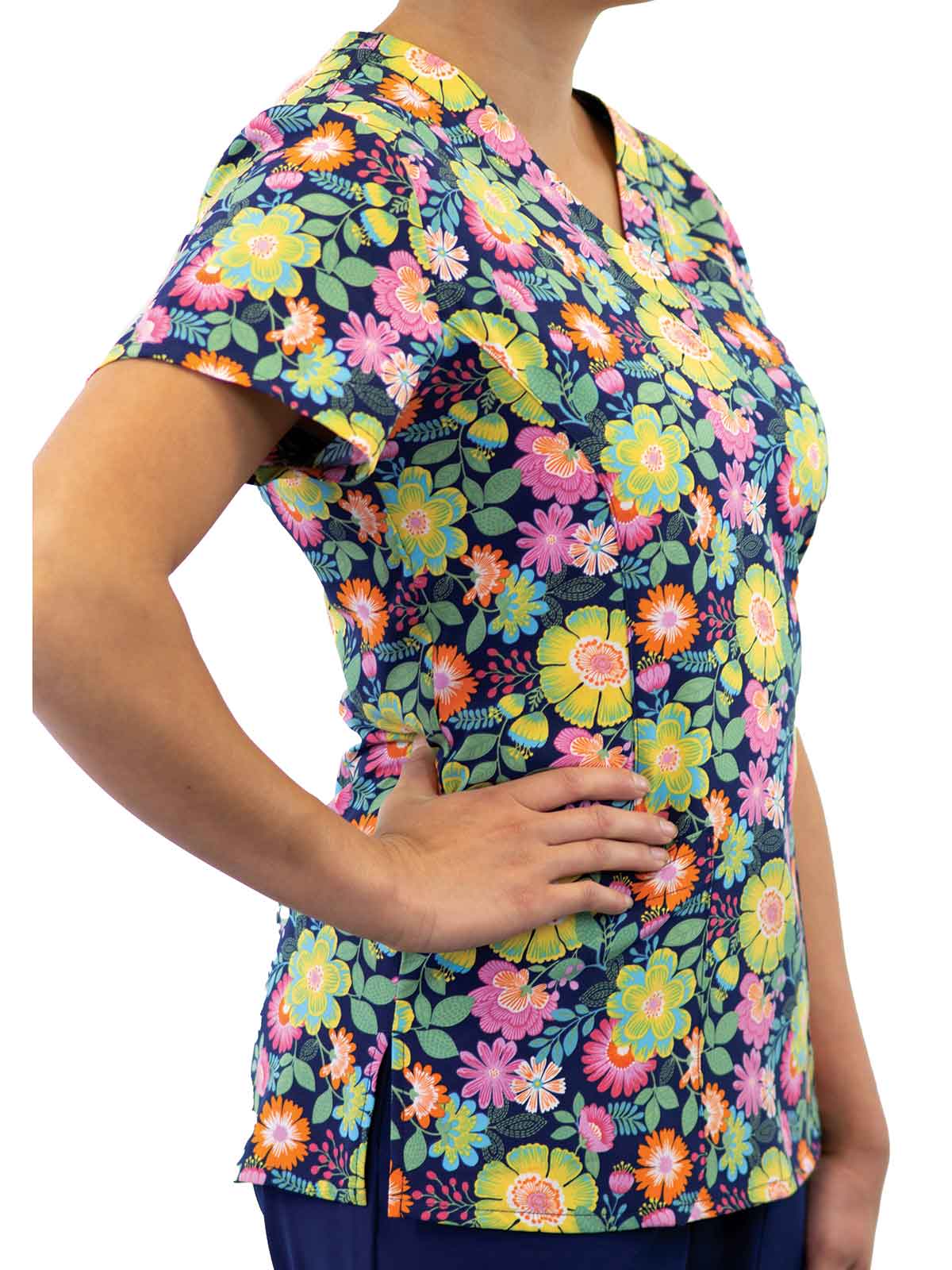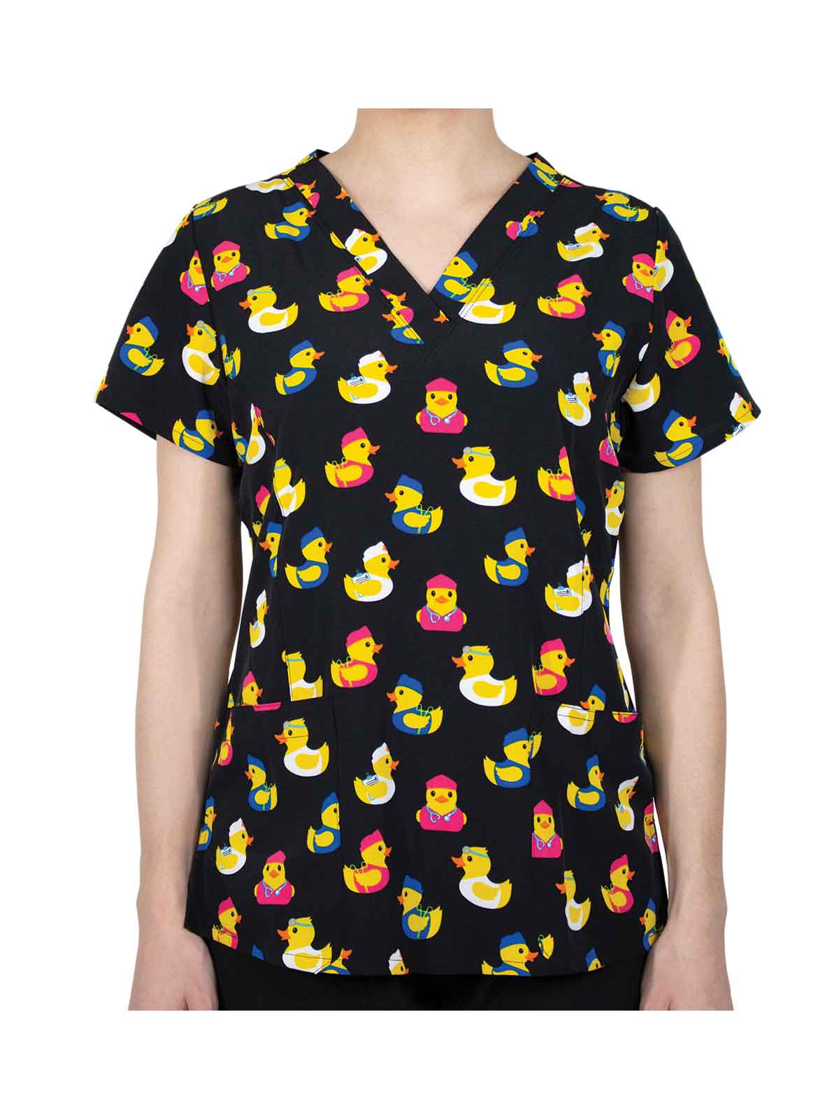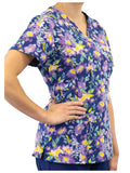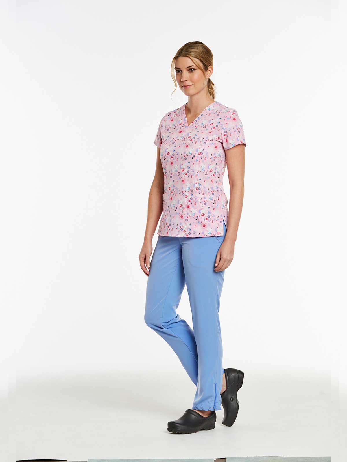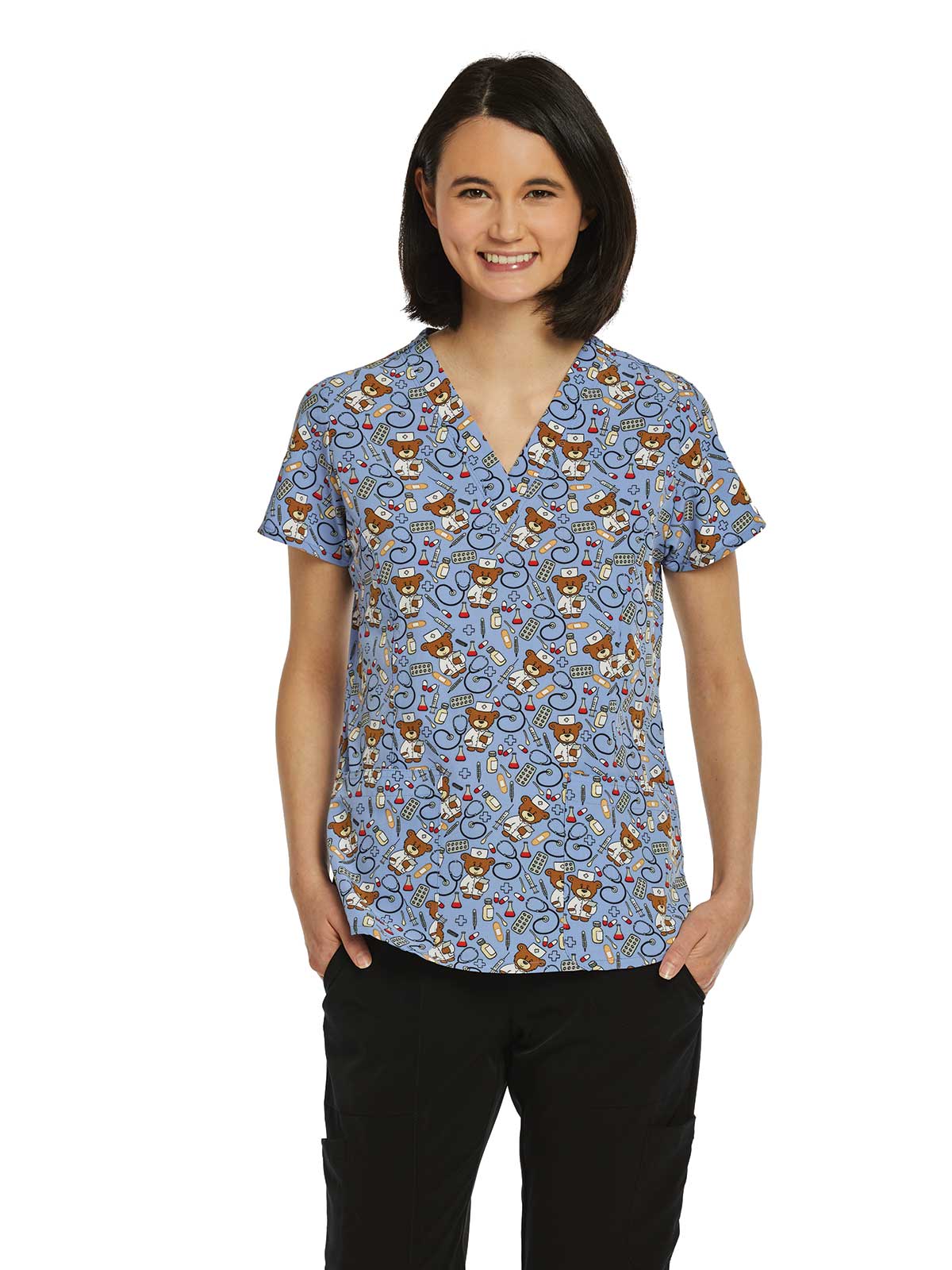 "*Printed curved v-neck top *Front princess seams and back darts for added style and shape *Two slant patch pockets with inner cell pocket *Solid contrast at back facing *Side vents" Banded v-neckline Short sleeves Front princess seaming Back shaping darts...