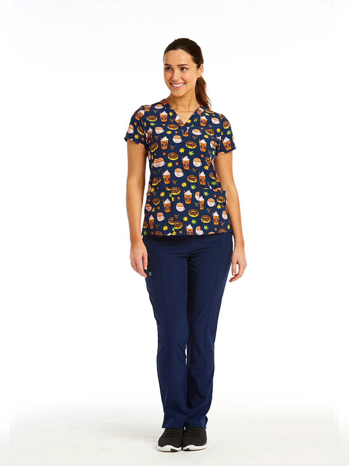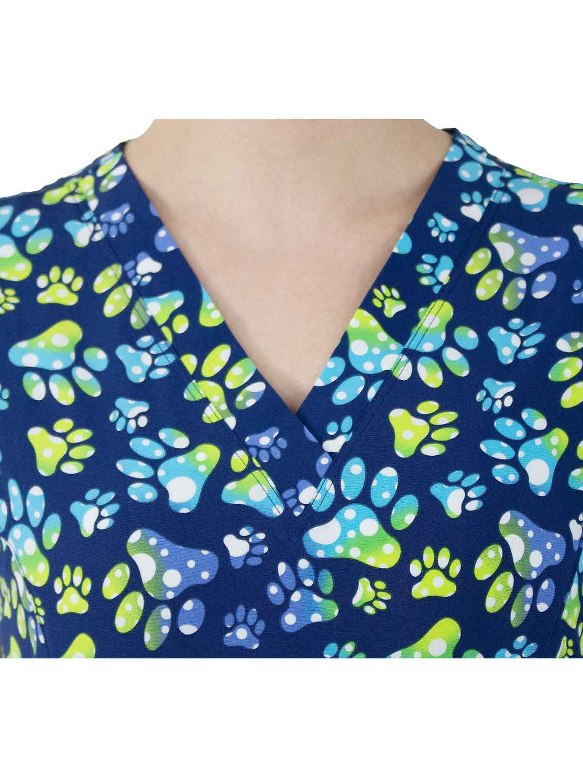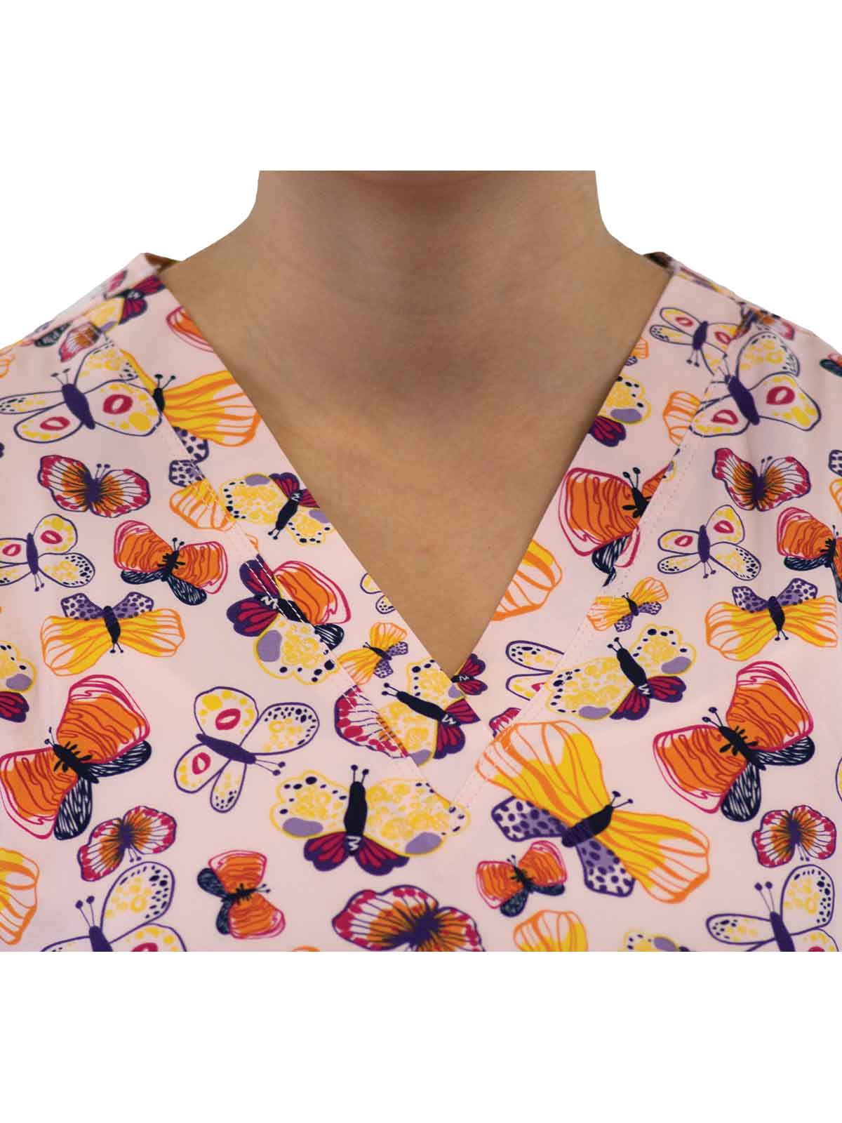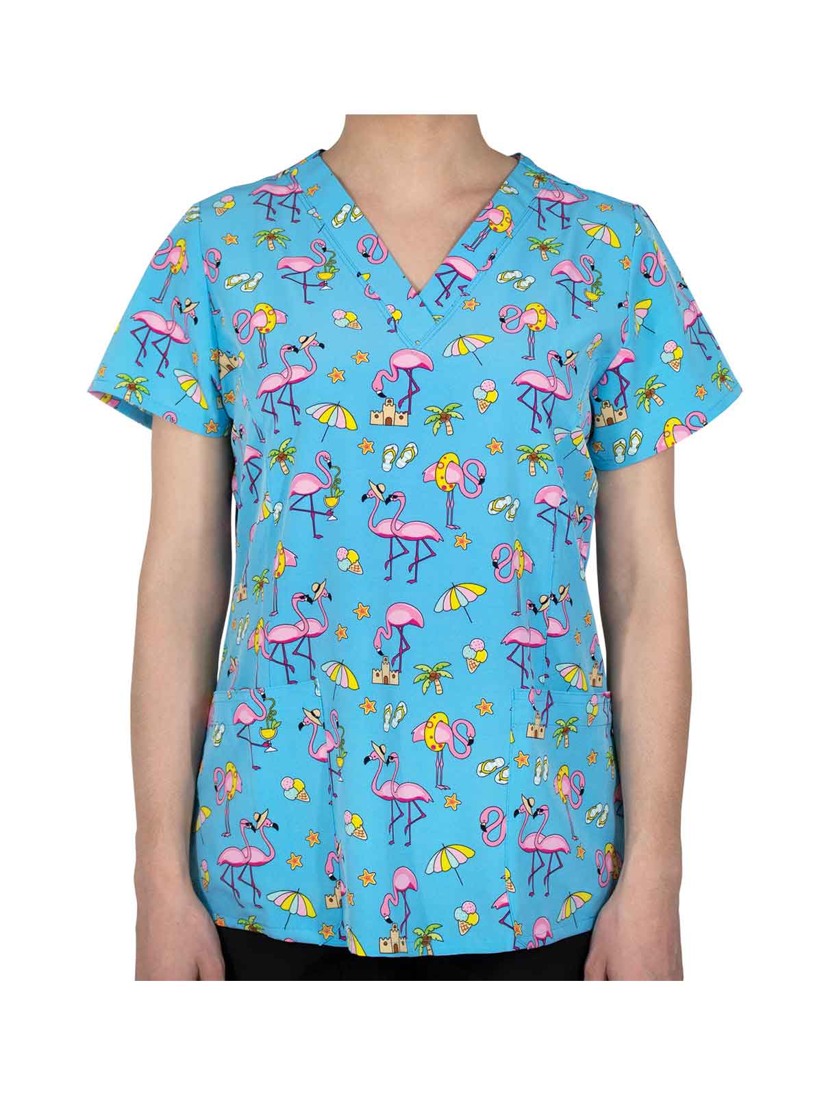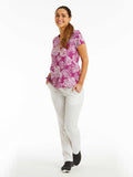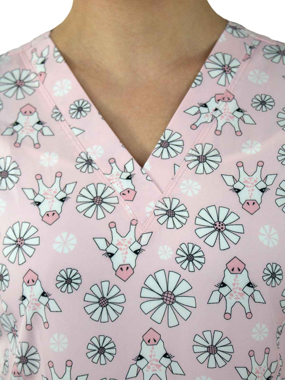 "*Printed curved v-neck top *Front princess seams and back darts for added style and shape *Two slant patch pockets with inner cell pocket *Solid contrast at back facing *Side vents" Banded v-neckline Short sleeves Front princess seaming Back shaping darts...