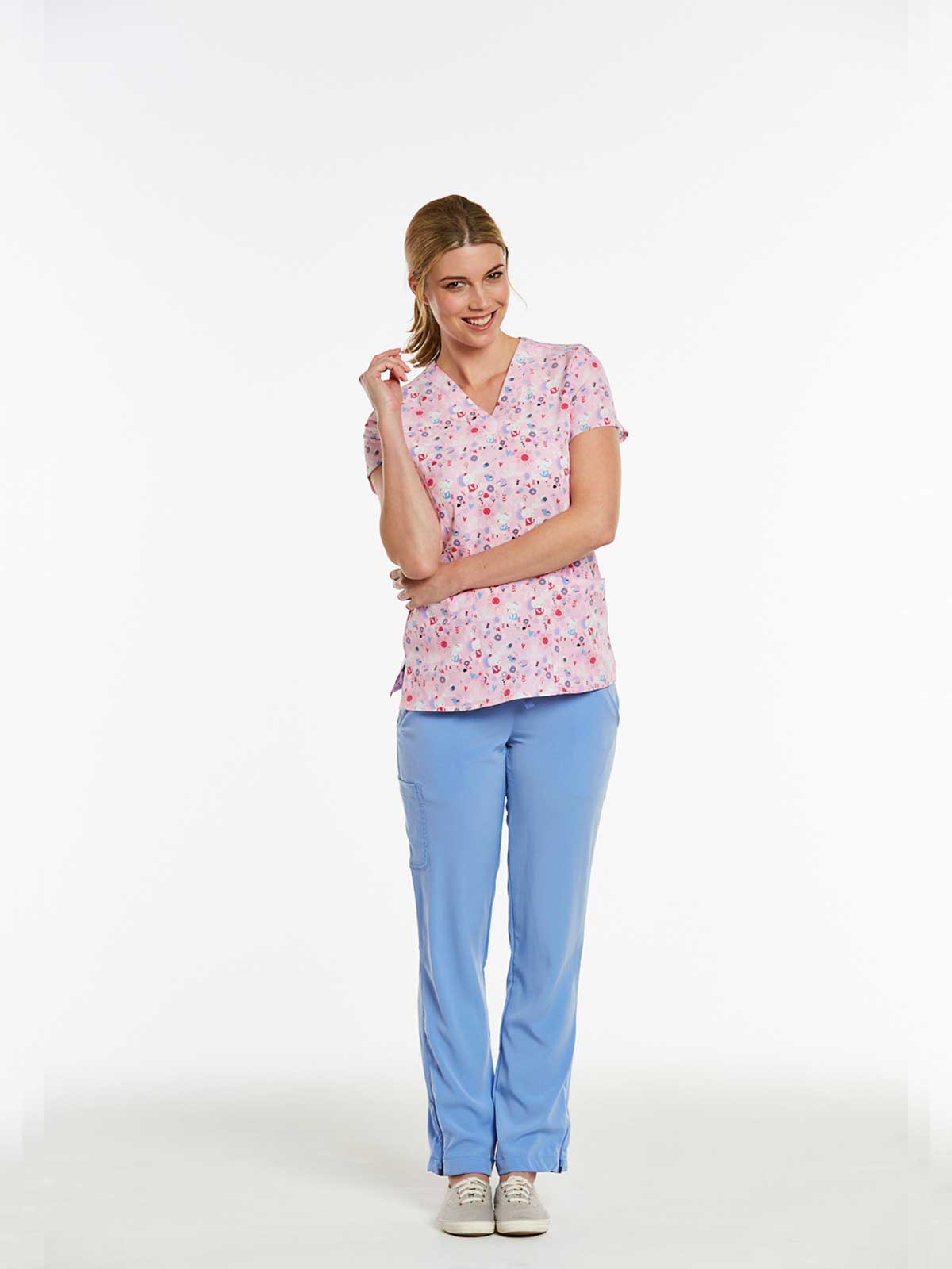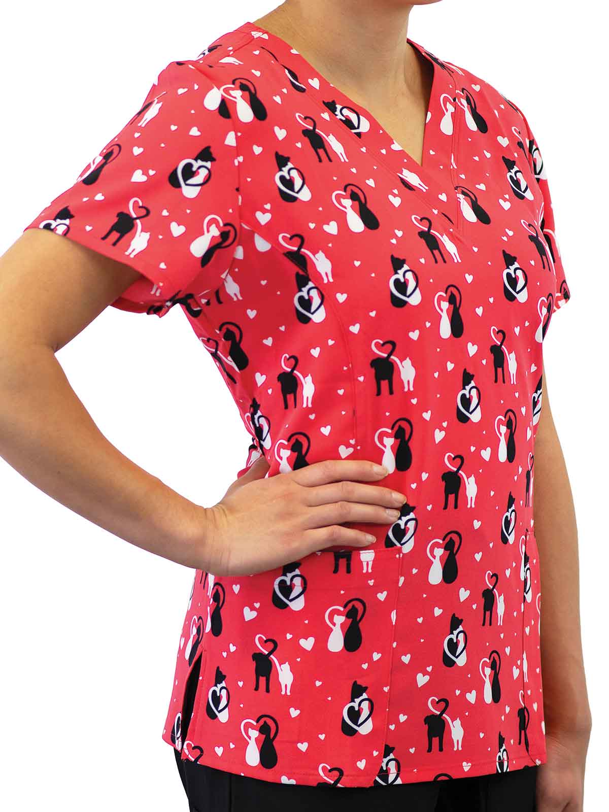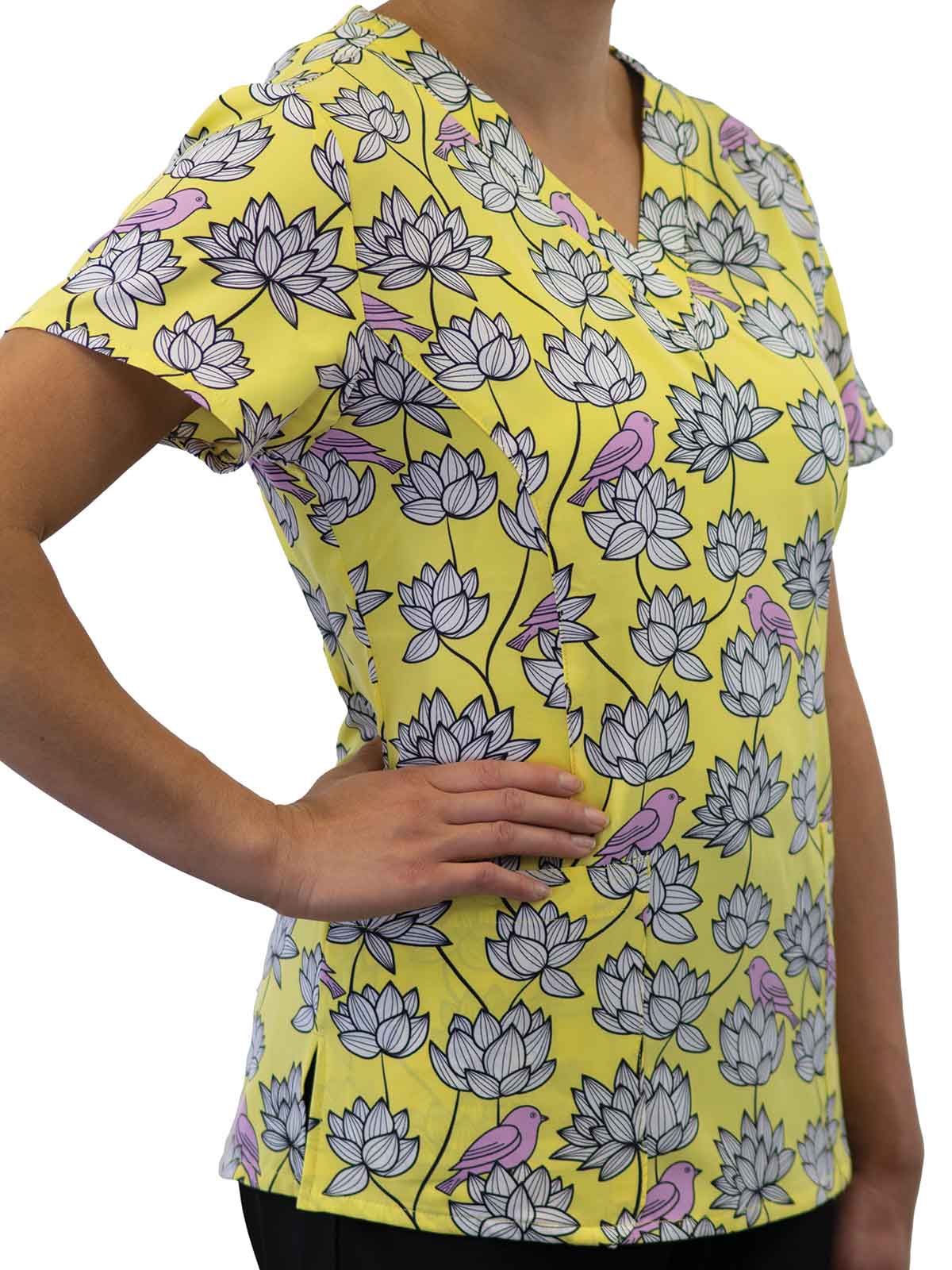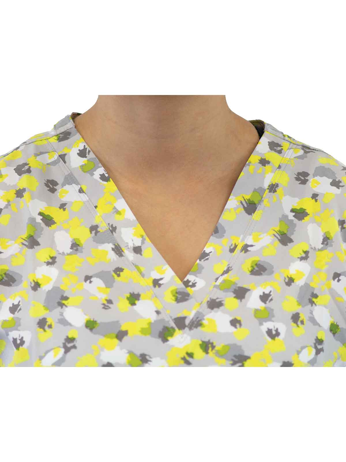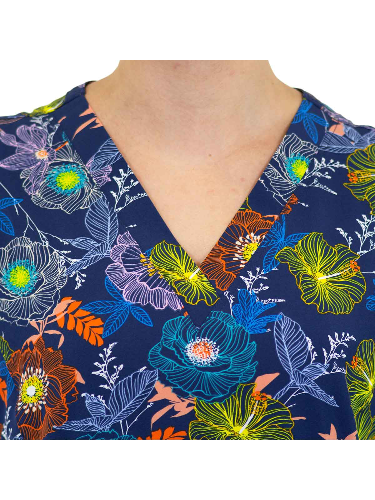 "*Printed curved v-neck top *Front princess seams and back darts for added style and shape *Two slant patch pockets with inner cell pocket *Solid contrast at back facing *Side vents" Banded v-neckline Short sleeves Front princess seaming Back shaping darts...