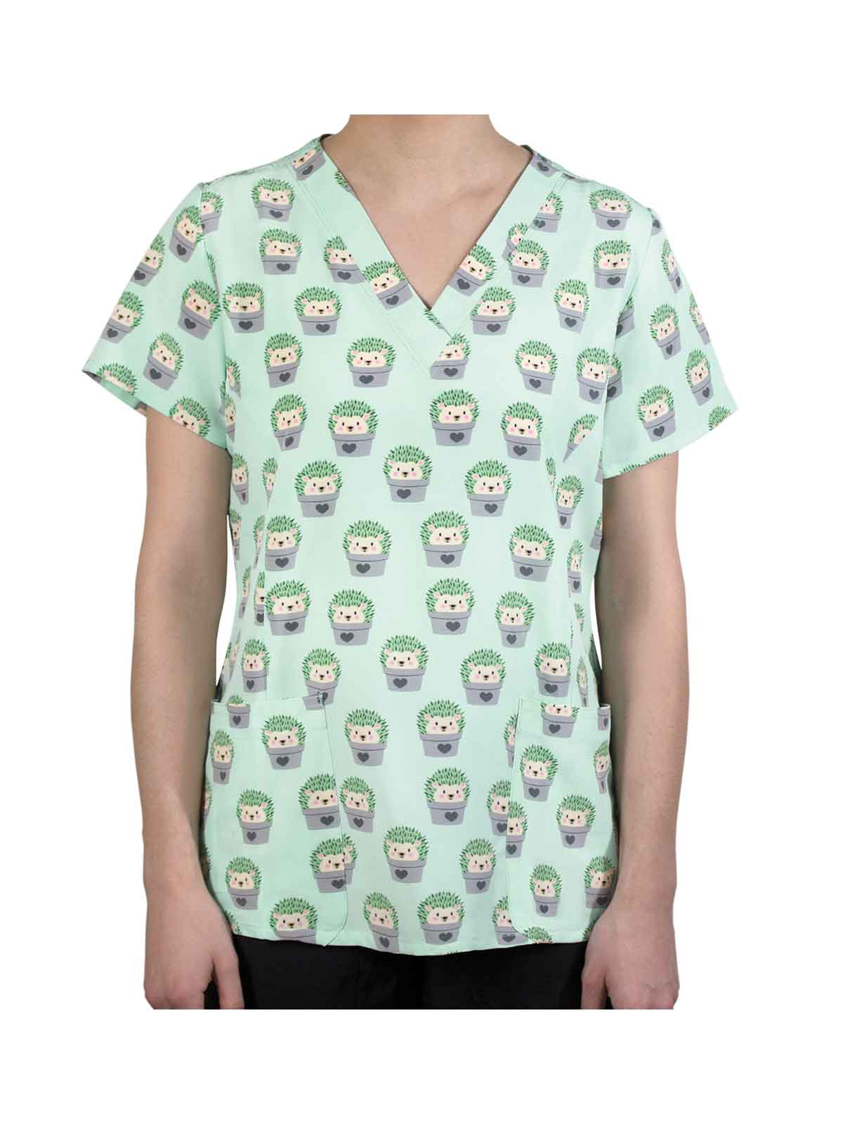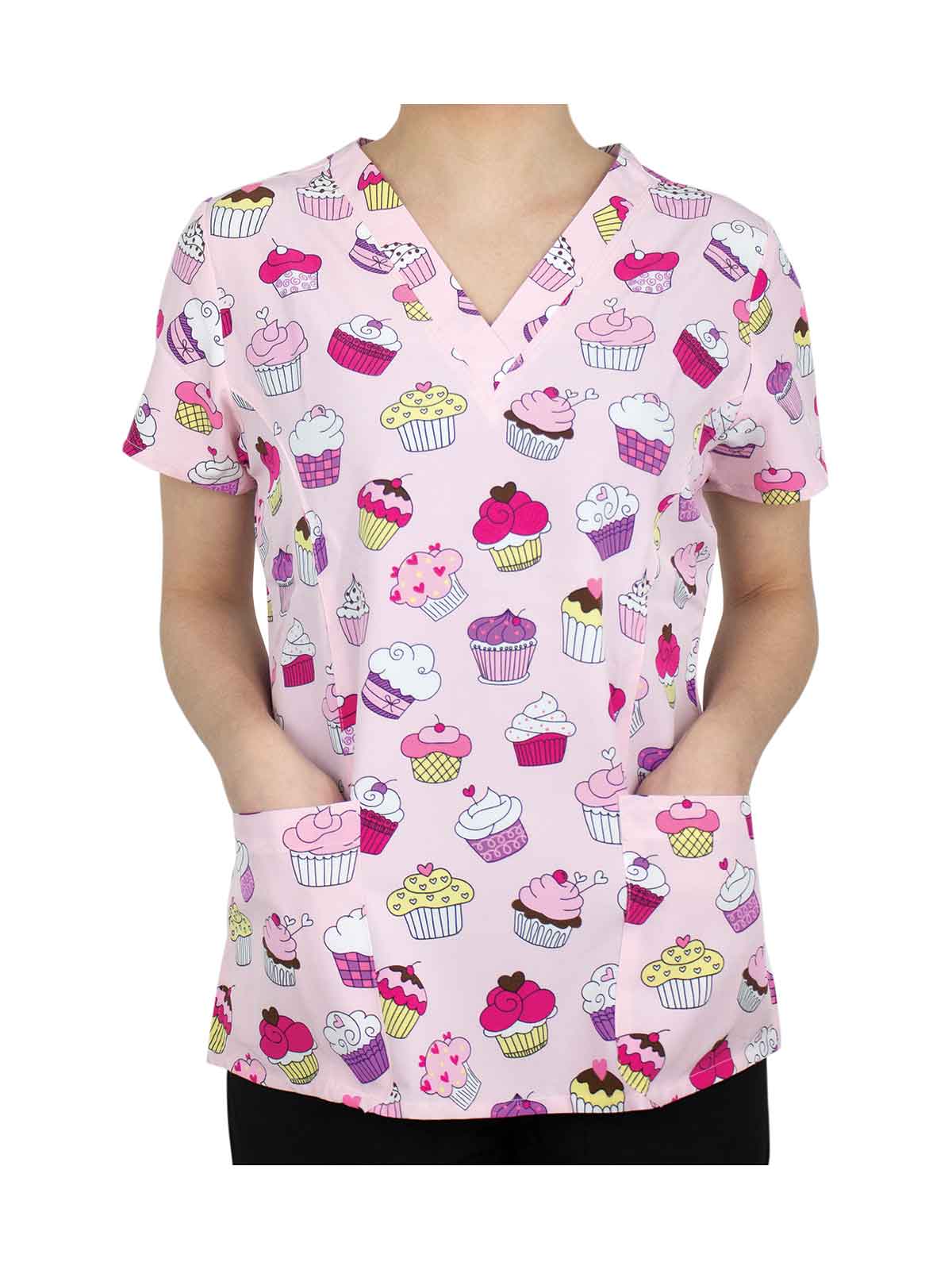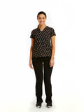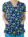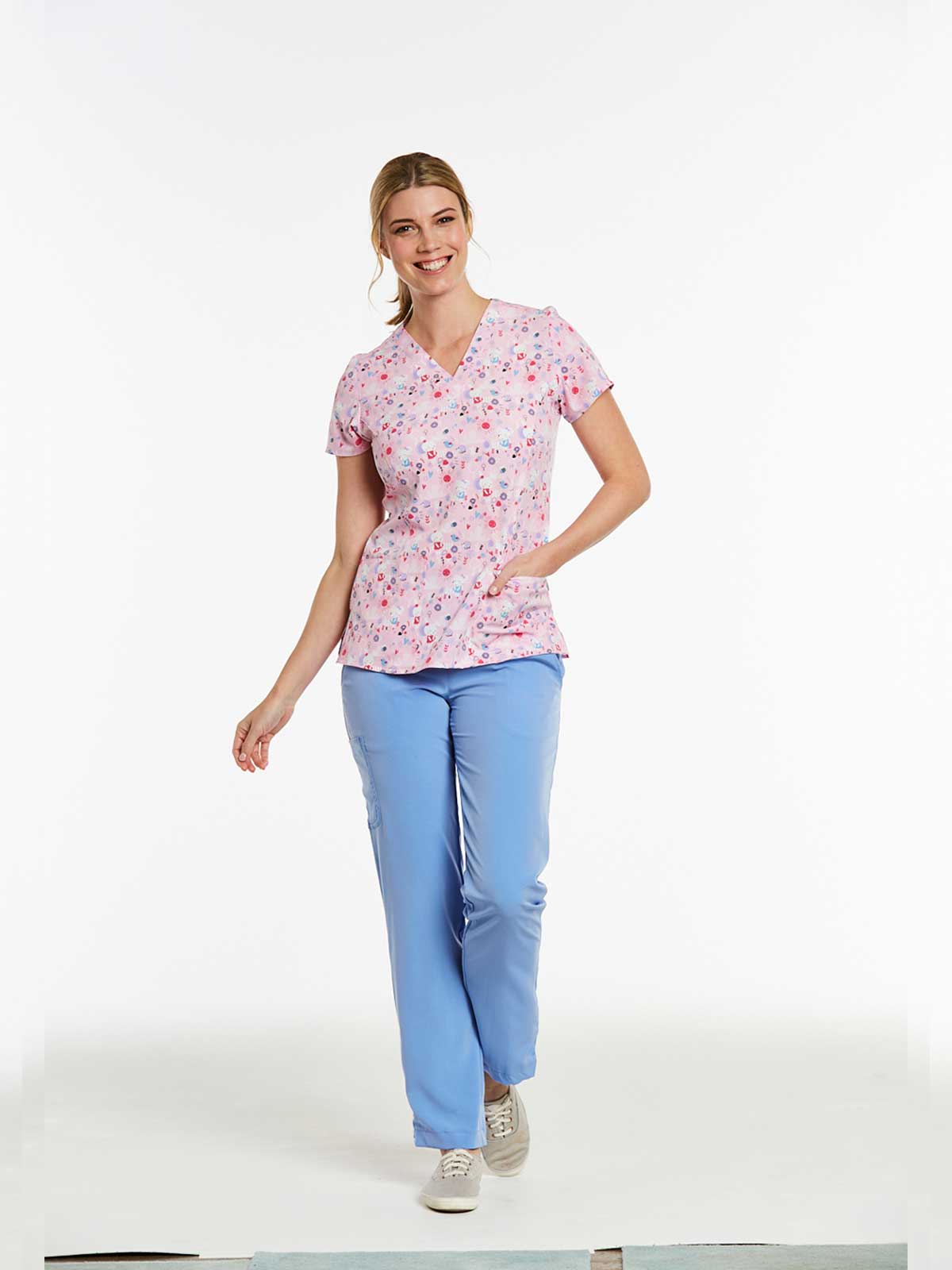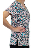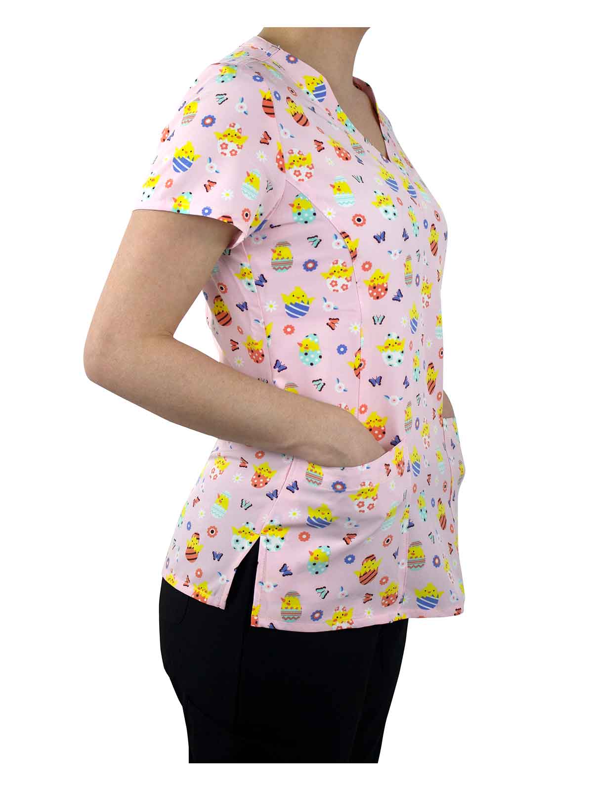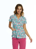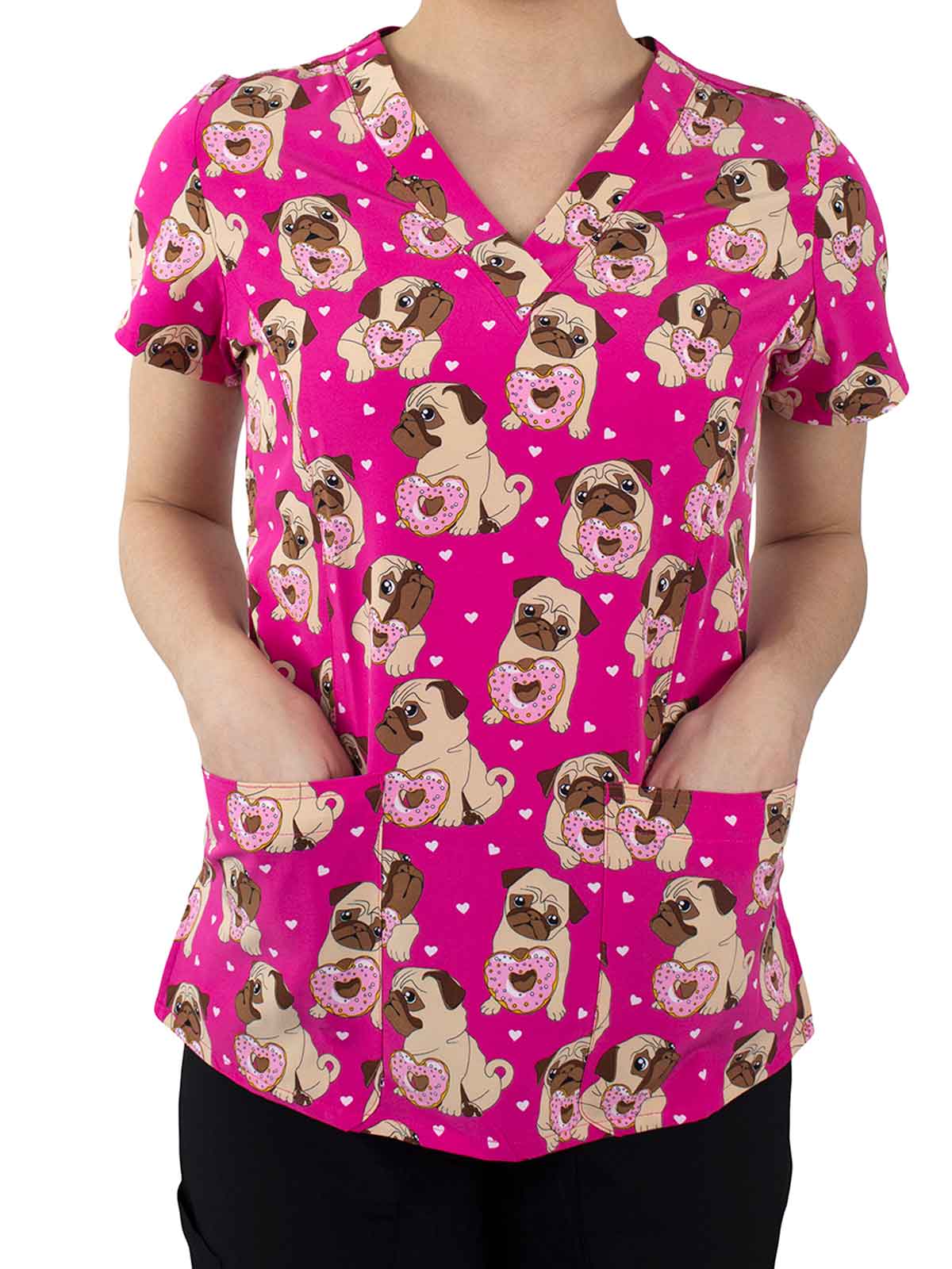 "*Printed curved v-neck top *Front princess seams and back darts for added style and shape *Two slant patch pockets with inner cell pocket *Solid contrast at back facing *Side vents" Banded v-neckline Short sleeves Front princess seaming Back shaping darts...