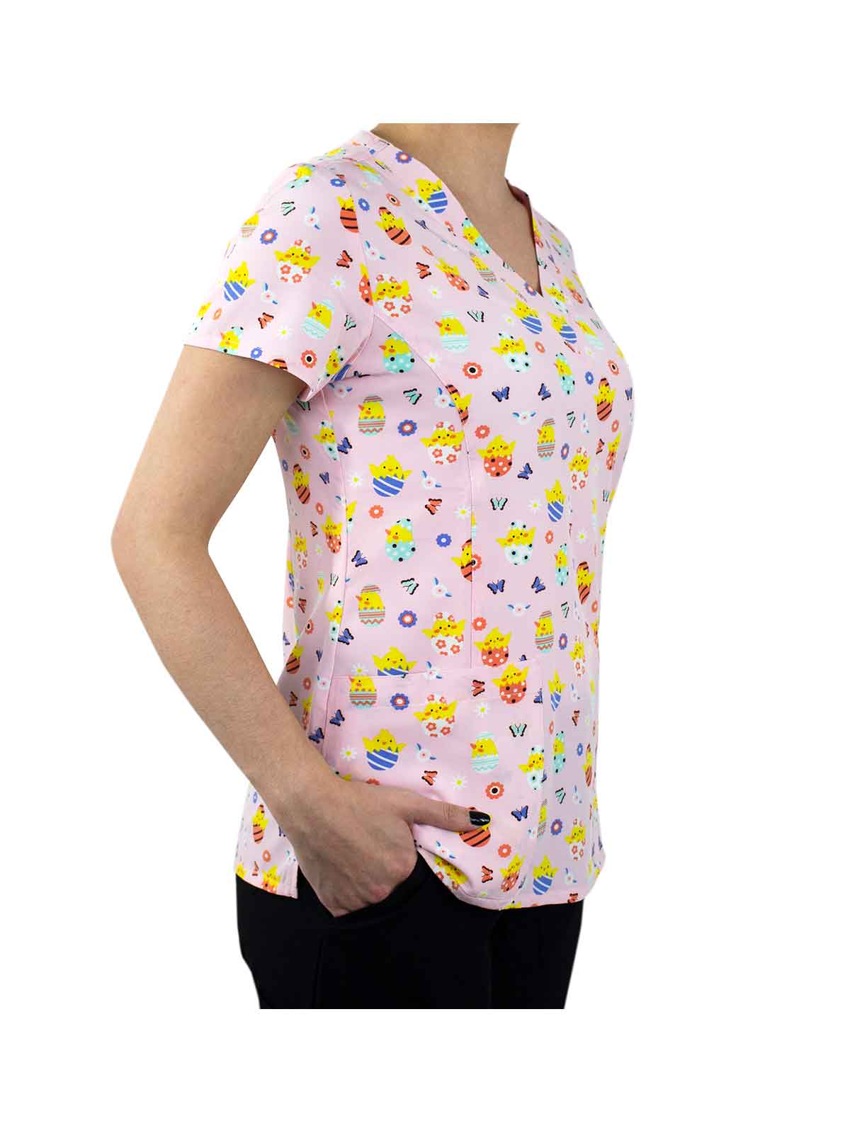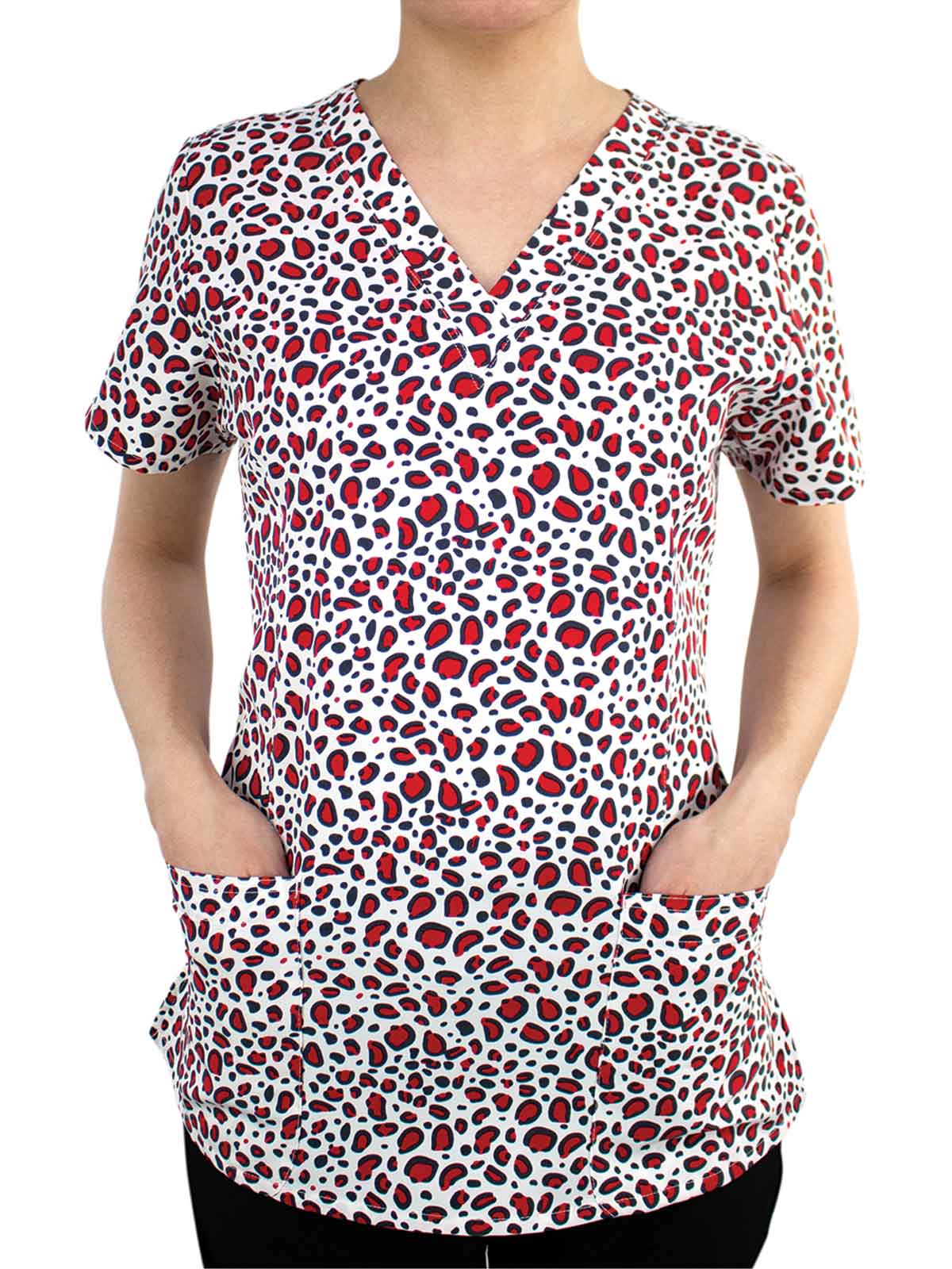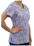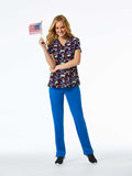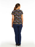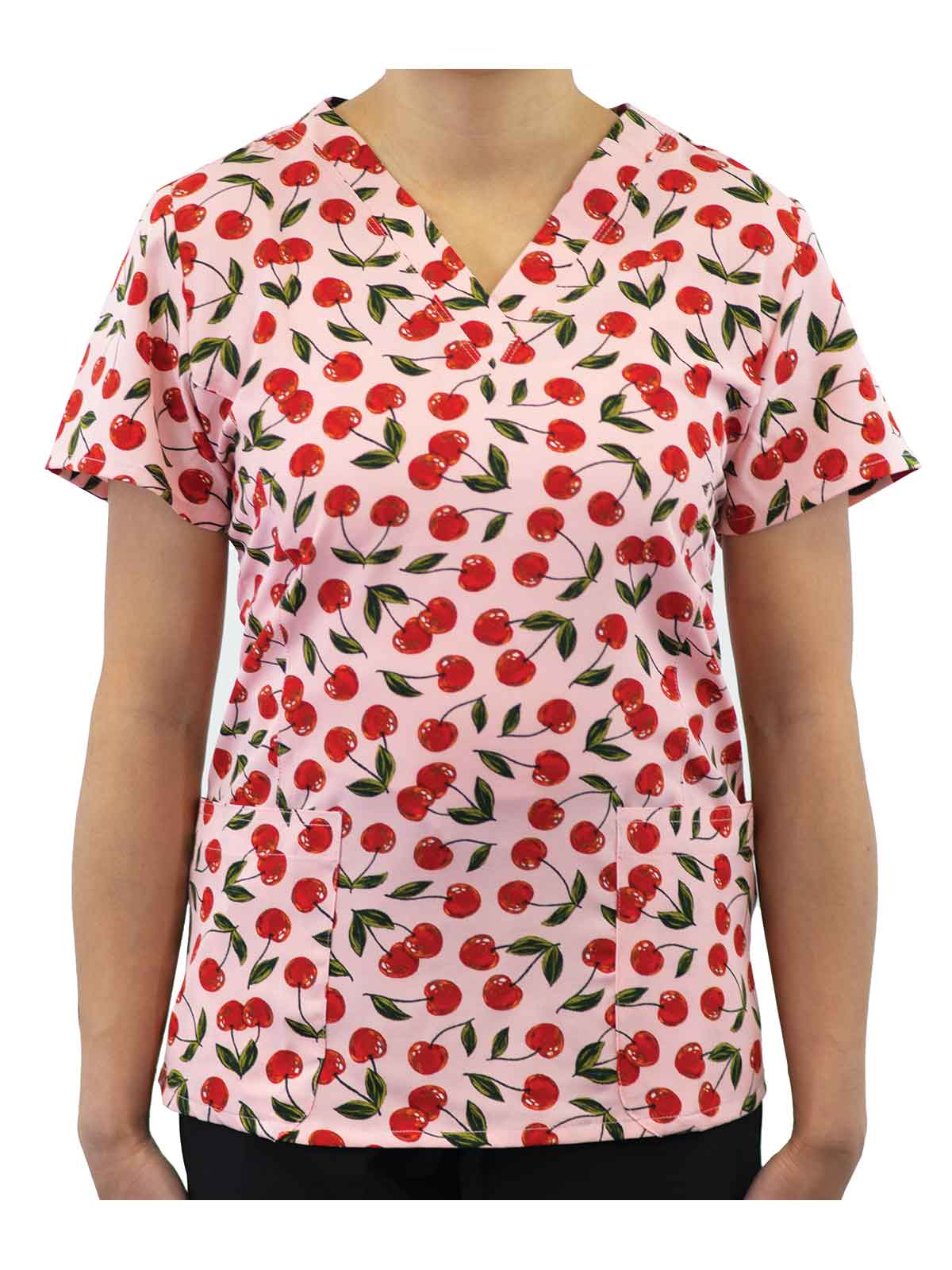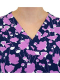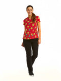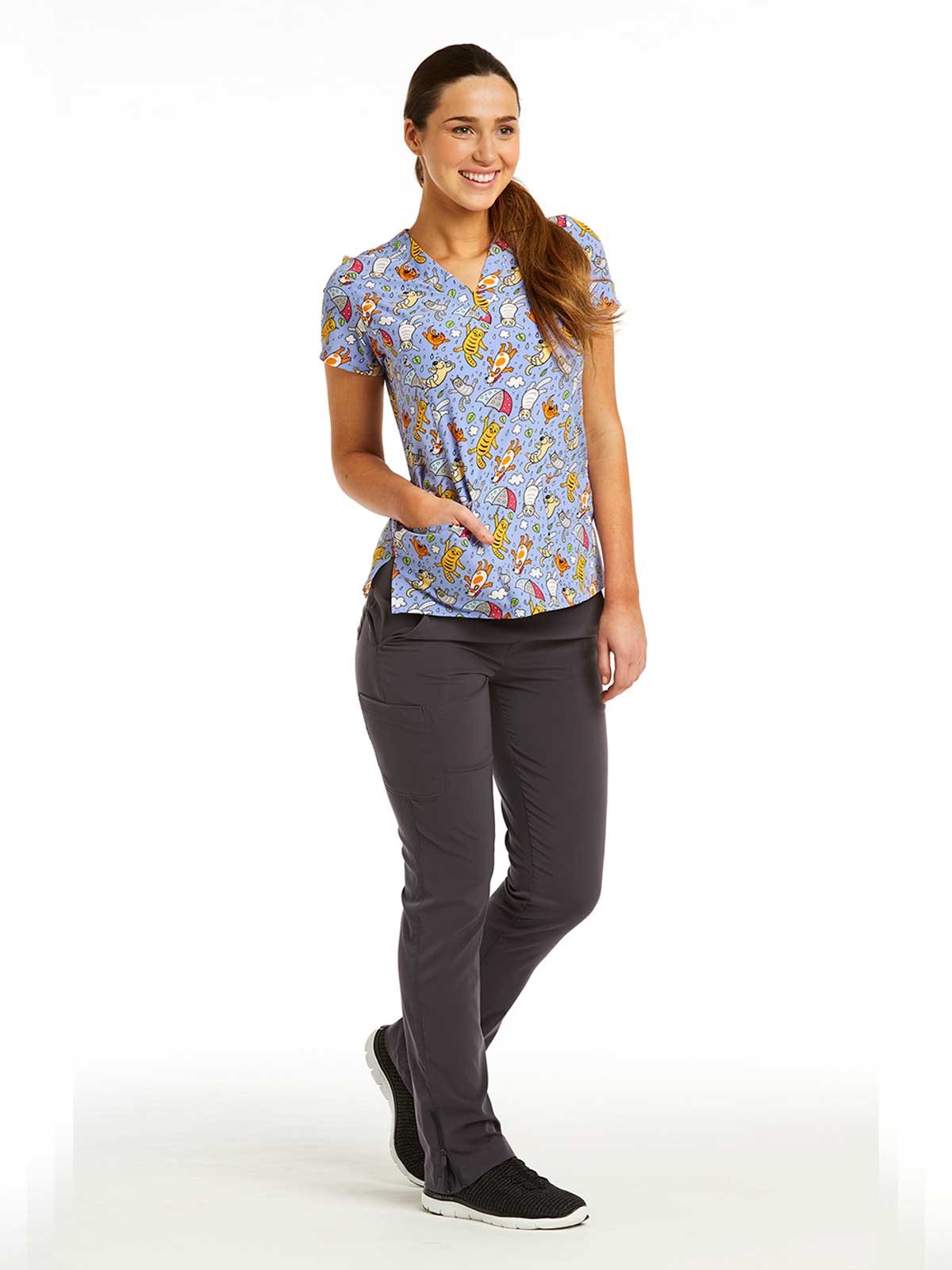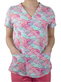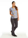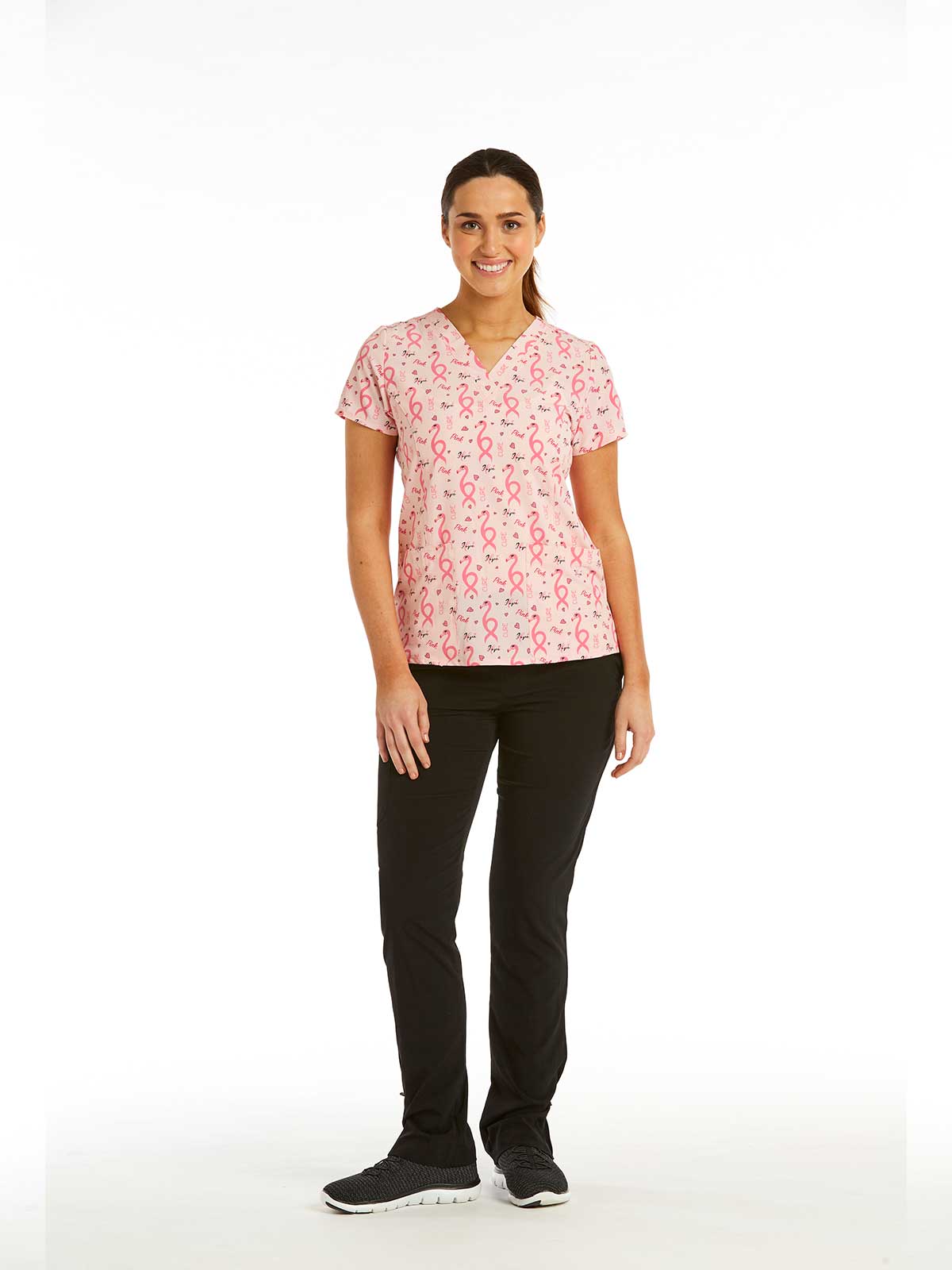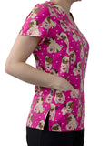 "*Printed curved v-neck top *Front princess seams and back darts for added style and shape *Two slant patch pockets with inner cell pocket *Solid contrast at back facing *Side vents" Banded v-neckline Short sleeves Front princess seaming Back shaping darts...
