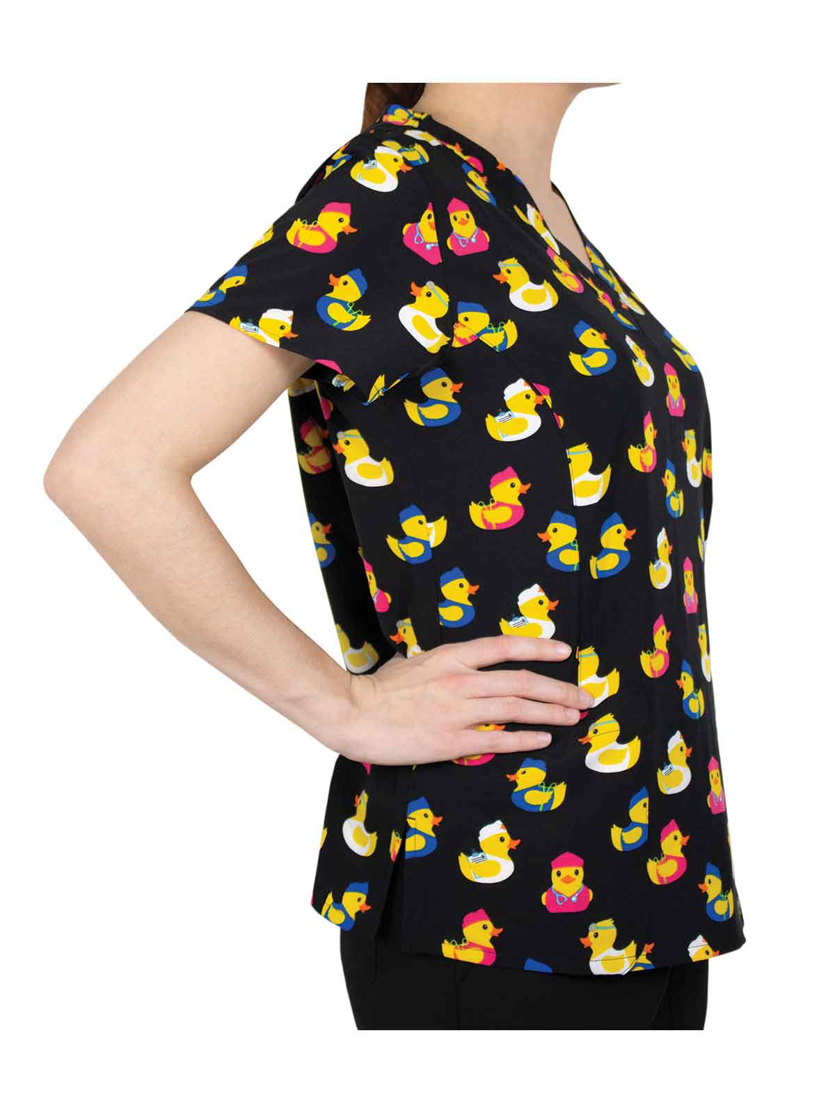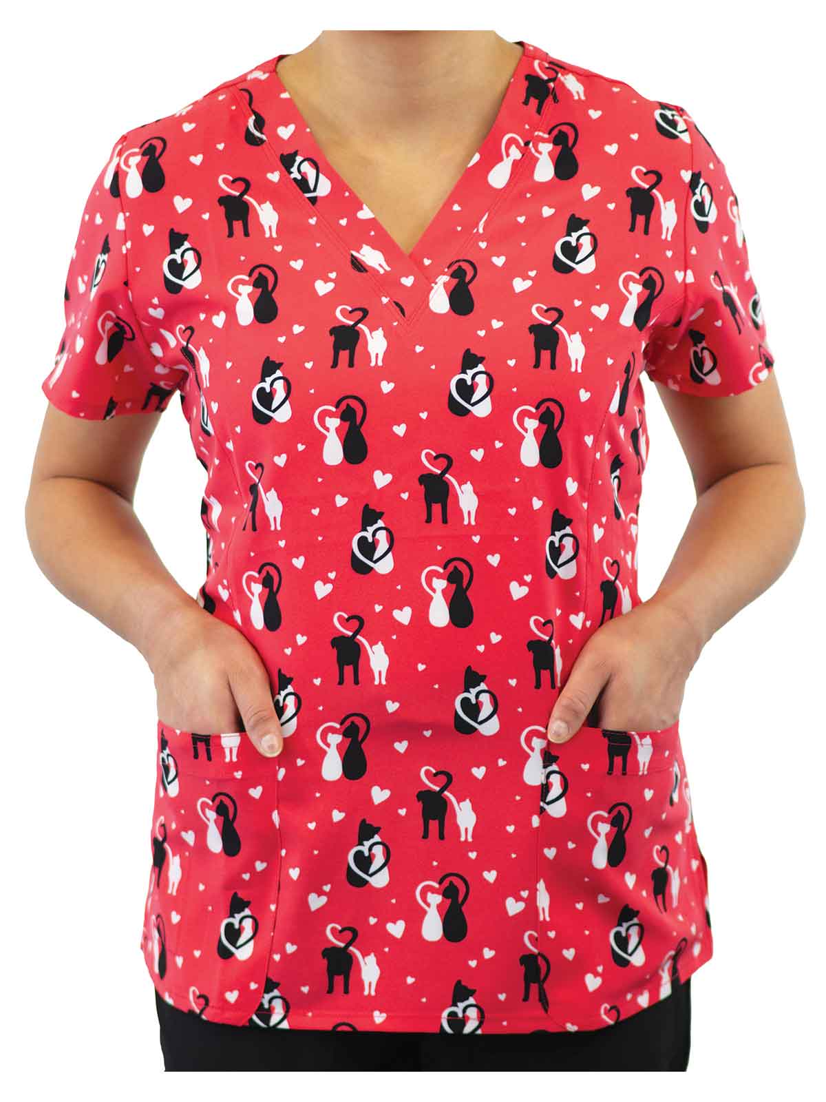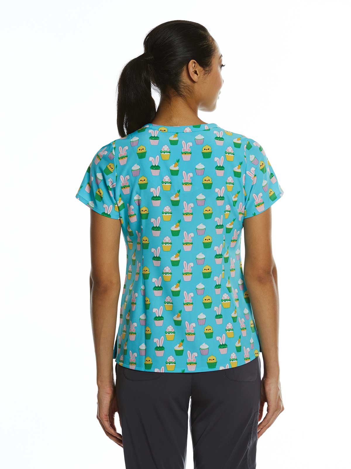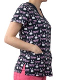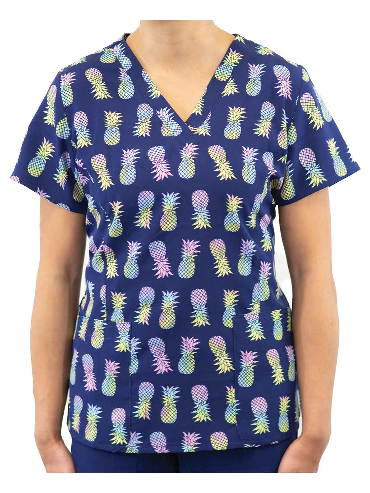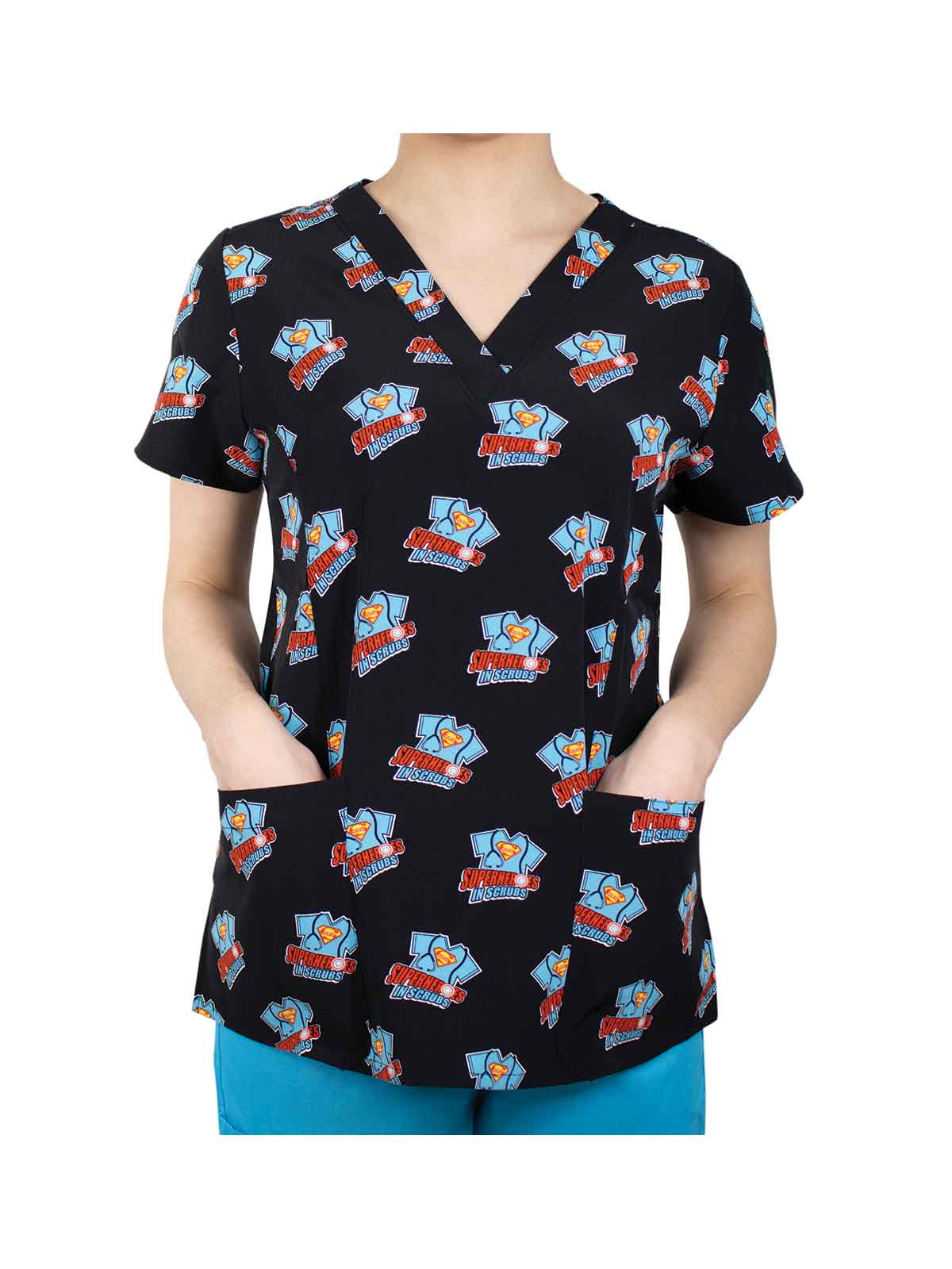 "*Printed curved v-neck top *Front princess seams and back darts for added style and shape *Two slant patch pockets with inner cell pocket *Solid contrast at back facing *Side vents" Banded v-neckline Short sleeves Front princess seaming Back shaping darts...