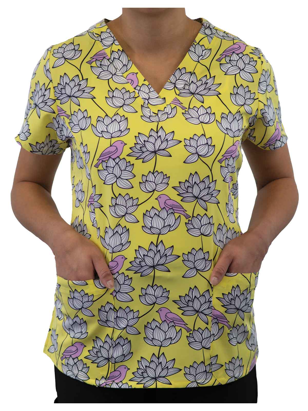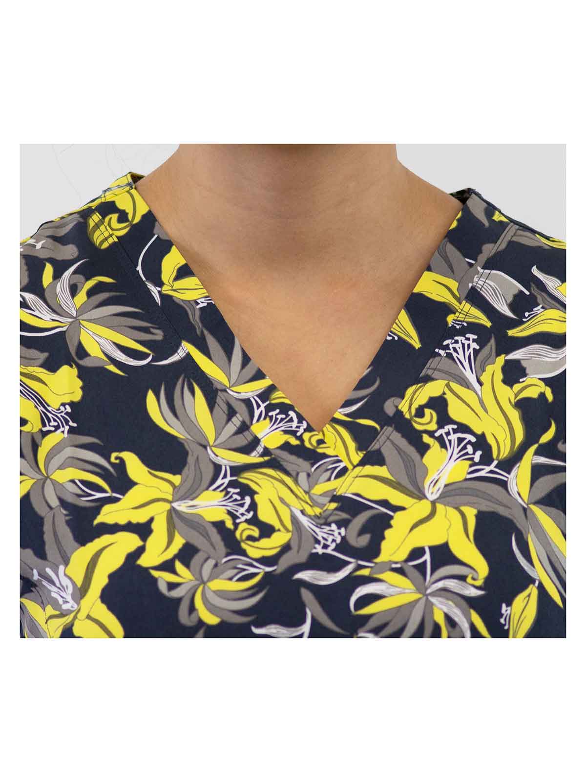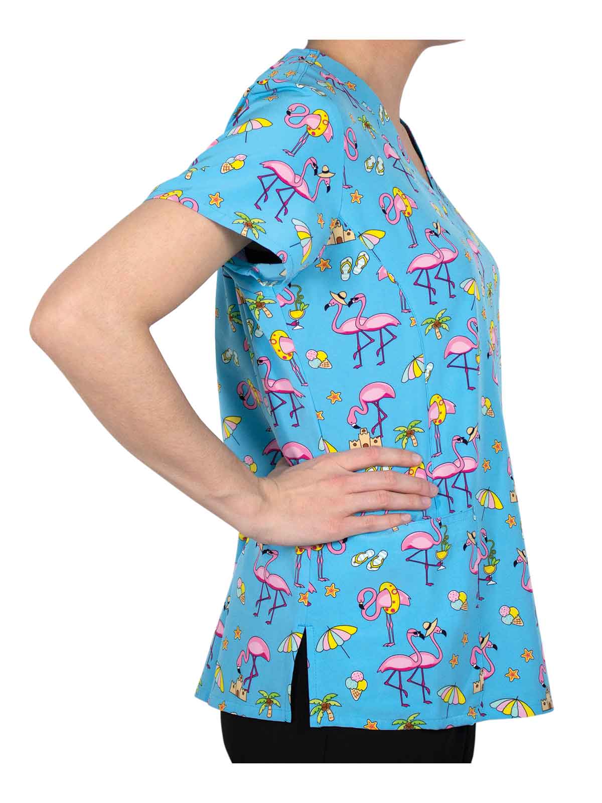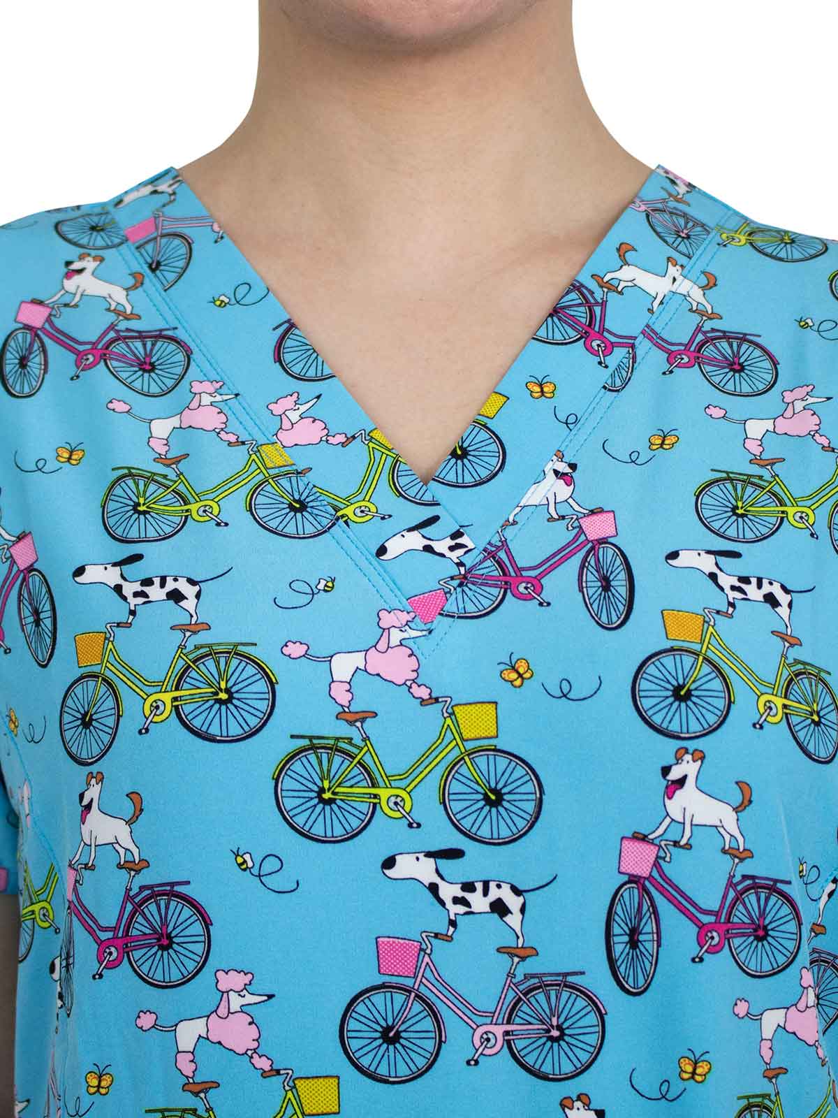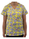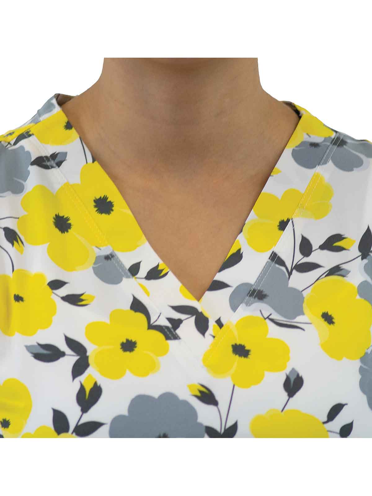 "*Printed curved v-neck top *Front princess seams and back darts for added style and shape *Two slant patch pockets with inner cell pocket *Solid contrast at back facing *Side vents" Banded v-neckline Short sleeves Front princess seaming Back shaping darts...