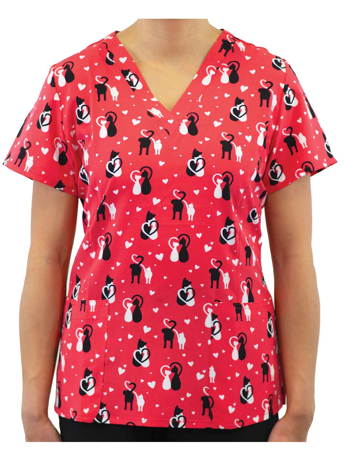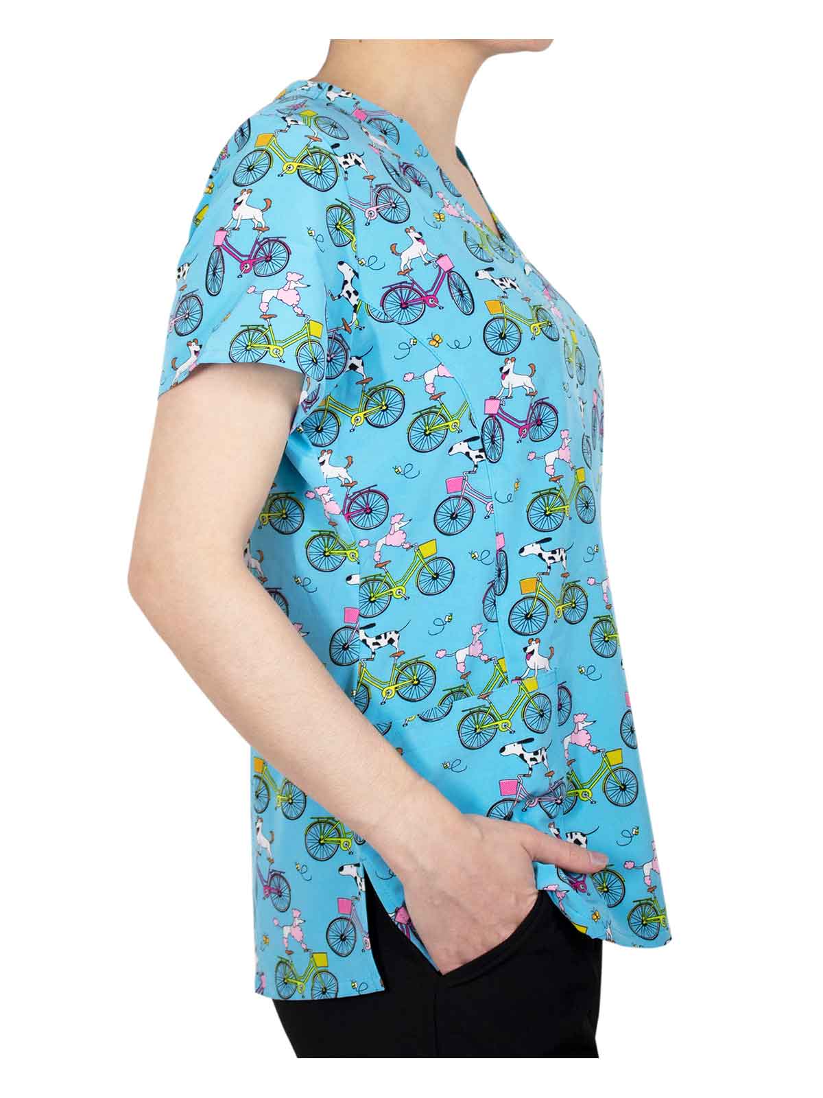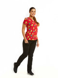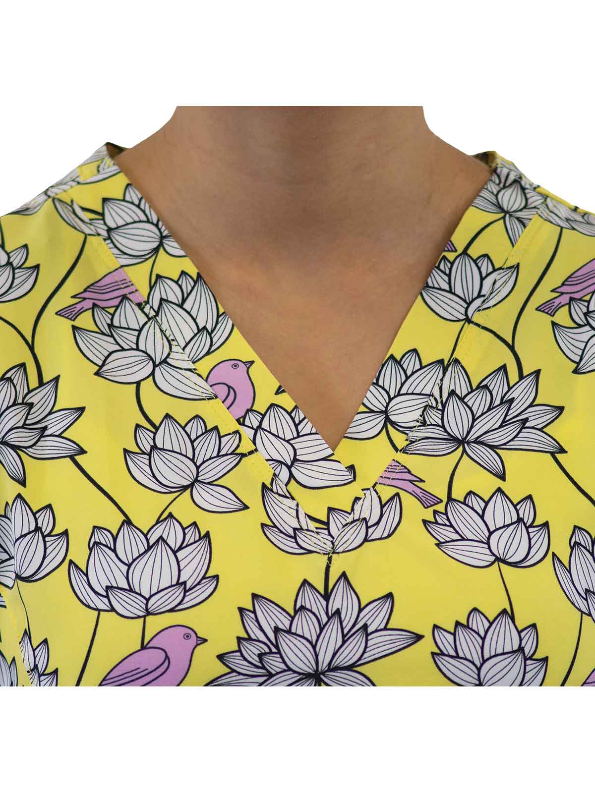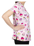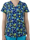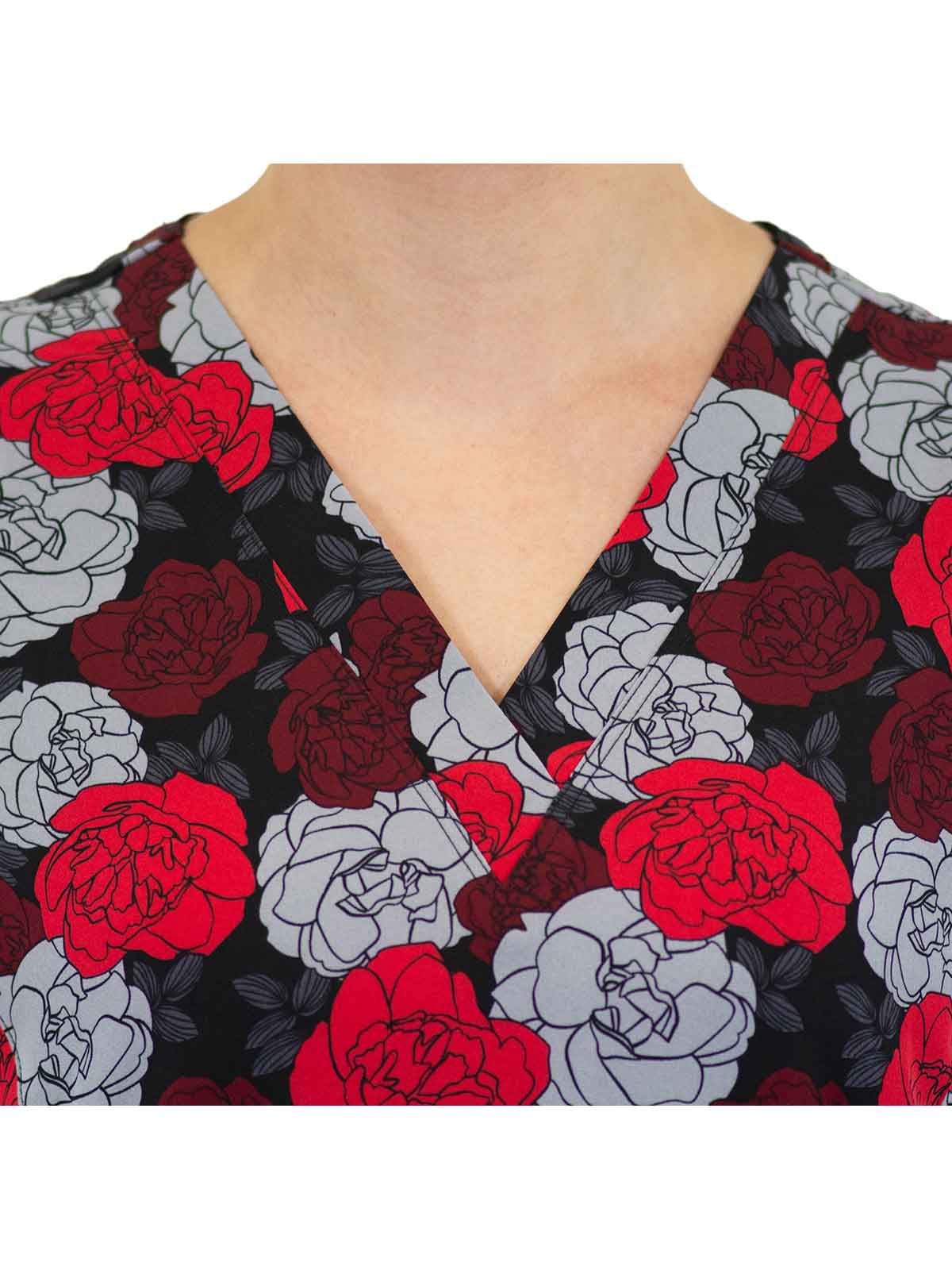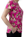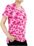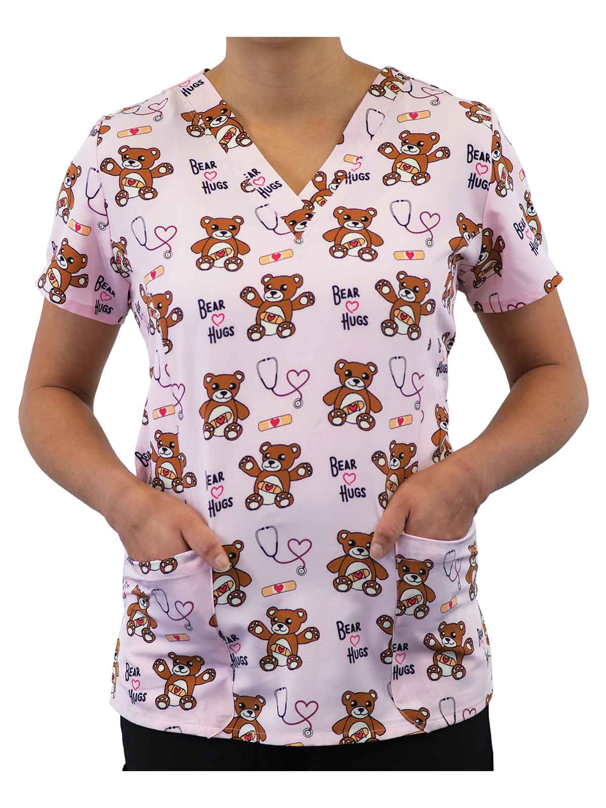 "*Printed curved v-neck top *Front princess seams and back darts for added style and shape *Two slant patch pockets with inner cell pocket *Solid contrast at back facing *Side vents" Banded v-neckline Short sleeves Front princess seaming Back shaping darts...