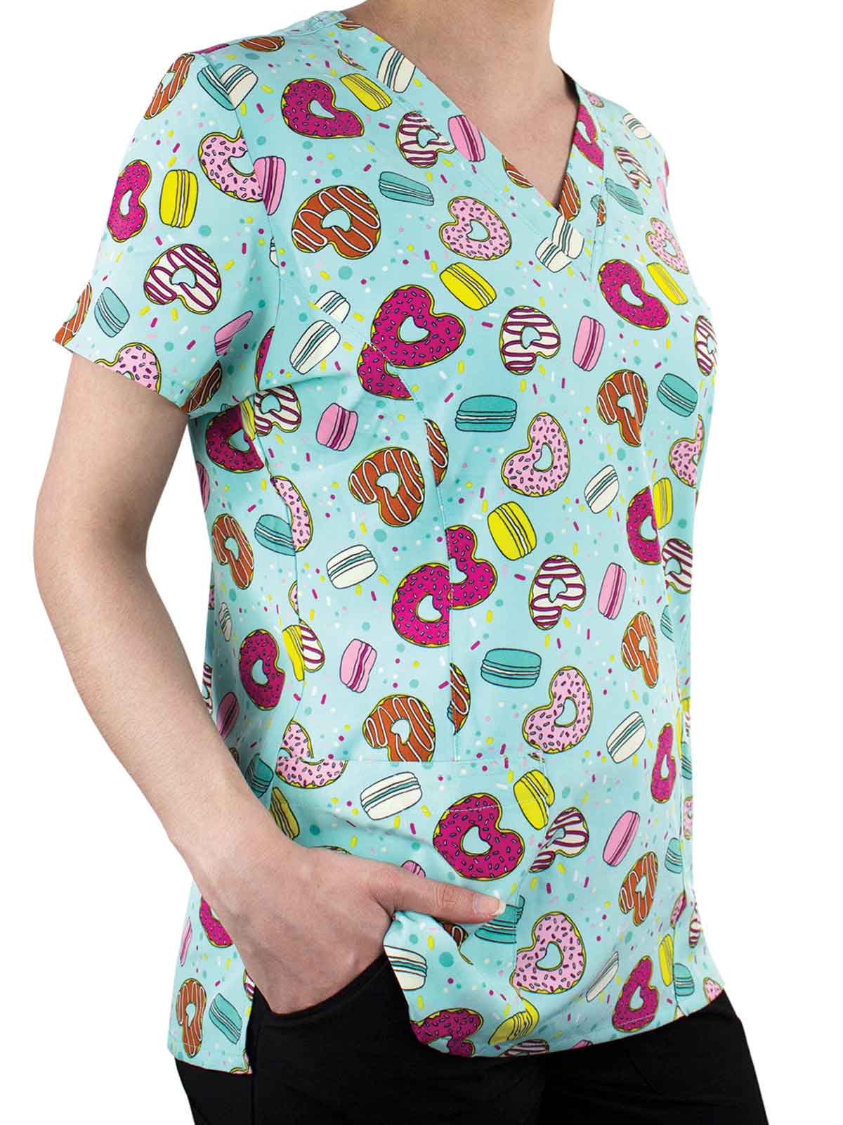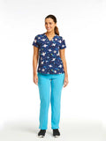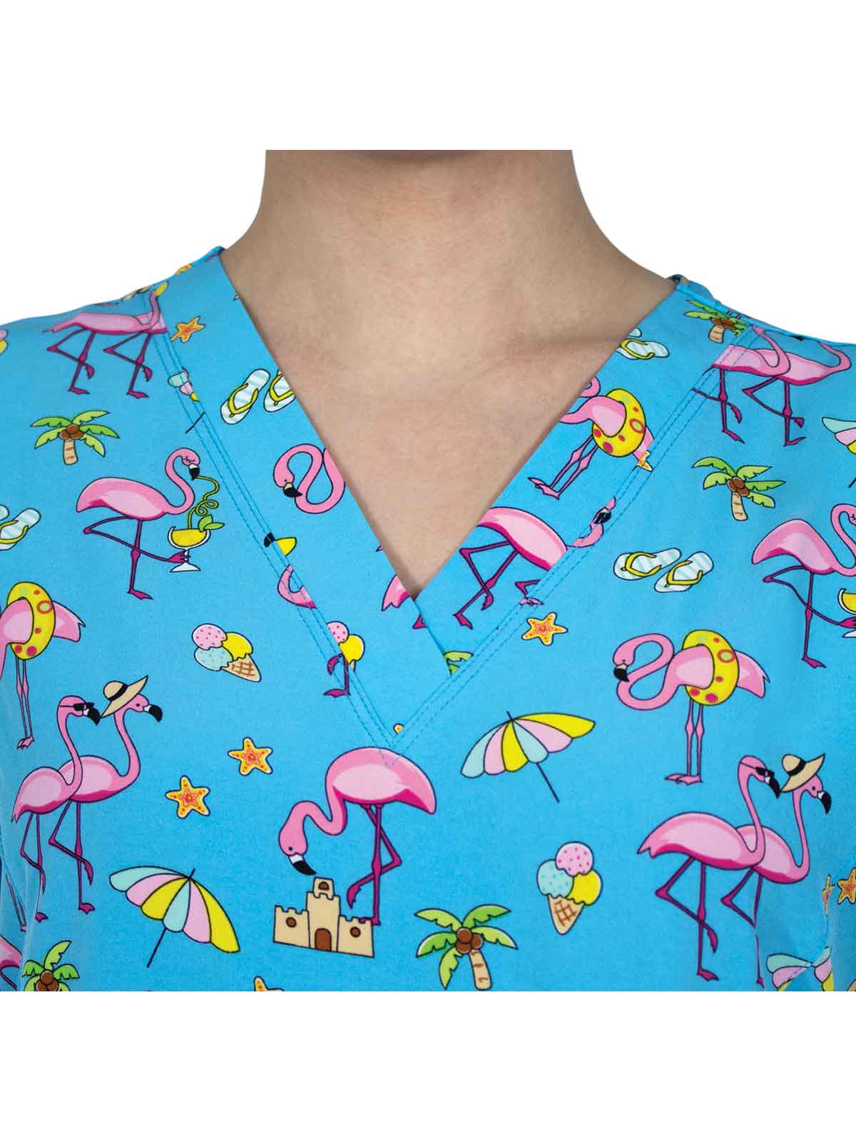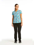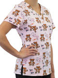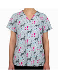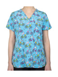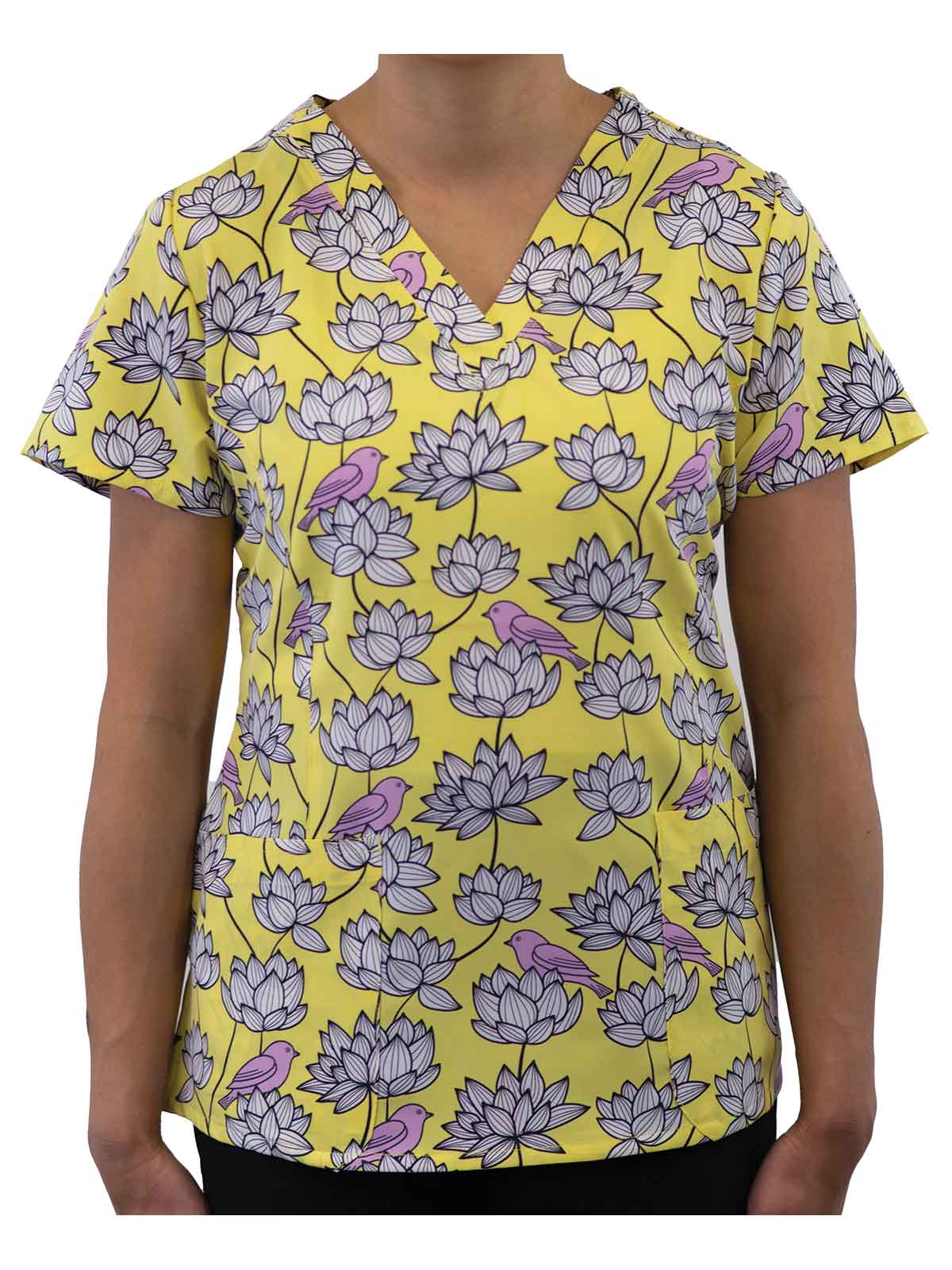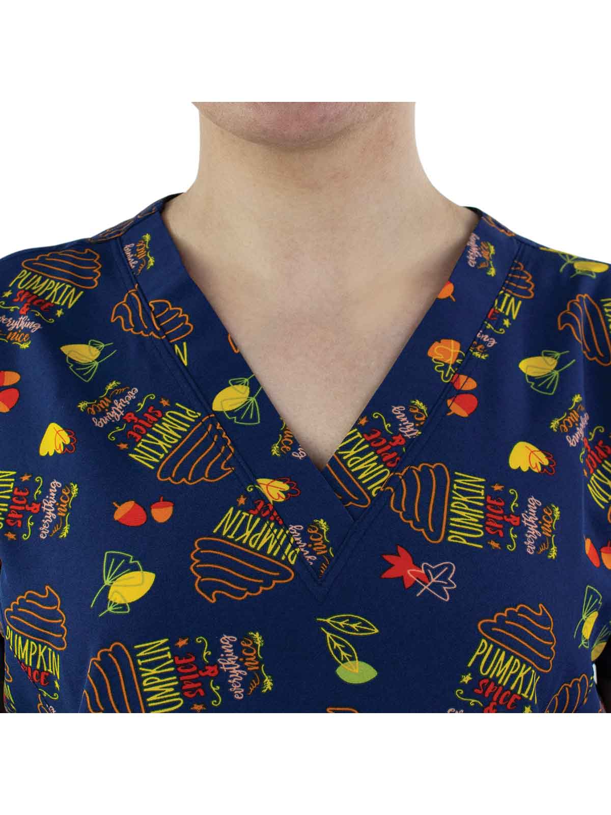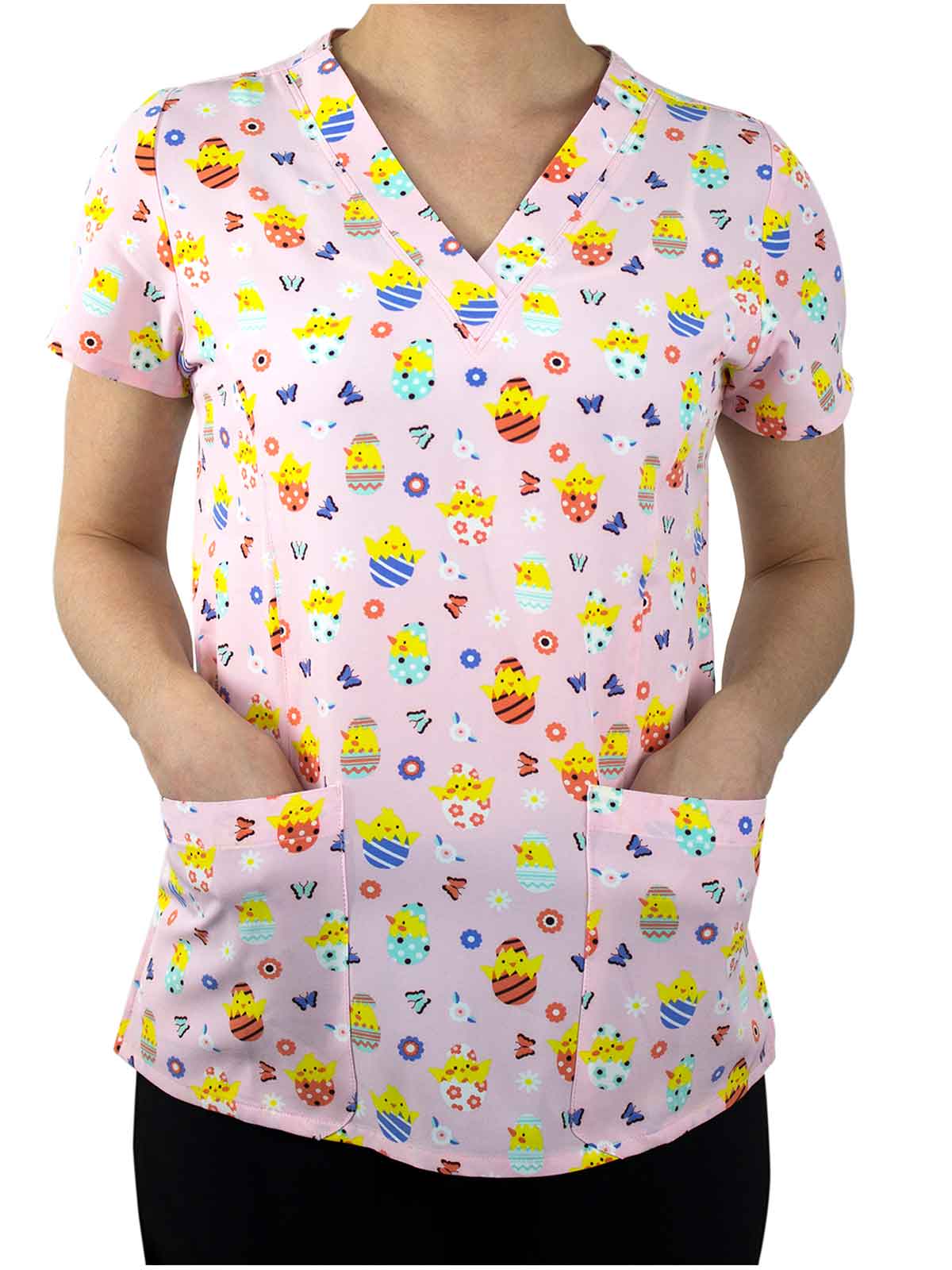 "*Printed curved v-neck top *Front princess seams and back darts for added style and shape *Two slant patch pockets with inner cell pocket *Solid contrast at back facing *Side vents" Banded v-neckline Short sleeves Front princess seaming Back shaping darts...