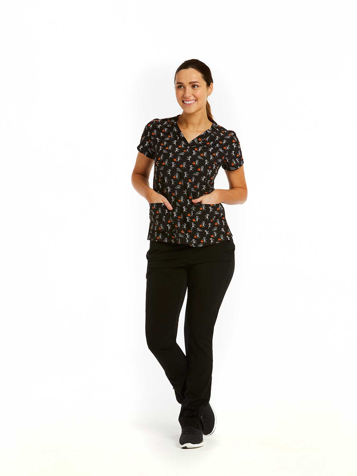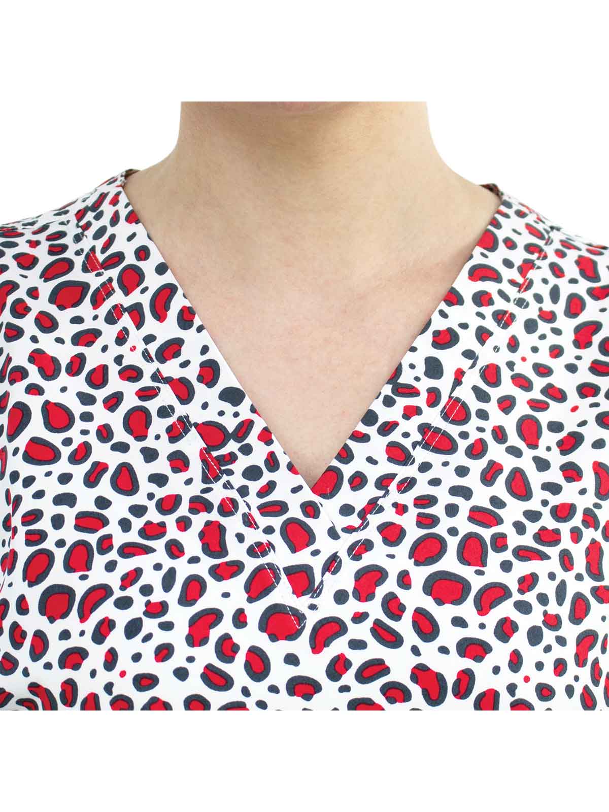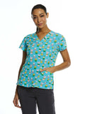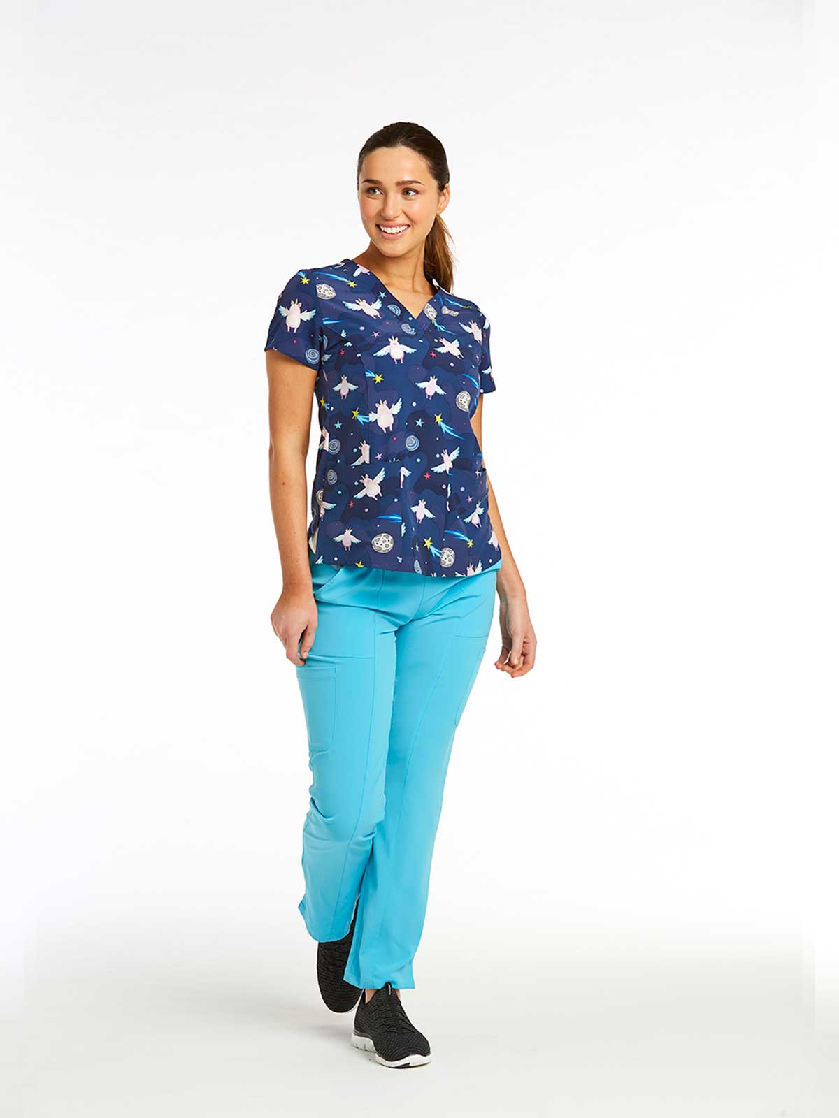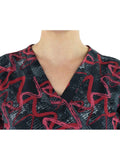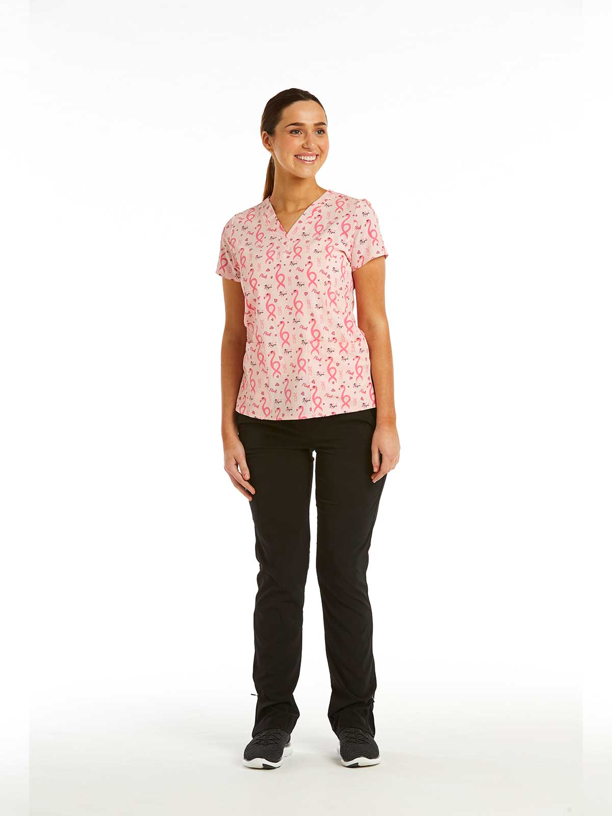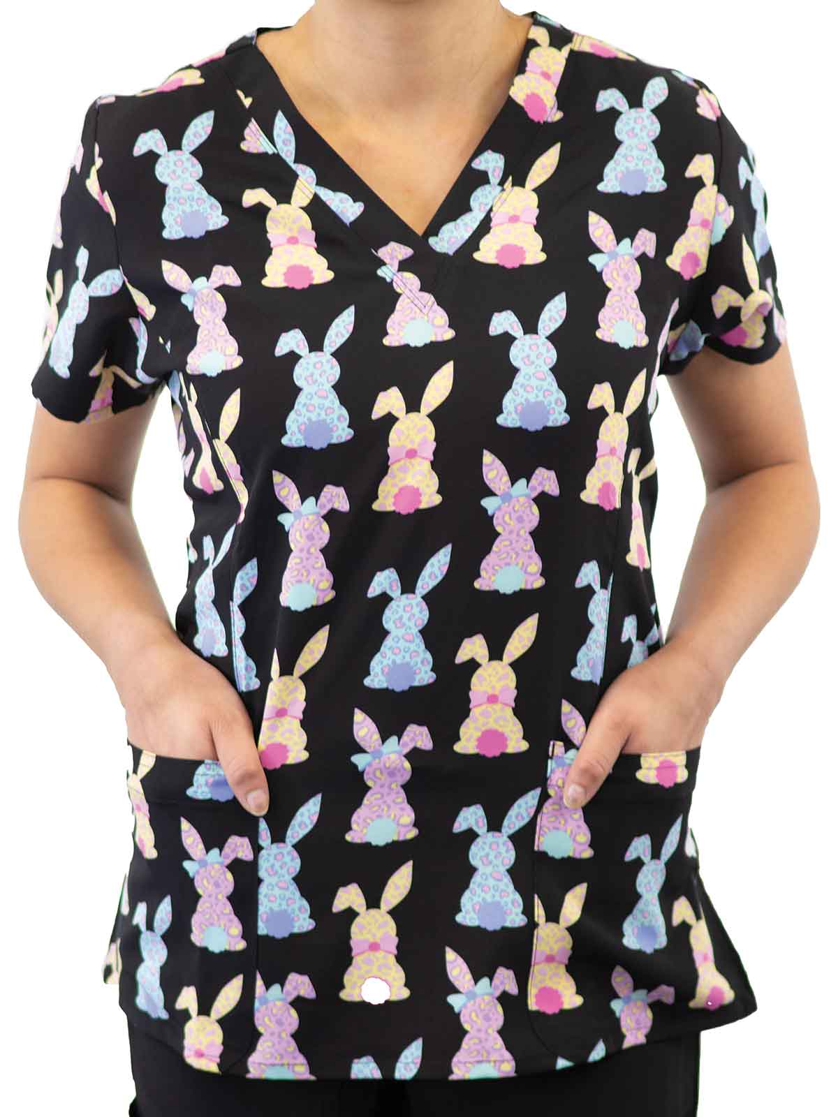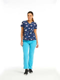 "*Printed curved v-neck top *Front princess seams and back darts for added style and shape *Two slant patch pockets with inner cell pocket *Solid contrast at back facing *Side vents" Banded v-neckline Short sleeves Front princess seaming Back shaping darts...