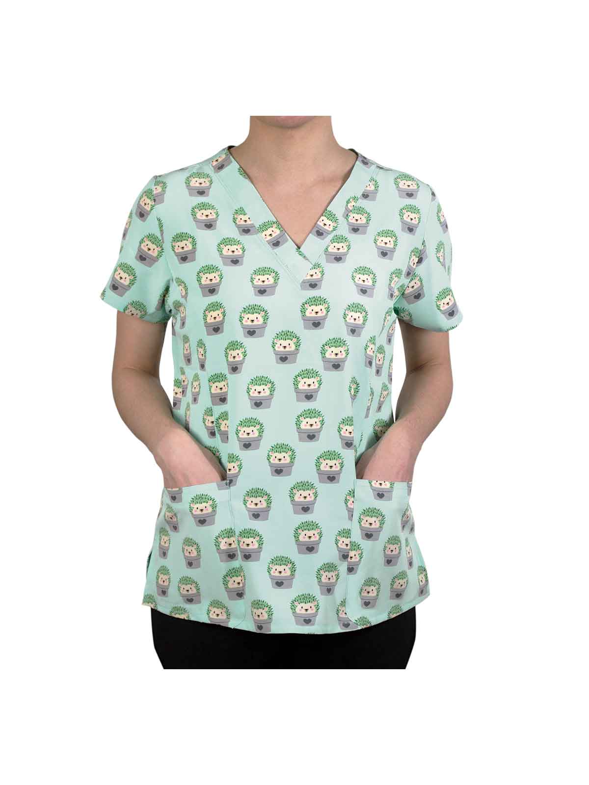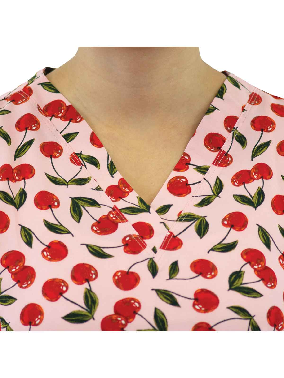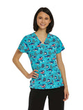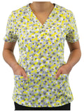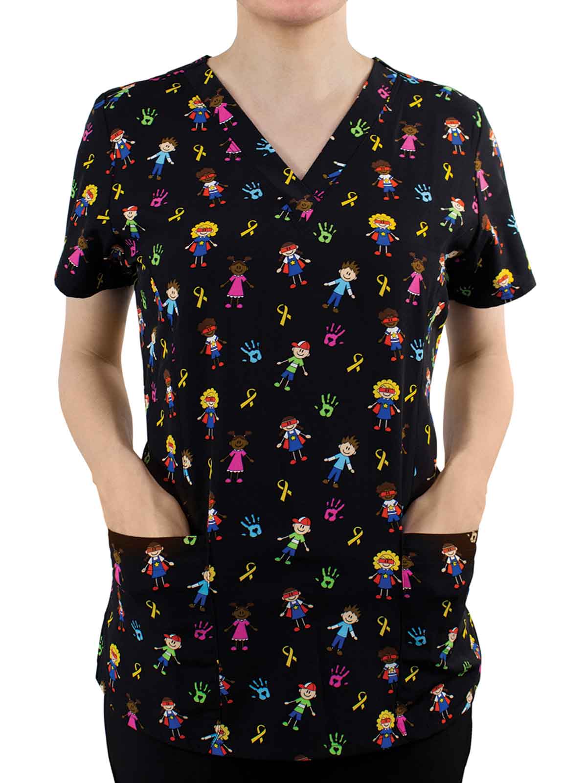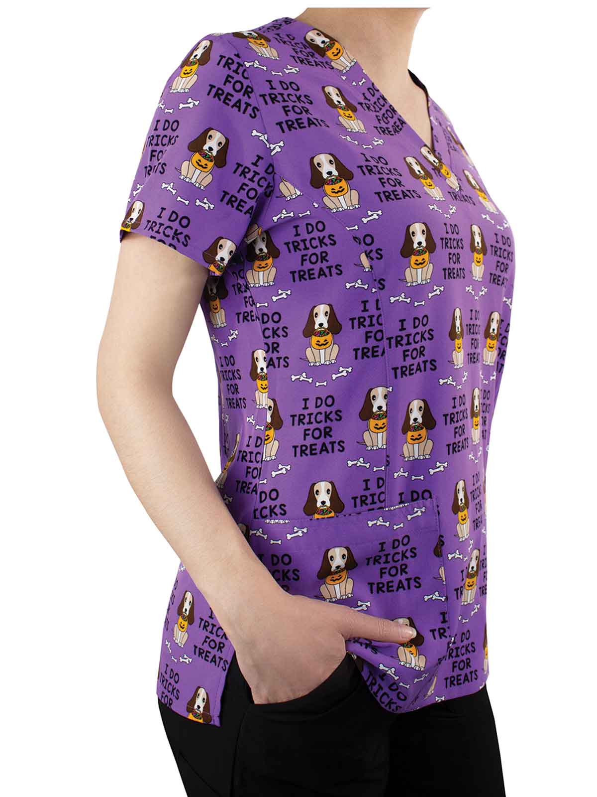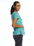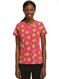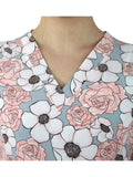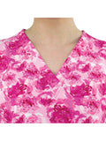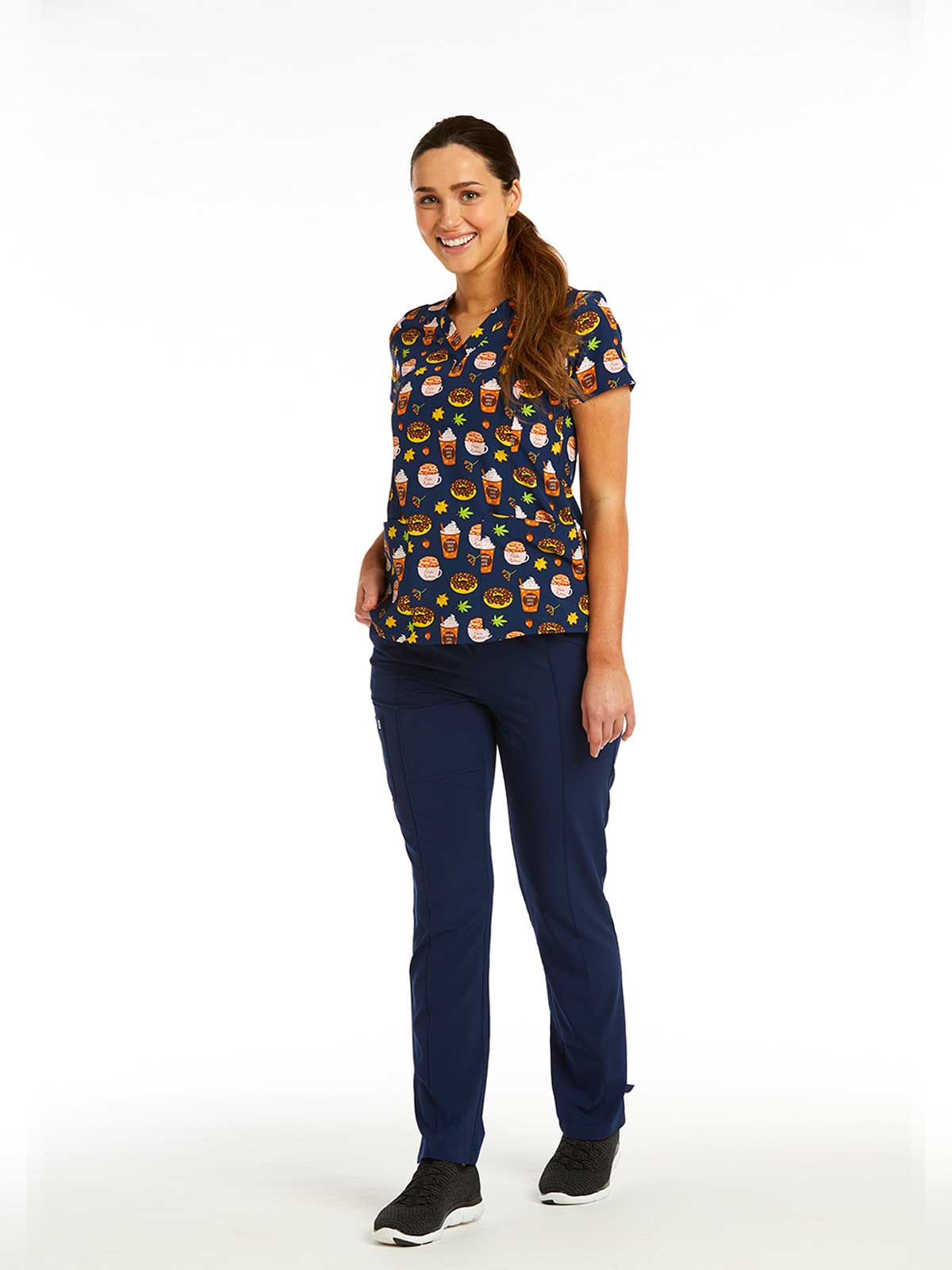 "*Printed curved v-neck top *Front princess seams and back darts for added style and shape *Two slant patch pockets with inner cell pocket *Solid contrast at back facing *Side vents" Banded v-neckline Short sleeves Front princess seaming Back shaping darts...