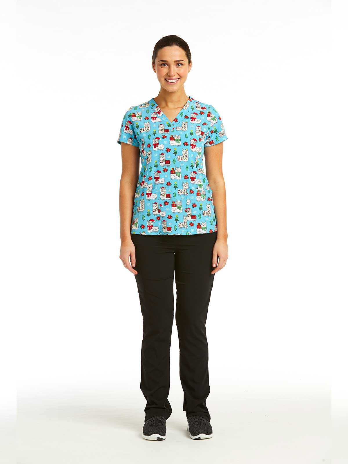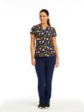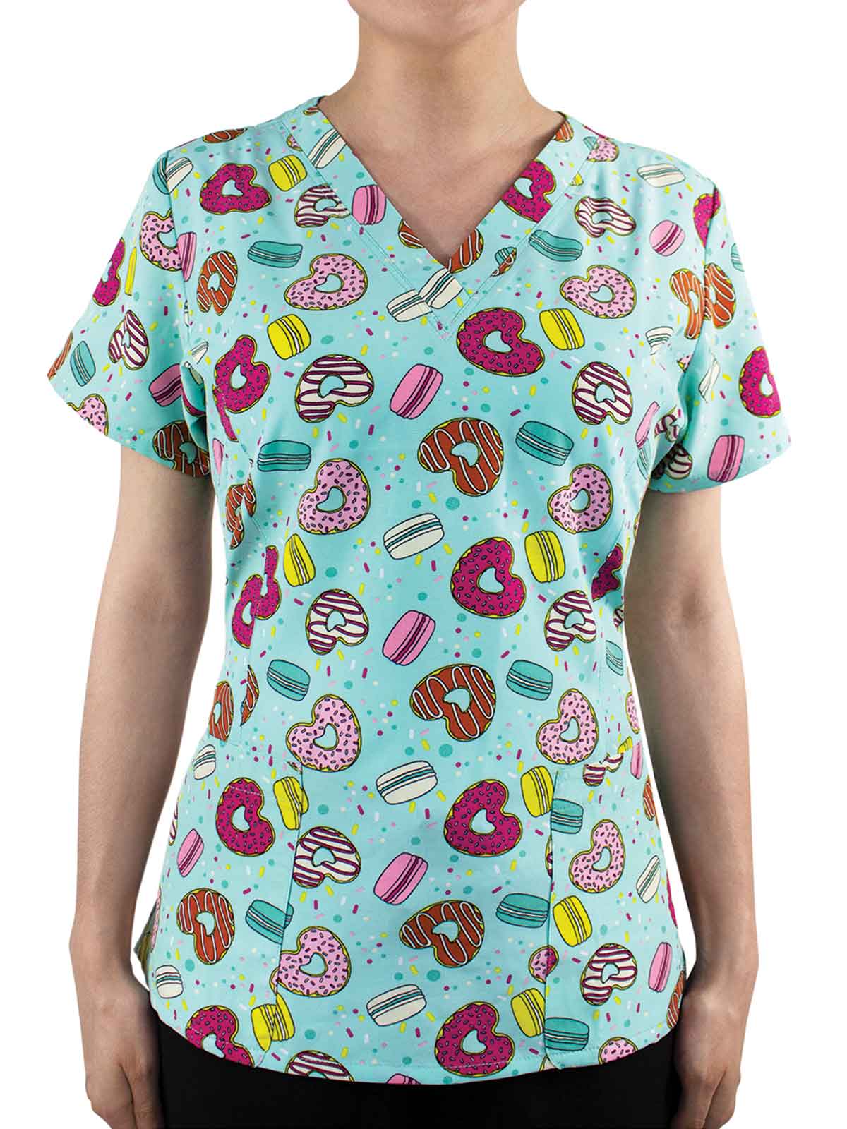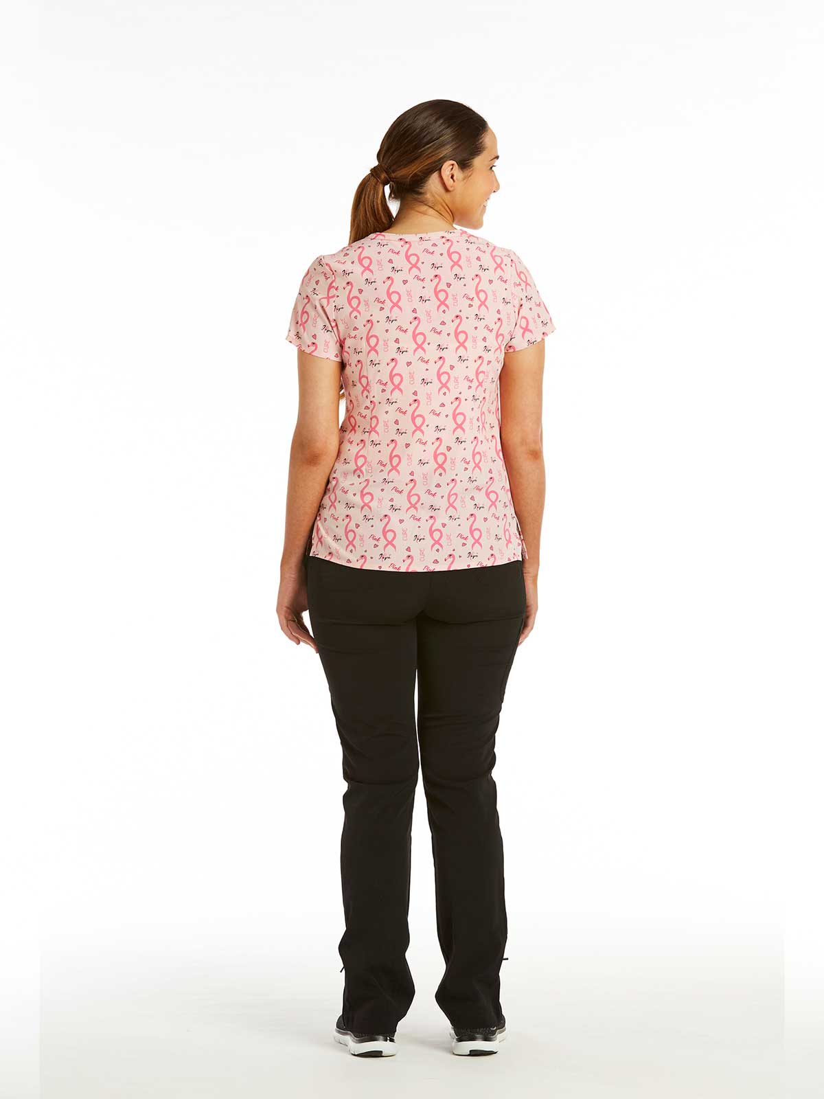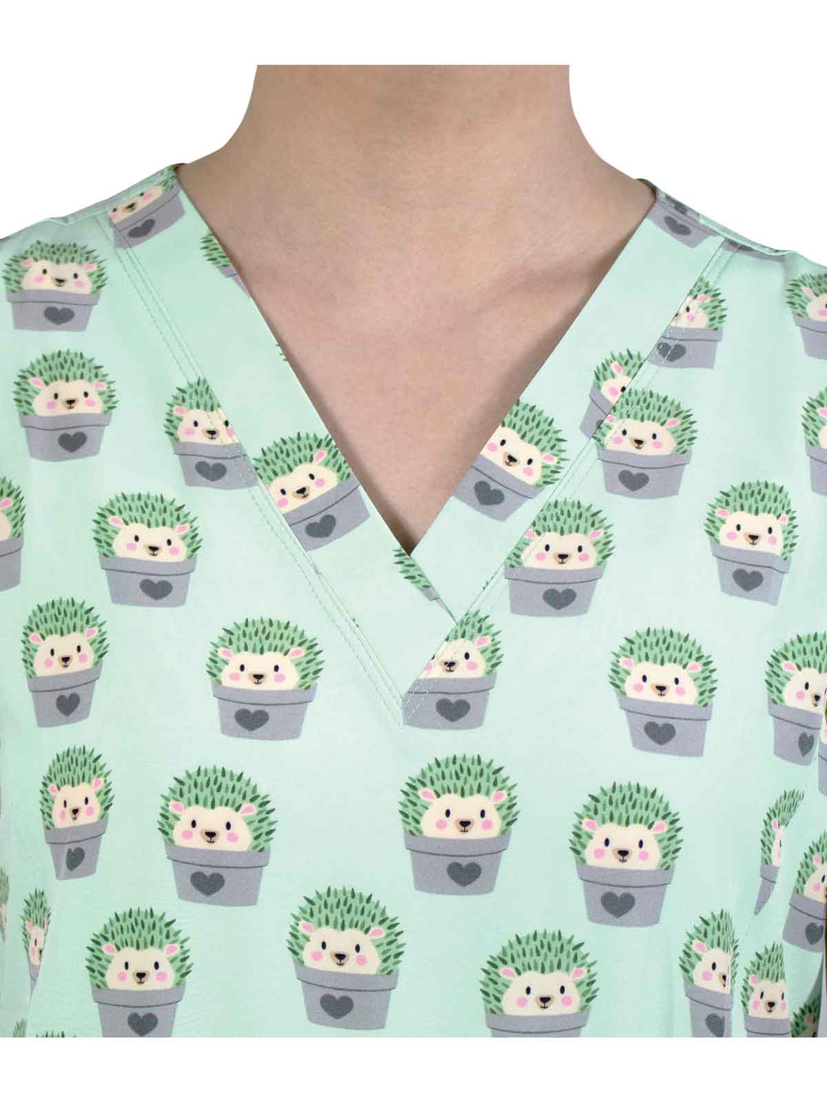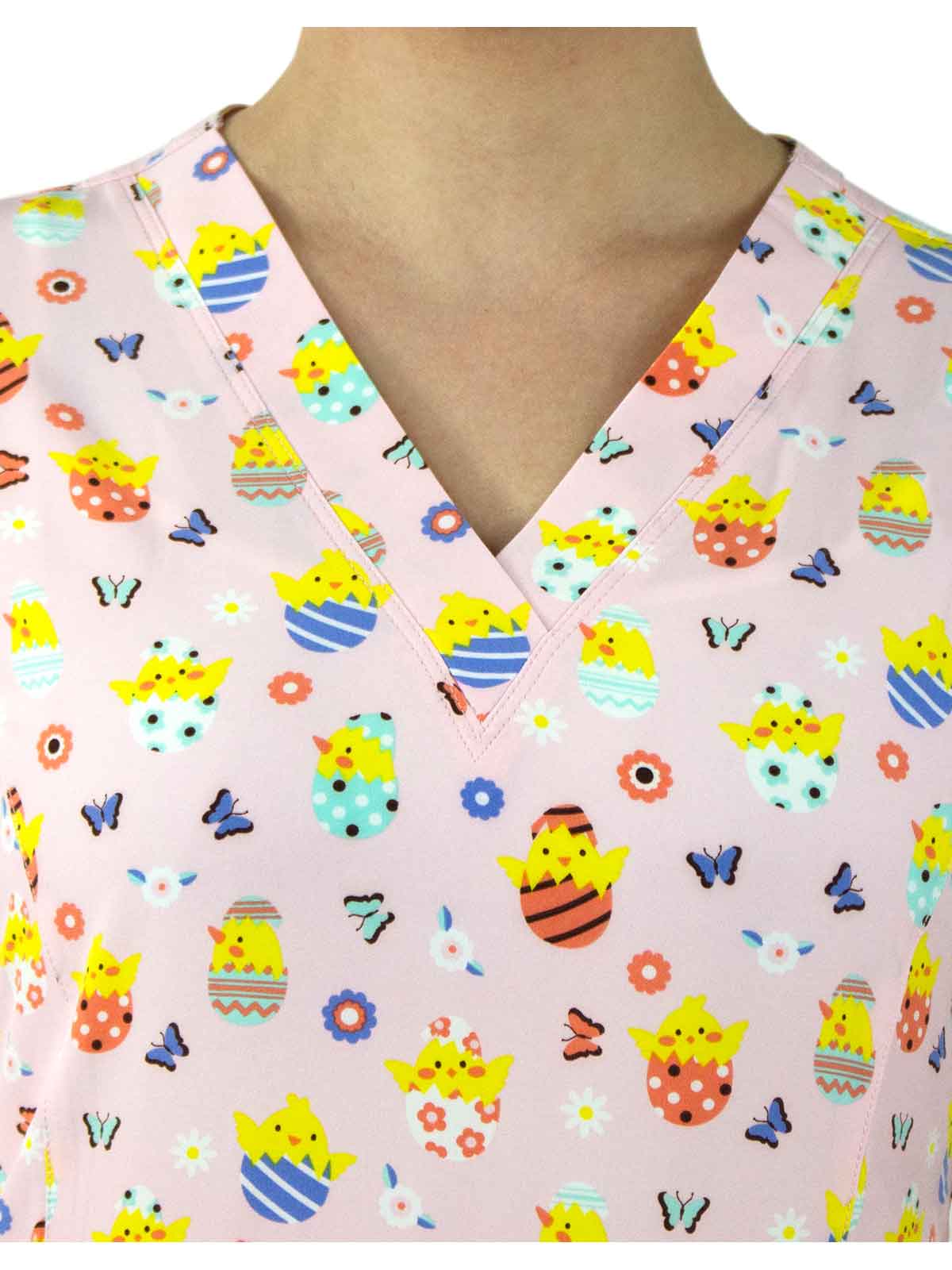"*Printed curved v-neck top *Front princess seams and back darts for added style and shape *Two slant patch pockets with inner cell pocket *Solid contrast at back facing *Side vents" Banded v-neckline Short sleeves Front princess seaming Back shaping darts...