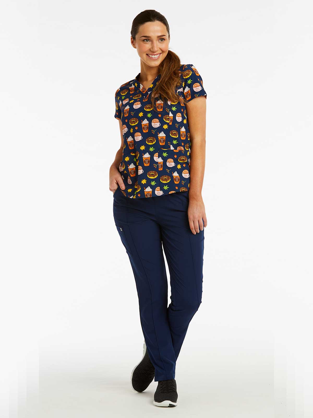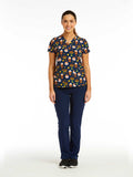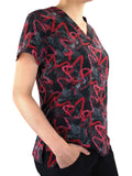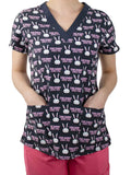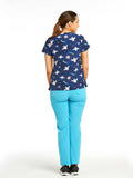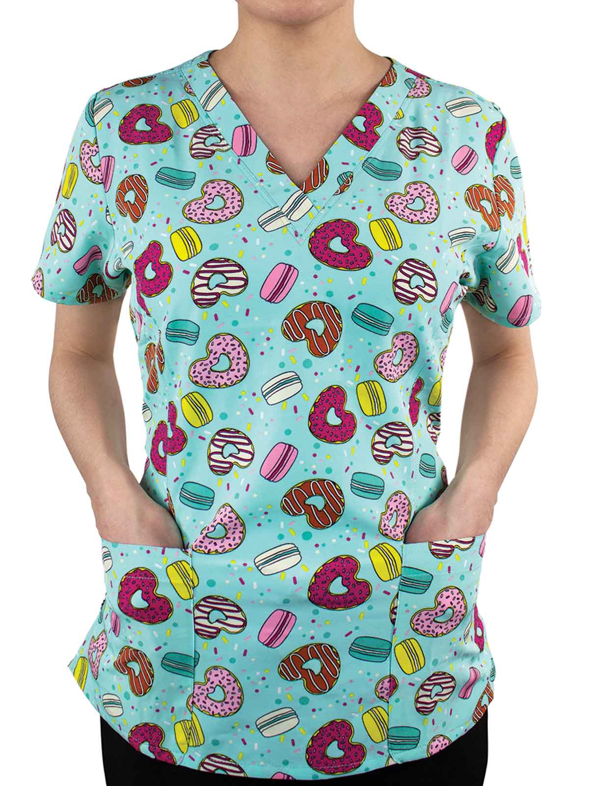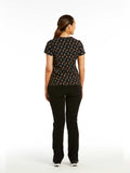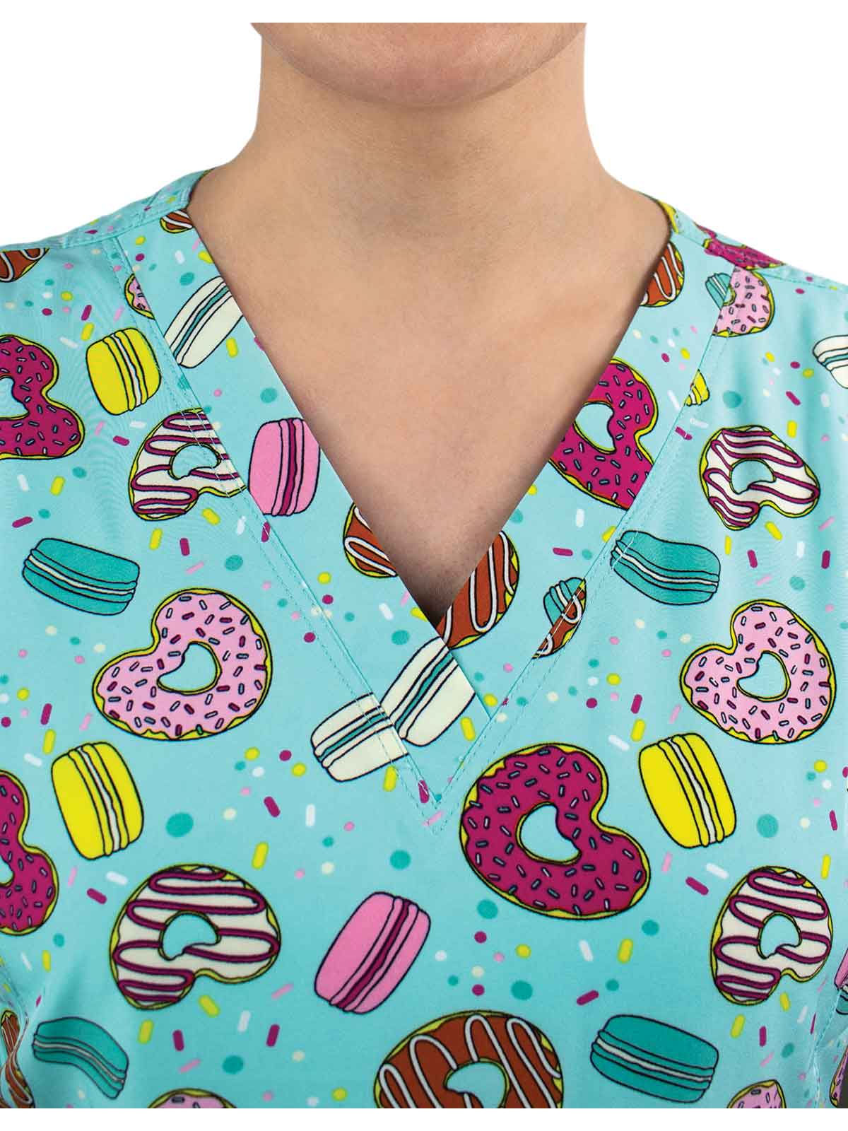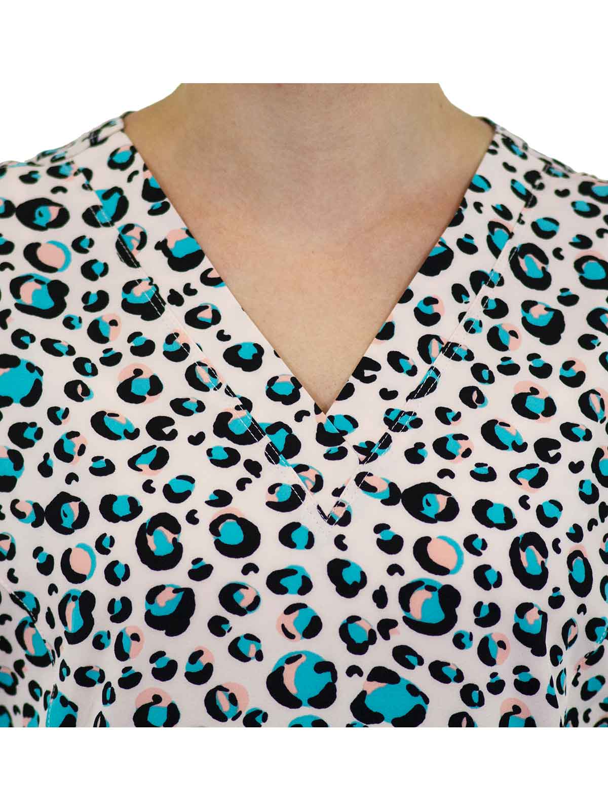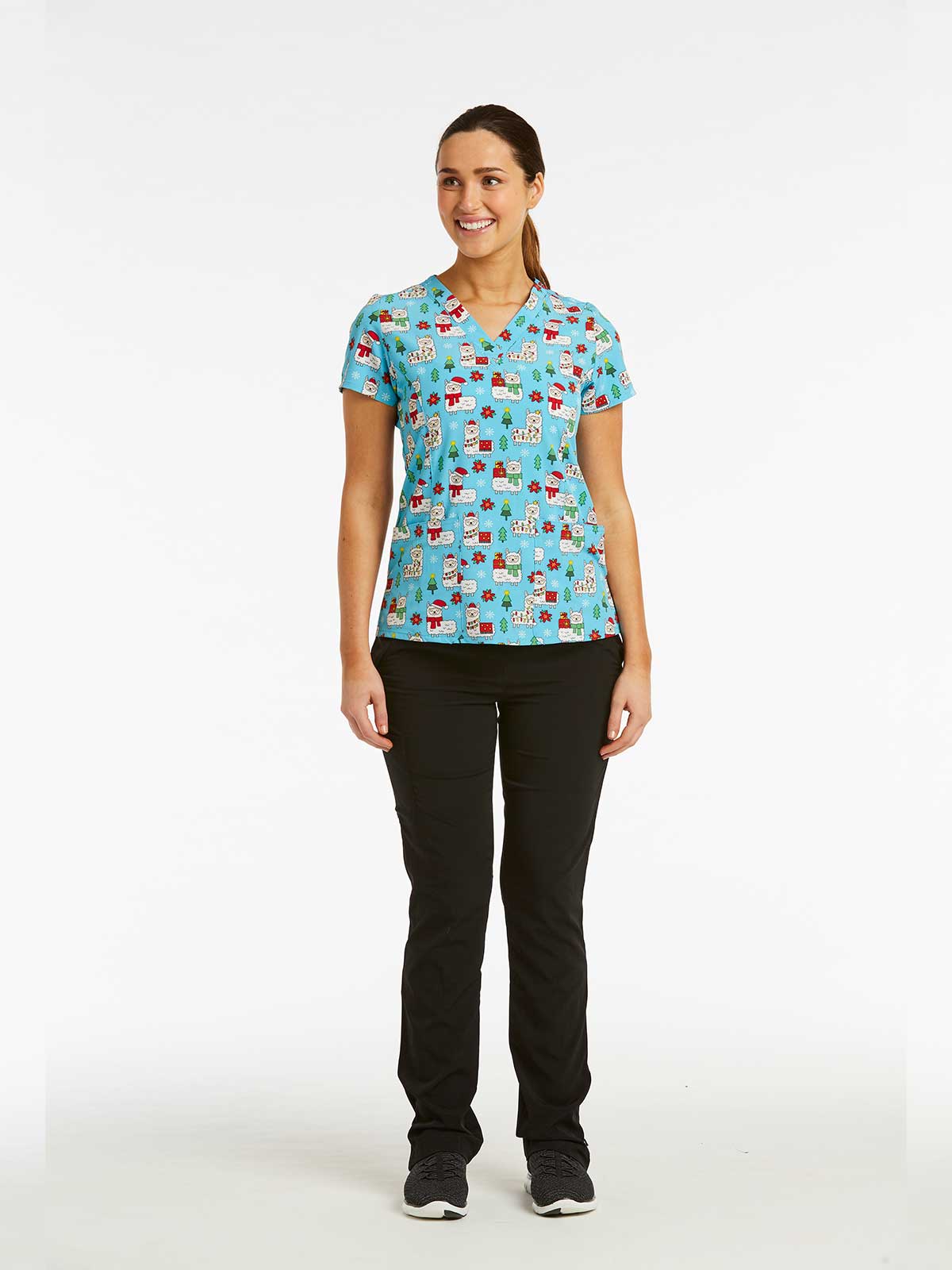 "*Printed curved v-neck top *Front princess seams and back darts for added style and shape *Two slant patch pockets with inner cell pocket *Solid contrast at back facing *Side vents" Banded v-neckline Short sleeves Front princess seaming Back shaping darts...