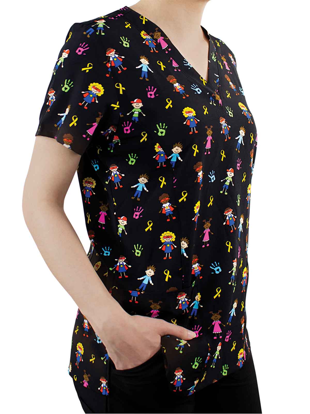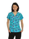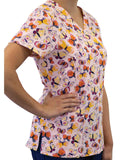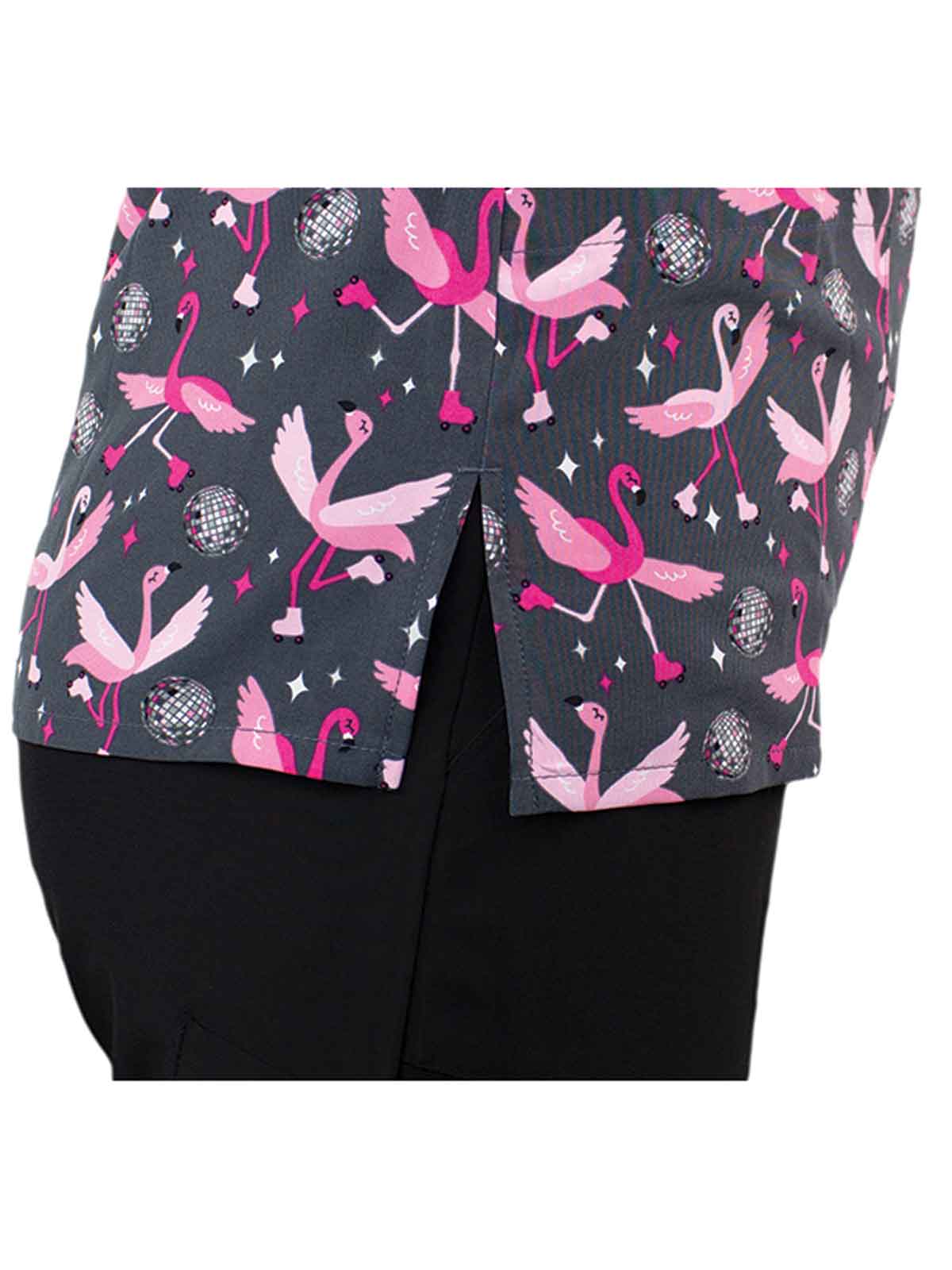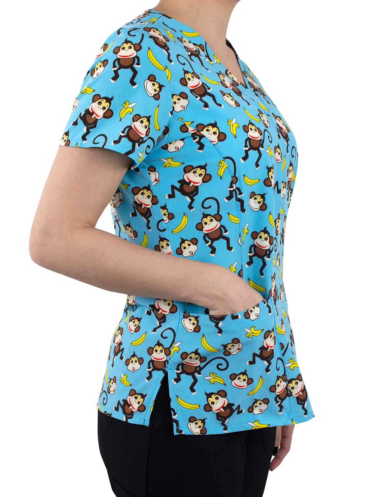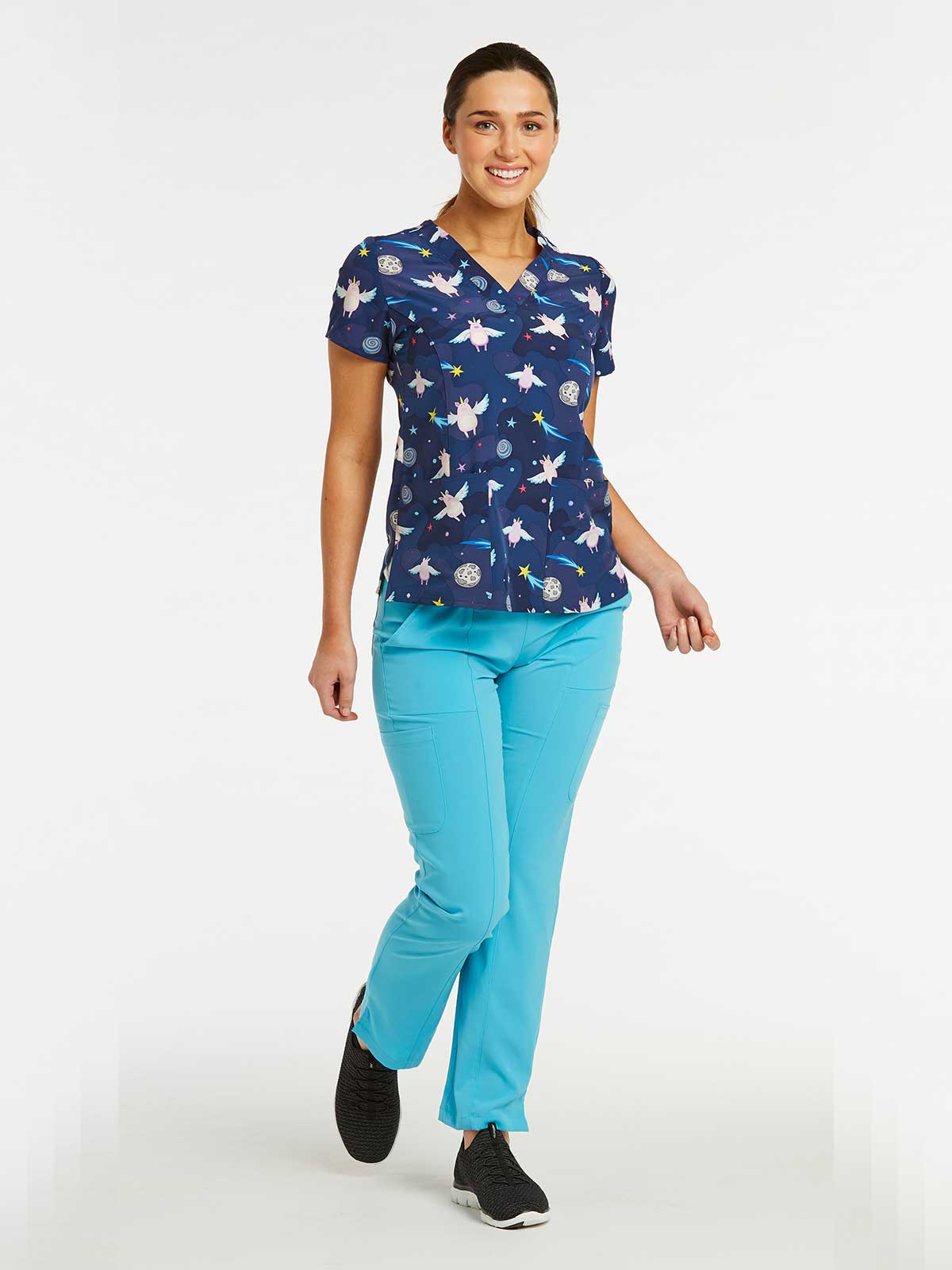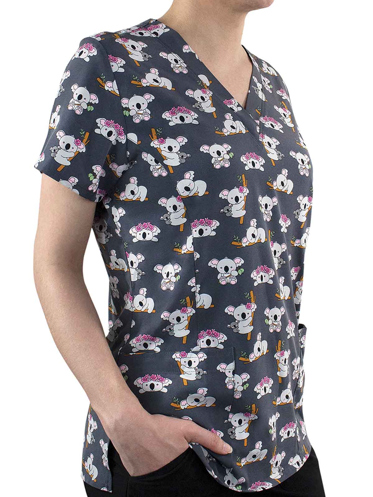 "*Printed curved v-neck top *Front princess seams and back darts for added style and shape *Two slant patch pockets with inner cell pocket *Solid contrast at back facing *Side vents" Banded v-neckline Short sleeves Front princess seaming Back shaping darts...